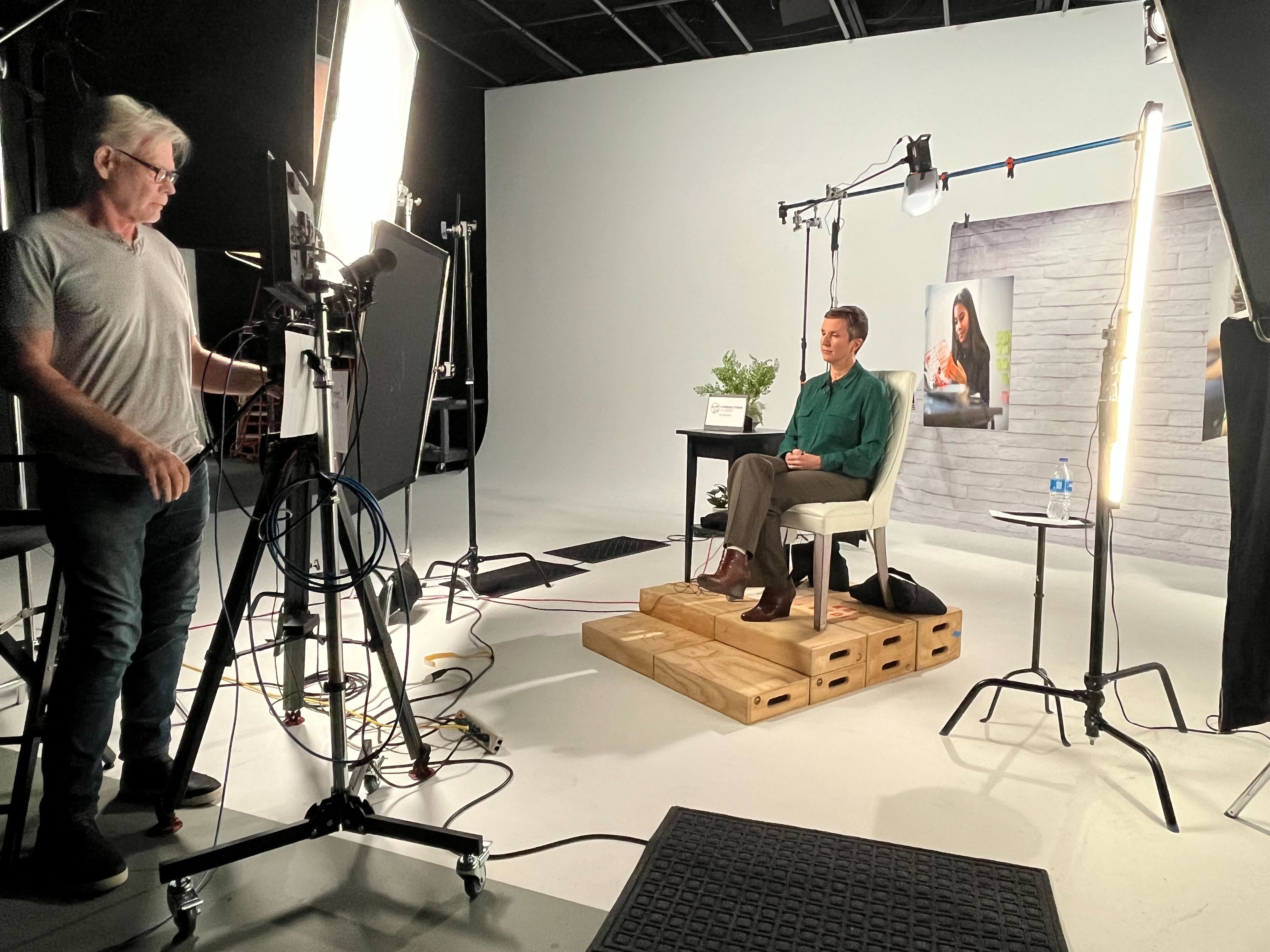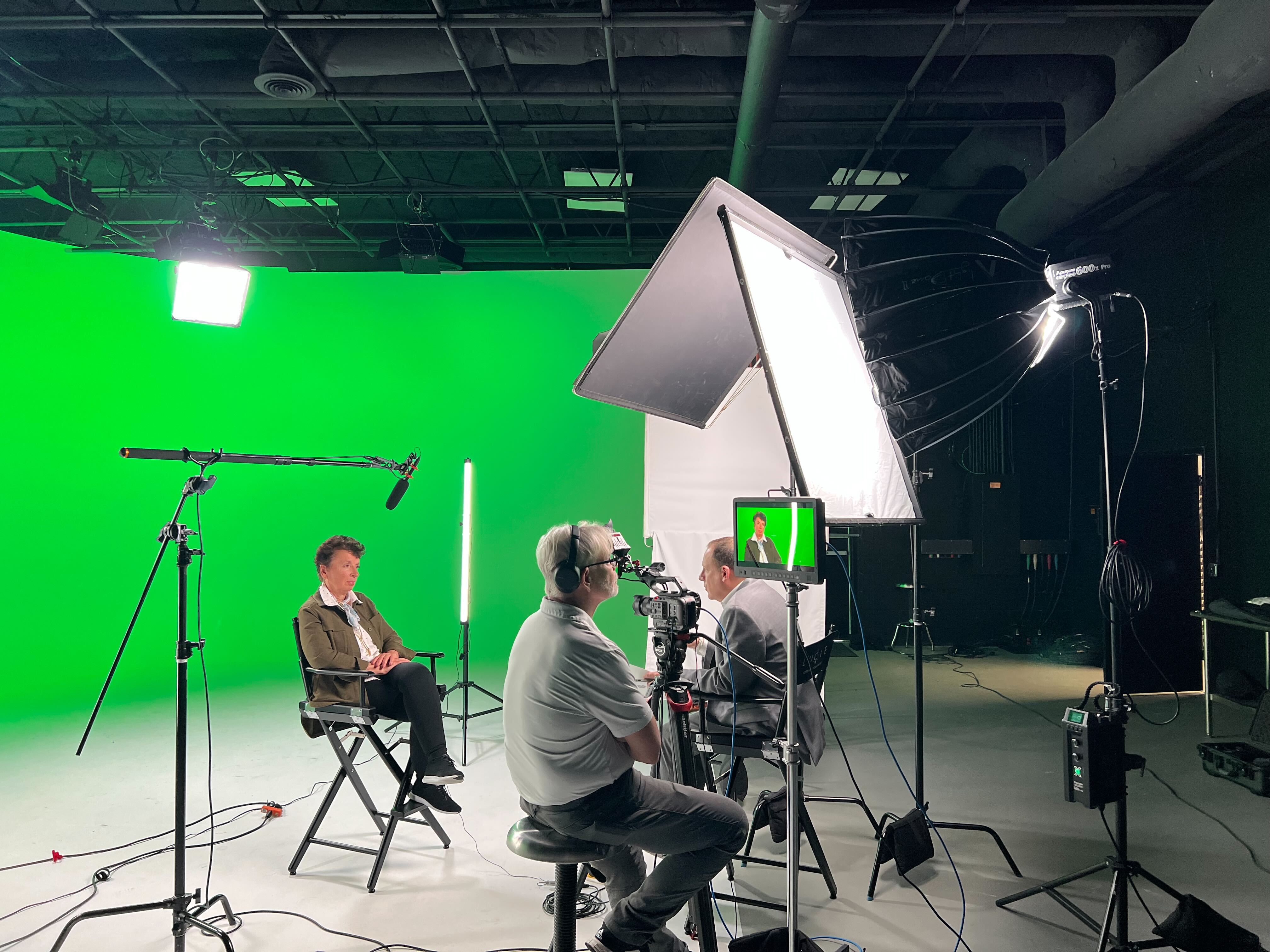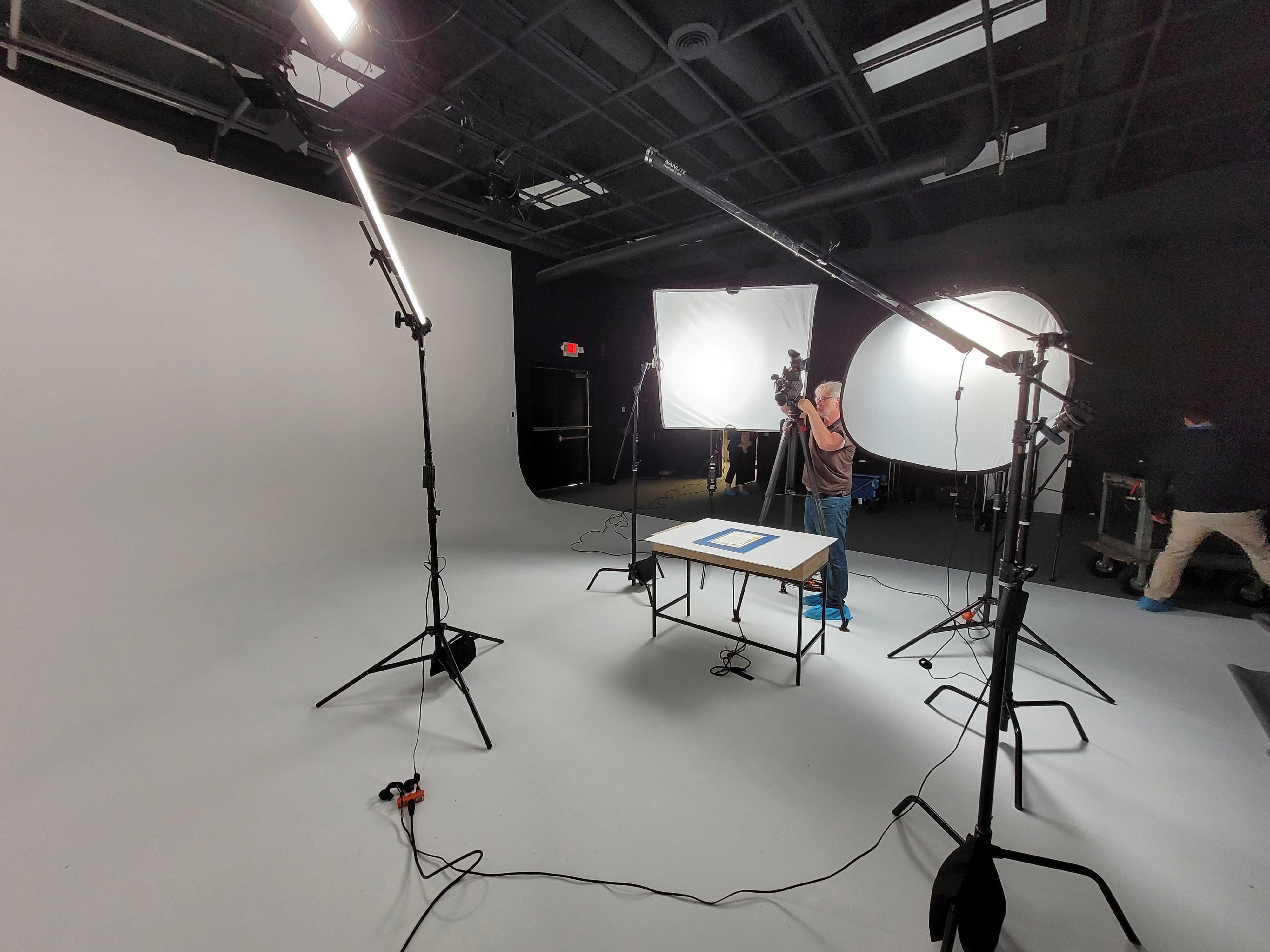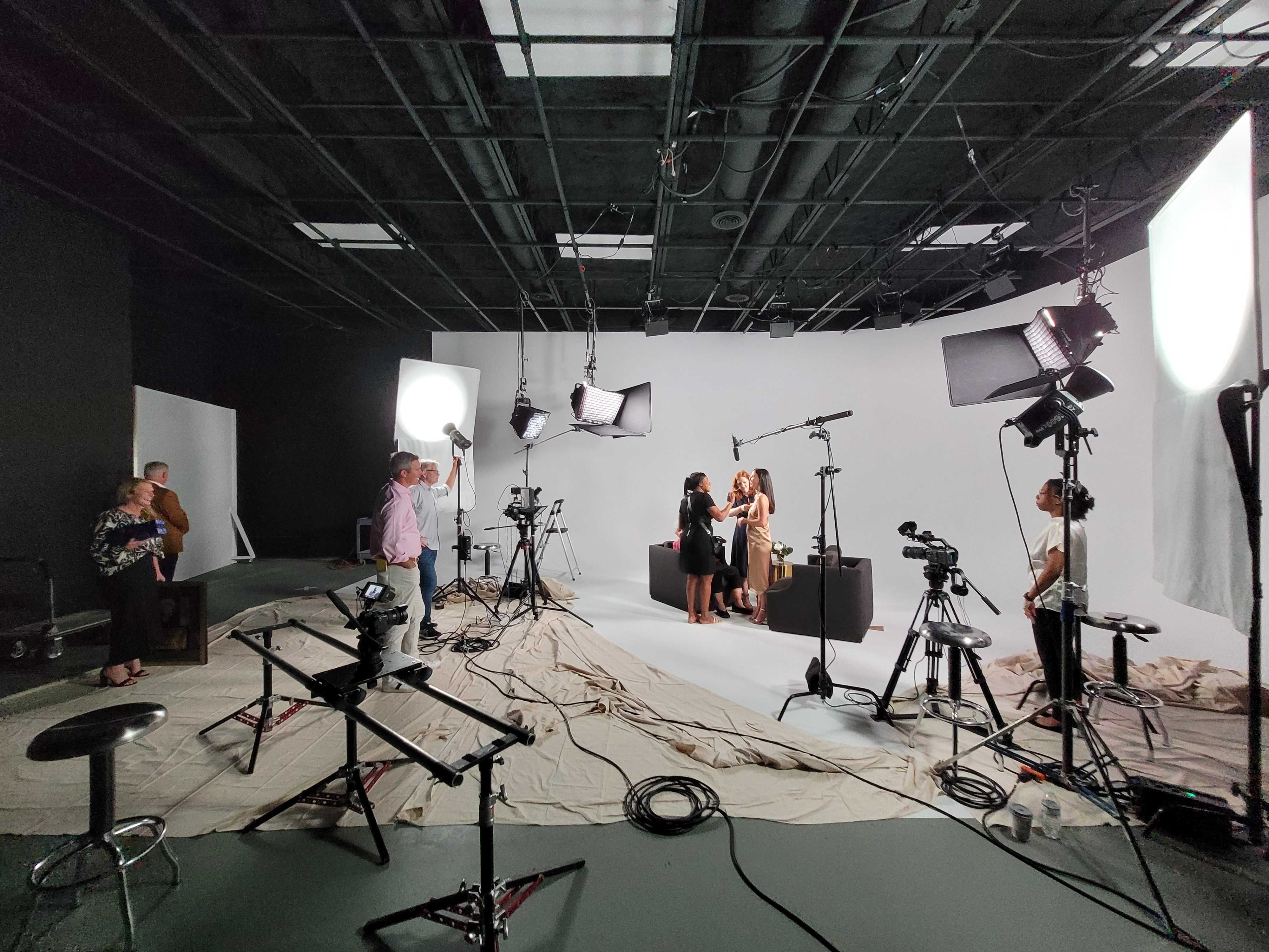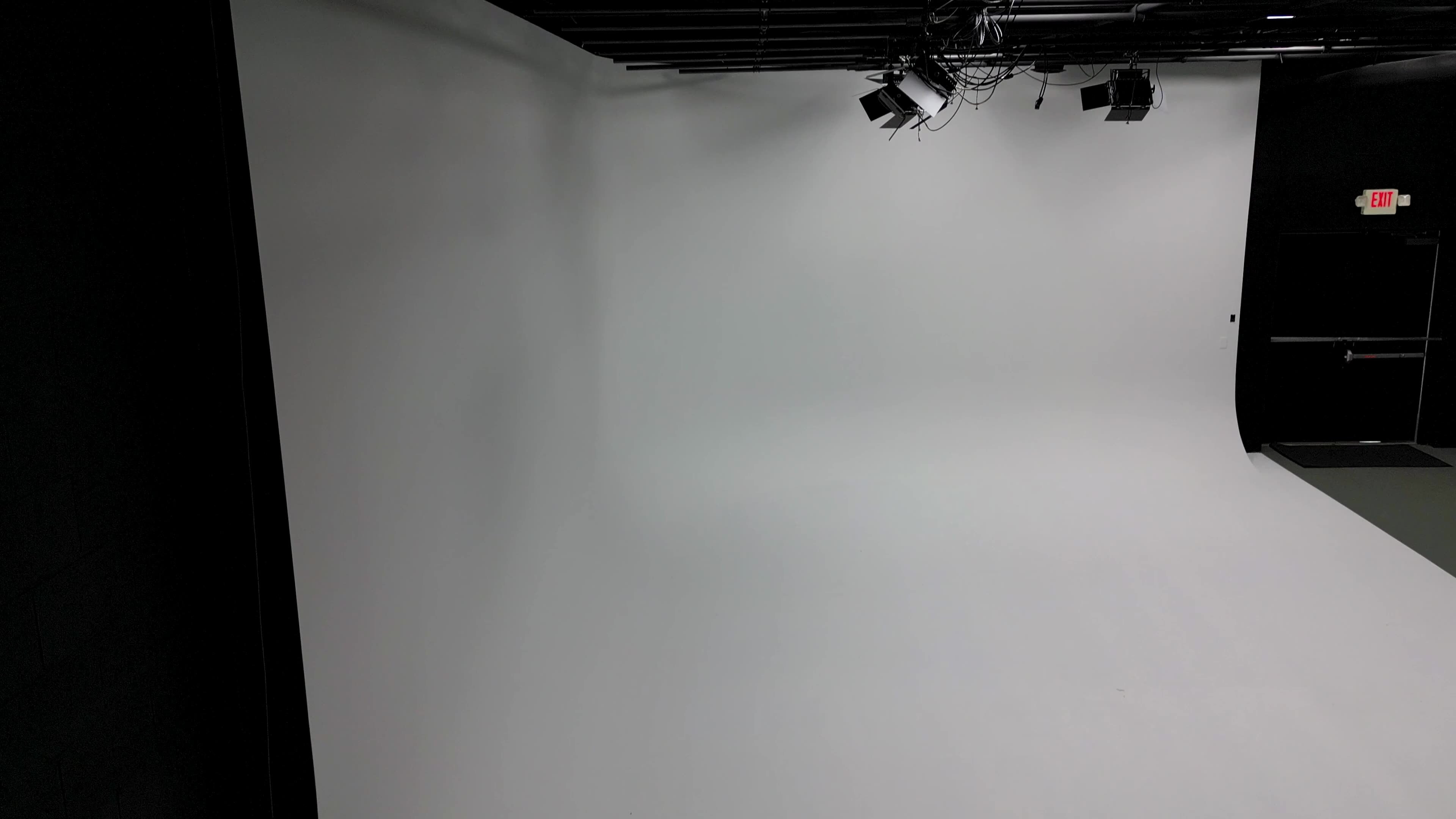Lucie Studios has an L-shaped 20 x 30 cyclorama wall for photography and video production with a lighting grid at 14 ft. We include 4 full RGB cyc lights and a Chamsys Q30 lighting console that can turn the wall any color including chroma green. Additional equipment, such as cameras, microphones, boom poles, directors chairs, and a projector, are available for an extra fee. Inquire if interested.