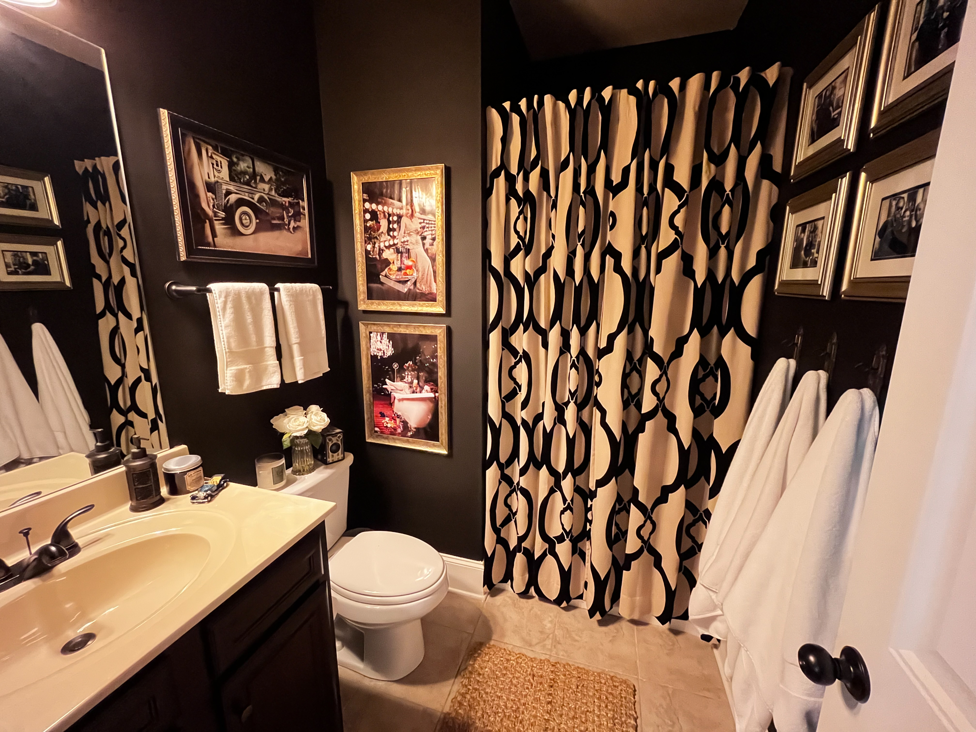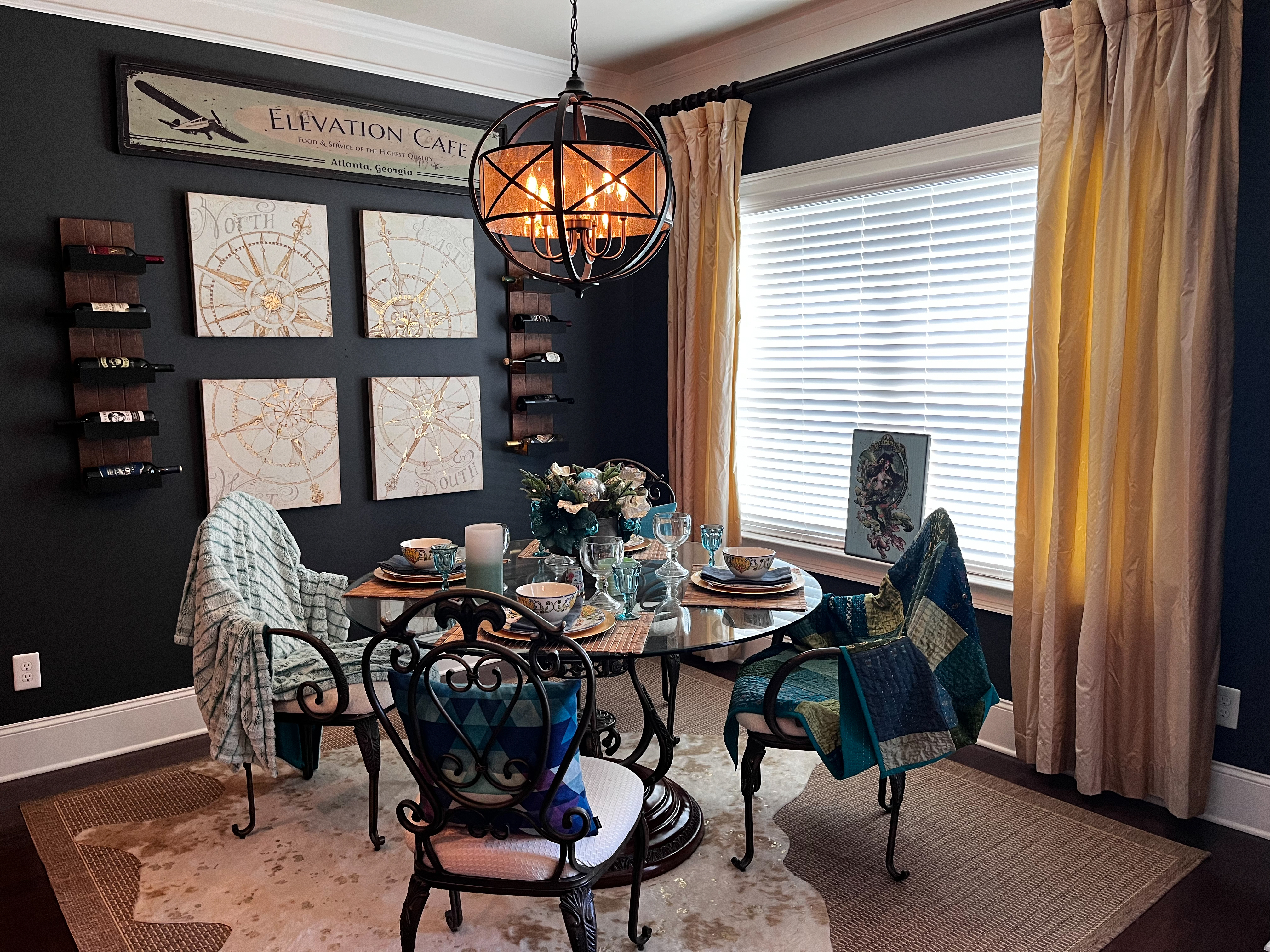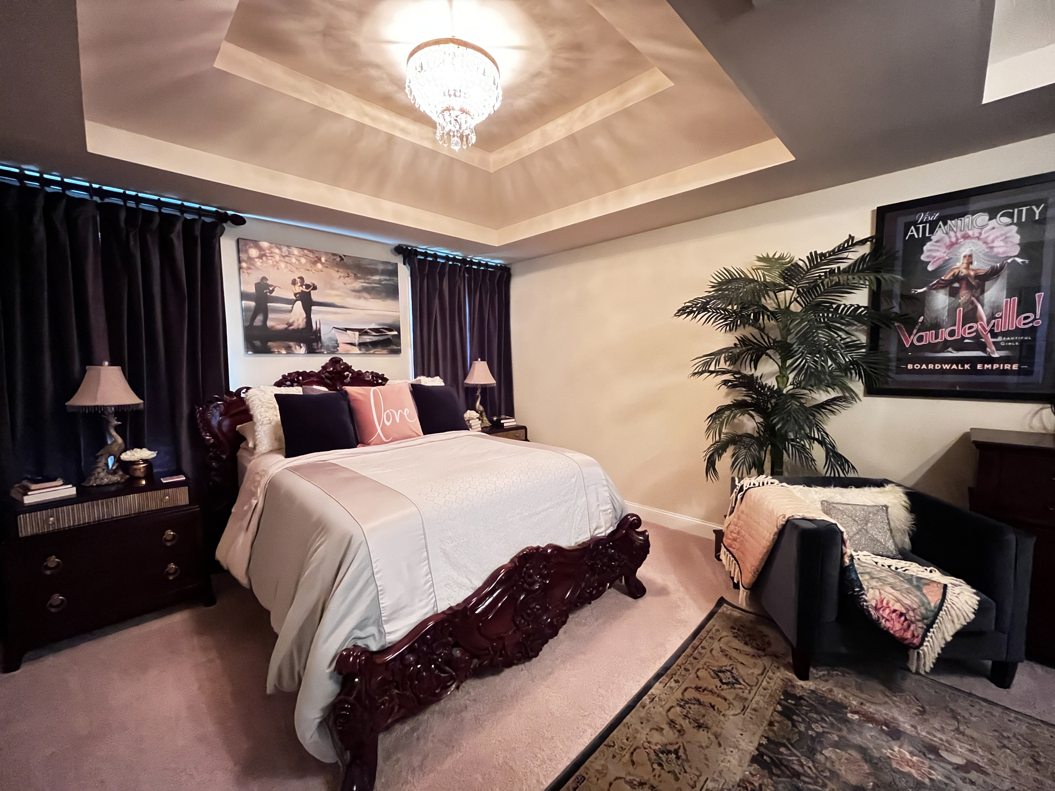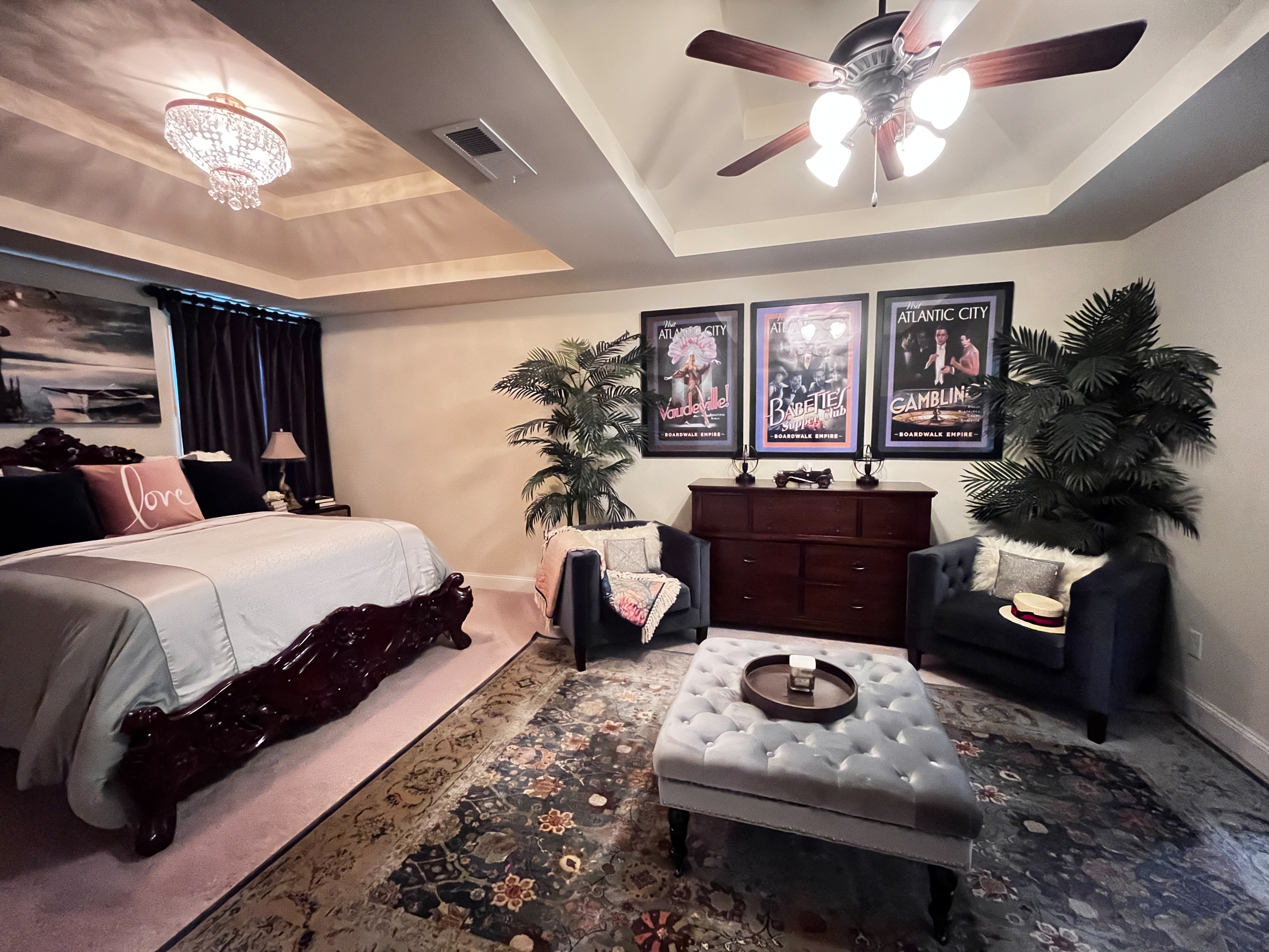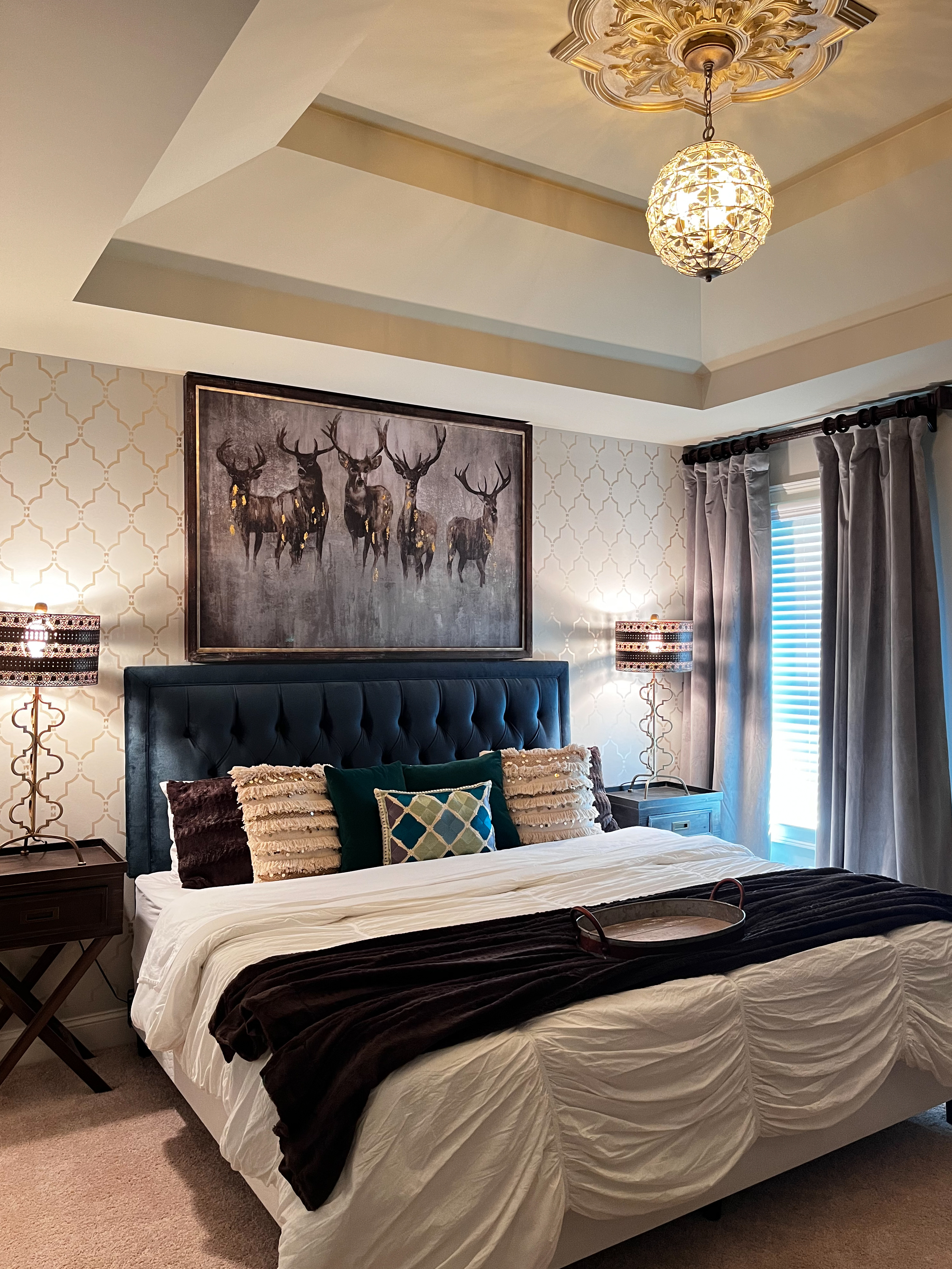 Boasting rich sophisticated colors, art deco and art nouveau decor, mixed with rustic and traditional masculine textures downstairs, and traditional feminine textures upstairs.