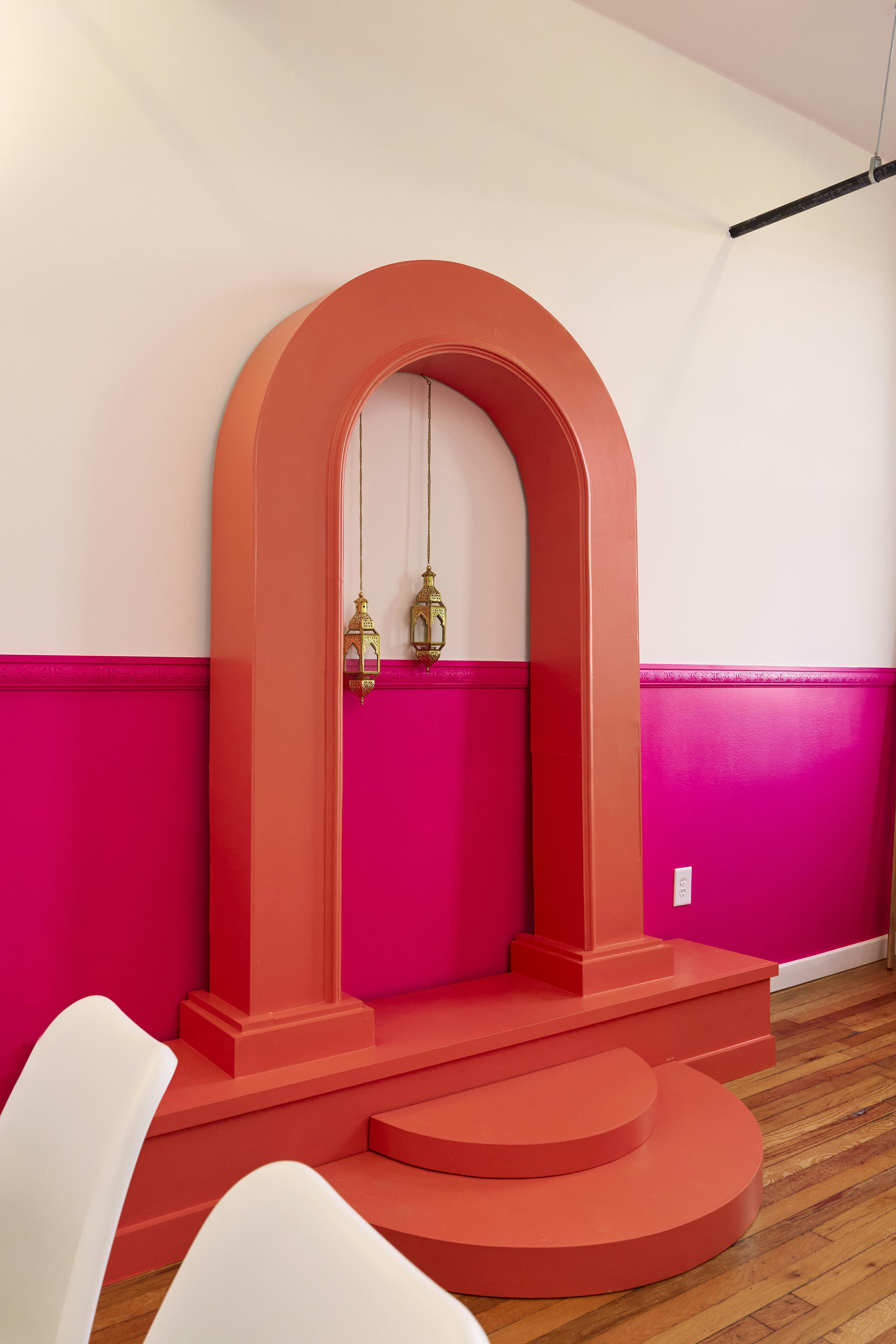 This creative studio manages to fit a lot of charm and warmth into a small space. The room features high ceilings, great natural light and a different backdrop on each wall to choose from - solid white, exposed brick for an industrial feel, and a wall with bright prink panelling for a fun pop of color.
