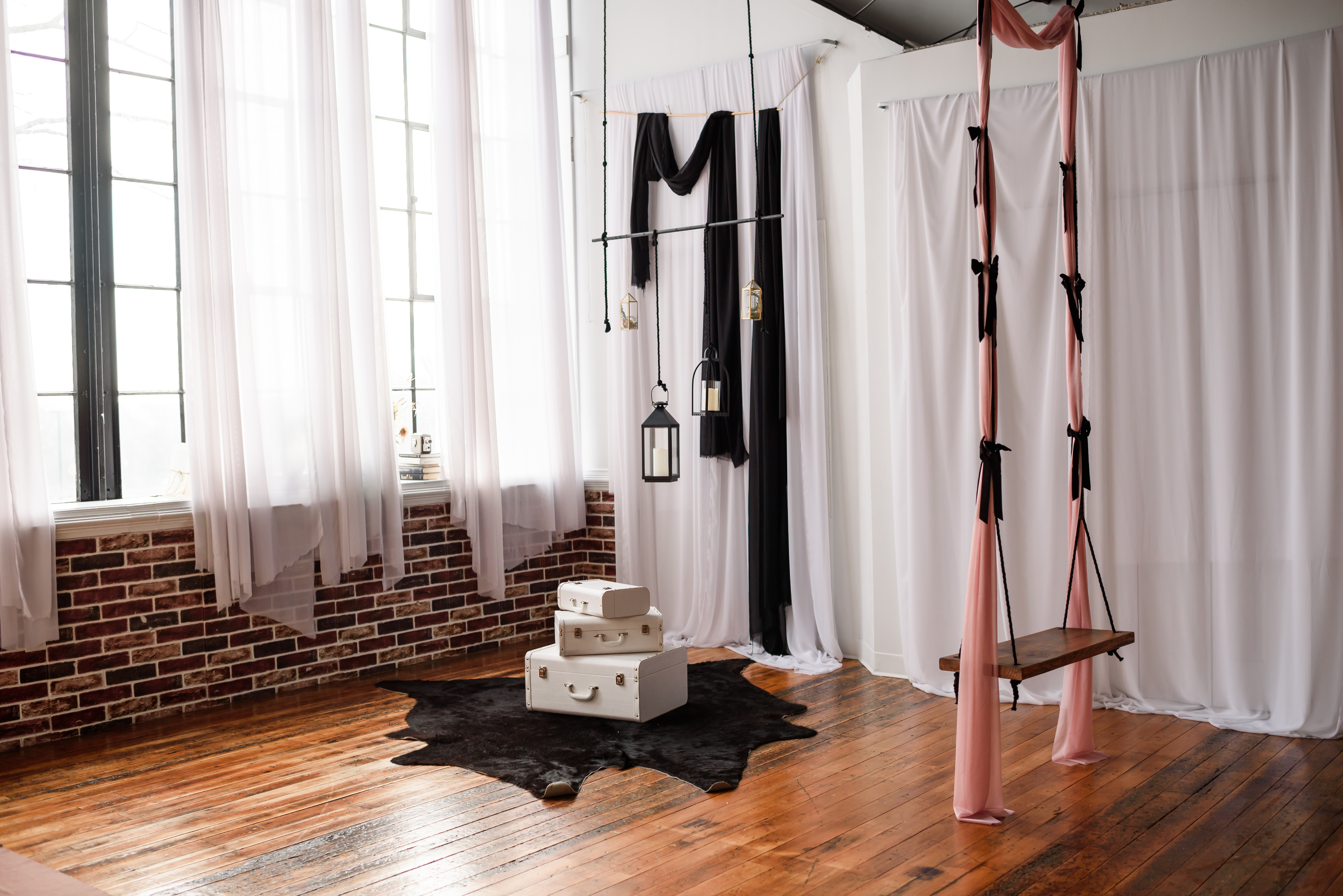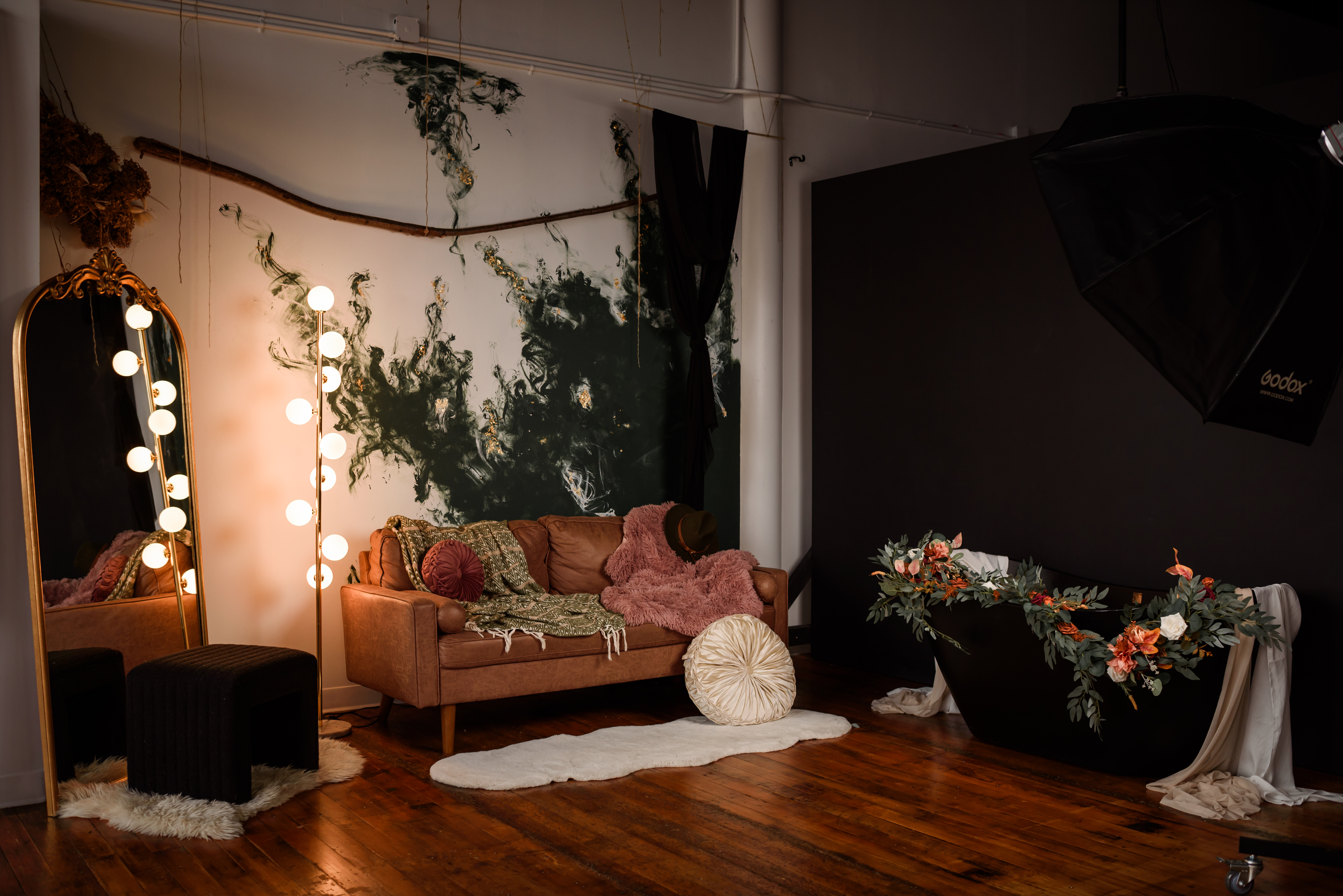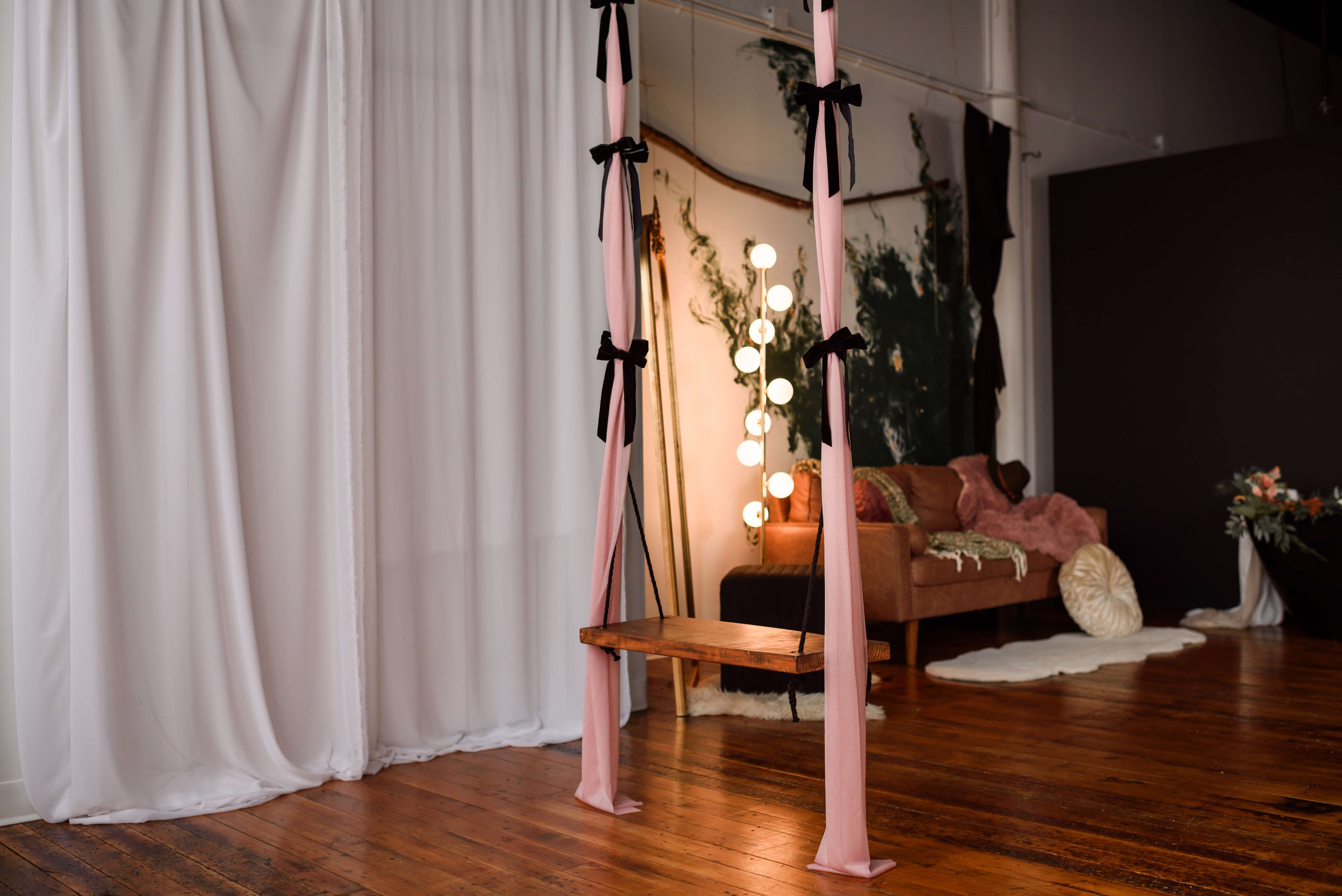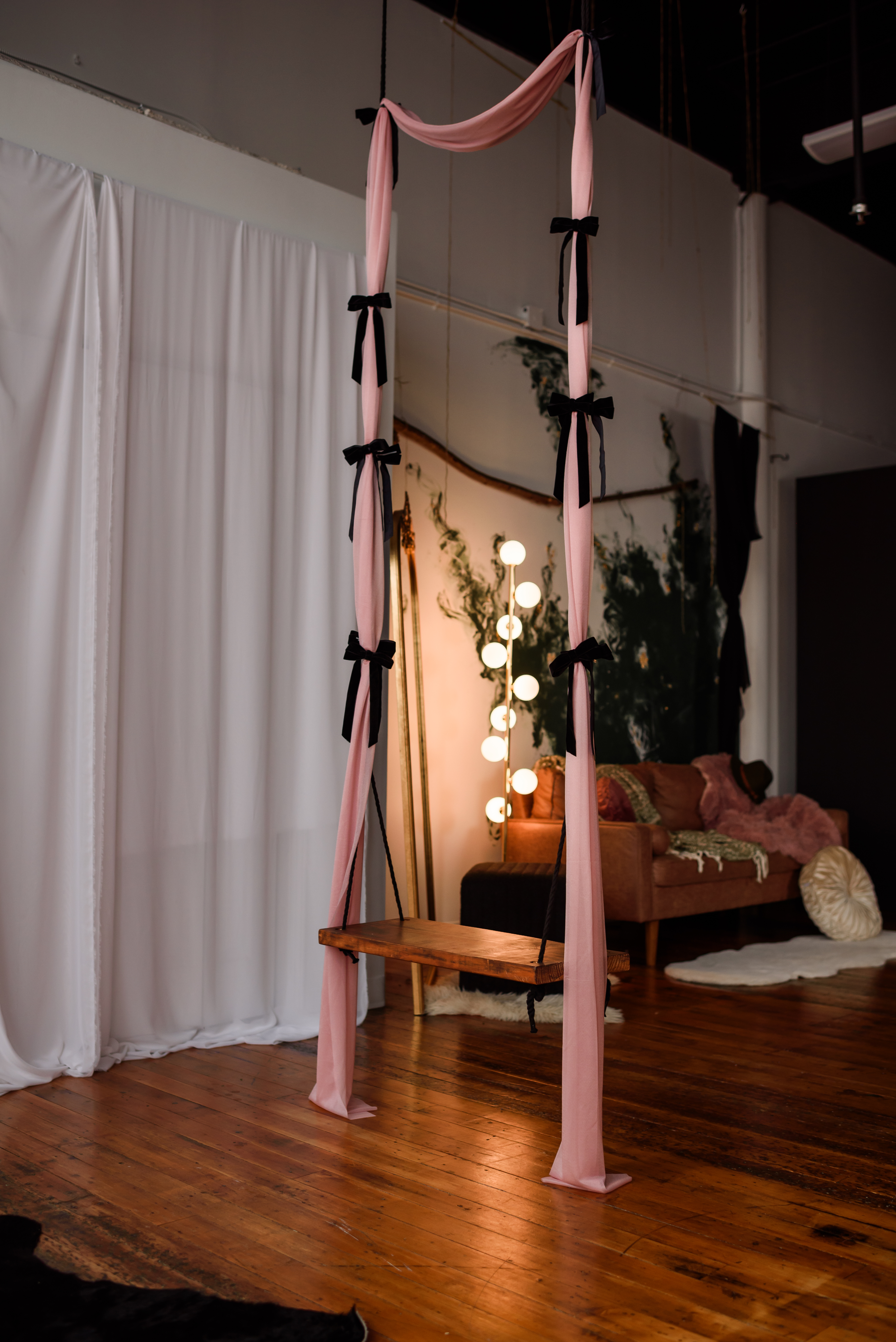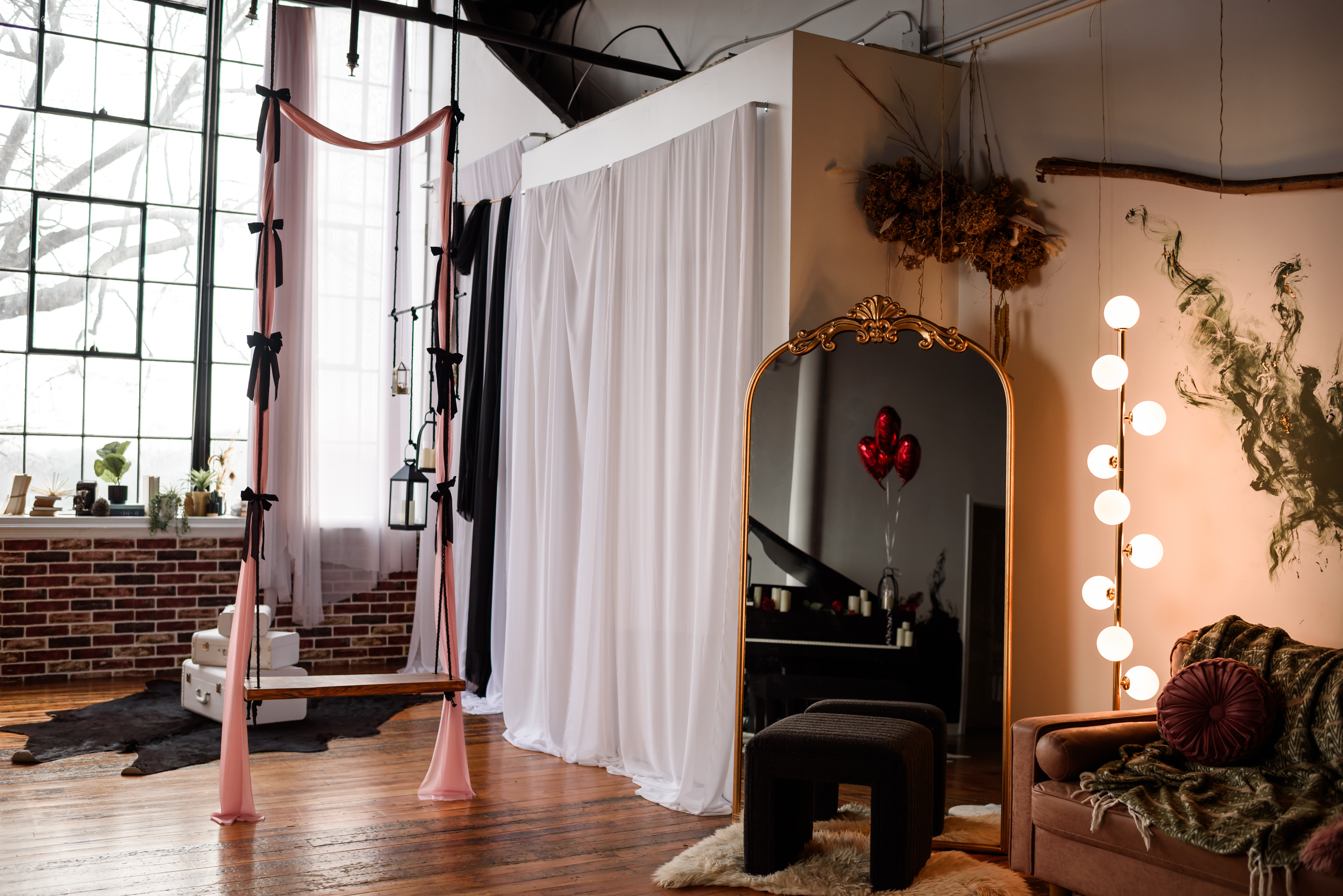 Amenities include: 20f high natural light industrial windows, custom art instillations and murals, vaulted ceilings, baby grand piano, custom low profile attic bed, black bathtub set, a real swing suspended from the ceiling, couch set, various seamless and sweeps, faux natural light wall, constant studio light, several light modifiers, wifi, prop room, kitchen with coffee + snacks, optional client wardrobe access (fee), two private office spaces available upon request.