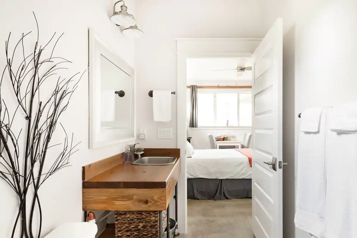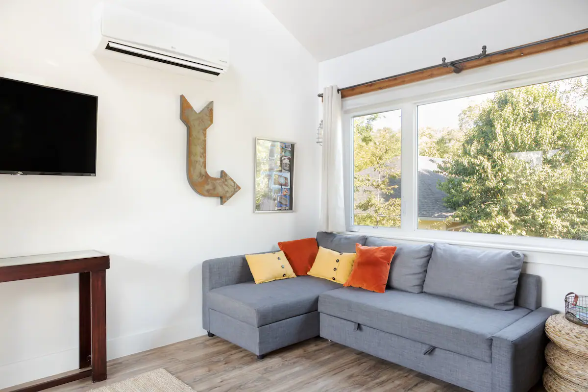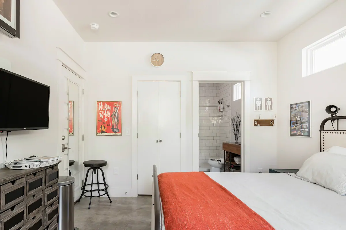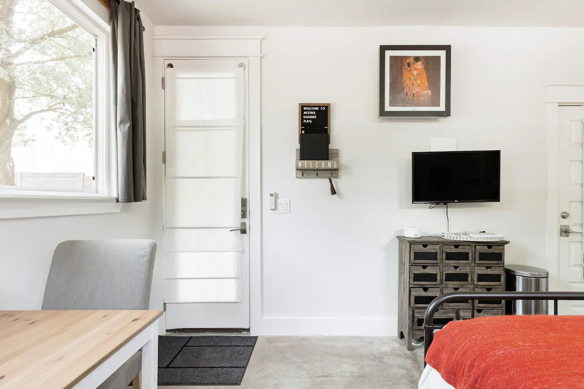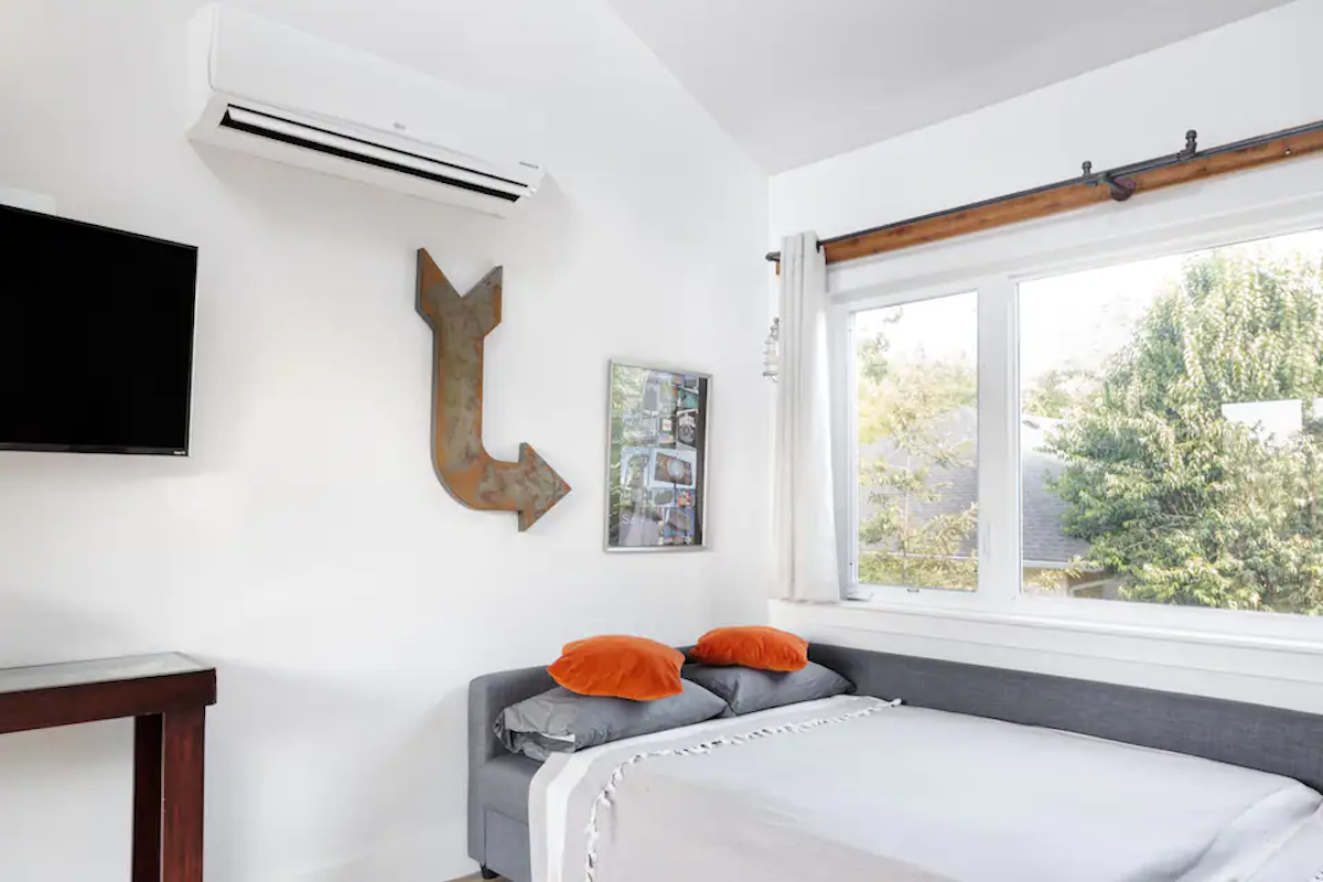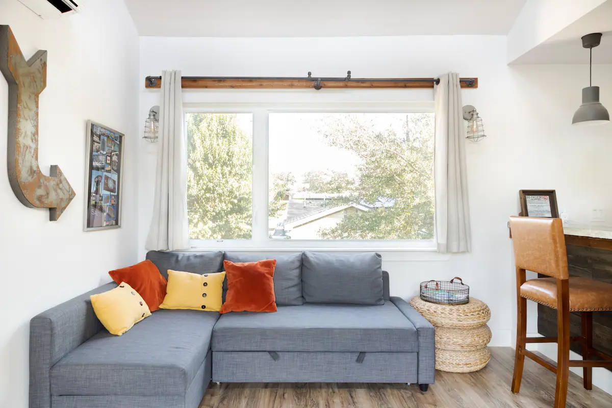 Upper Flat is a little over 550 sq ft, and includes 1 bedroom/1 bathroom, a living room (with a pull out couch), and a full kitchen. Lower Flat is a small, studio-style space with bed, sitting area, kitchenette, and bathroom.