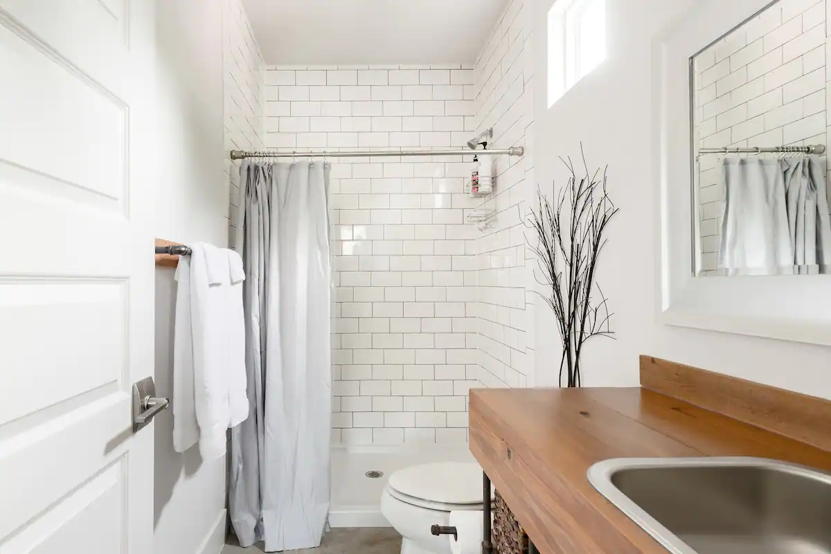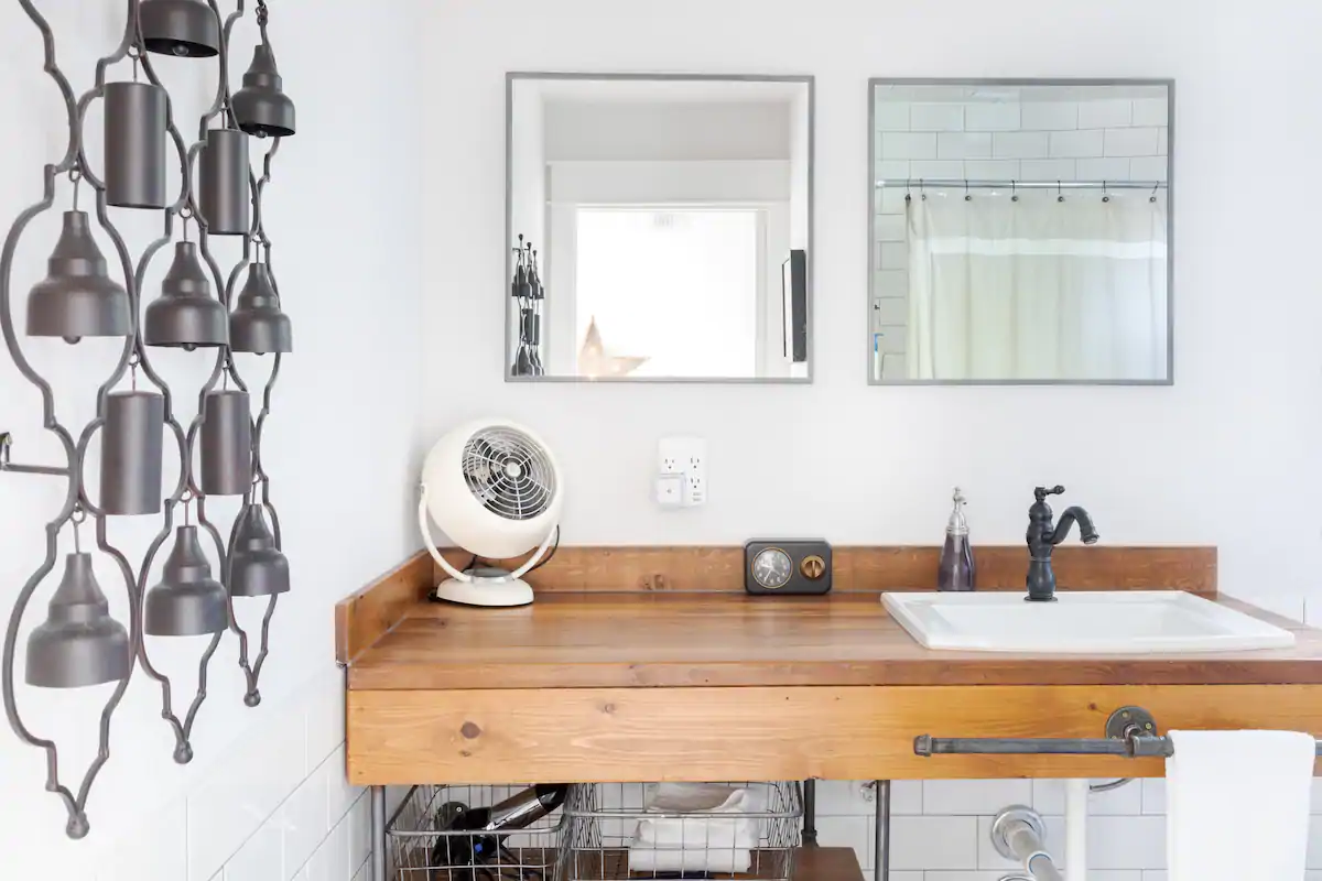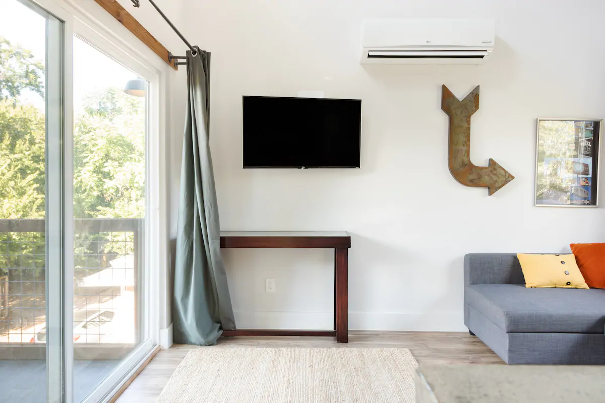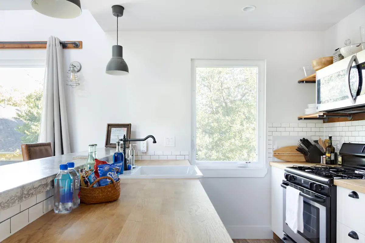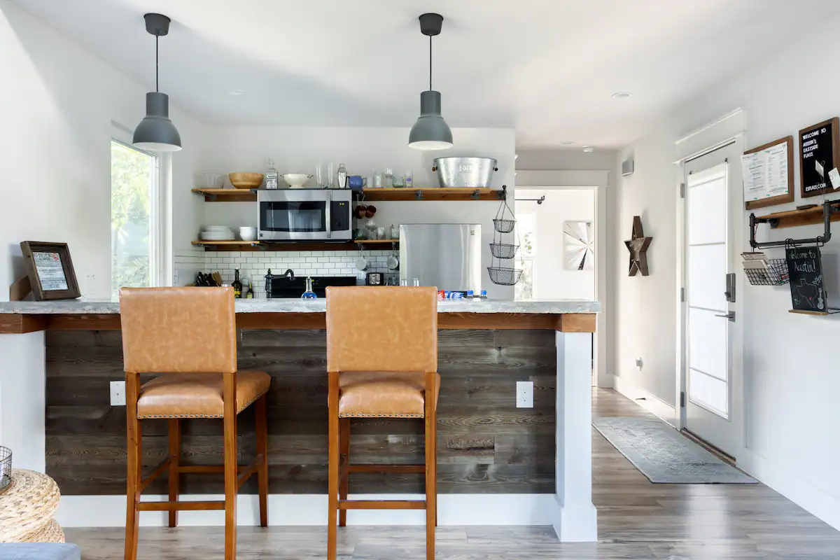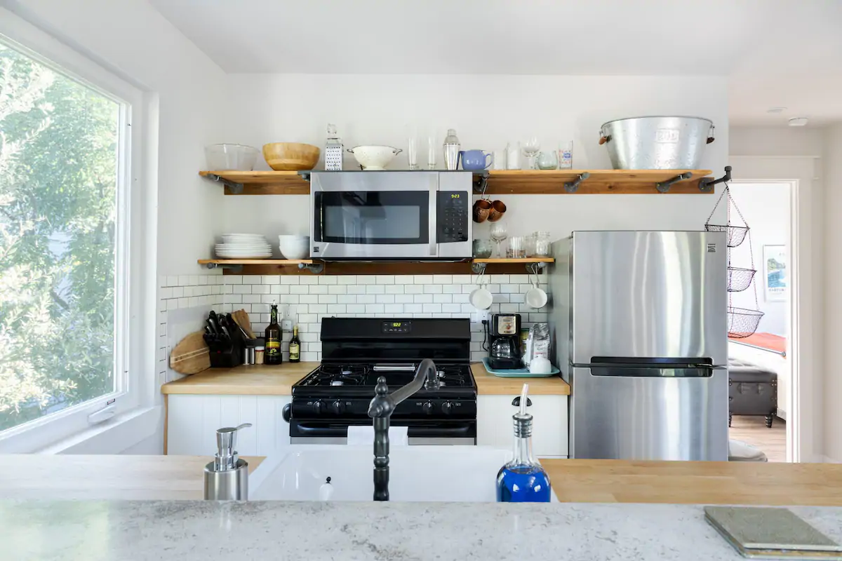 Upper Flat is a little over 550 sq ft, and includes 1 bedroom/1 bathroom, a living room (with a pull out couch), and a full kitchen. Lower Flat is a small, studio-style space with bed, sitting area, kitchenette, and bathroom.