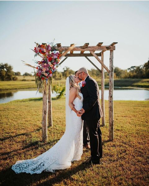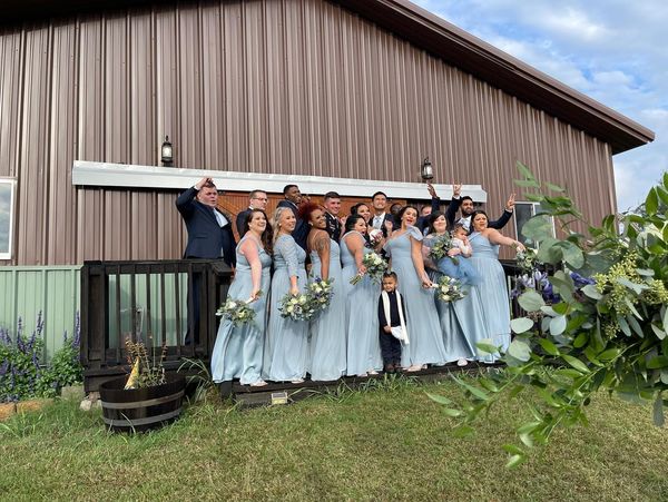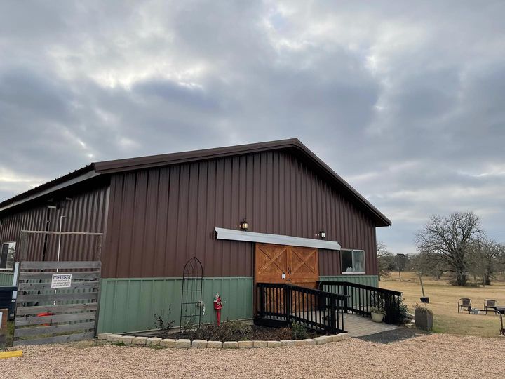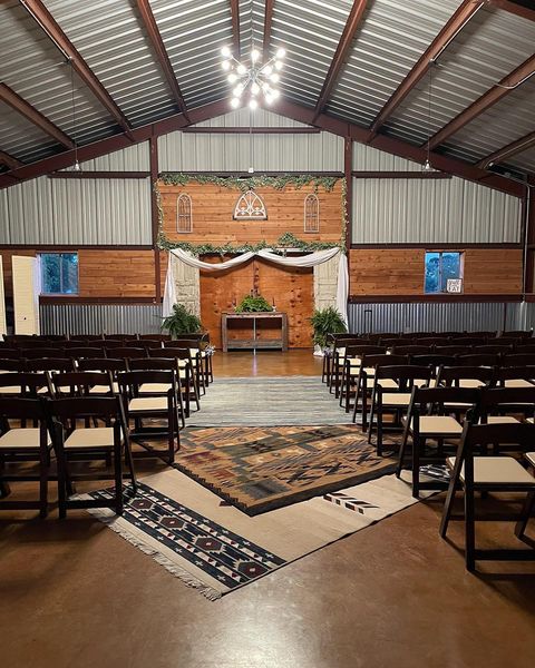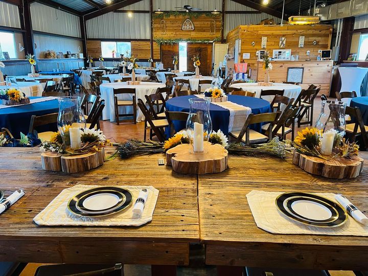 We offer a modern-rustic 2400 sq ft Barn with HVAC filled with farm tables, round table and pecan wood padded chairs (up to 150)