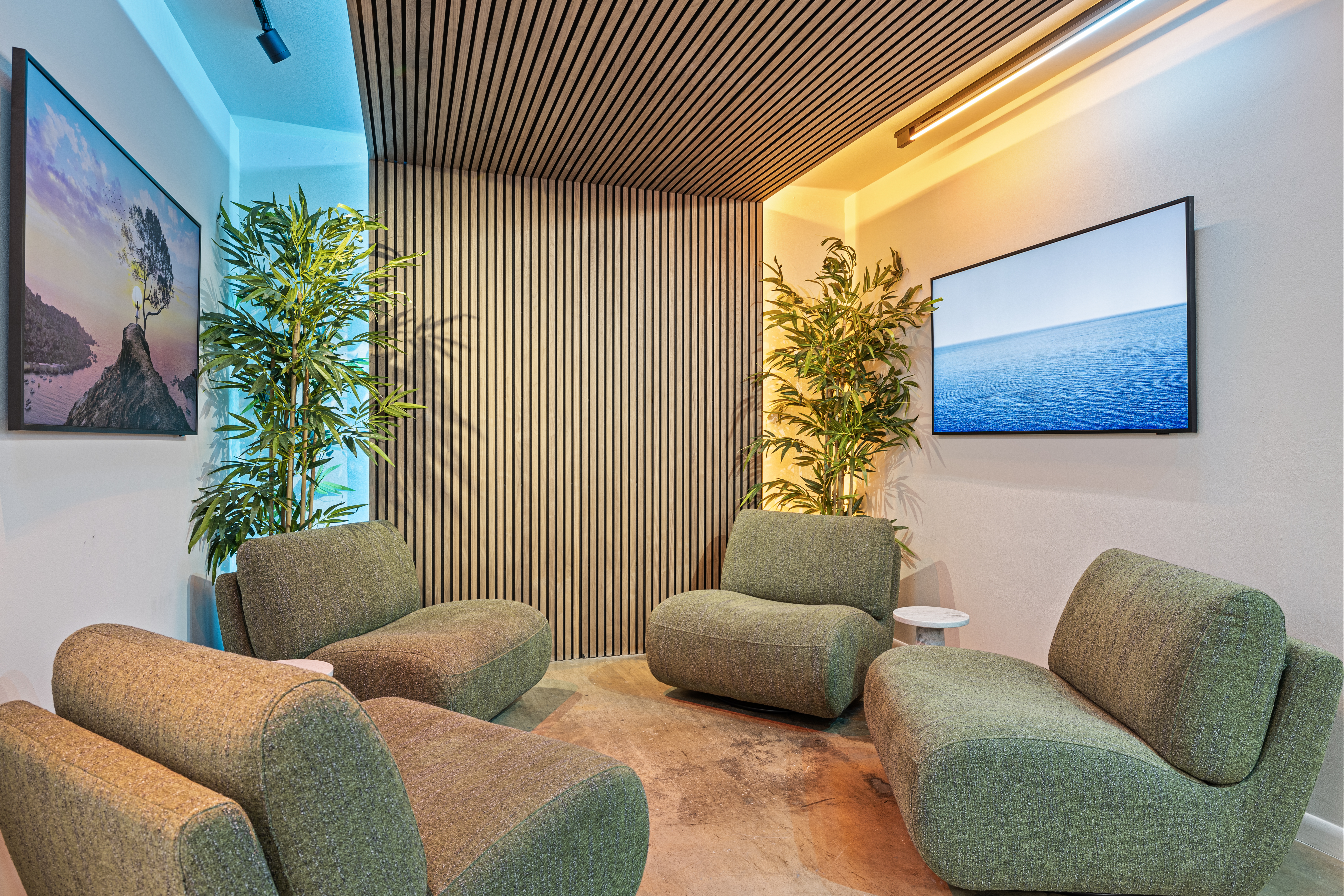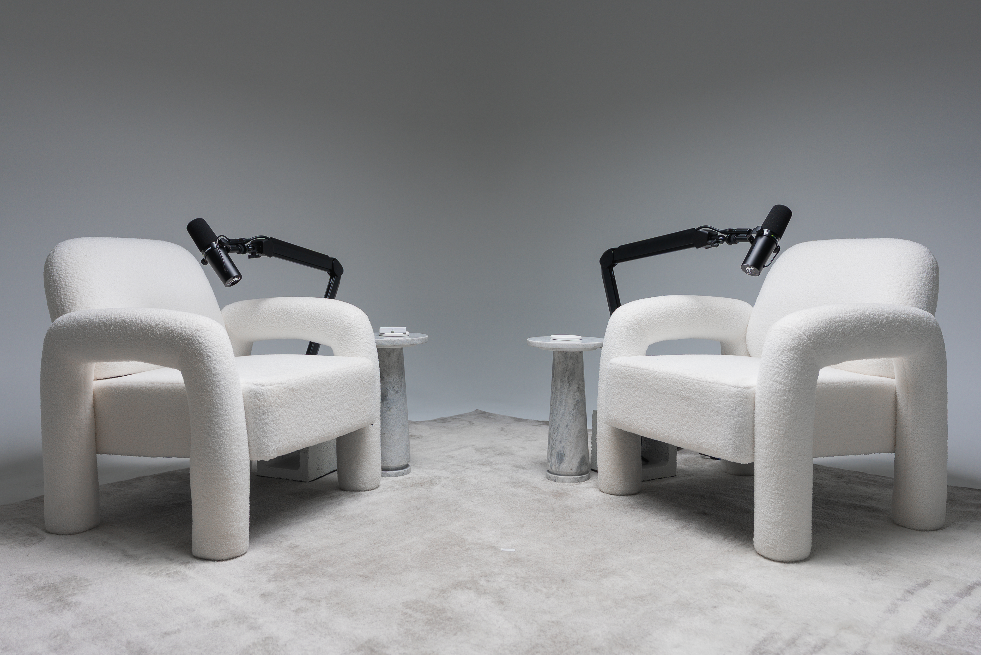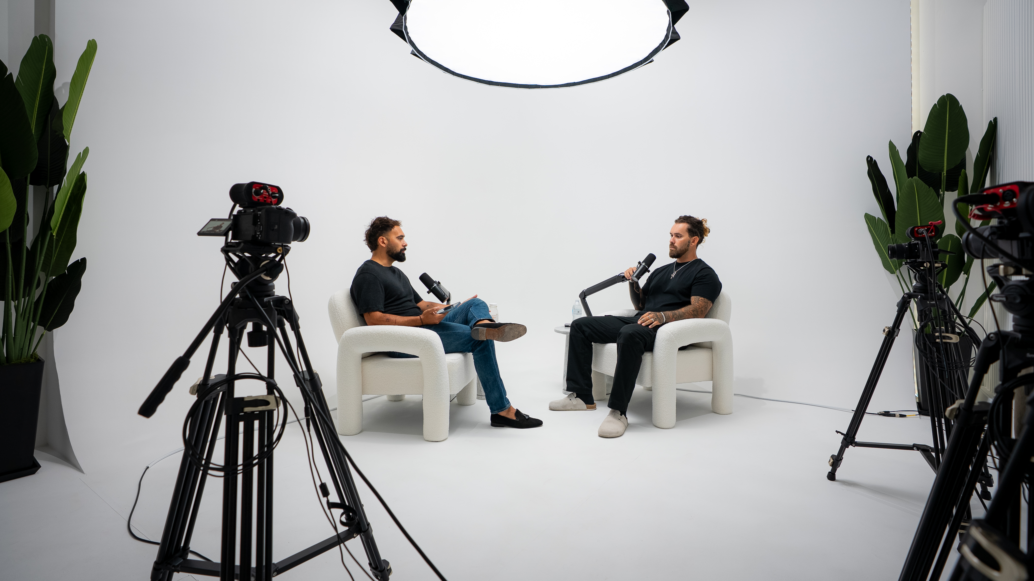 Record in a fully lit white cyclorama studio with RGB wall control and automated live editing. This 3-person setup includes pro audio, multi-cam switching, and cinematic lighting. Walk in, hit record, and walk out with a fully edited episode — no post-production needed. Perfect for creators, brands, and agencies producing podcasts, interviews, or short-form content.