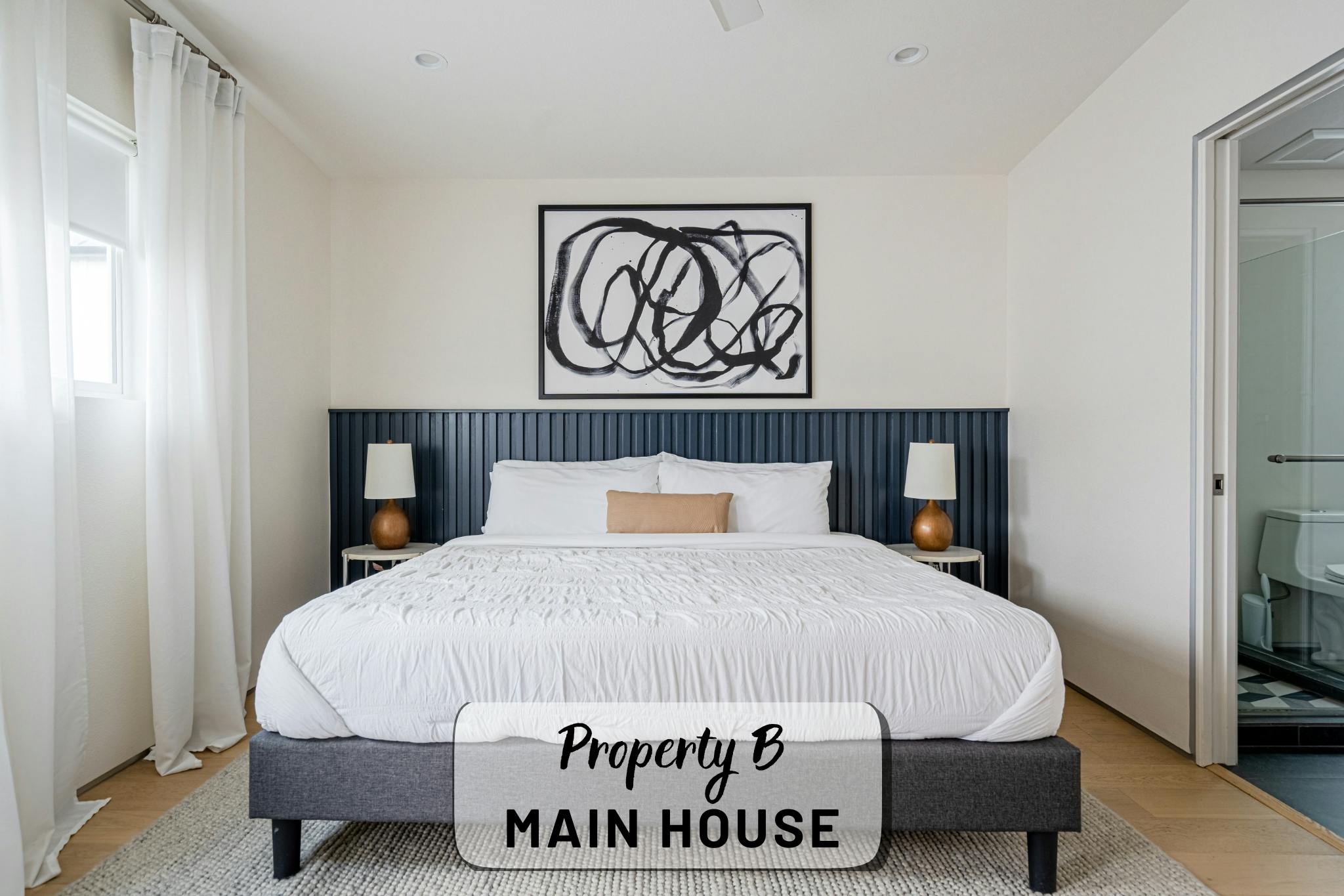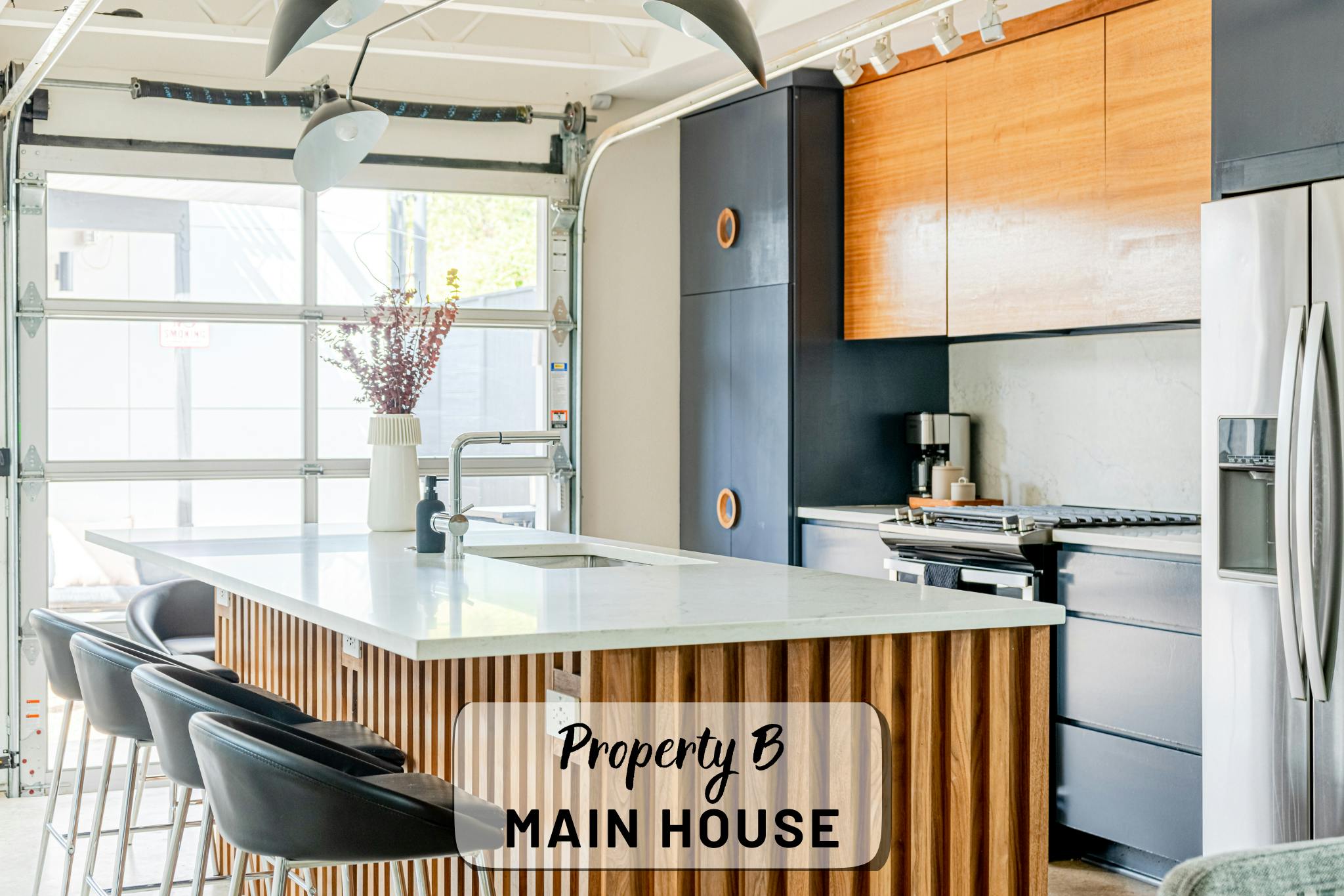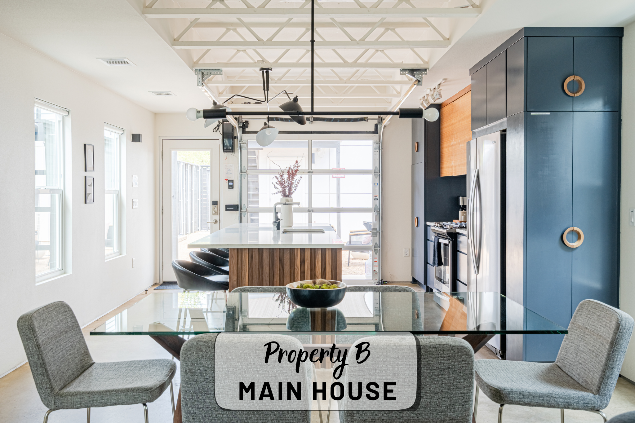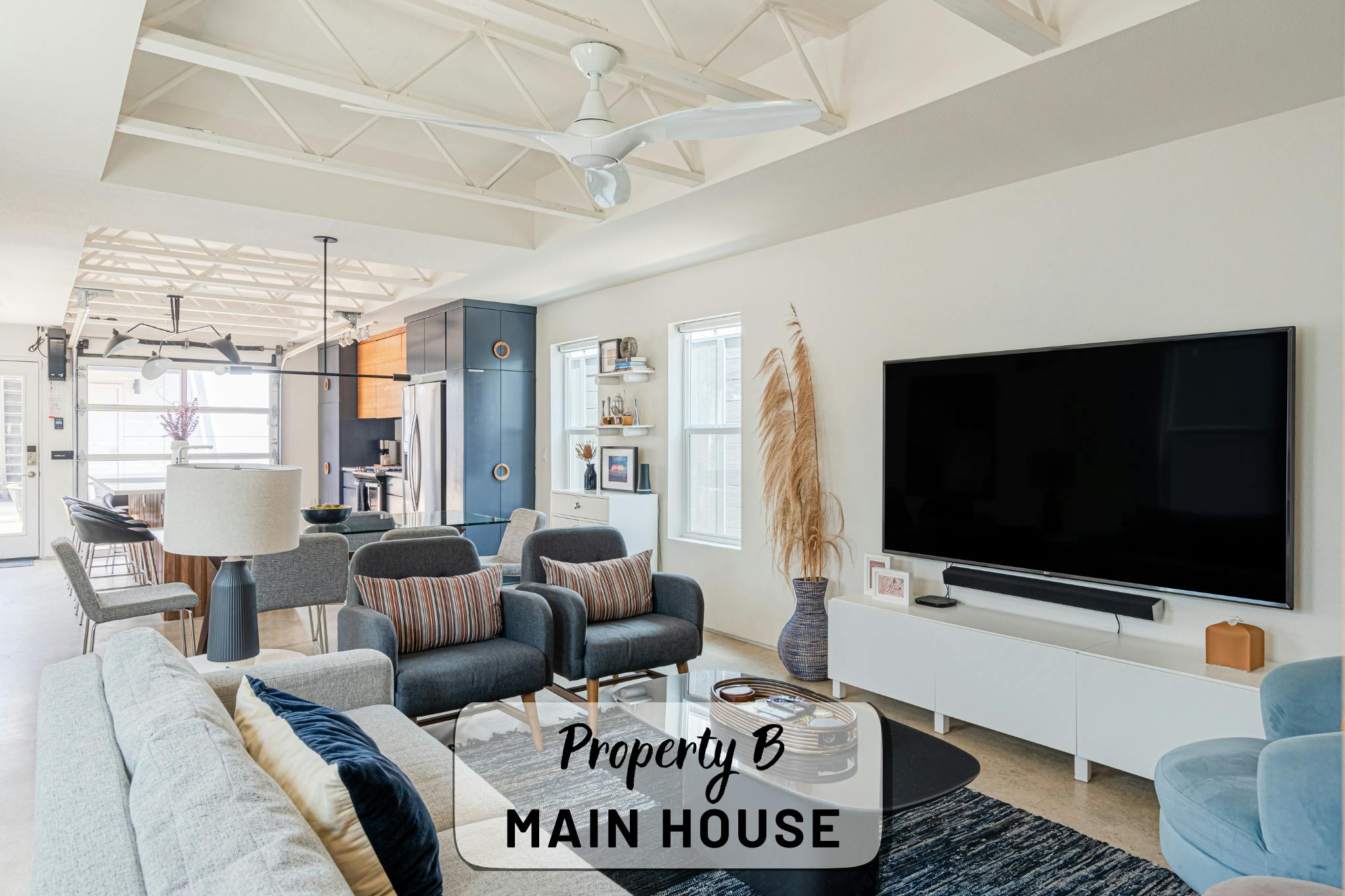 Our property contains two separate units within a fenced in lot. The main house offers an open, production-friendly layout with abundant natural light, comfortable modern furnishings, and a glass garage door that opens to the patio for easy indoor–outdoor flow. The separate garage loft adds a highly versatile second space. The property includes a kitchen, kitchenette, five bedrooms and four full bathrooms, making it well-suited for talent holding, wardrobe, breakout space, or overnight stays.