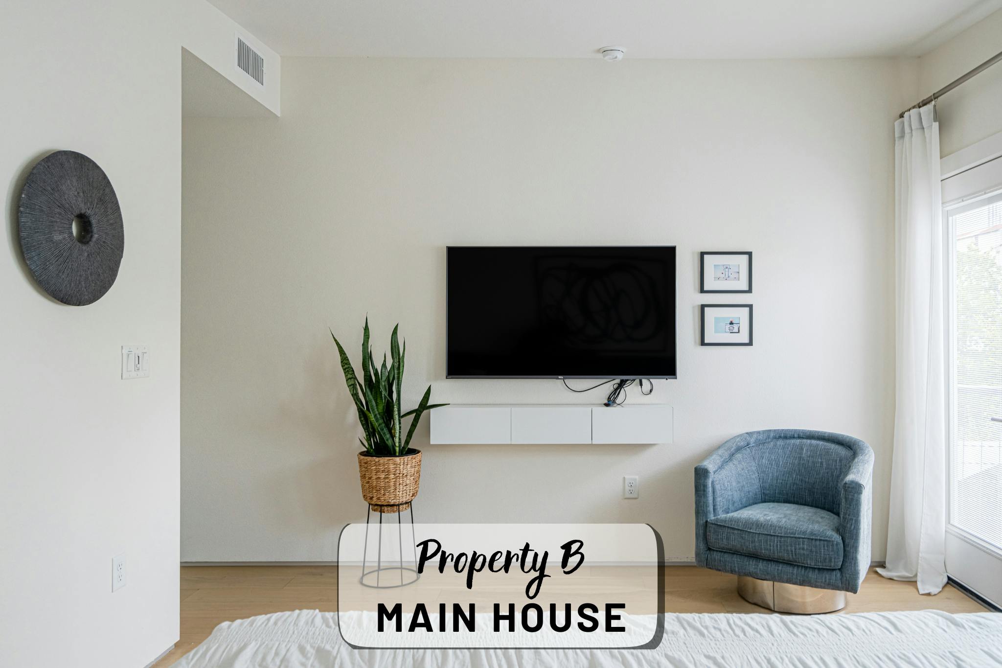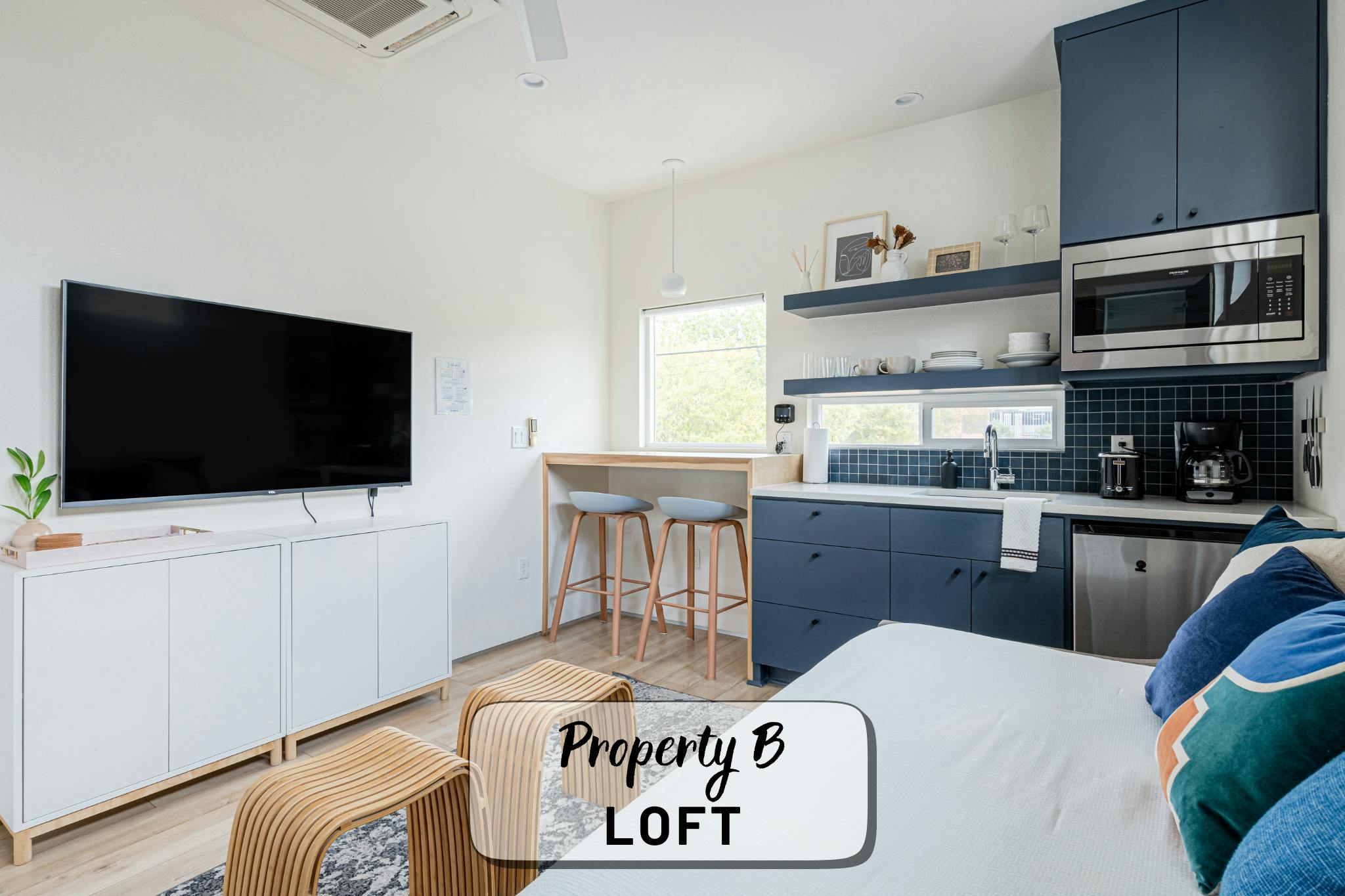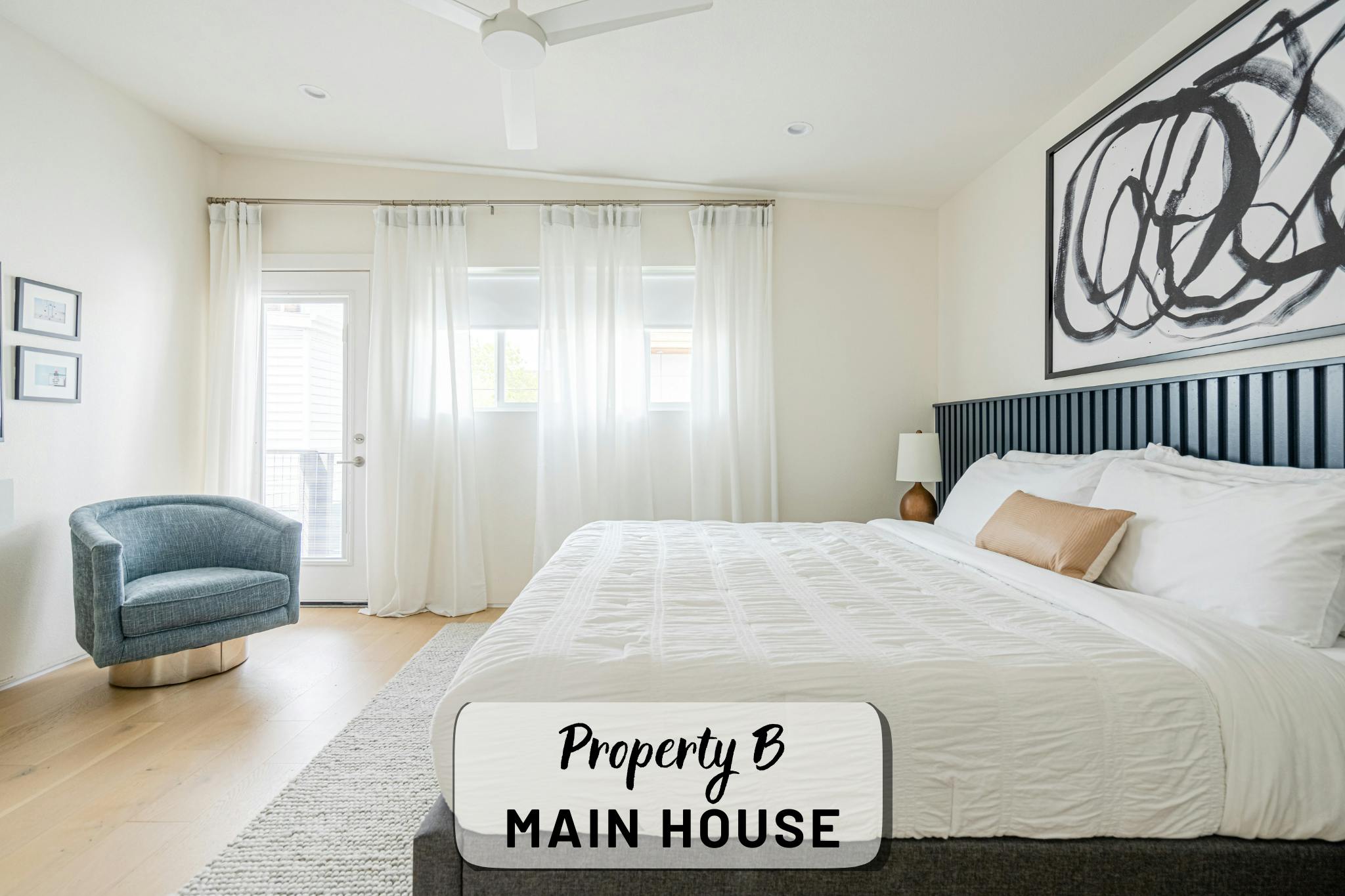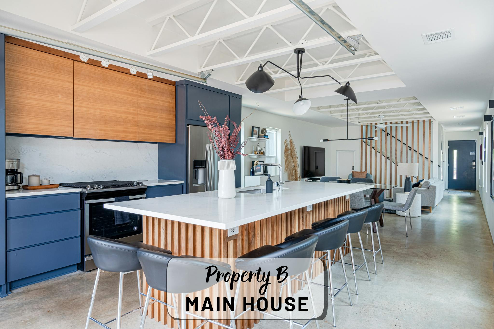 Our property contains two separate units within a fenced in lot. The main house offers an open, production-friendly layout with abundant natural light, comfortable modern furnishings, and a glass garage door that opens to the patio for easy indoor–outdoor flow. The separate garage loft adds a highly versatile second space. The property includes a kitchen, kitchenette, five bedrooms and four full bathrooms, making it well-suited for talent holding, wardrobe, breakout space, or overnight stays.