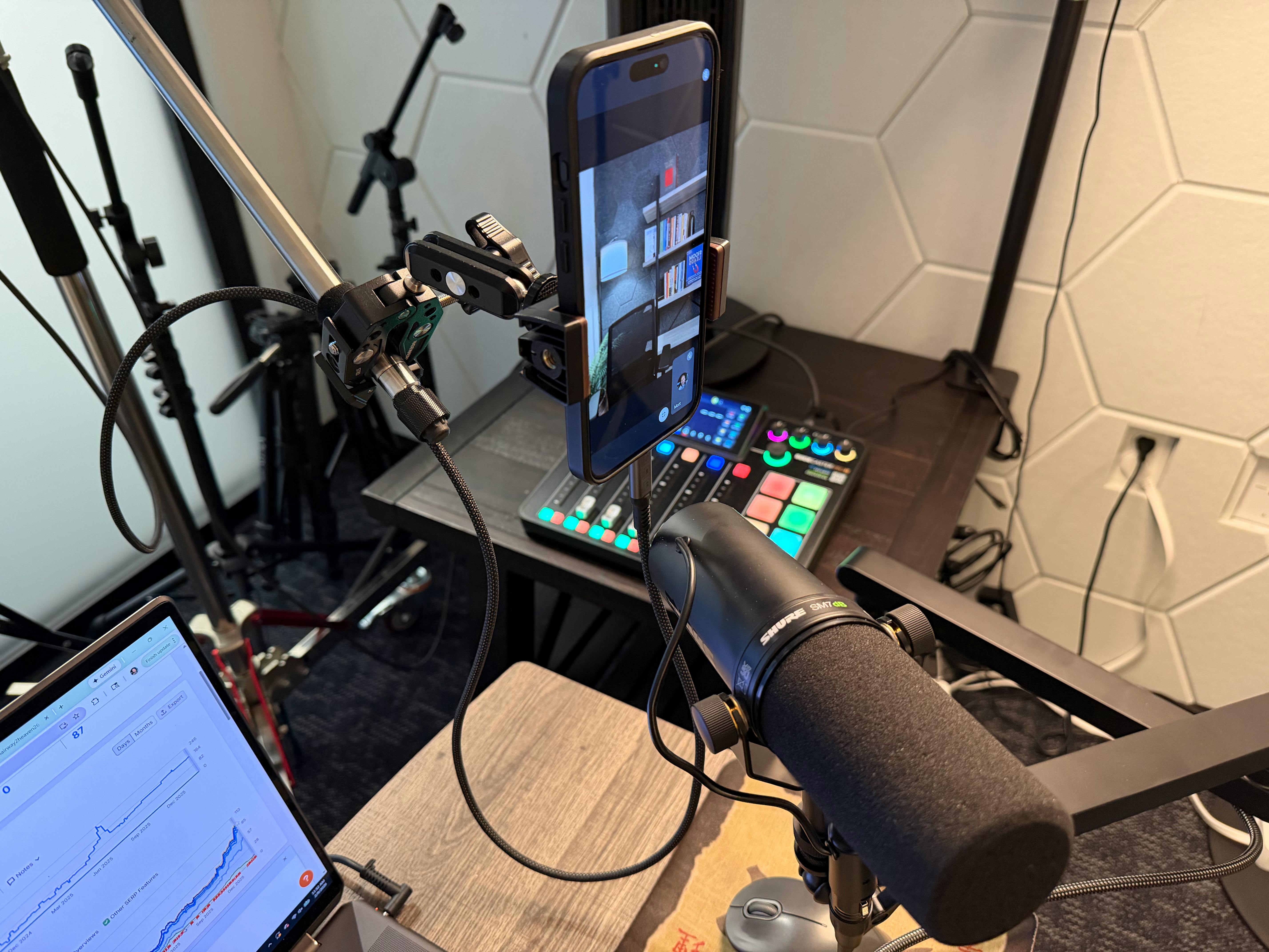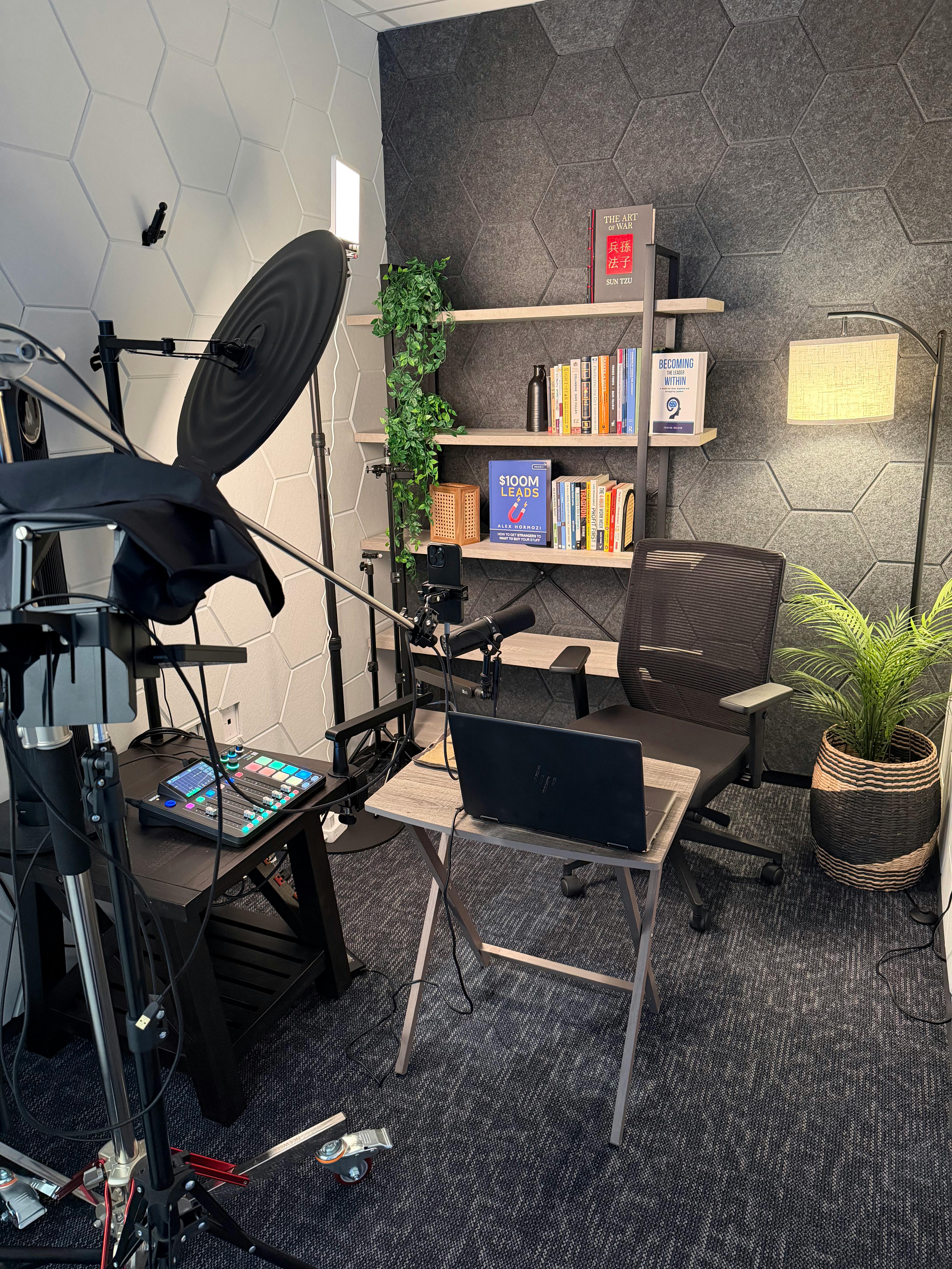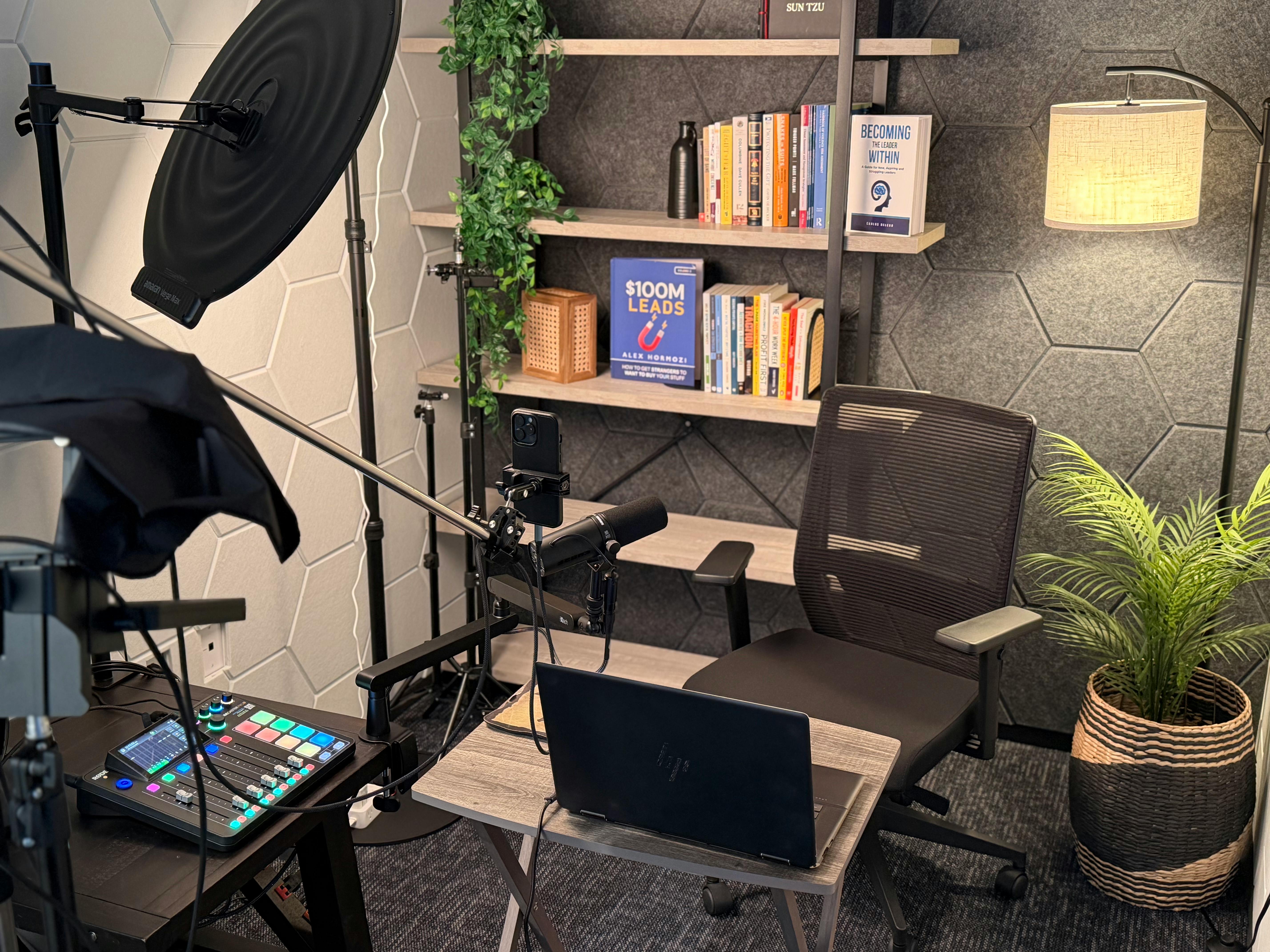 Professional lighting is available throughout the studio using multiple Amaran lights mounted on C-stands for a clean, polished, camera-ready look. The setup is ideal for podcast recording, video interviews, YouTube content, branded media, and talking-head videos. This San Antonio podcast studio lighting configuration helps create flattering, professional visuals for creators, entrepreneurs, and small business content production.