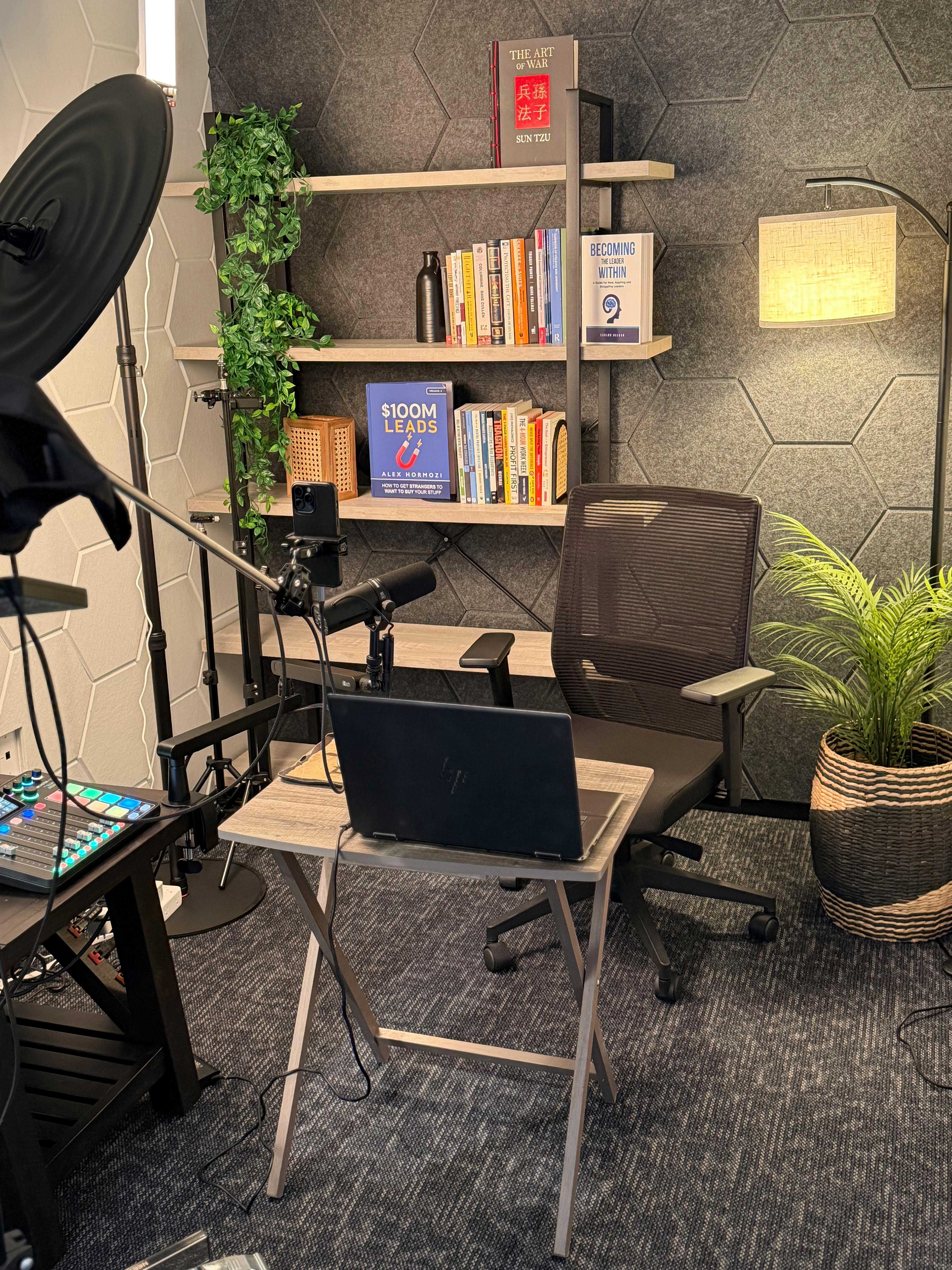 Professional San Antonio podcast studio for podcast recording, video interviews, and branded content. Please treat all cameras, microphones, lighting, and furniture with care. No smoking, vaping, or illegal drugs. Keep food and drinks away from equipment. Leave within your booking time.