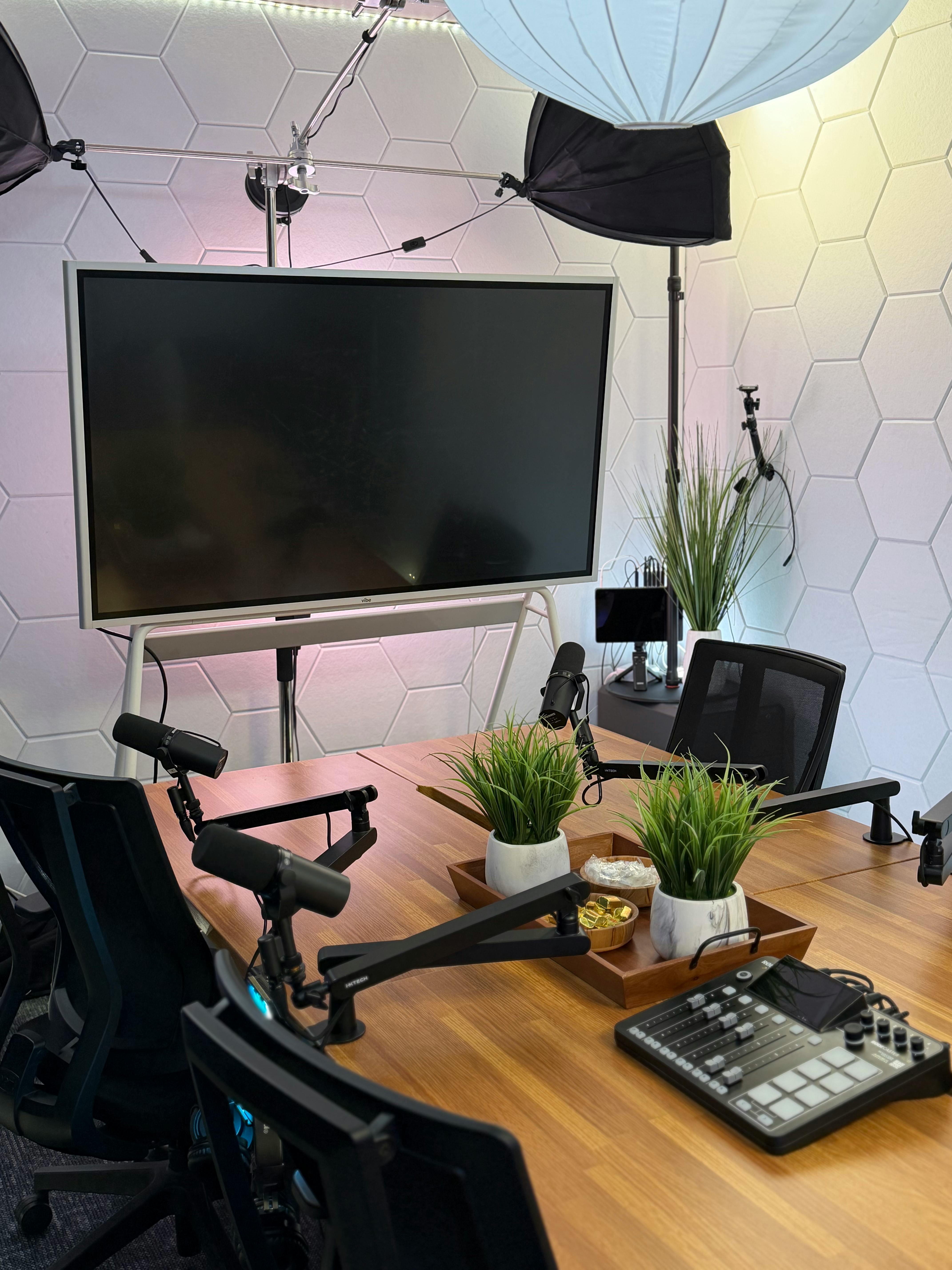 This modern recording studio offers a variety of seating arrangements for solo, dual or group discussions. With professional cameras, lighting, and audio support available, the space provides an efficient turnkey setup for teams producing consistent video and audio content.