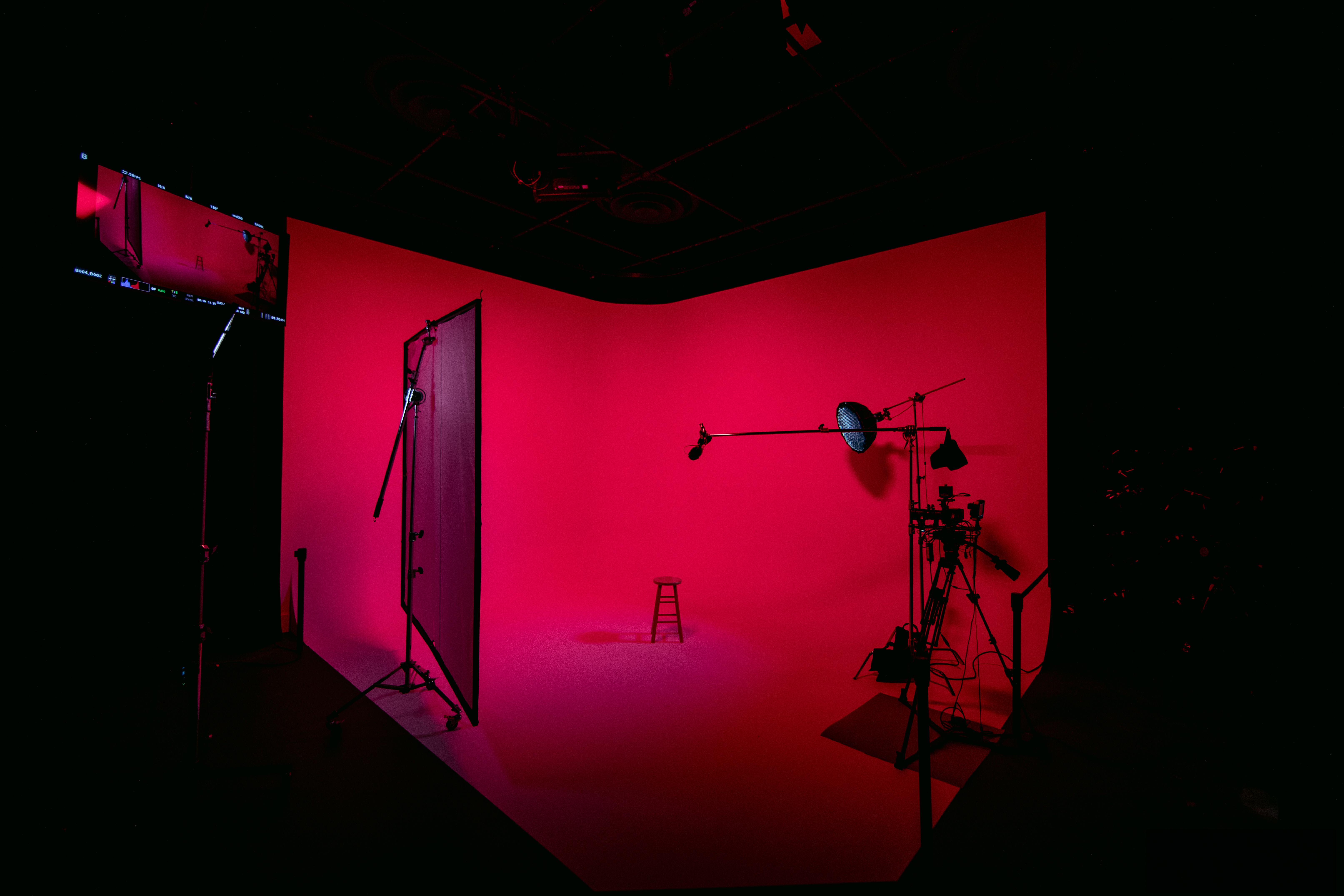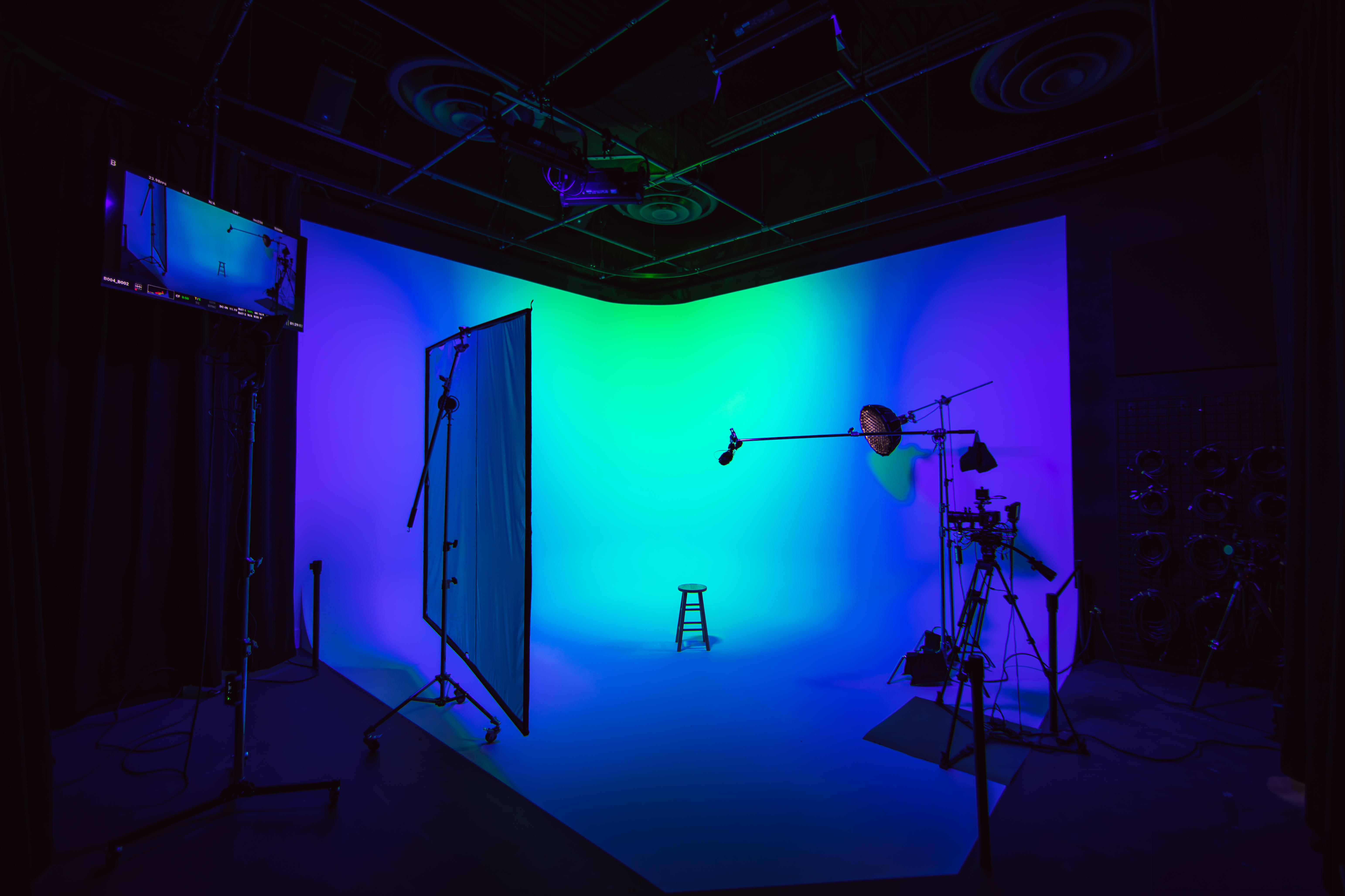 Our Versatile Photo & Video Studio with Easy Access is our most well-rounded space, giving you the option of choosing one of its included features— a pre-lit cyc wall, a pre-lit green screen, or neither if you're just looking for the basics. The space includes a lighting console to adjust cyc or green screen lighting, sandbags, a television monitor, and a cable wall stocked with power, HDMI, SDI, Ethernet, XLR, and DMX cables.