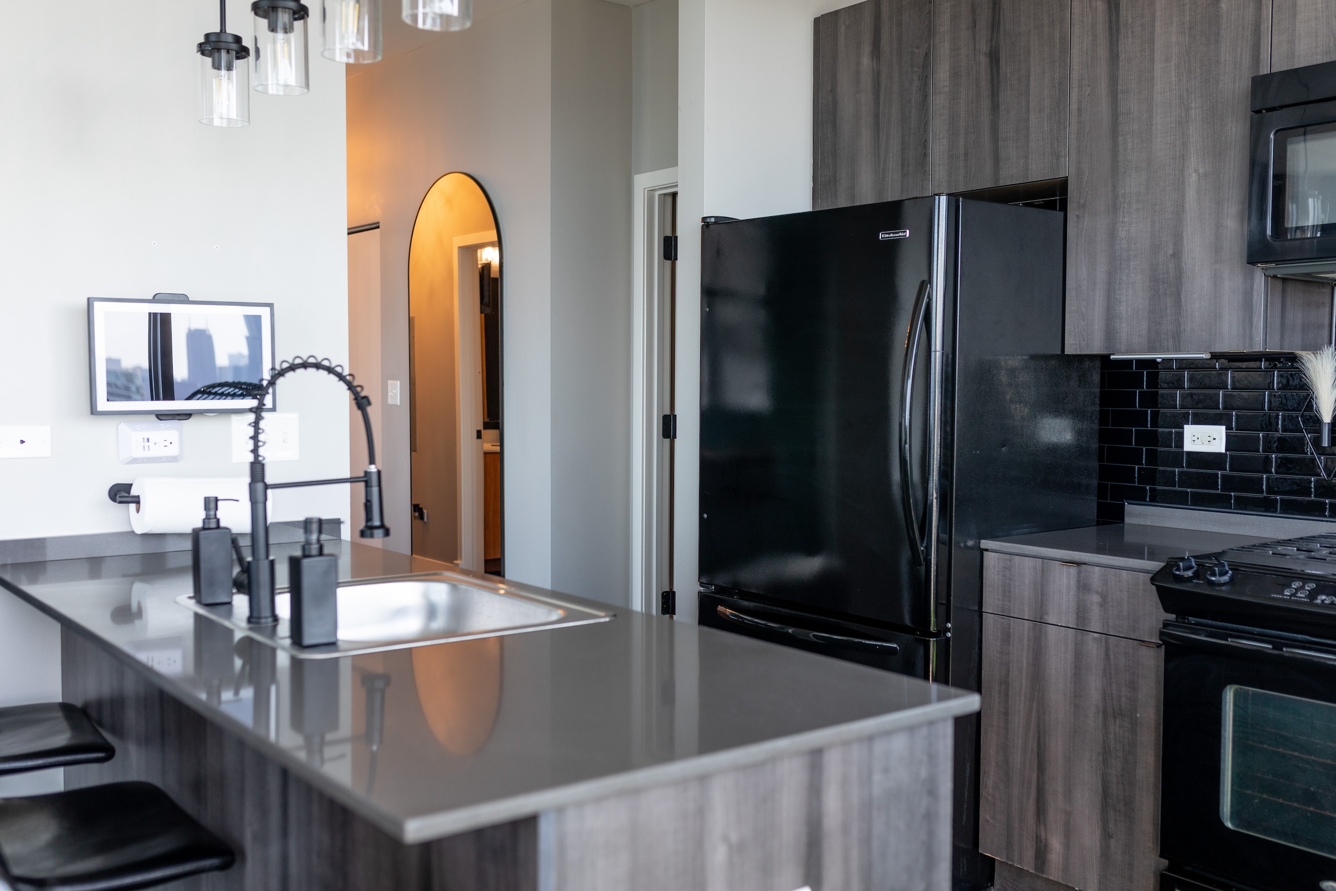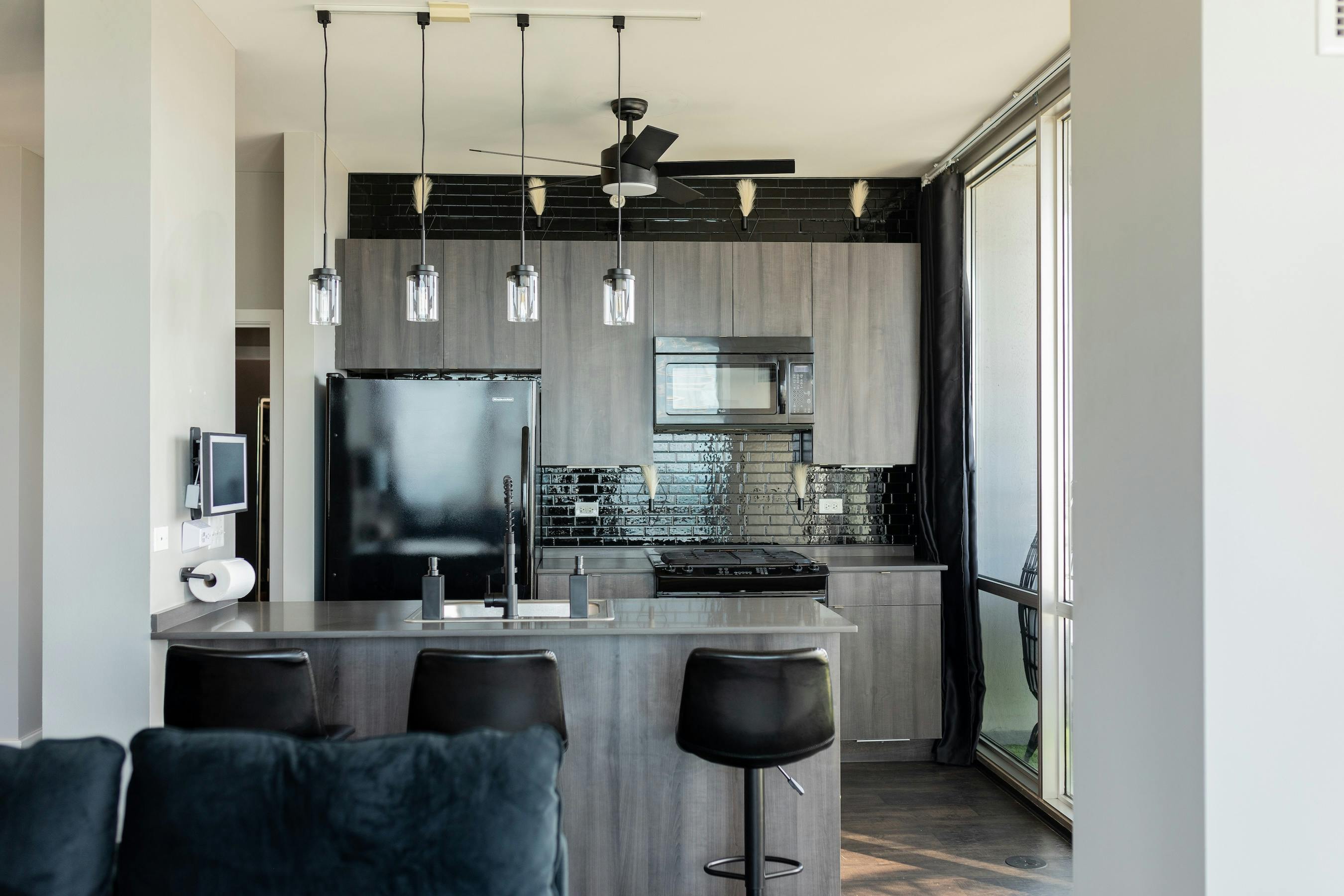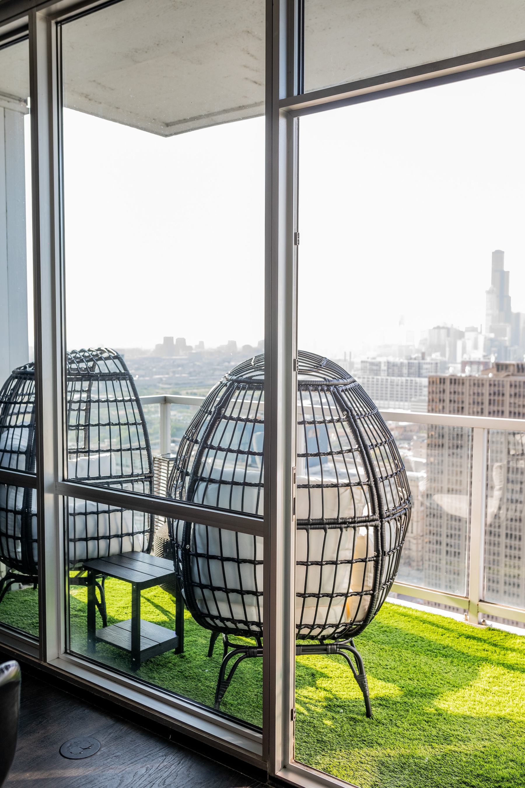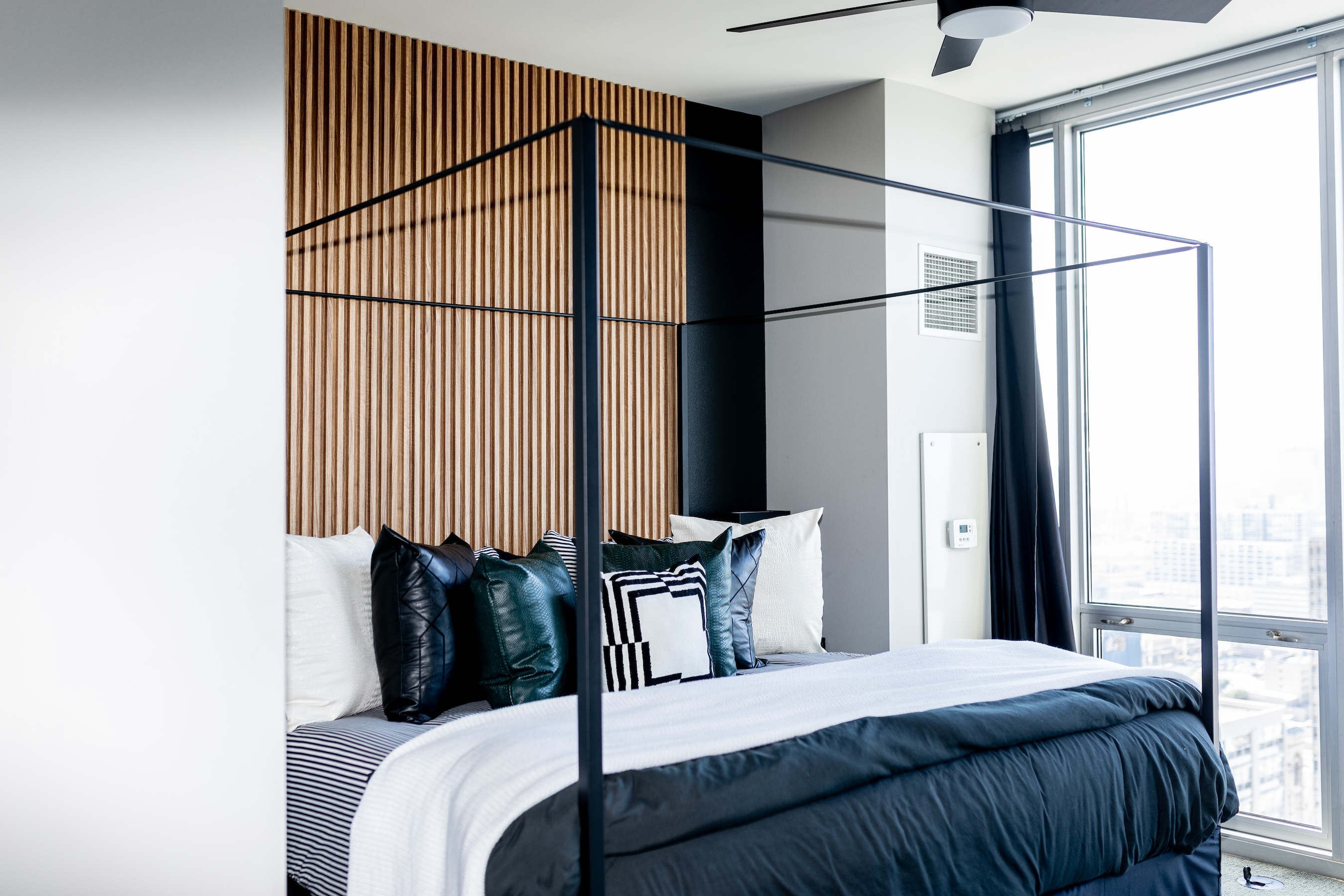 This 1,350 sqft luxury apartment has sleek and modern furnishings with a slightly masculine vibe. There's a small balcony off of the kitchen, offering amazing views of the city. The floor-to-ceiling windows lighten the space up, and the modern wood paneling adds texture, making it a great location for editorials and interviews!