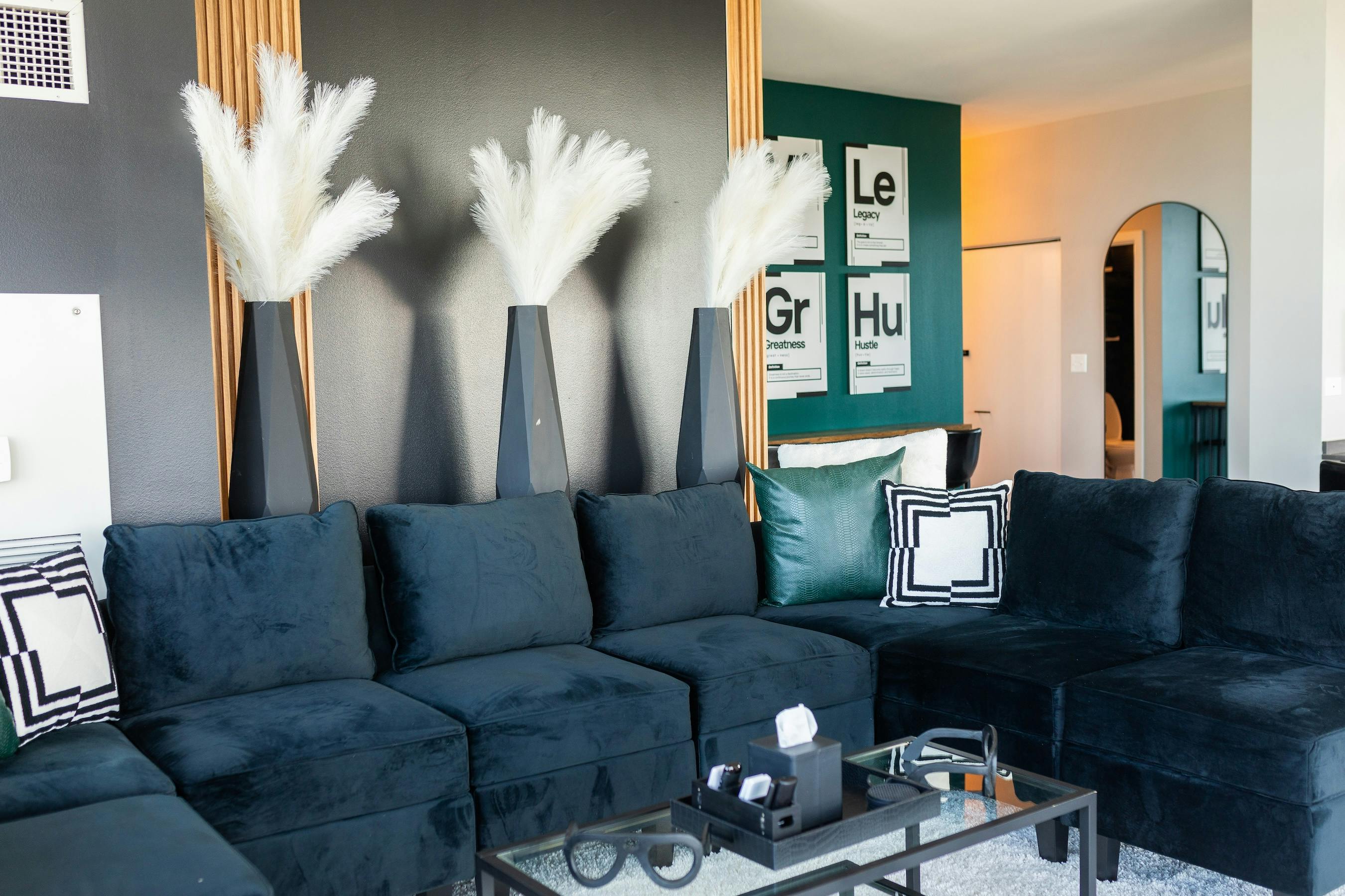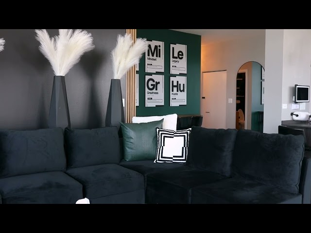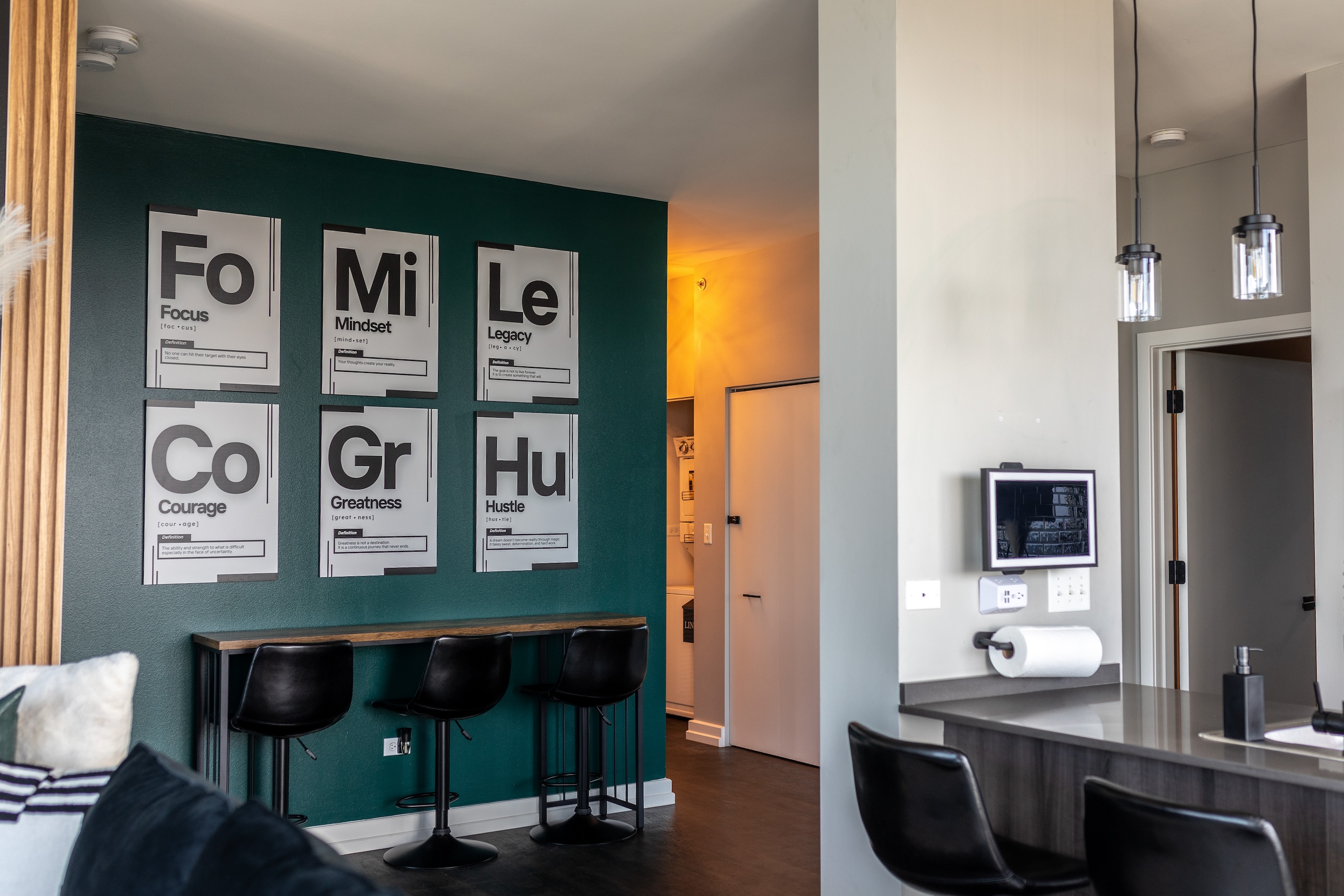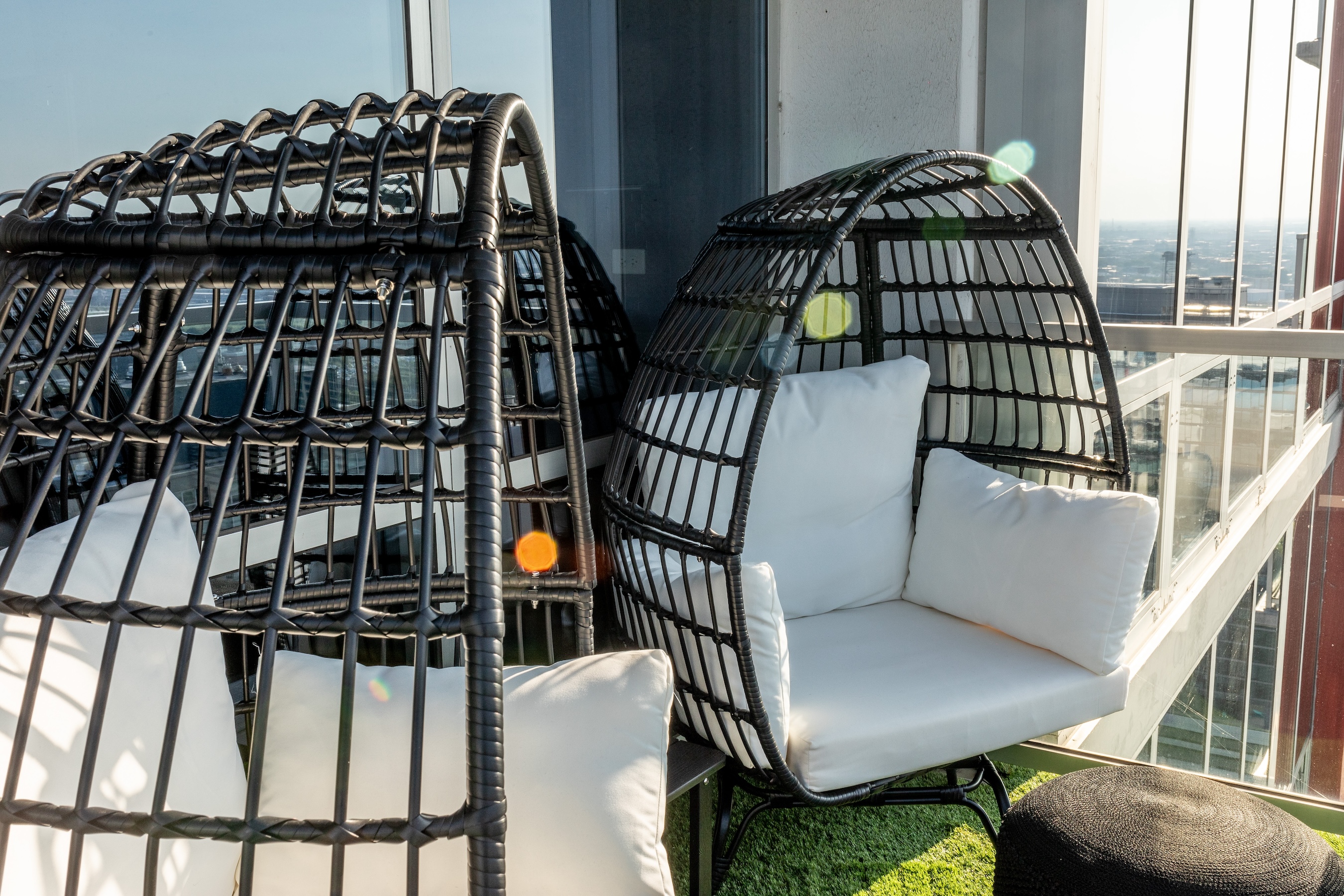 This 1,350 sqft luxury apartment has sleek and modern furnishings with a slightly masculine vibe. There's a small balcony off of the kitchen, offering amazing views of the city. The floor-to-ceiling windows lighten the space up, and the modern wood paneling adds texture, making it a great location for editorials and interviews!