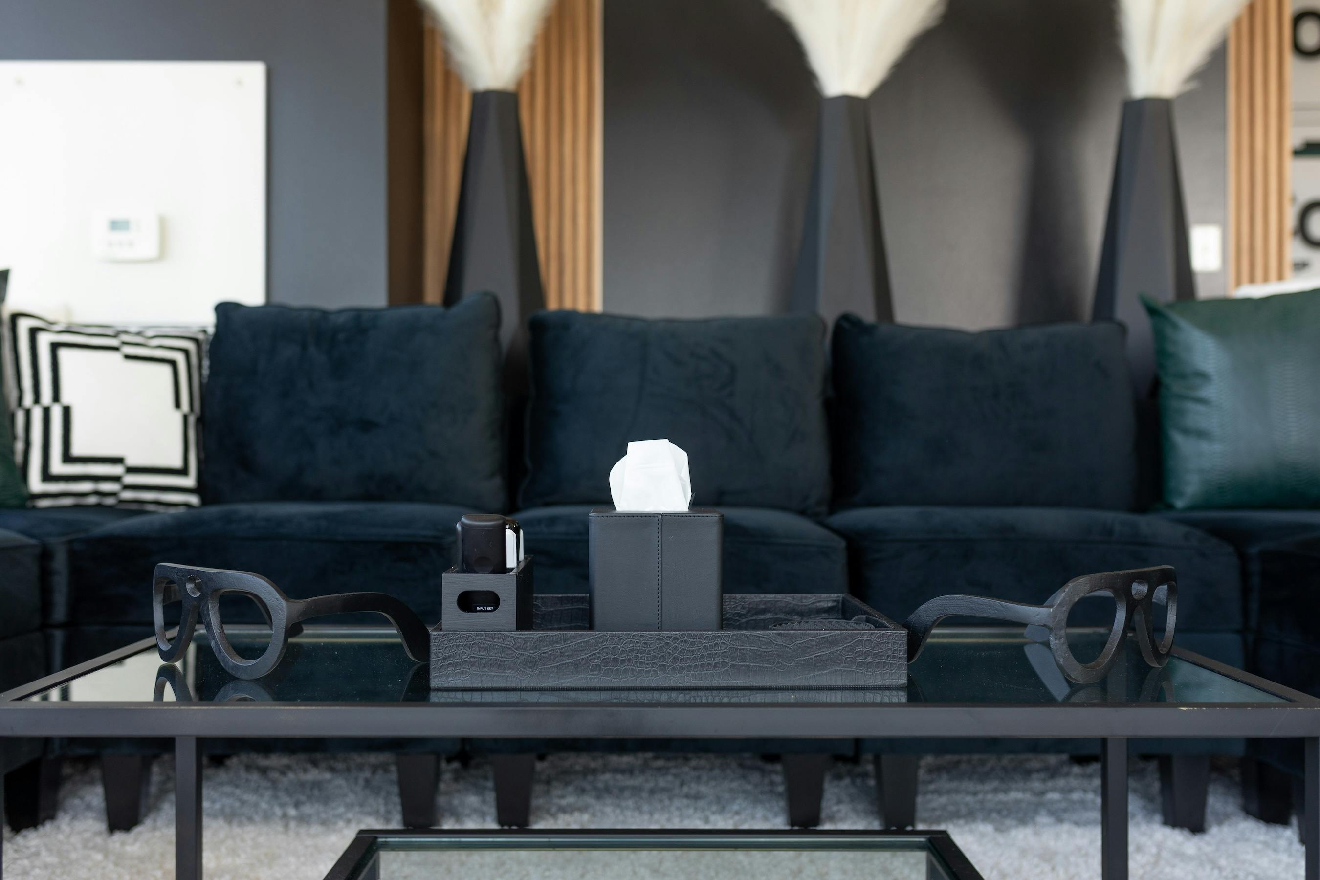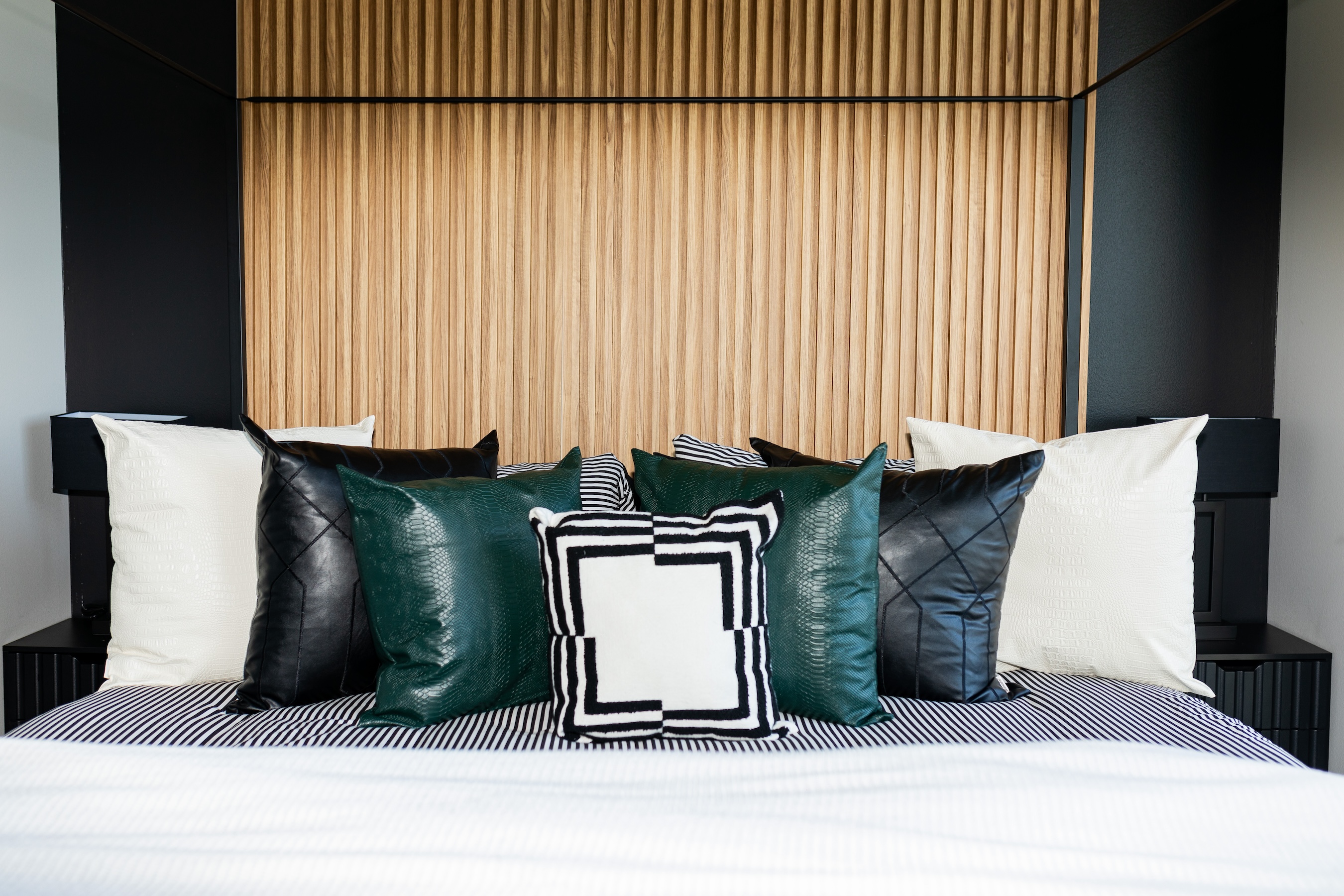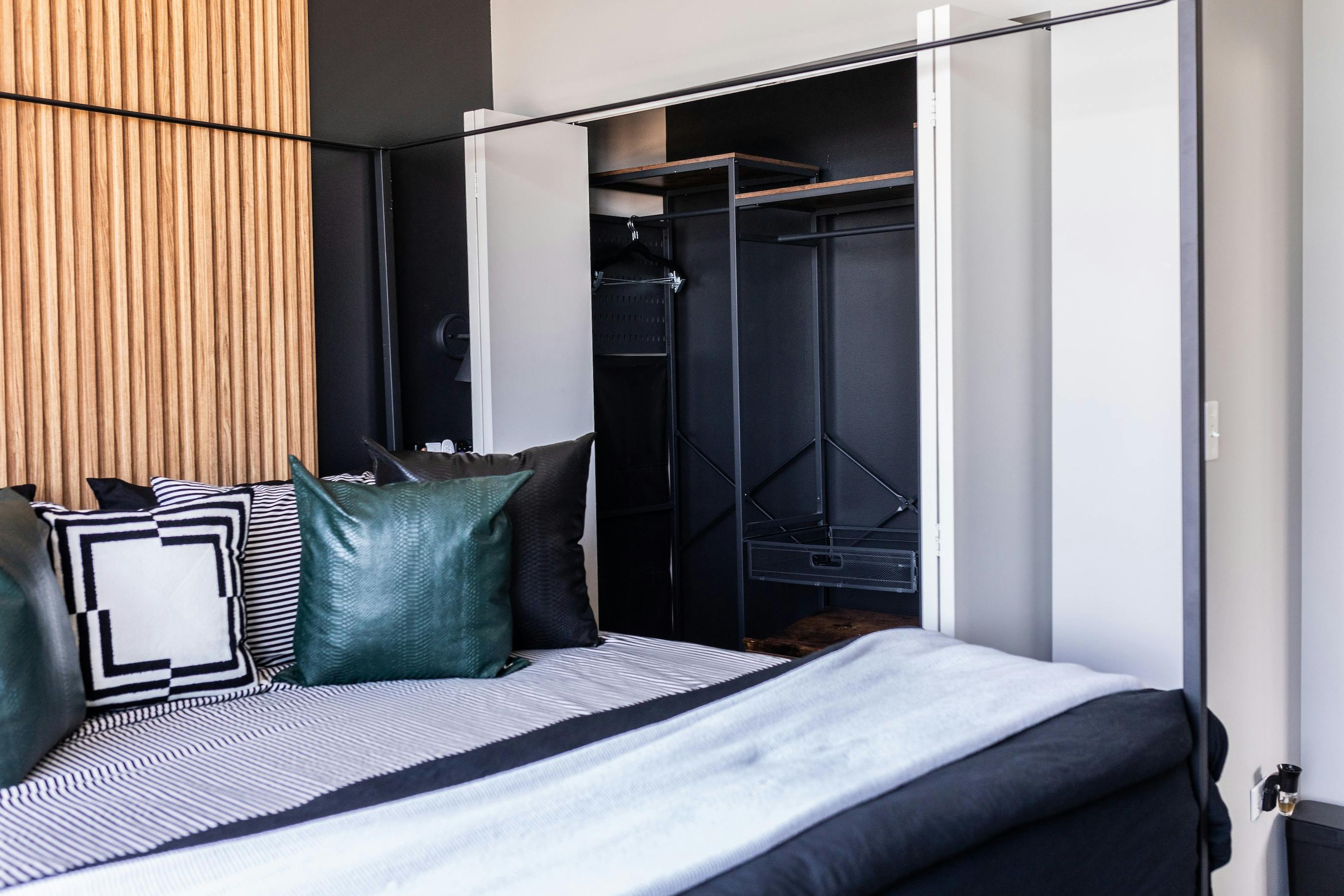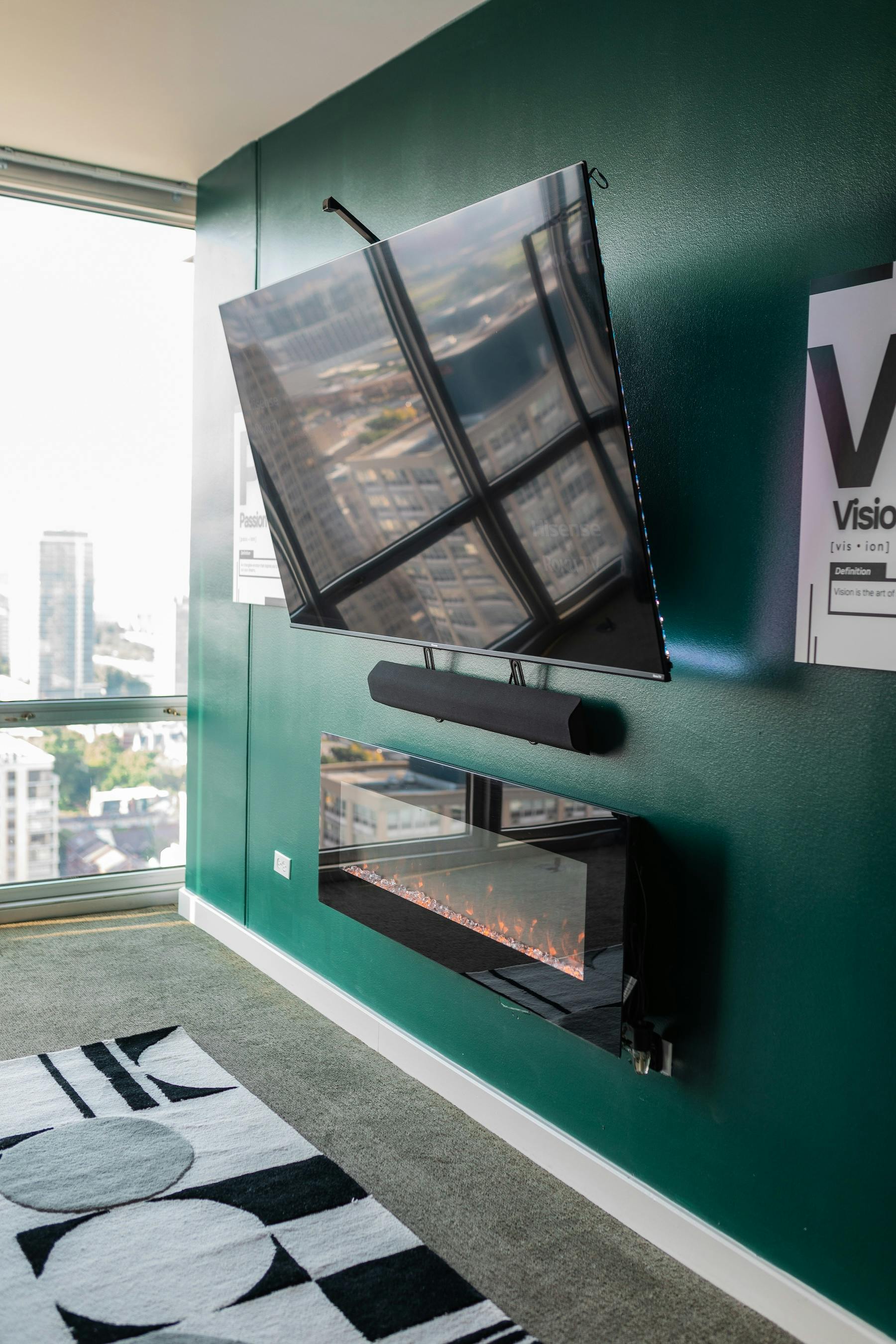 This 1,350 sqft luxury apartment has sleek and modern furnishings with a slightly masculine vibe. There's a small balcony off of the kitchen, offering amazing views of the city. The floor-to-ceiling windows lighten the space up, and the modern wood paneling adds texture, making it a great location for editorials and interviews!