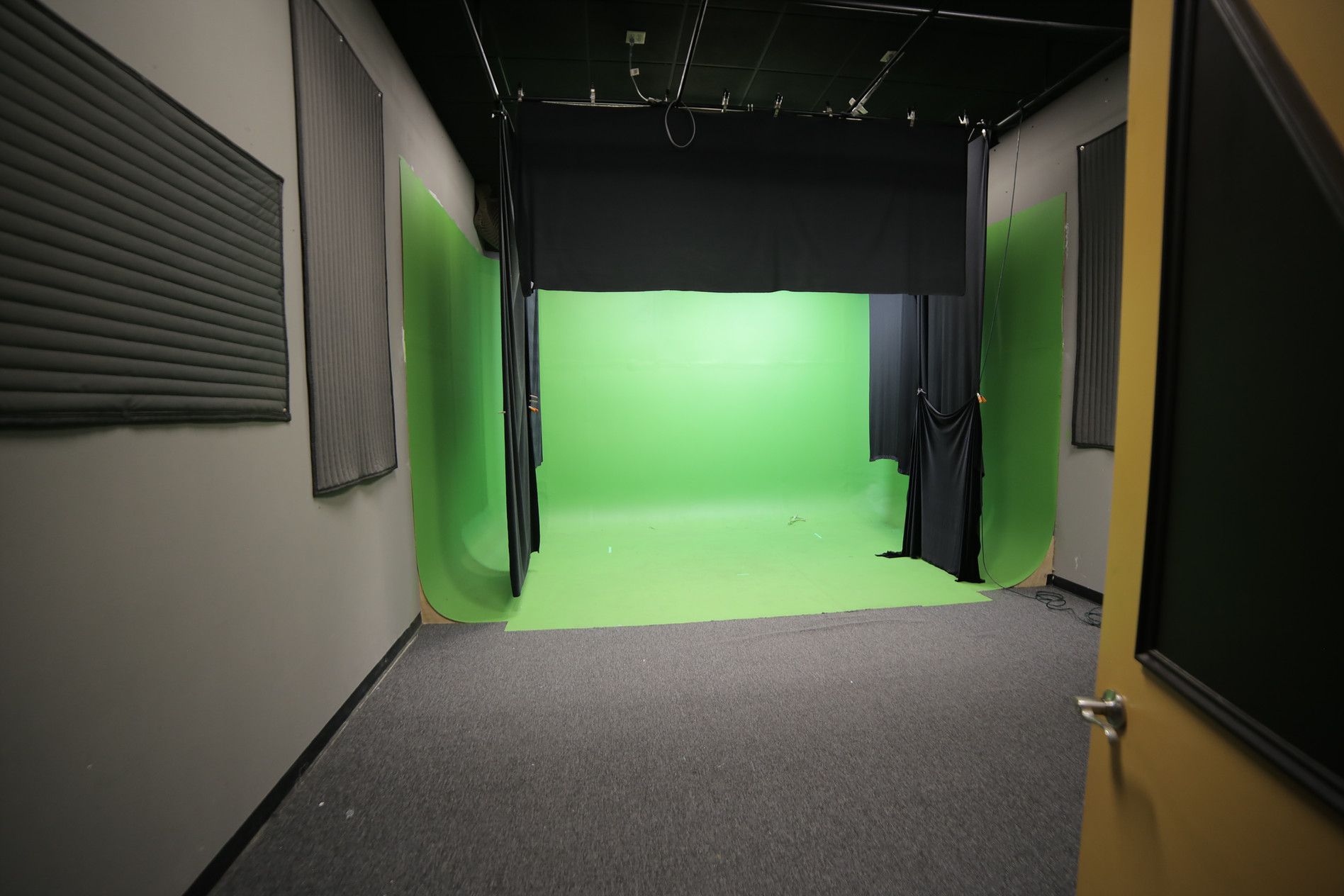 Studio B features carpeted floors, lighting grid, and a permanent green CYC wall. (400 sq. ft. / 17' X 23')