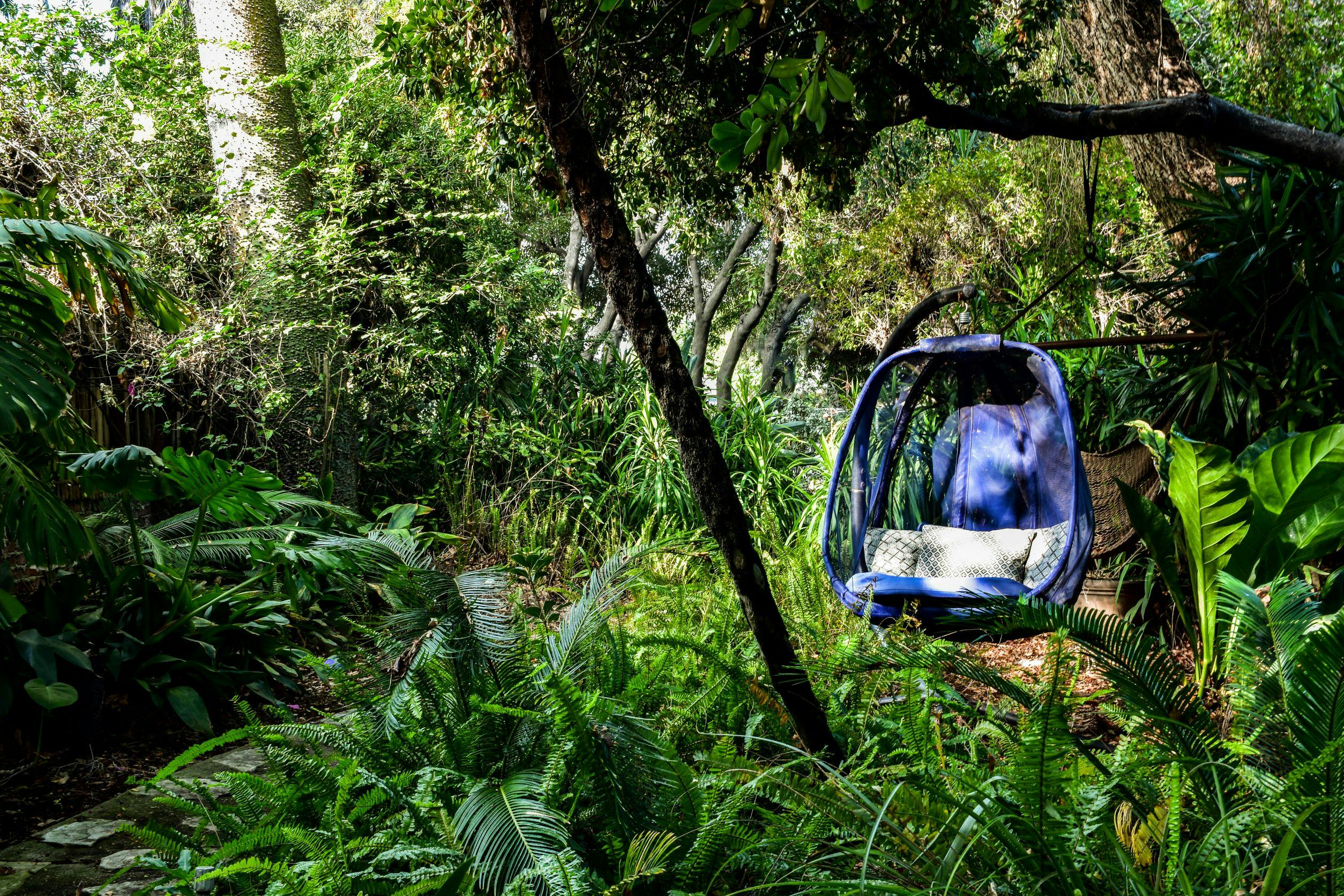 Lush and green with mature foliage and a jungle-like atmosphere, this amazing outdoor location featuring gardens and a comfortable staging area is perfect for editorial photo shoots, content creation, music video shoots and more!