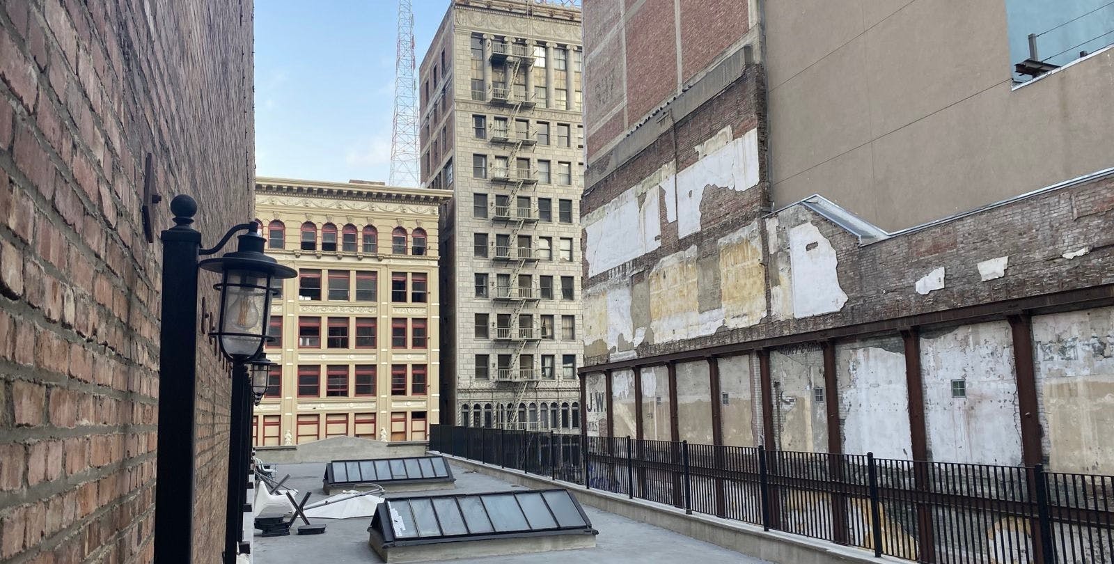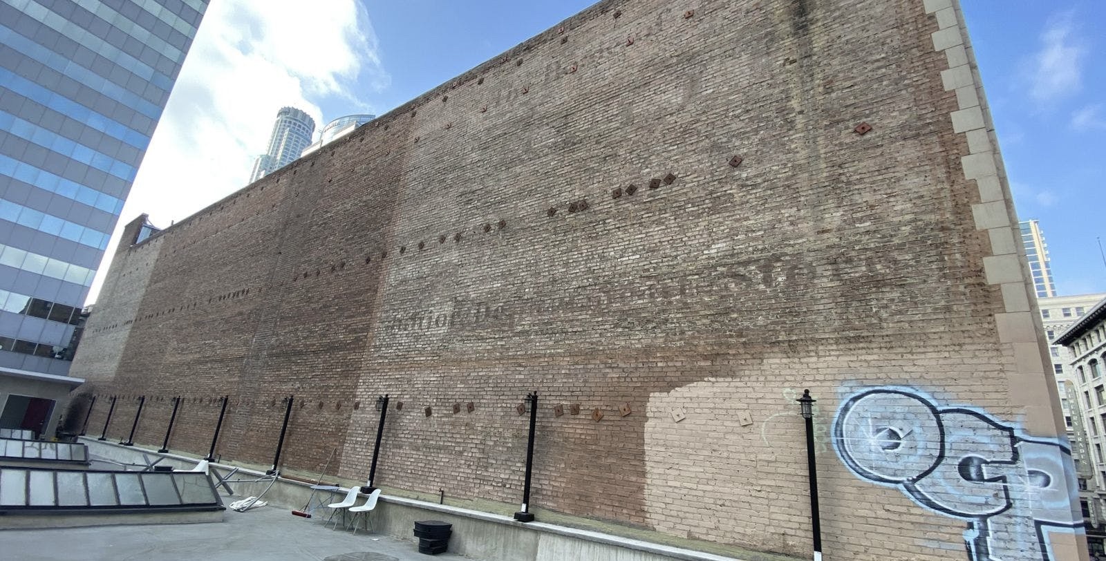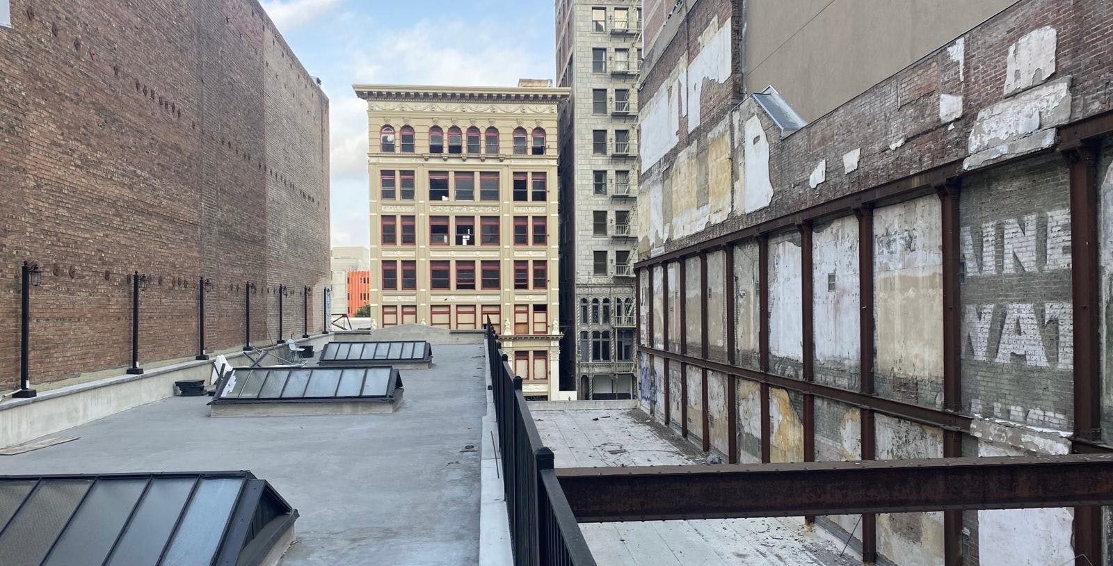 One side is lined with a three story brick facade. The side other faces an incredibly unique wall with remnants of old stucco and legible pieces of early 20th century advertising. The front of the building gives onto the historic Broadway Theater District with a striking view of the Arcade Building and the KRKO radio tower above it. Three classic skylights dot the 4,000 square foot area.