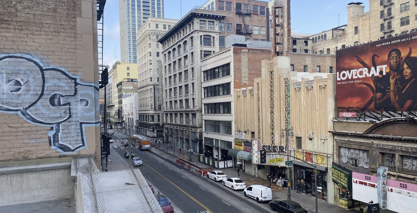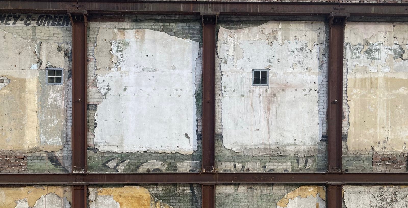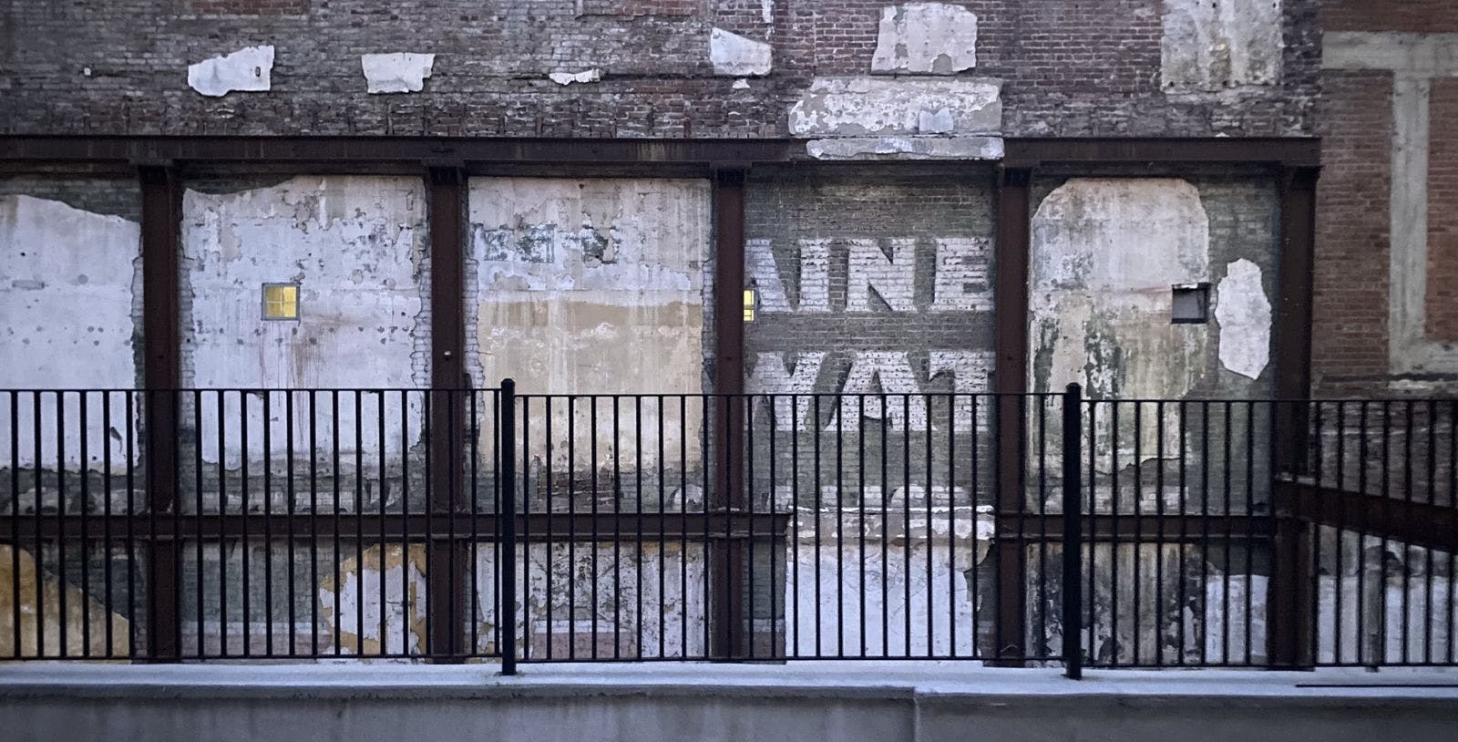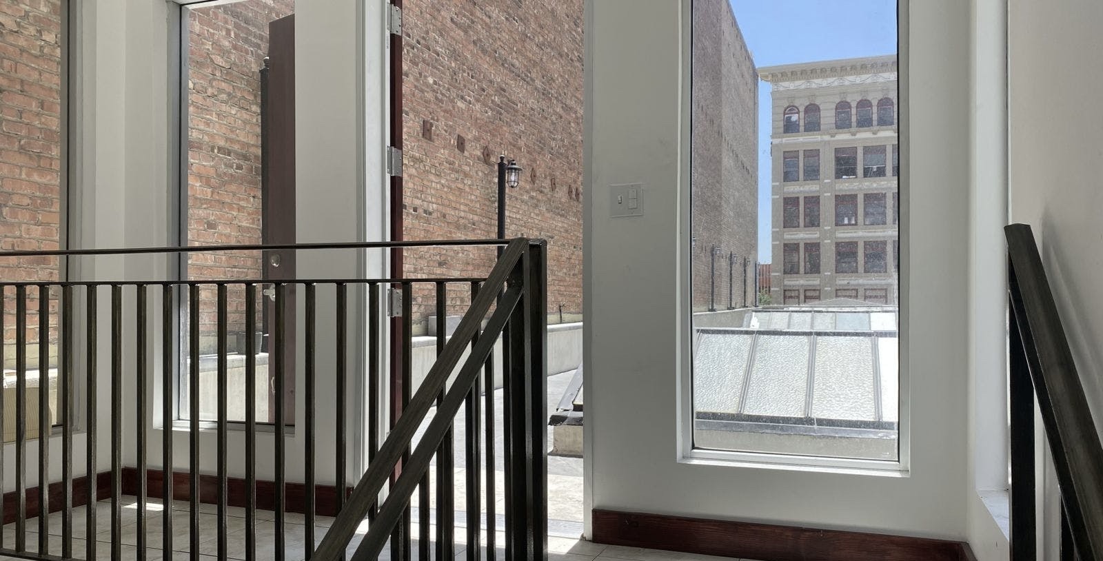 One side is lined with a three story brick facade. The side other faces an incredibly unique wall with remnants of old stucco and legible pieces of early 20th century advertising. The front of the building gives onto the historic Broadway Theater District with a striking view of the Arcade Building and the KRKO radio tower above it. Three classic skylights dot the 4,000 square foot area.