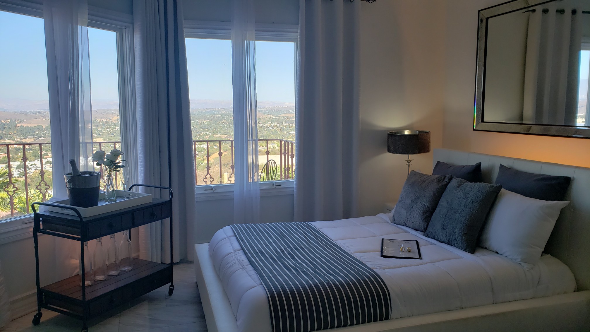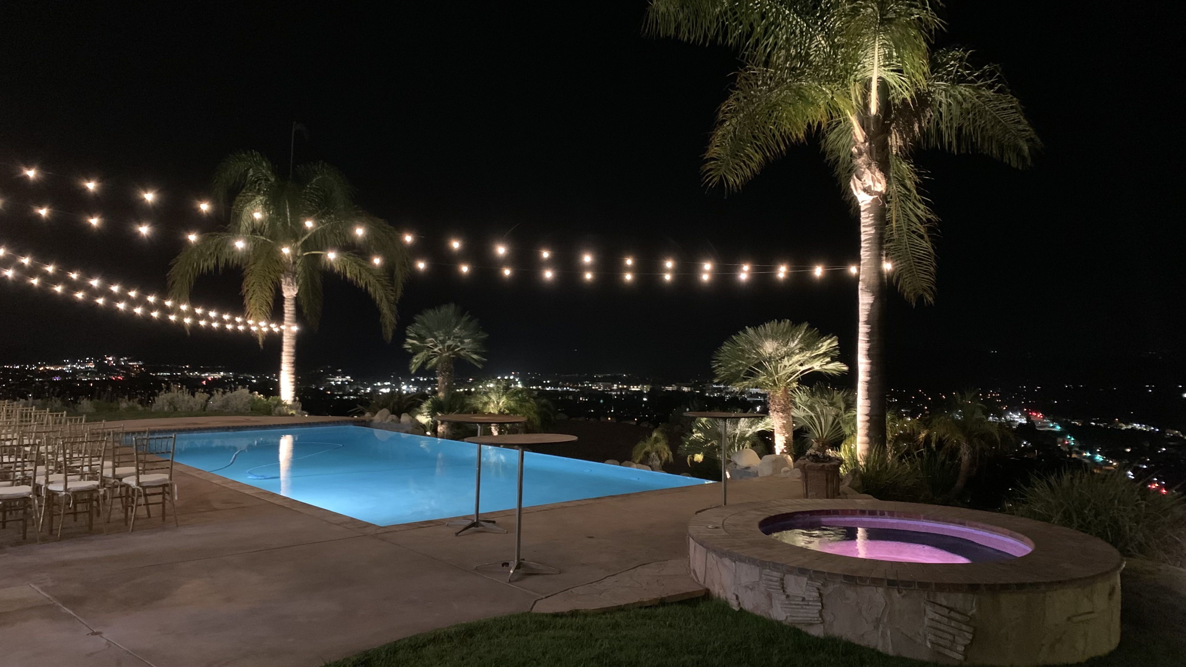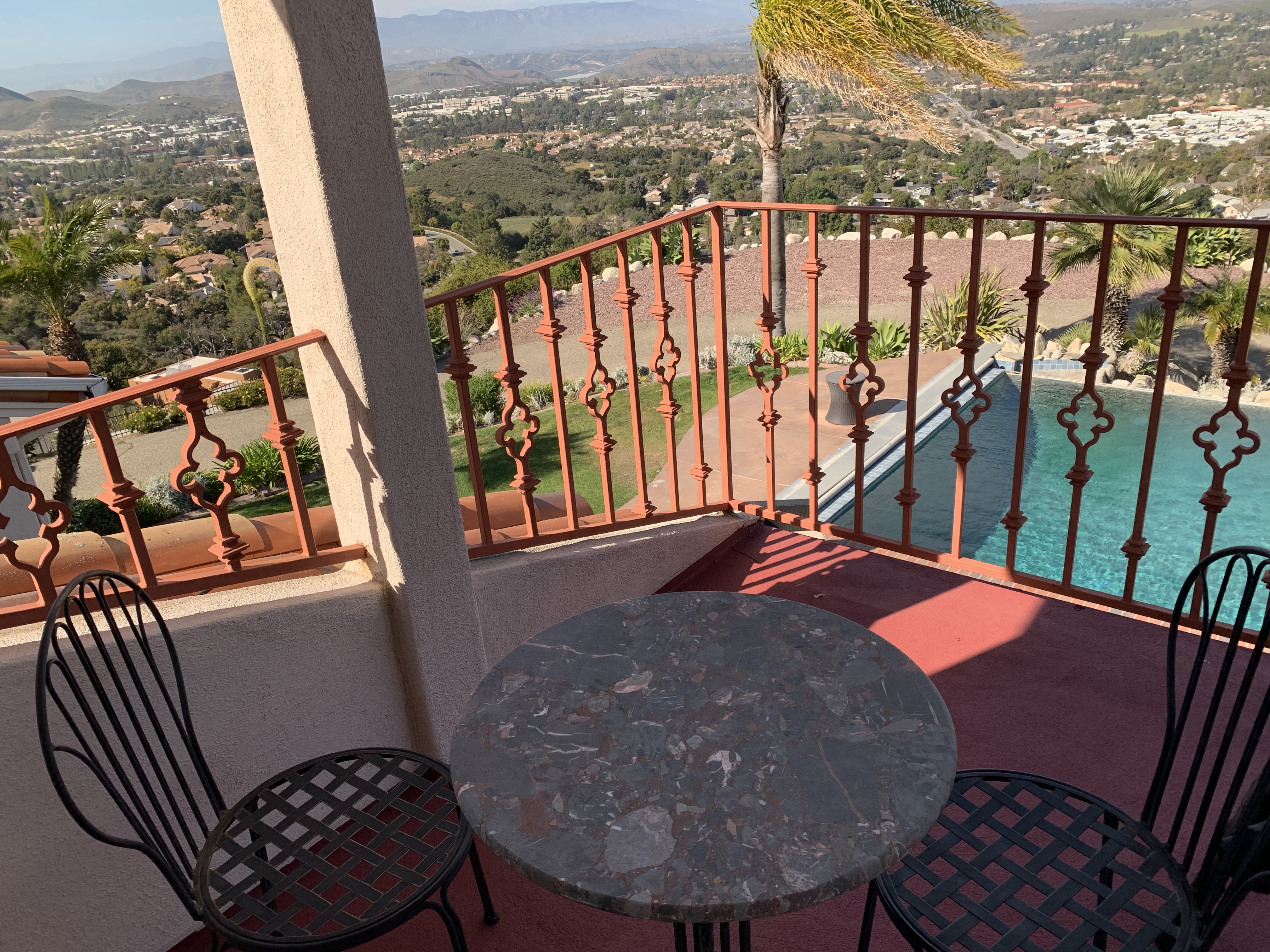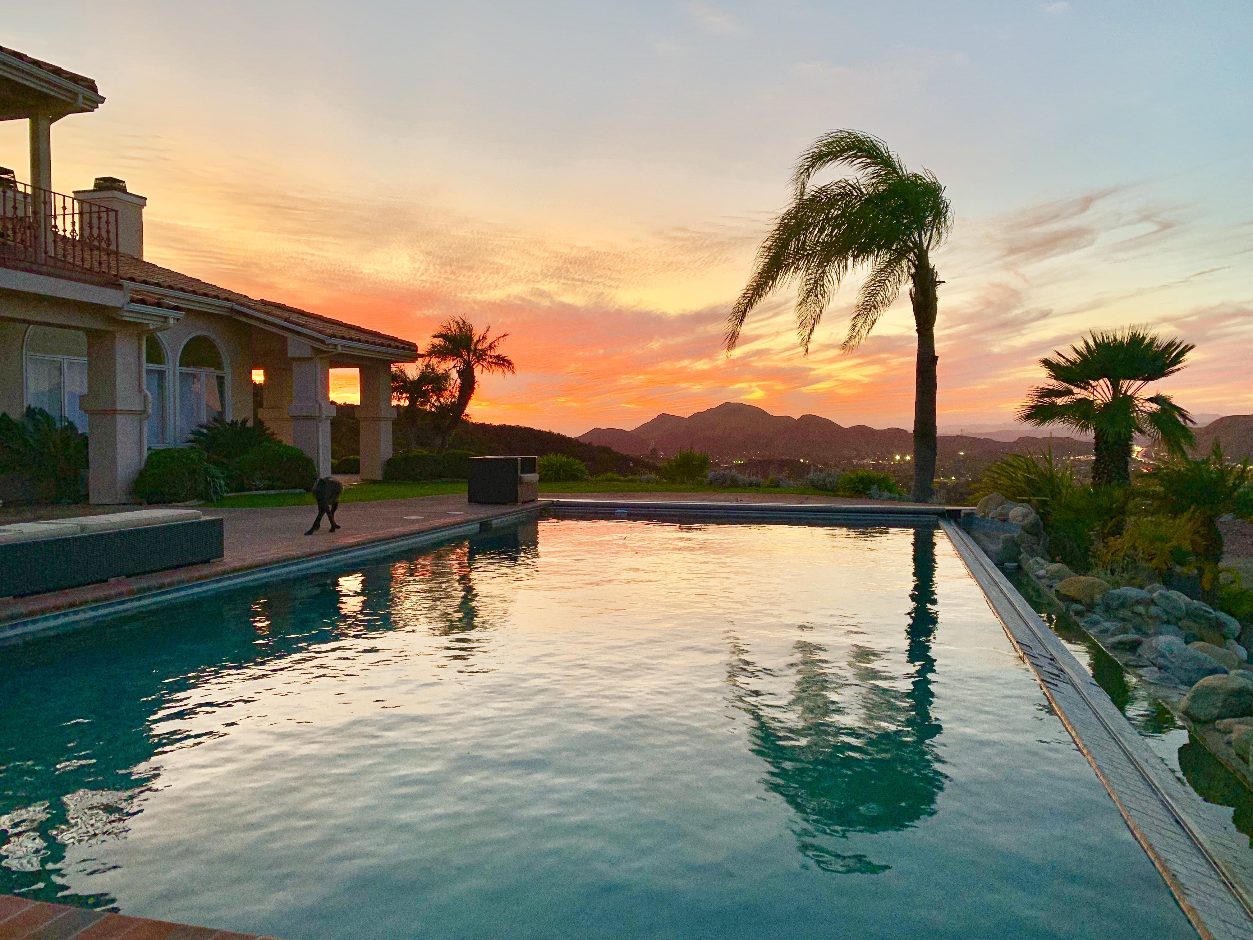This Mediterranean estate sits on 1.46 acres of terraced hillside with stunning mountain and city views. The grounds feature a lush lawn, manicured landscaping, and an oversized patio with several sitting areas. The interior of the home offers four bedrooms, four bathrooms in multiple living areas, providing plenty of areas to shoot or stage.