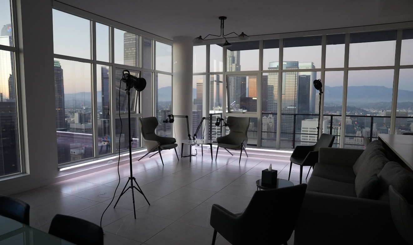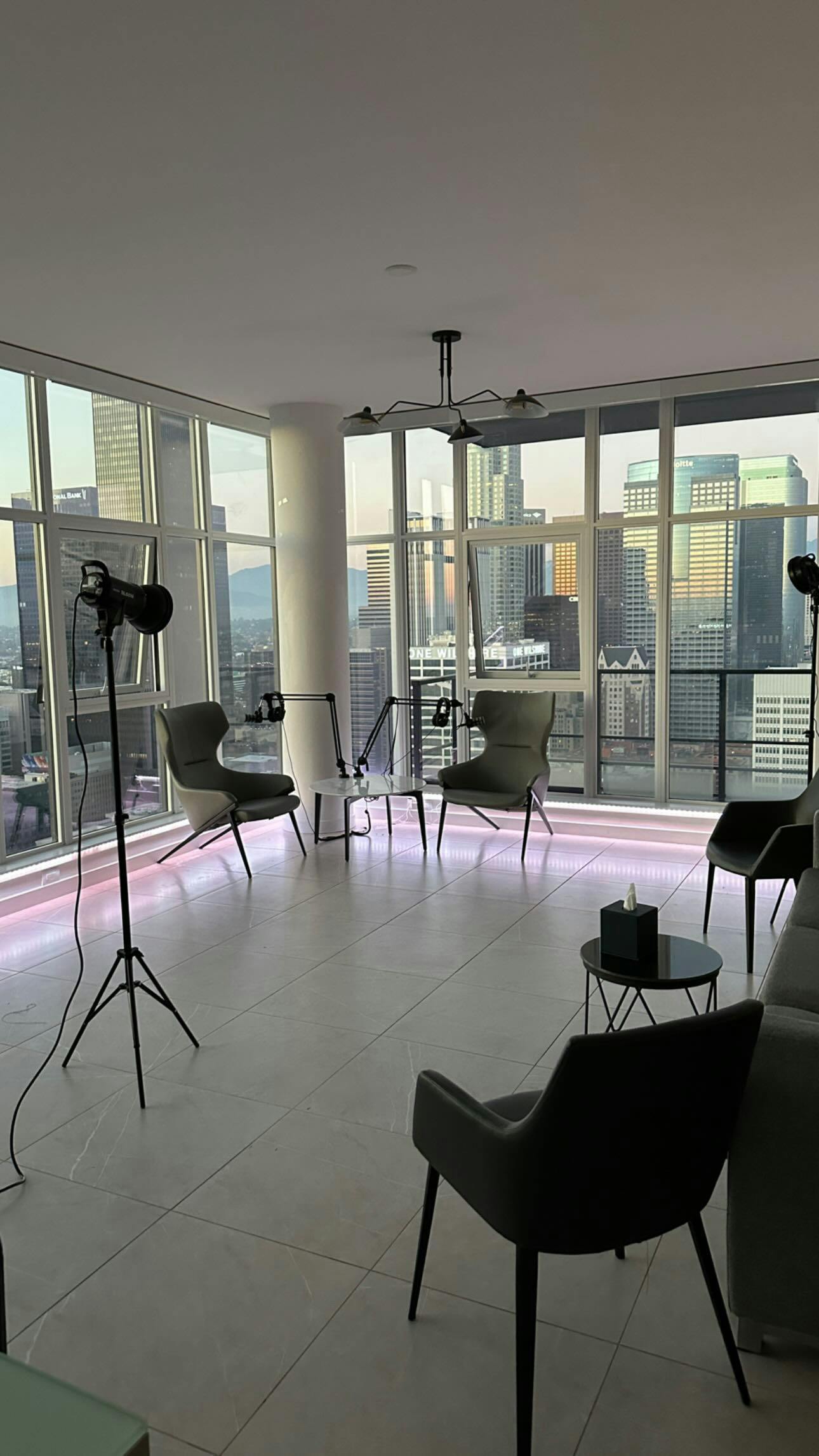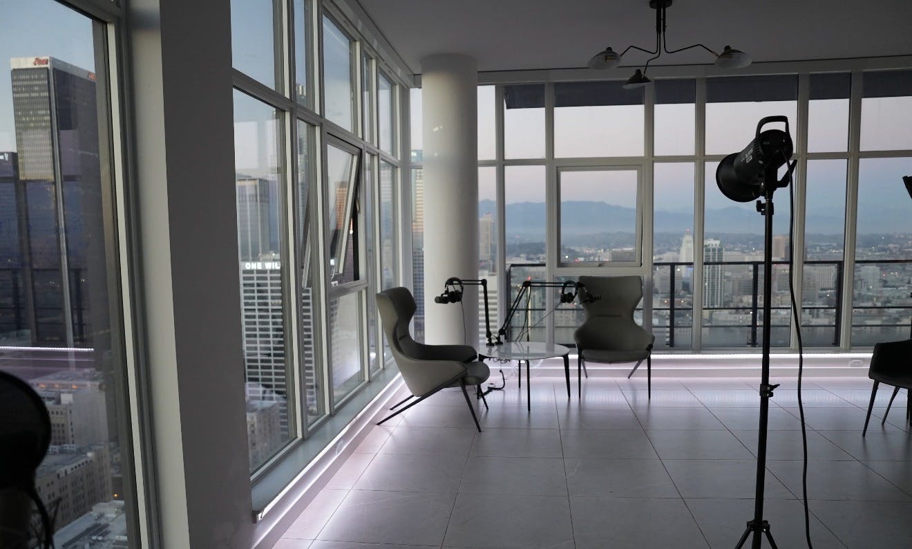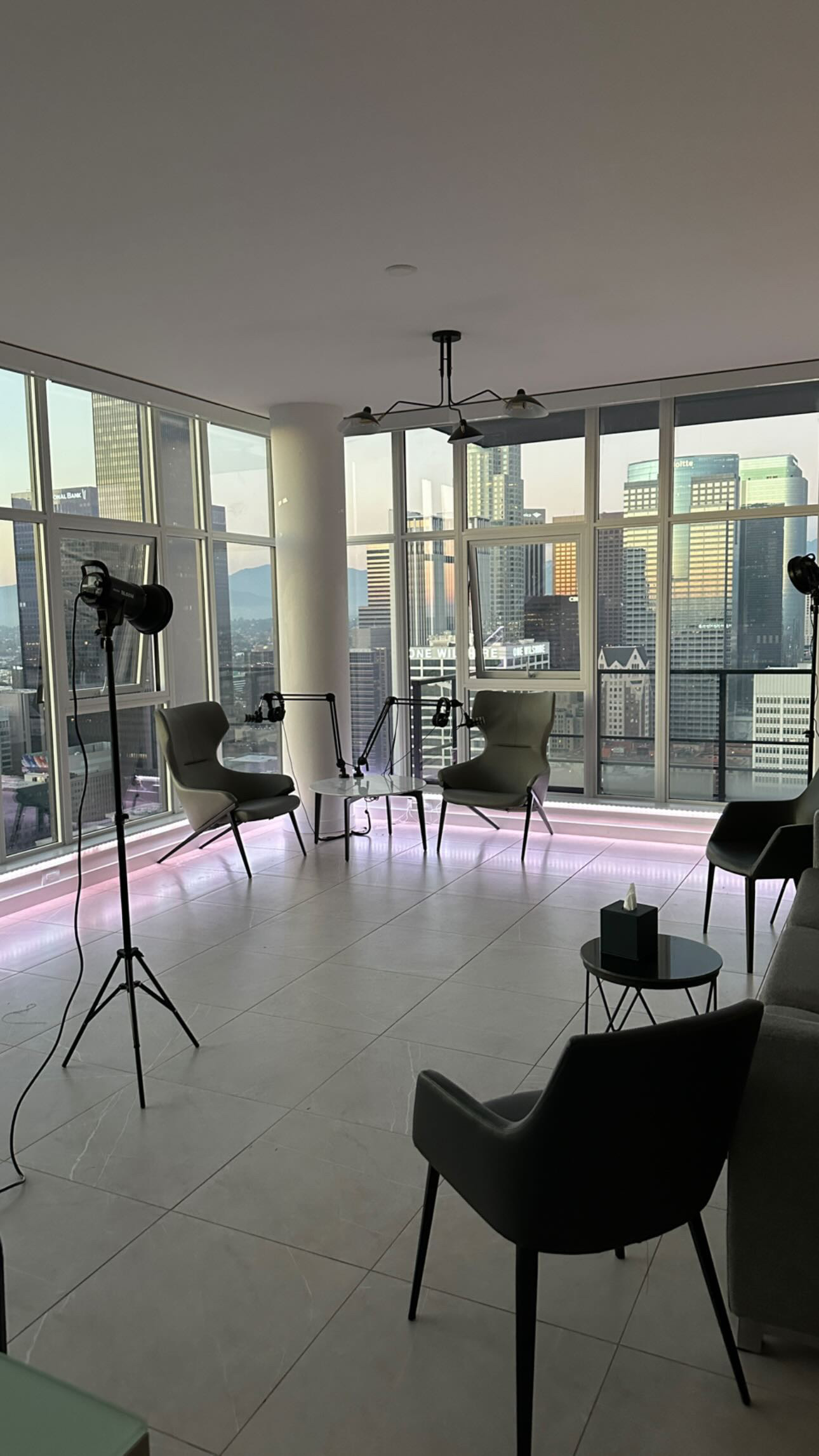 This luxury loft has an open layout with a modern and minimal aesthetic, letting the incredible views stand out as the showstopper. The downtown skyline serves as a perfect backdrop for interviews and head shots. The open kitchen in oversized Island would also be great for shooting cooking segments!