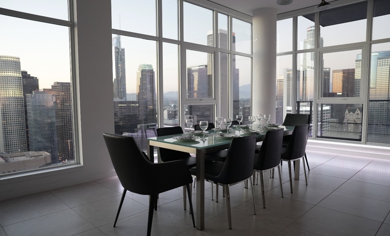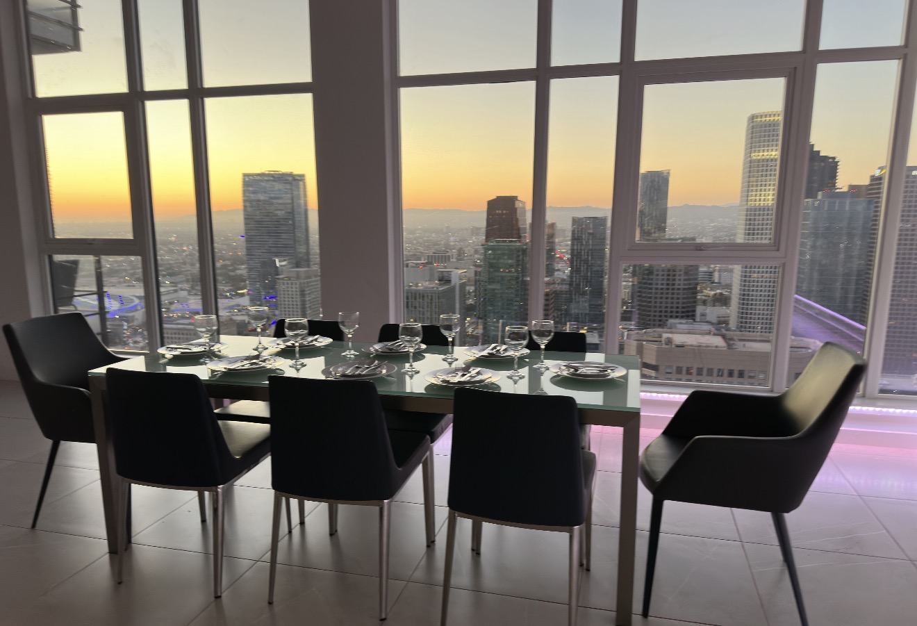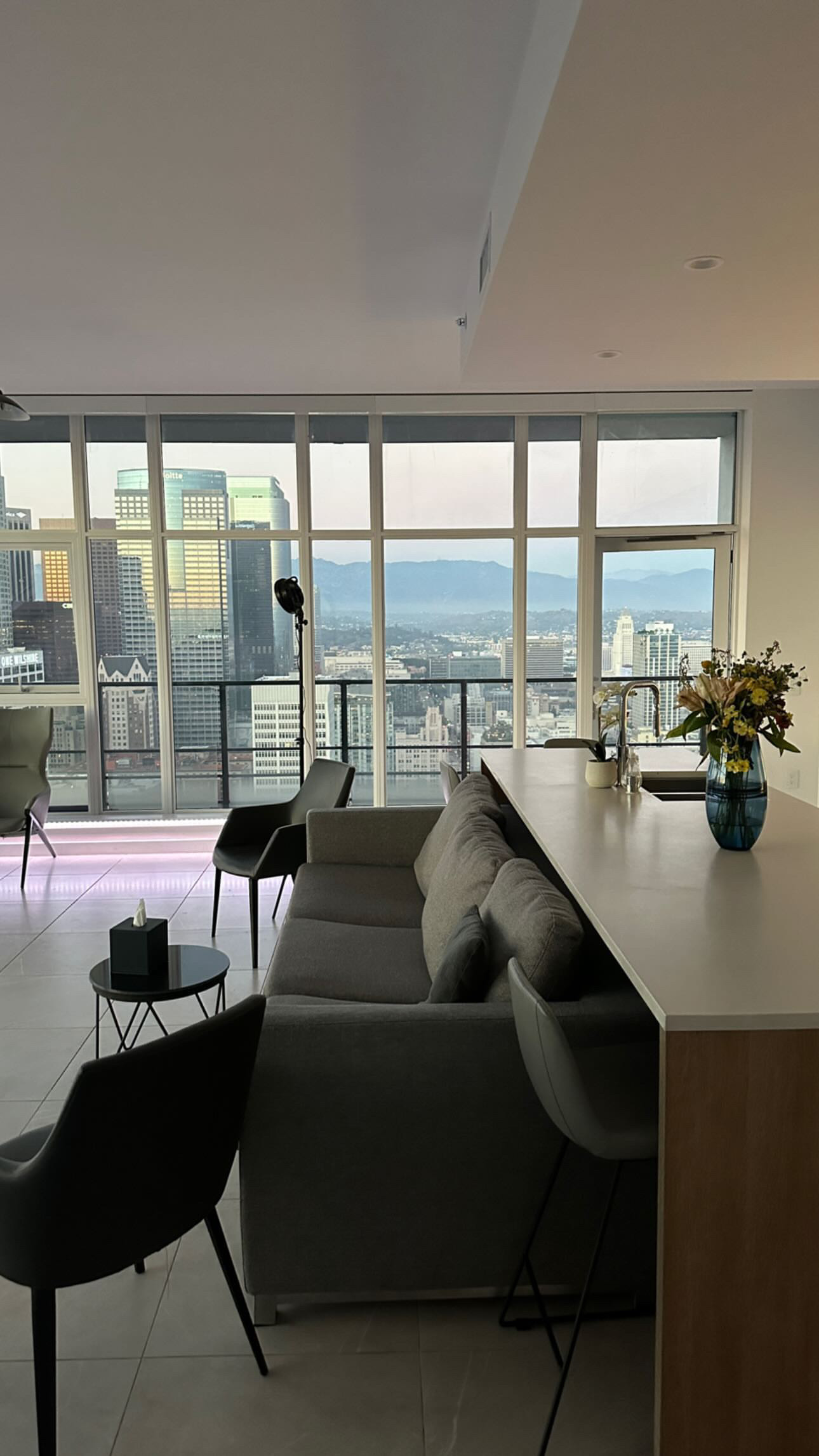 This space has one of the best views of downtown Los Angeles with an elegant luxury feel and aesthetic. You also get an amazing view of the mountains and even the Hollywood sign . There are 2 balconies and one balcony has clear view of the crypto arena . You will have access to the living room , kitchen and bathroom with shower/ laundry room and 2 balconies and one master if needed.