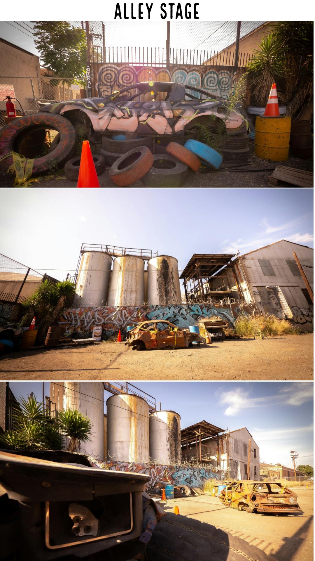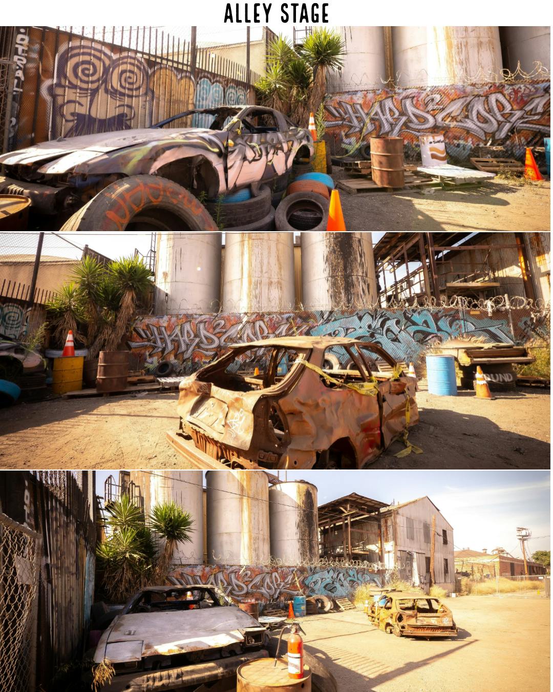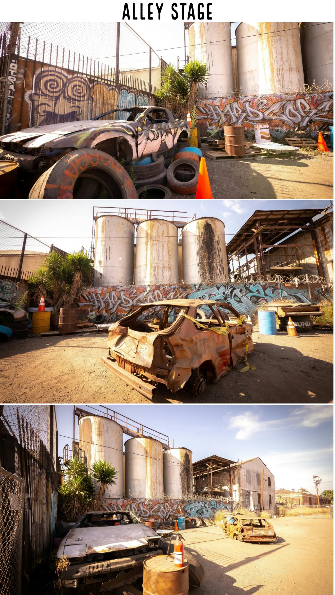 Introducing the Alley Stage, the perfect location for any project!. The Alley stage is a private gated alley located within the studios lot. This stage is available around-the-clock. Its custom graffiti, Semi' used tires and picture car give the alley a unique look unmatched by other locations. The alley stage makes for the perfect backdrop for Photoshoots, films, commercials and any other type of project. Come see why people love to work here!