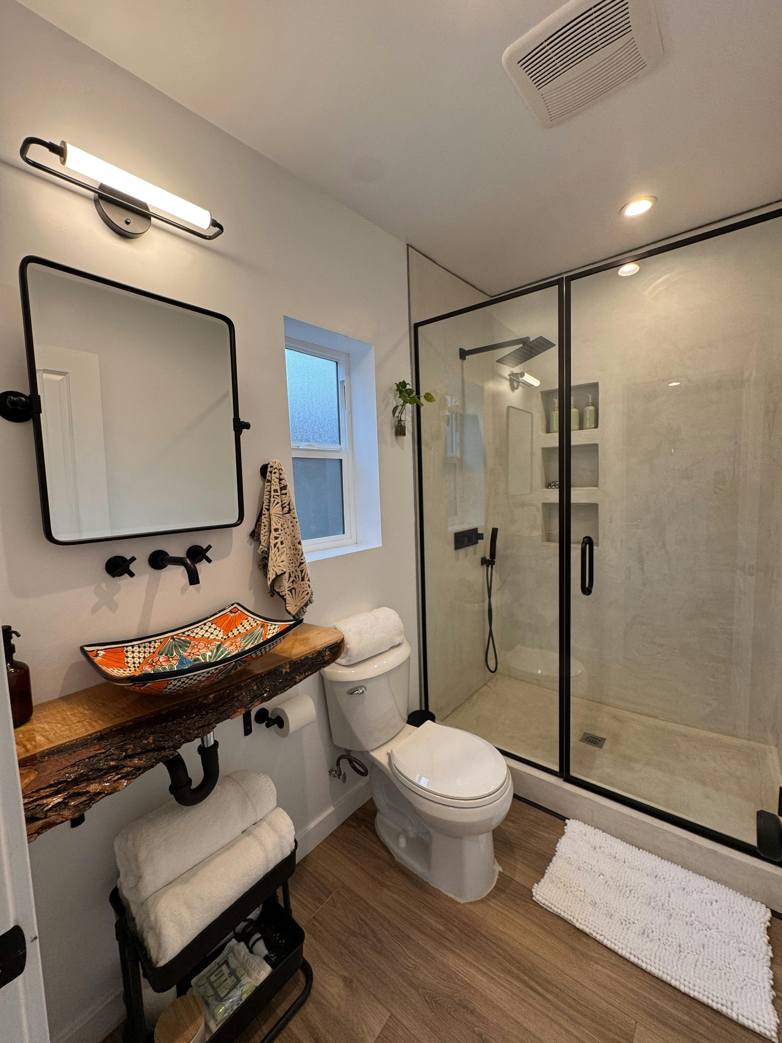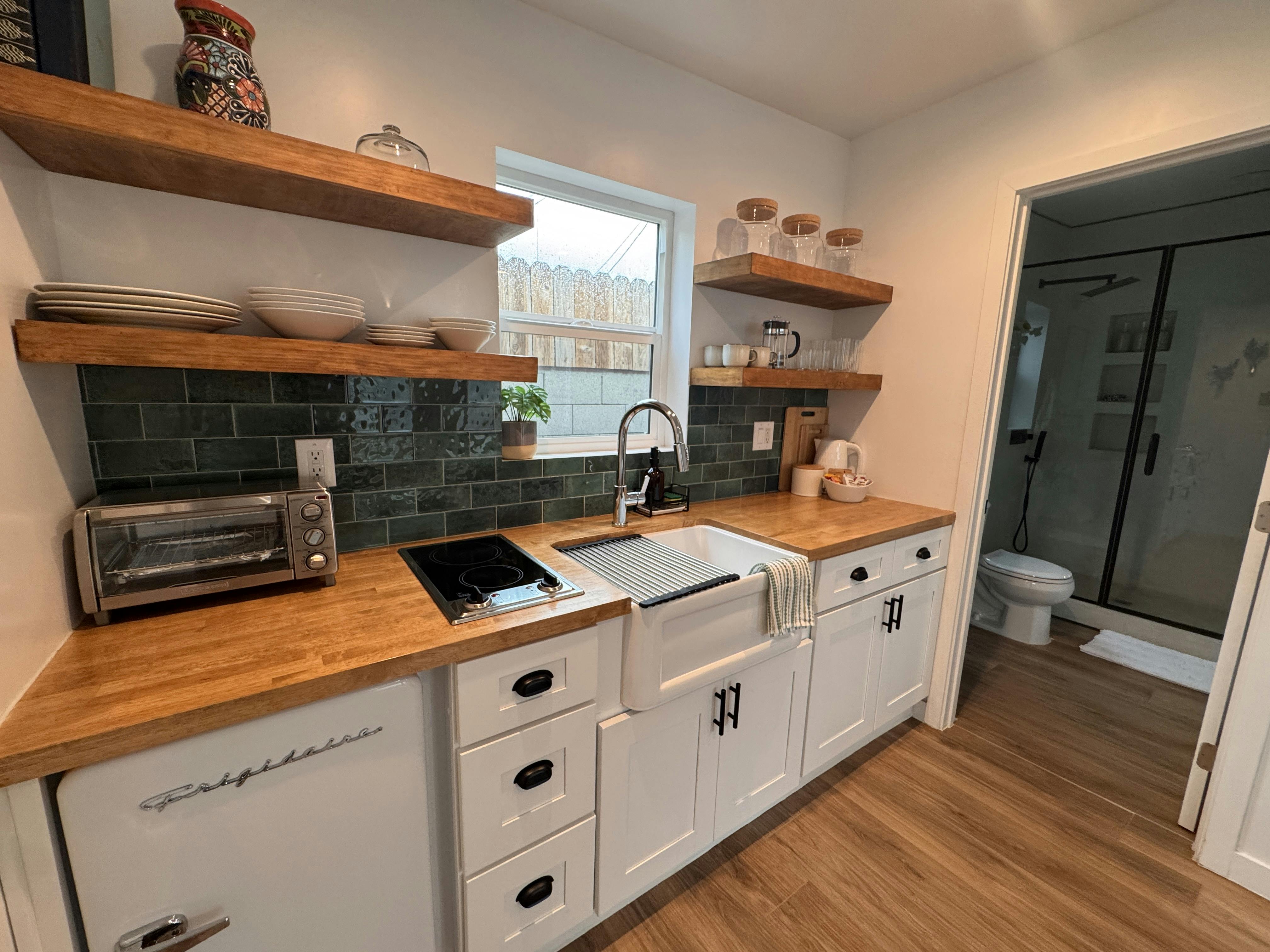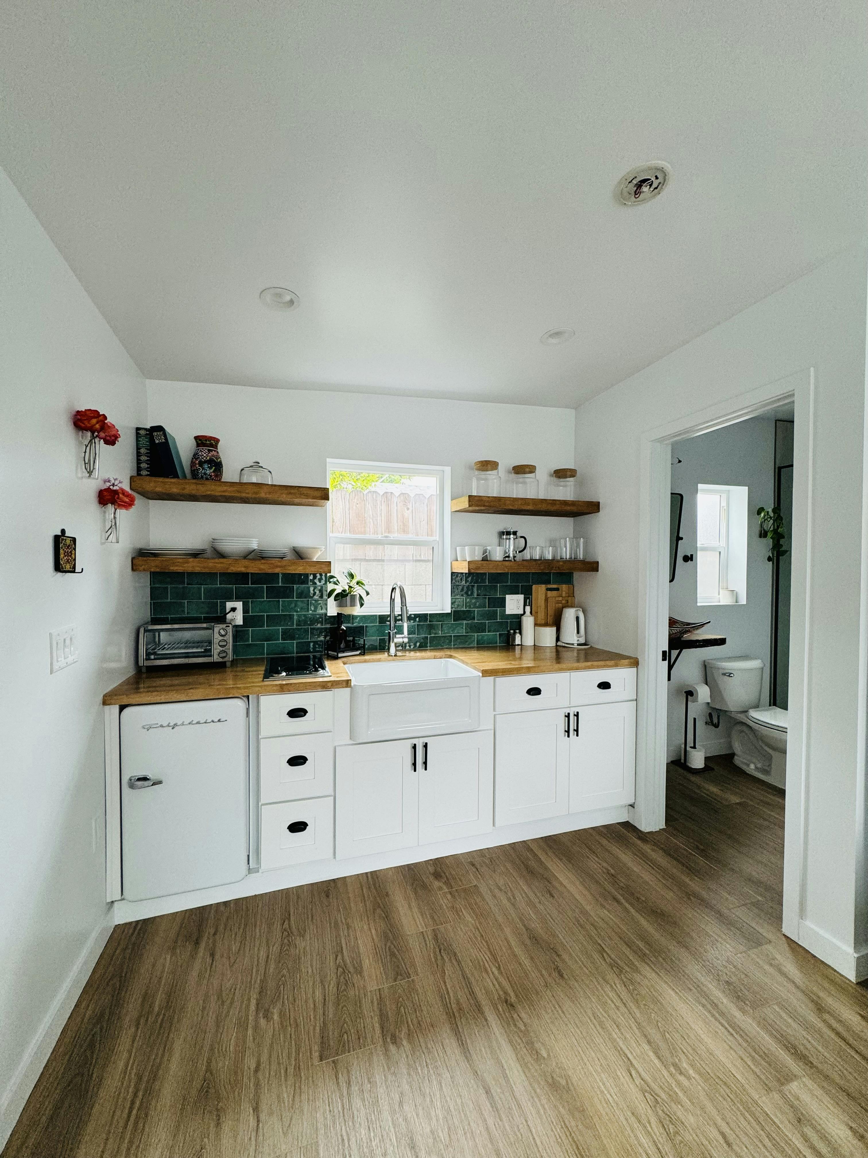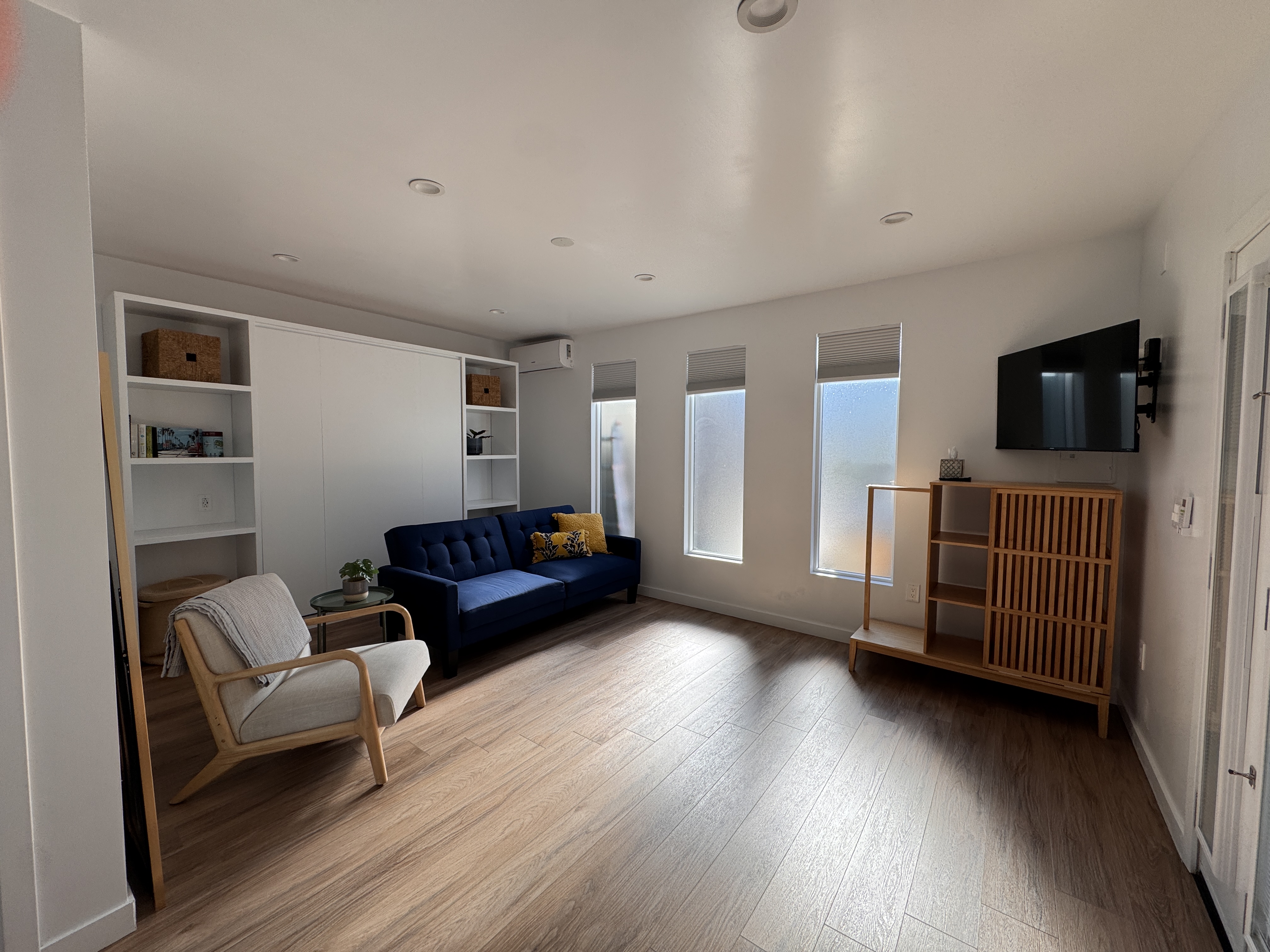 Modern, detached ADU designed with clean lines and a neutral palette, making it versatile backdrop for film and photo productions. Features include a private entrance, contemporary finishes, and lush backyard with landscaping. Production use only, no overnight stays permitted.