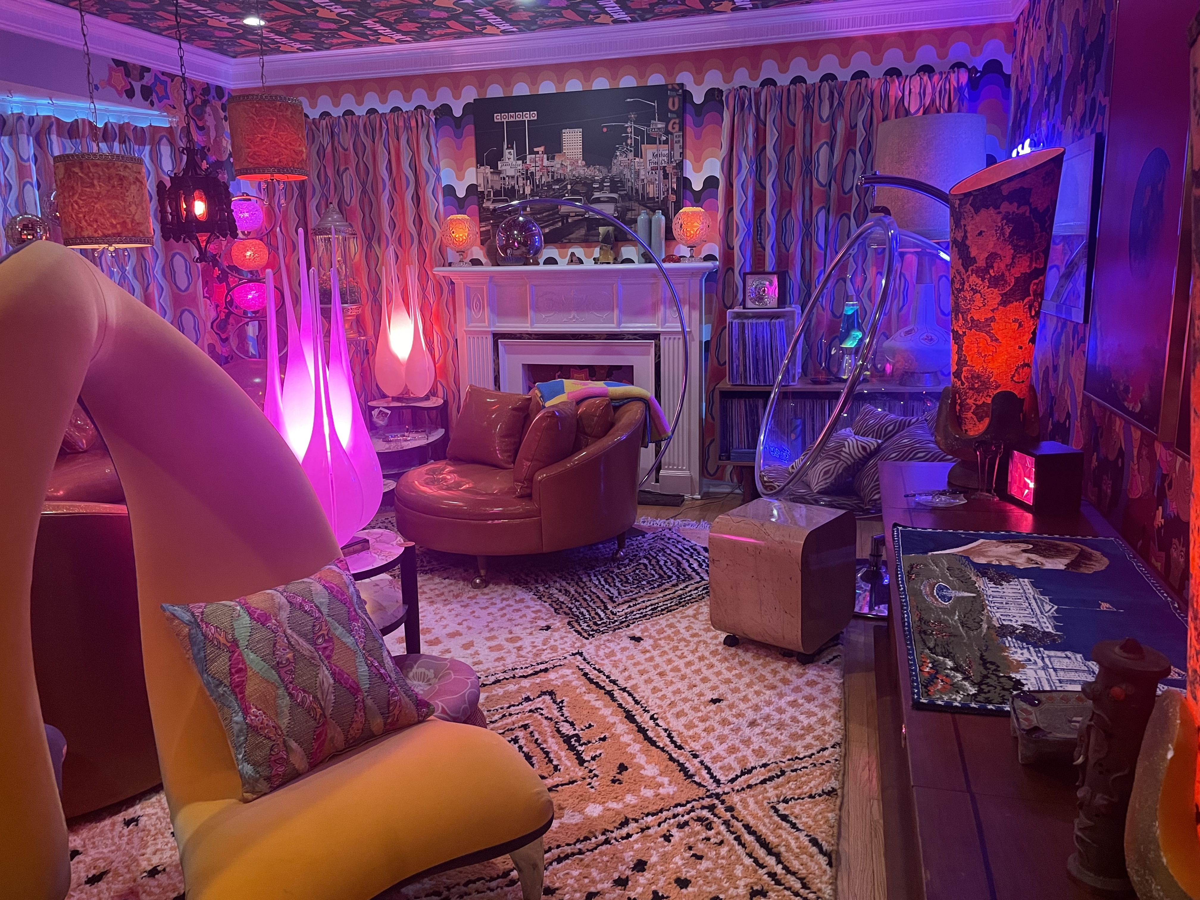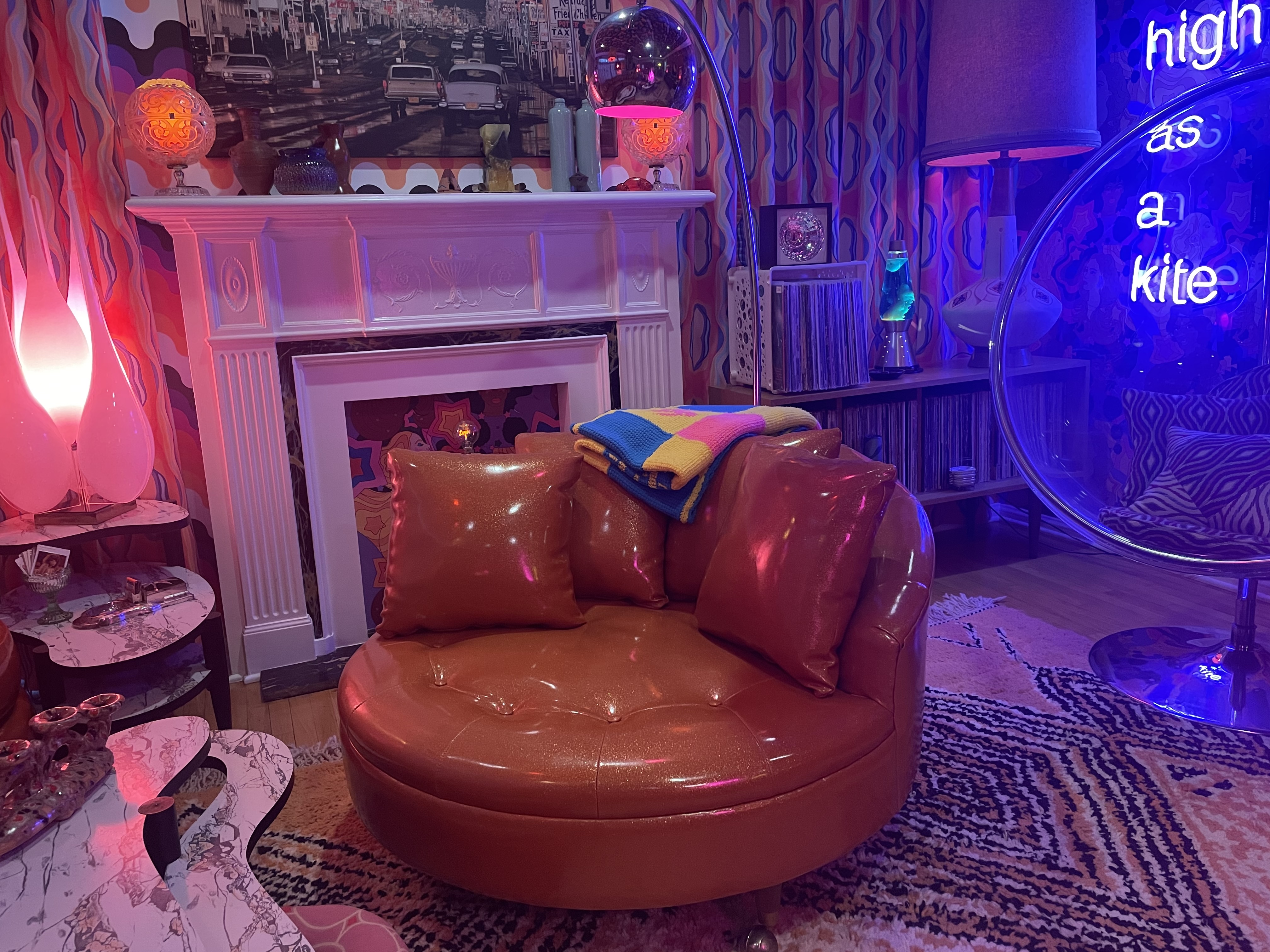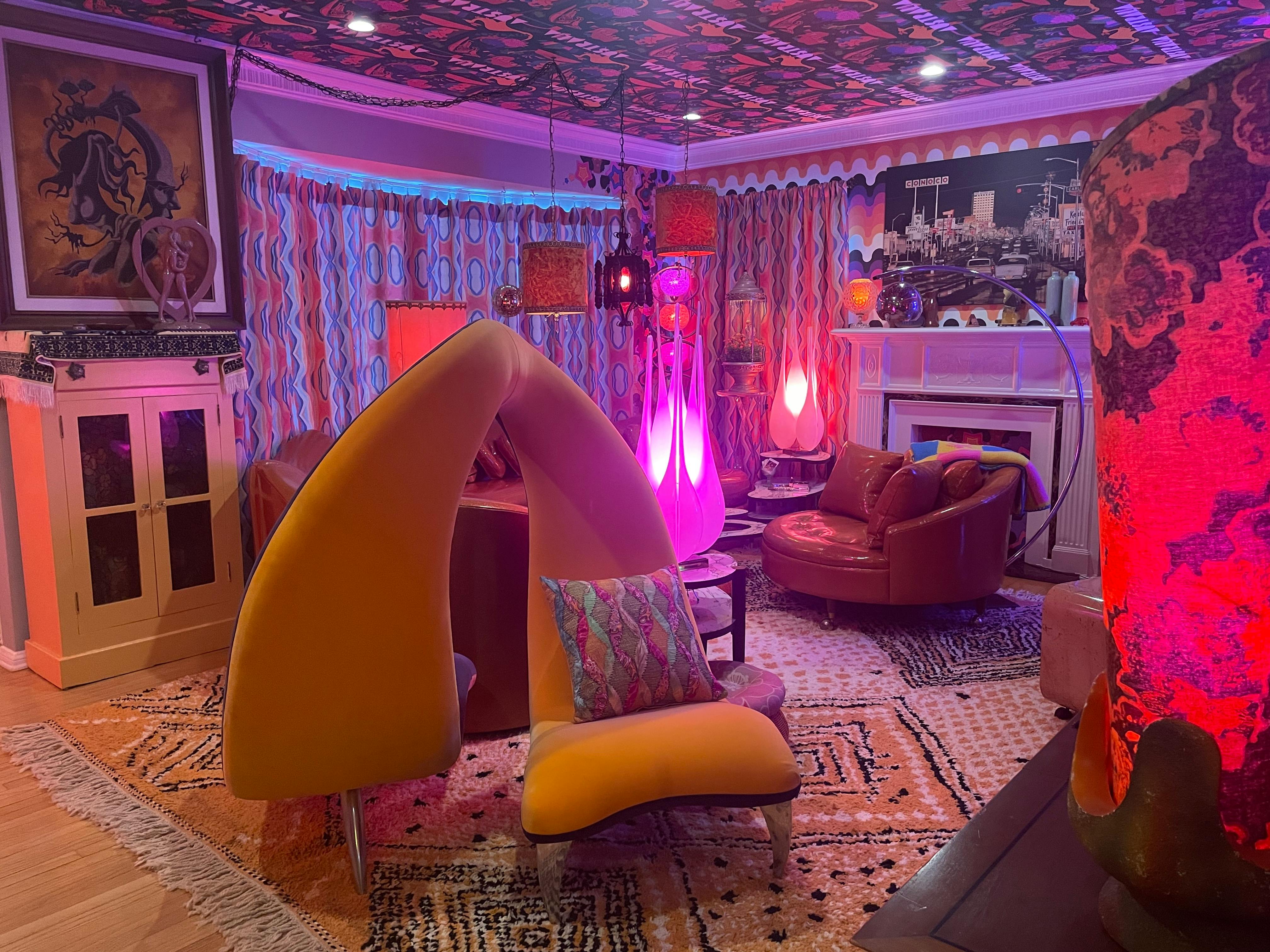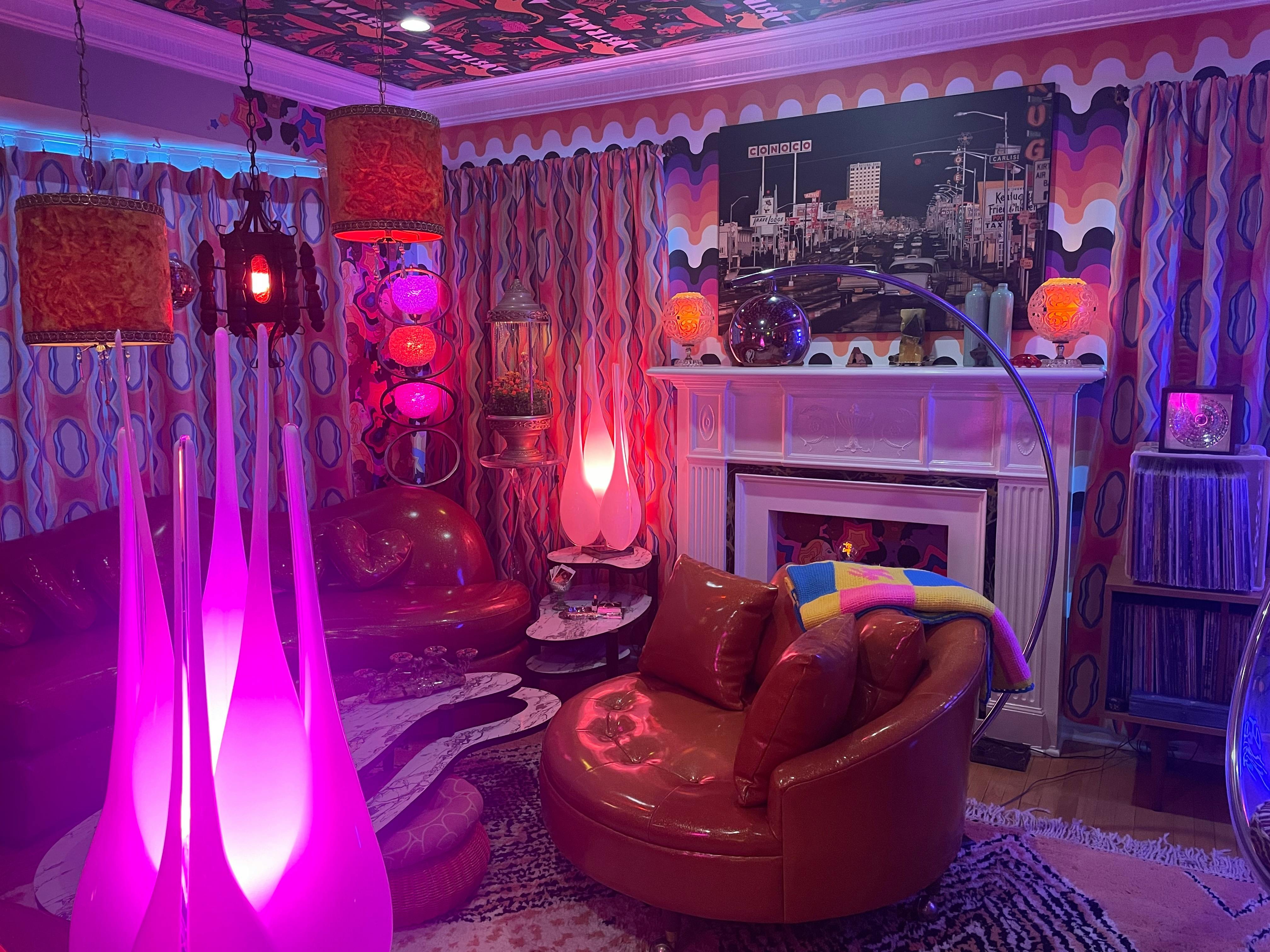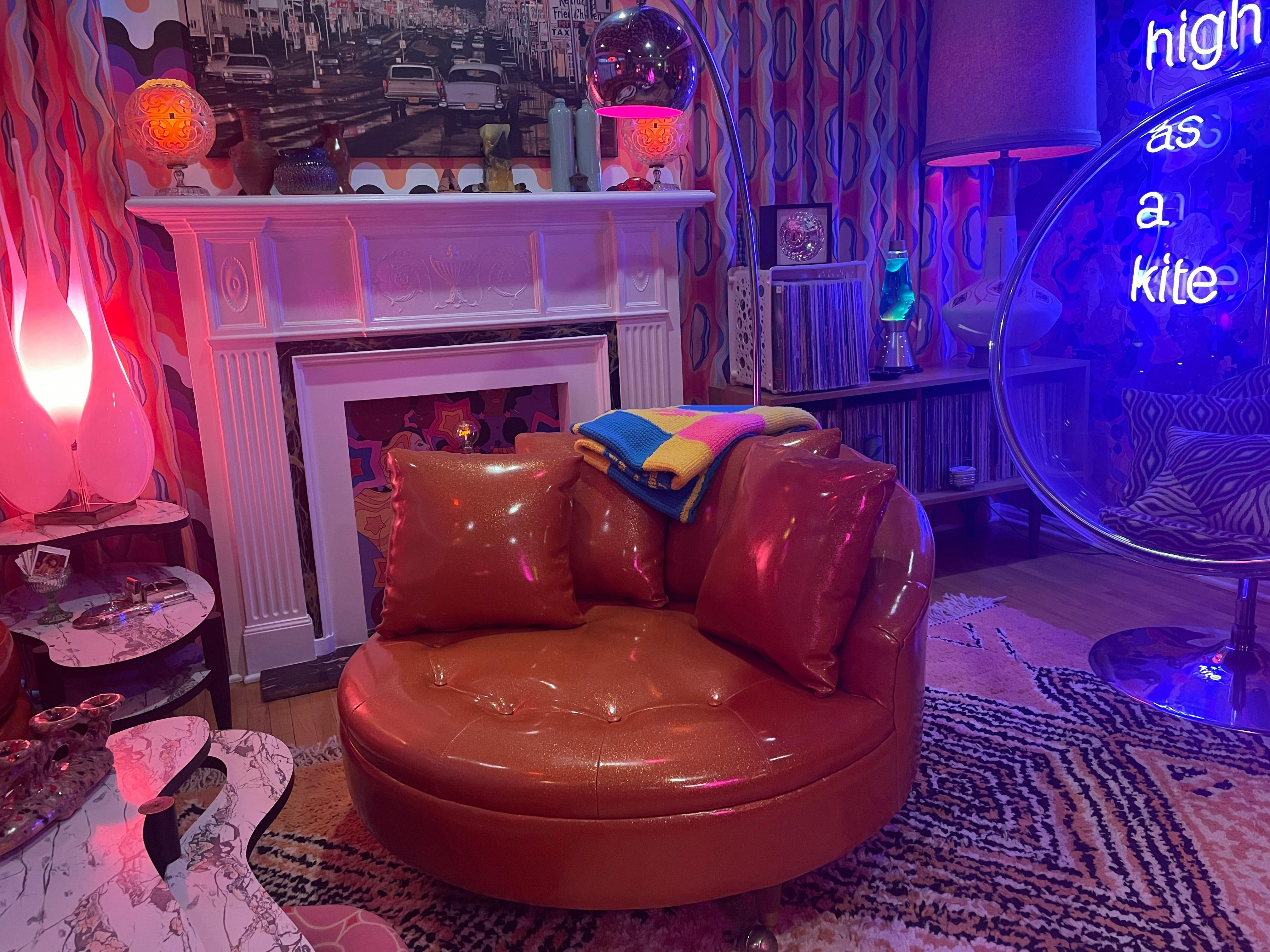 Take a trip to a far-out scene, a total mindblower where the vibes are cool and the karma's clean. A mellow den & way outta sight living space filled with 60s, 70s, icons of the Space Age, MCM, Hollywood Regency, Summer of Love vintage treasures. Photo ops appear at every angle, color-filled with oversized couch sets, lucite, fantasy lighting, erotic art, shagadelic rugs, stereo-bar stocked with a turntable, 8-track player, faux fireplace, blow-up pillows, disco ceiling, glitter & neon vibes.