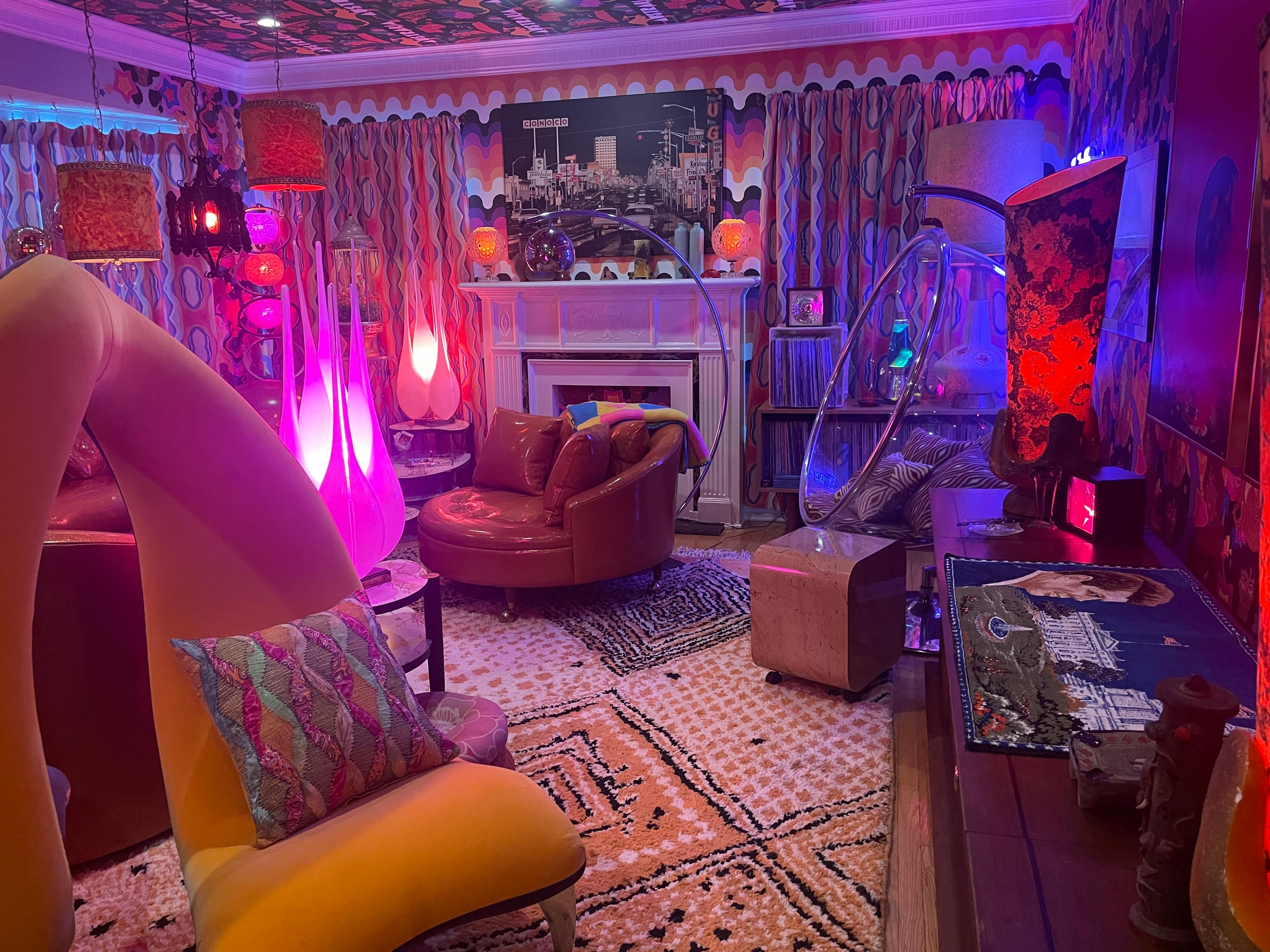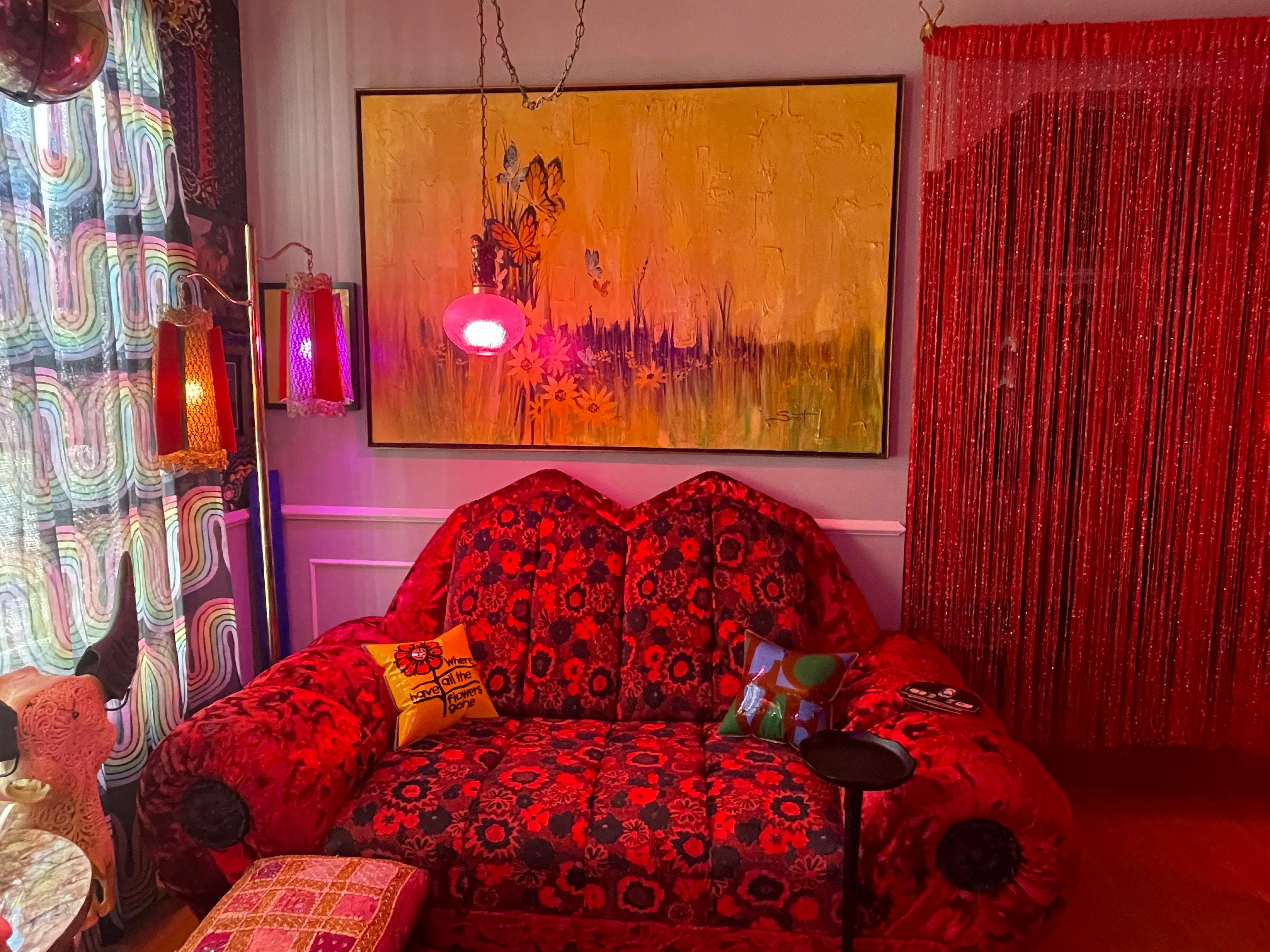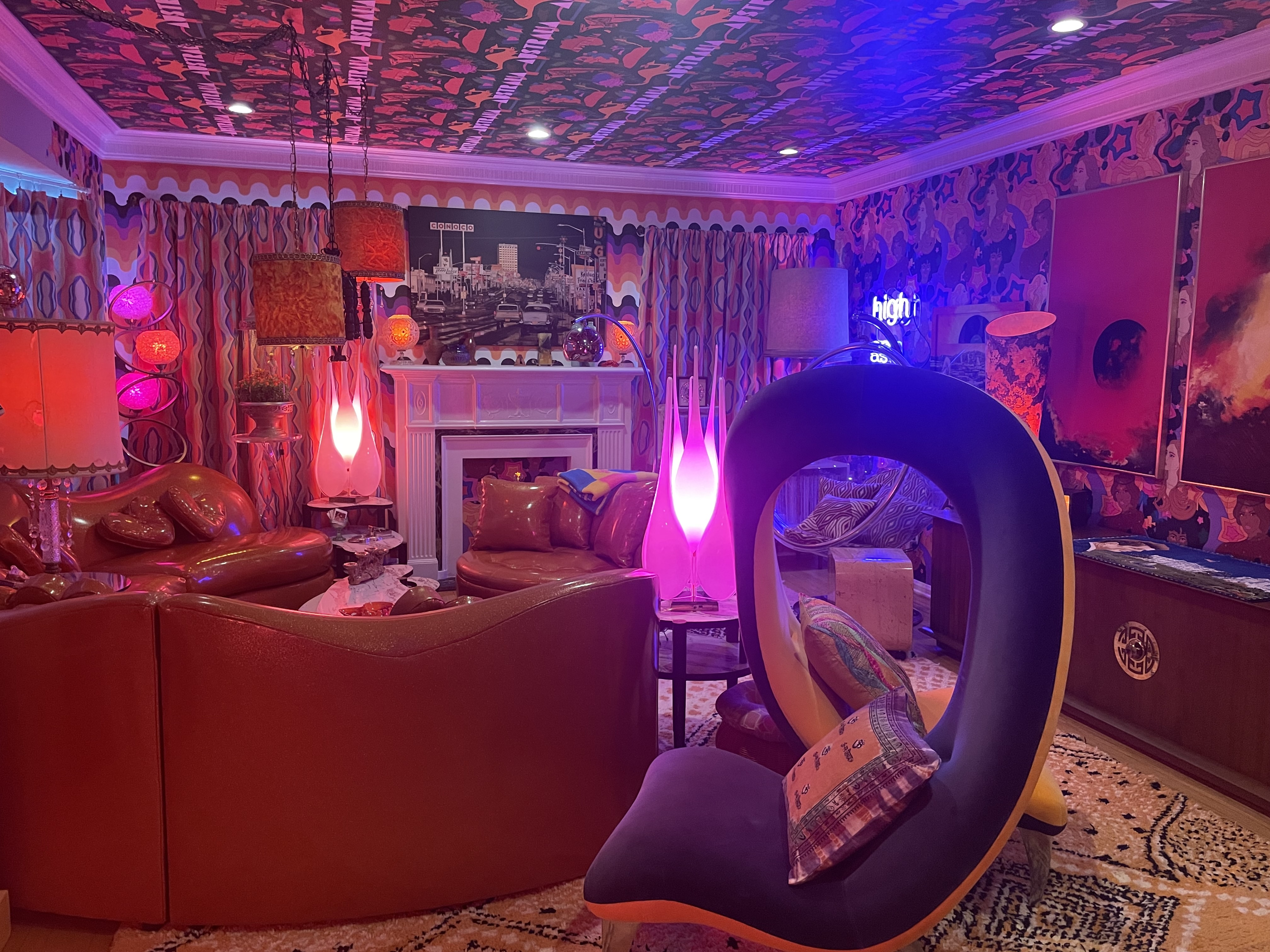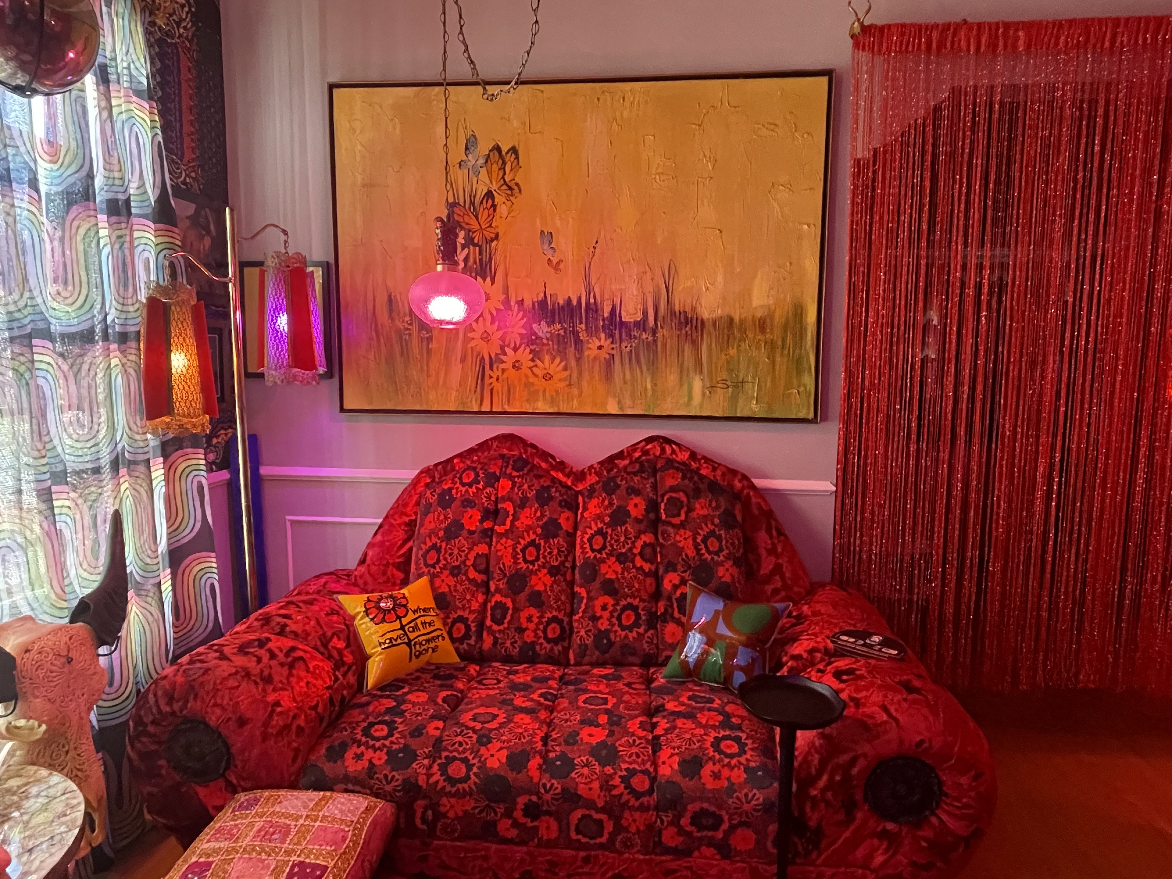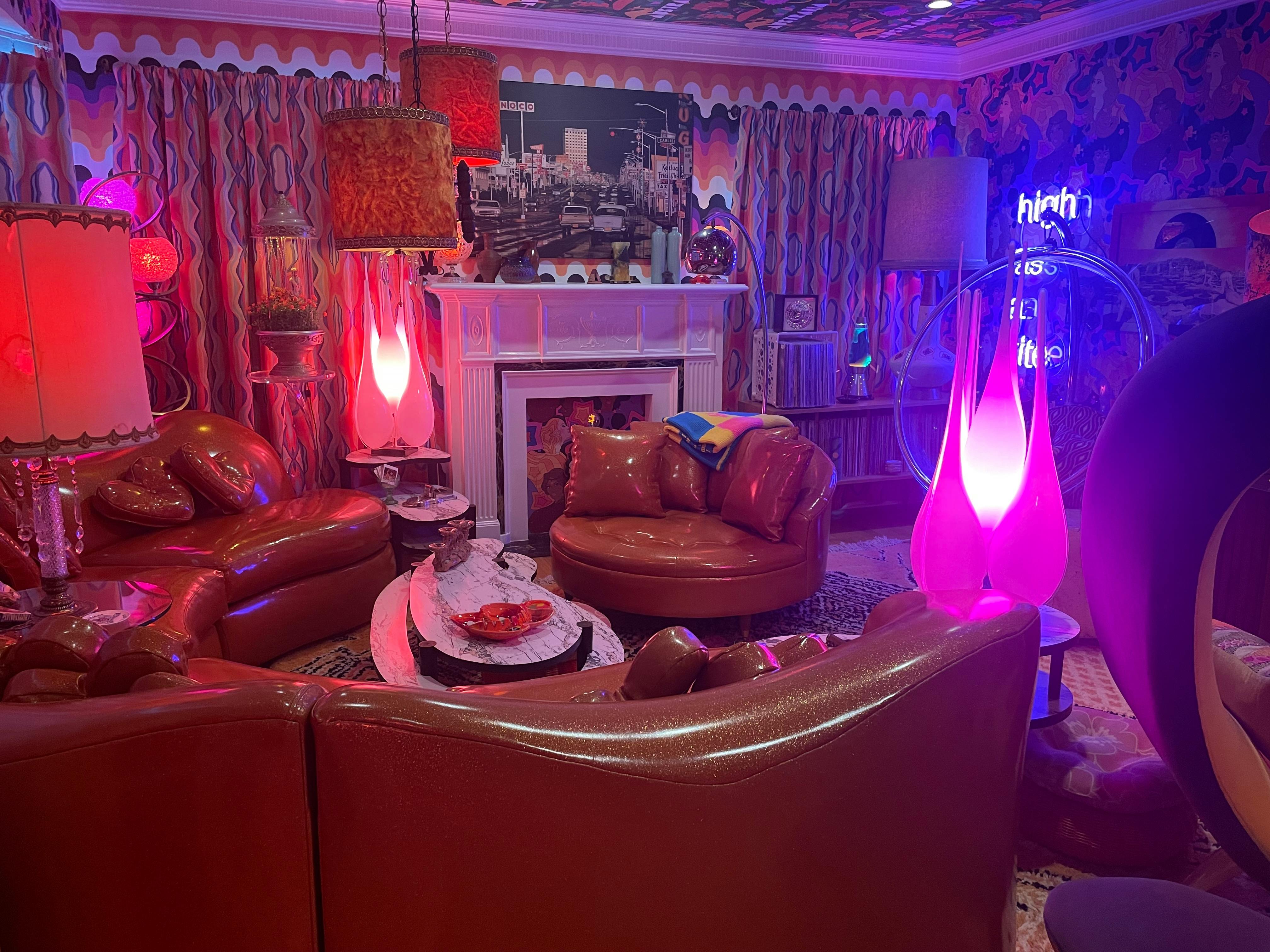 Take a trip to a far-out scene, a total mindblower where the vibes are cool and the karma's clean. A mellow den & way outta sight living space filled with 60s, 70s, icons of the Space Age, MCM, Hollywood Regency, Summer of Love vintage treasures. Photo ops appear at every angle, color-filled with oversized couch sets, lucite, fantasy lighting, erotic art, shagadelic rugs, stereo-bar stocked with a turntable, 8-track player, faux fireplace, blow-up pillows, disco ceiling, glitter & neon vibes.