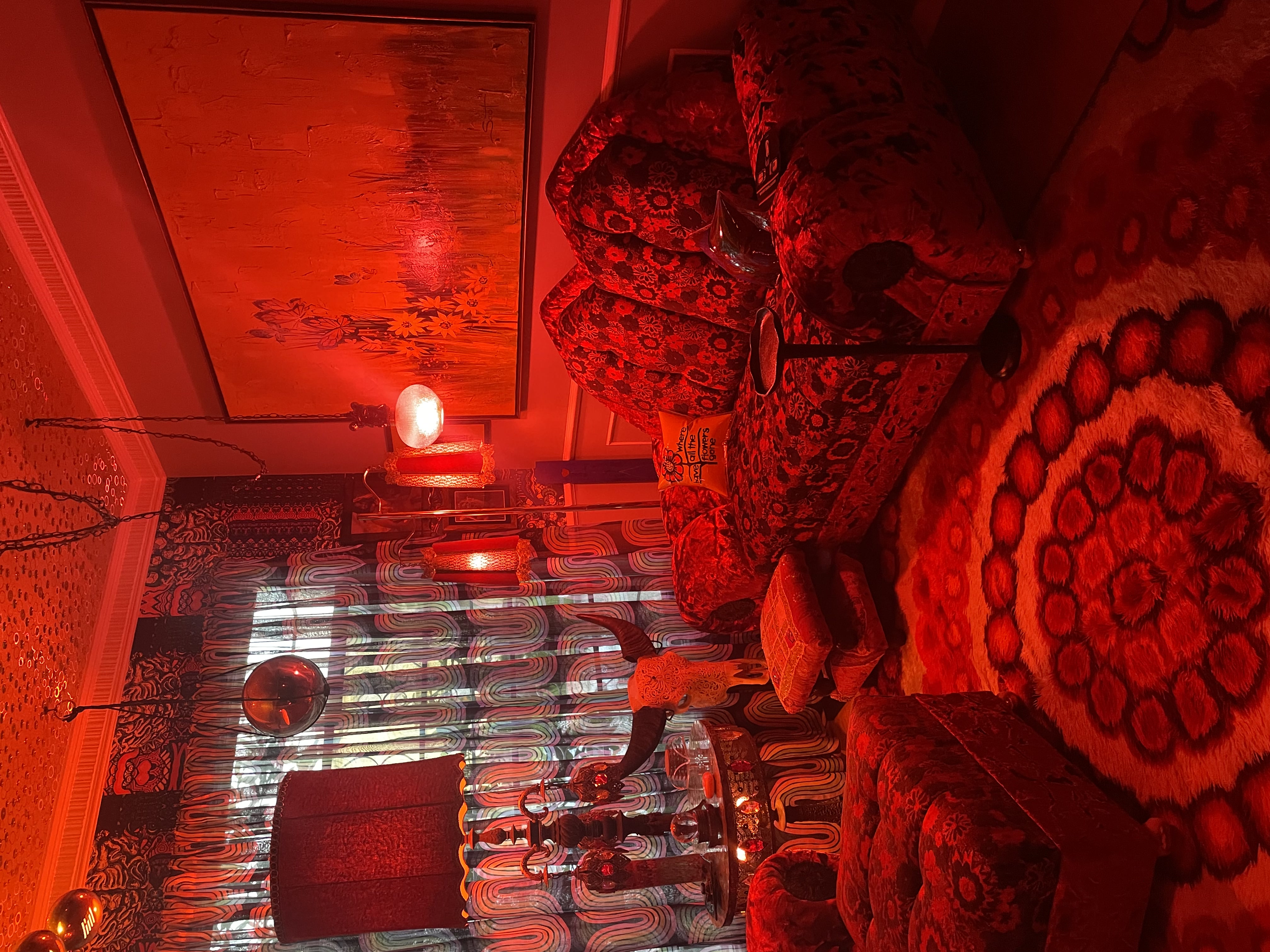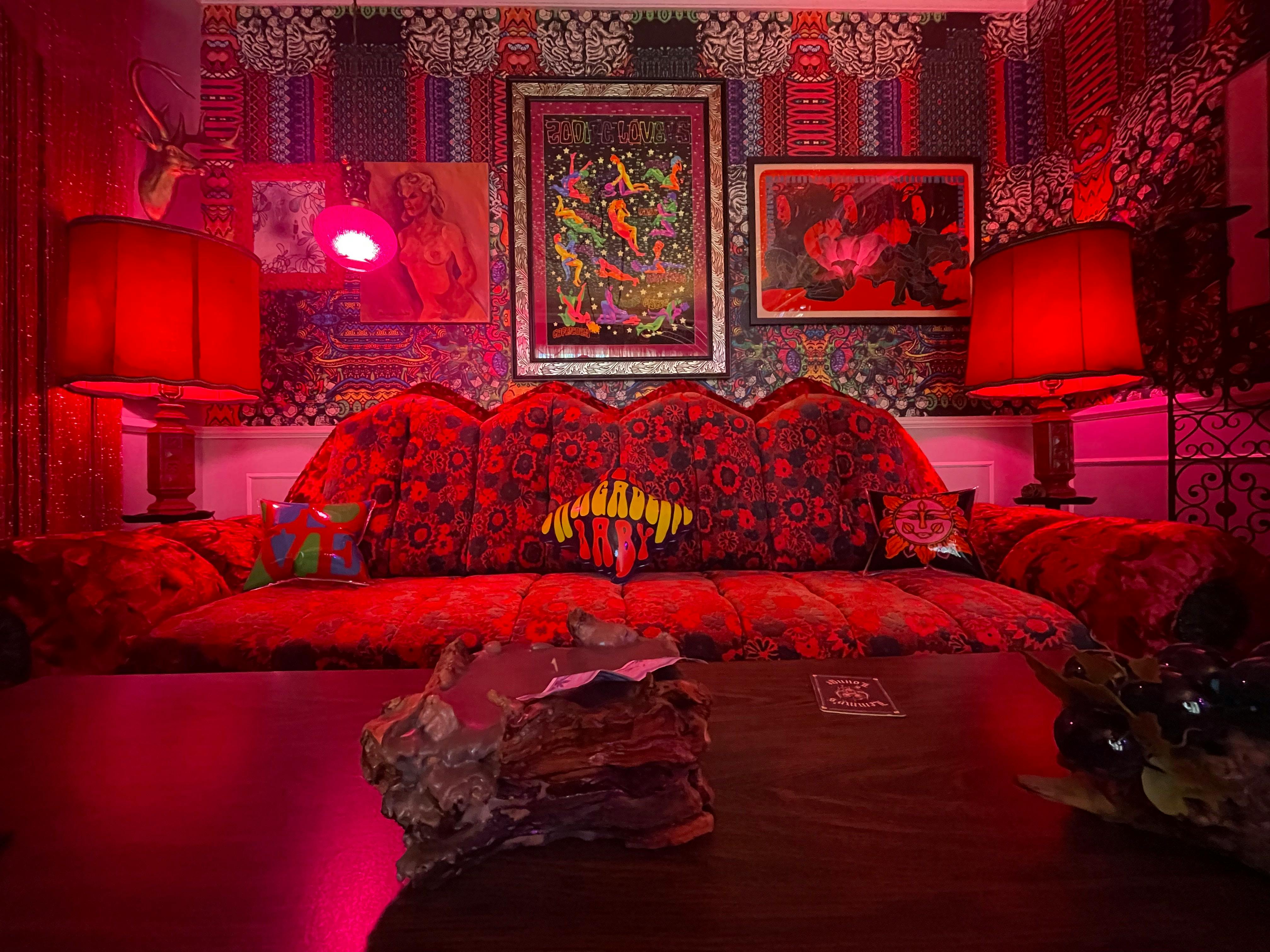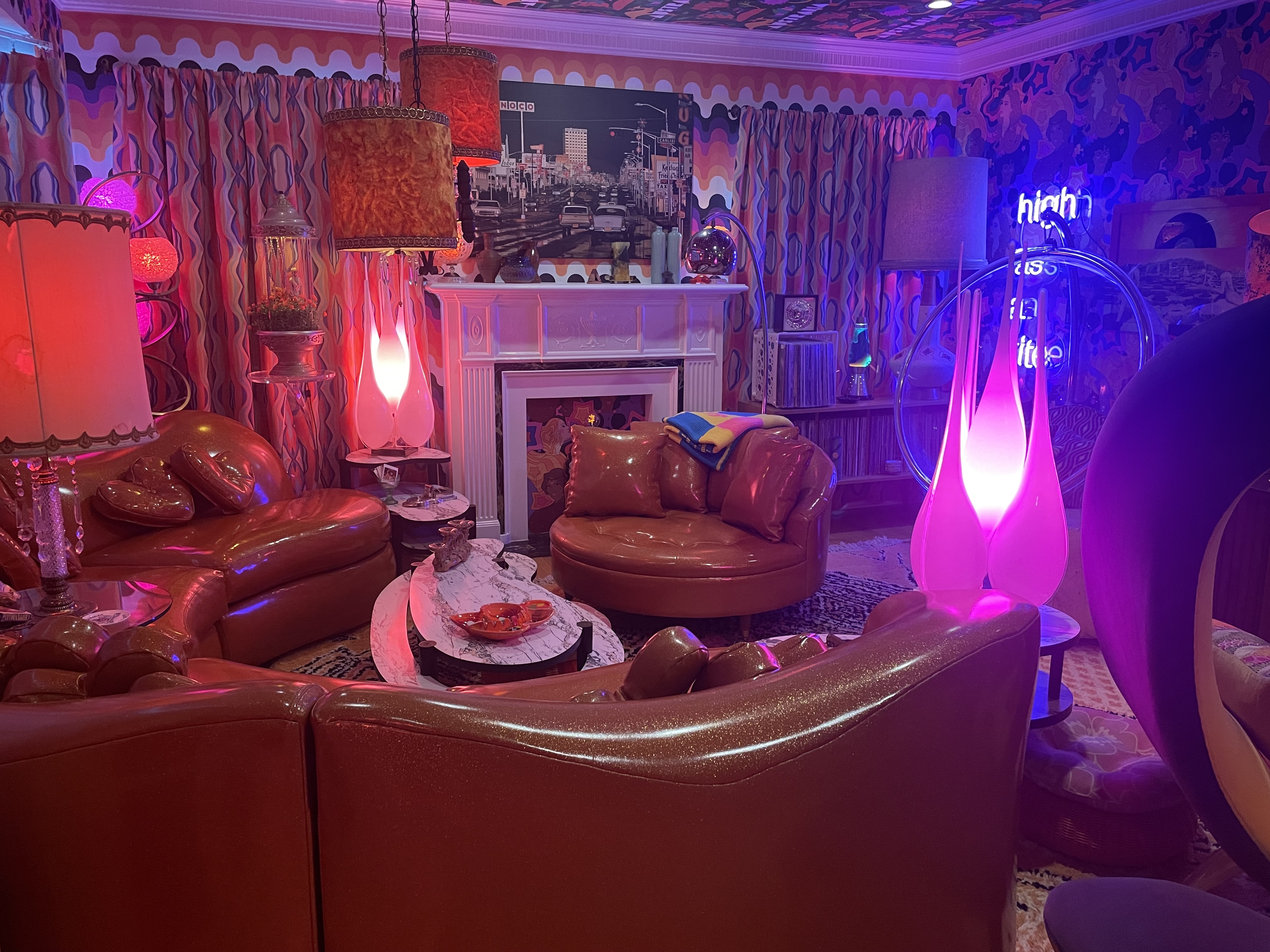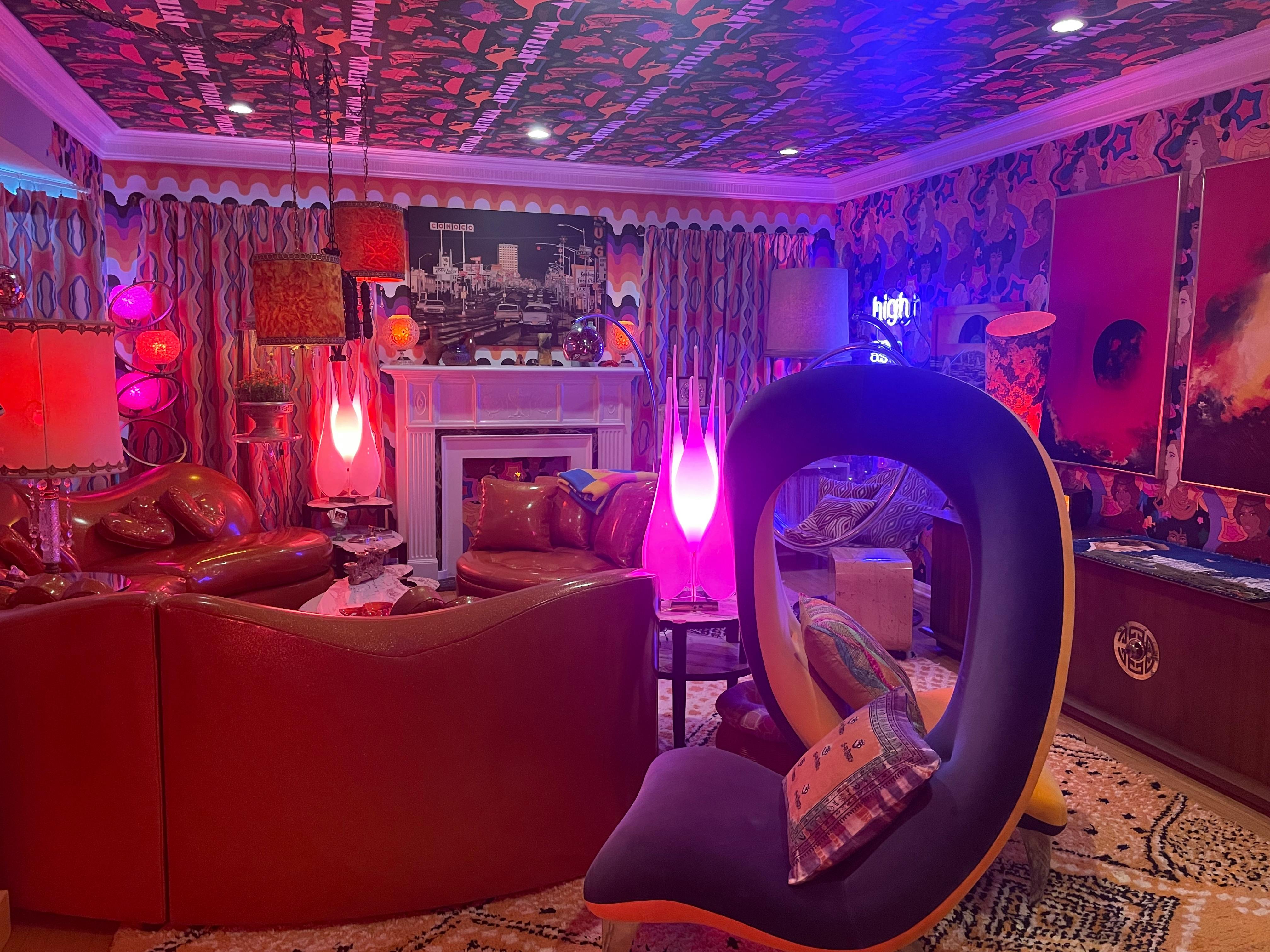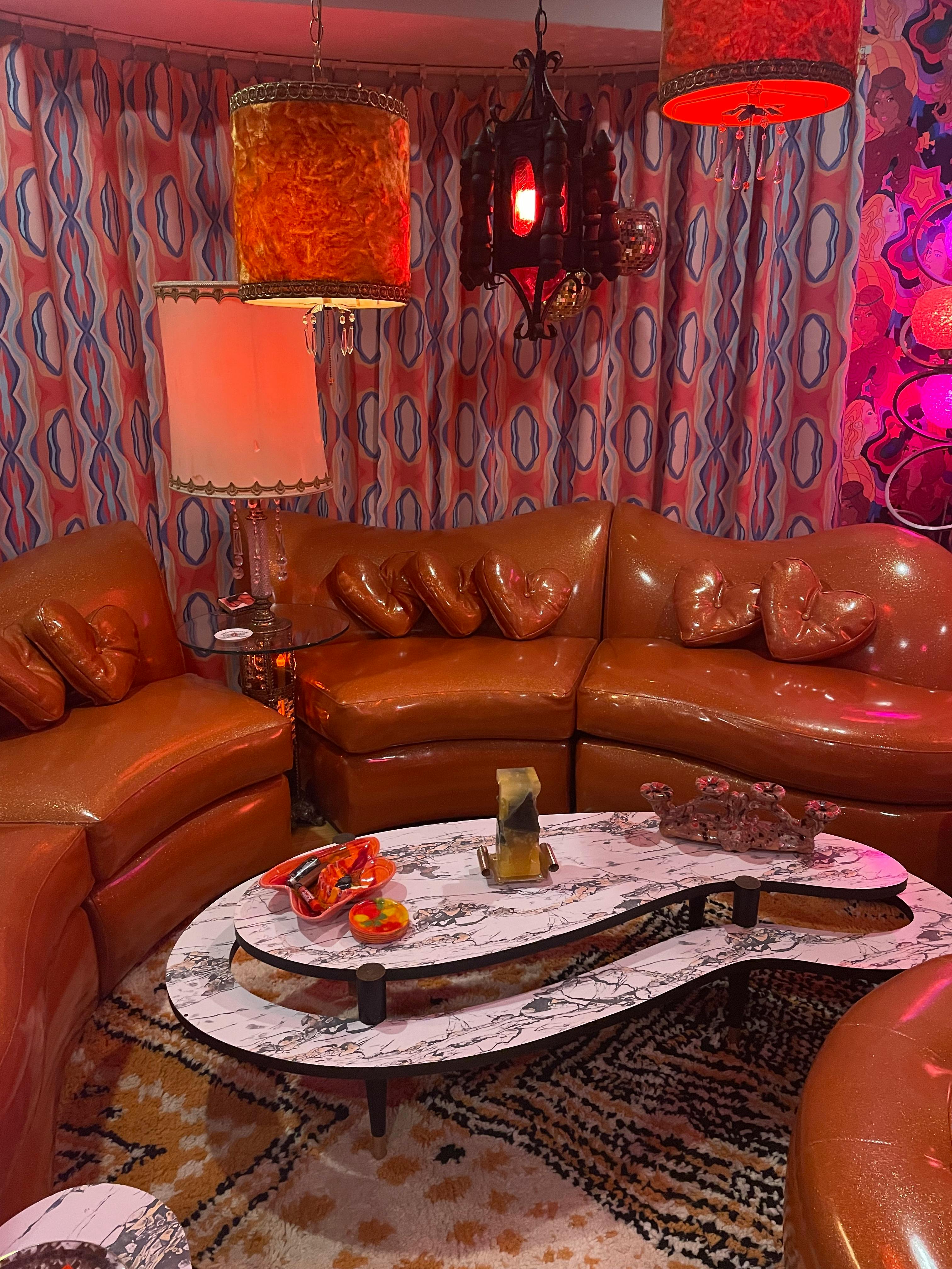 Take a trip to a far-out scene, a total mindblower where the vibes are cool and the karma's clean. A mellow den & way outta sight living space filled with 60s, 70s, icons of the Space Age, MCM, Hollywood Regency, Summer of Love vintage treasures. Photo ops appear at every angle, color-filled with oversized couch sets, lucite, fantasy lighting, erotic art, shagadelic rugs, stereo-bar stocked with a turntable, 8-track player, faux fireplace, blow-up pillows, disco ceiling, glitter & neon vibes.