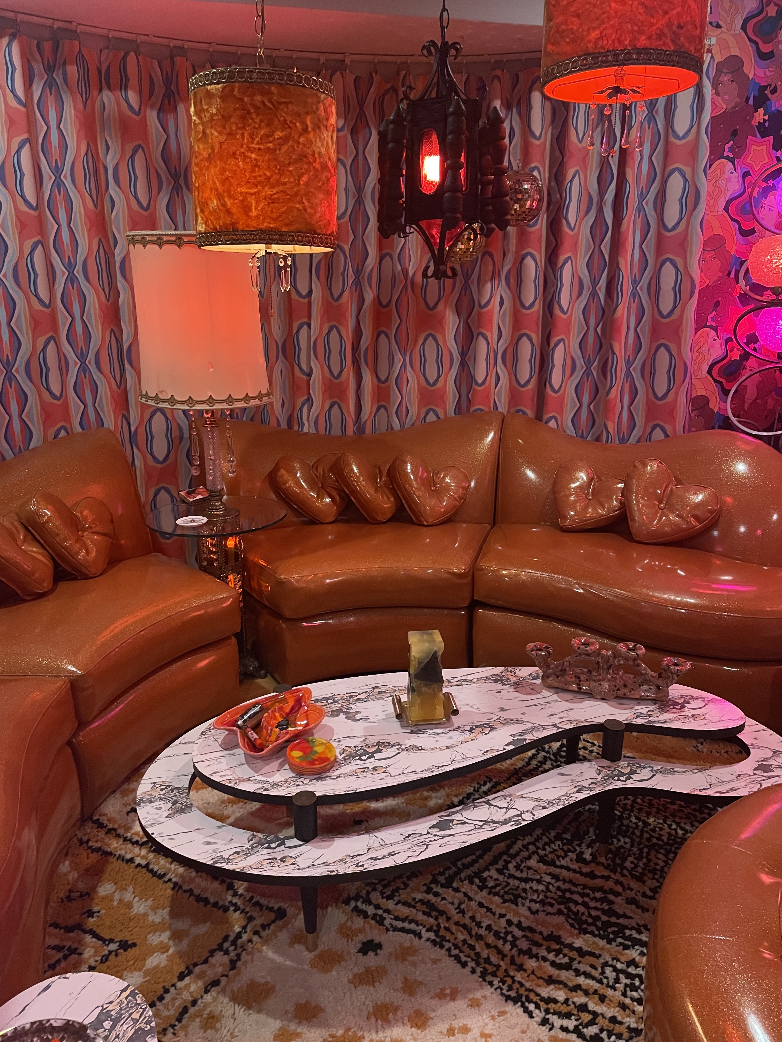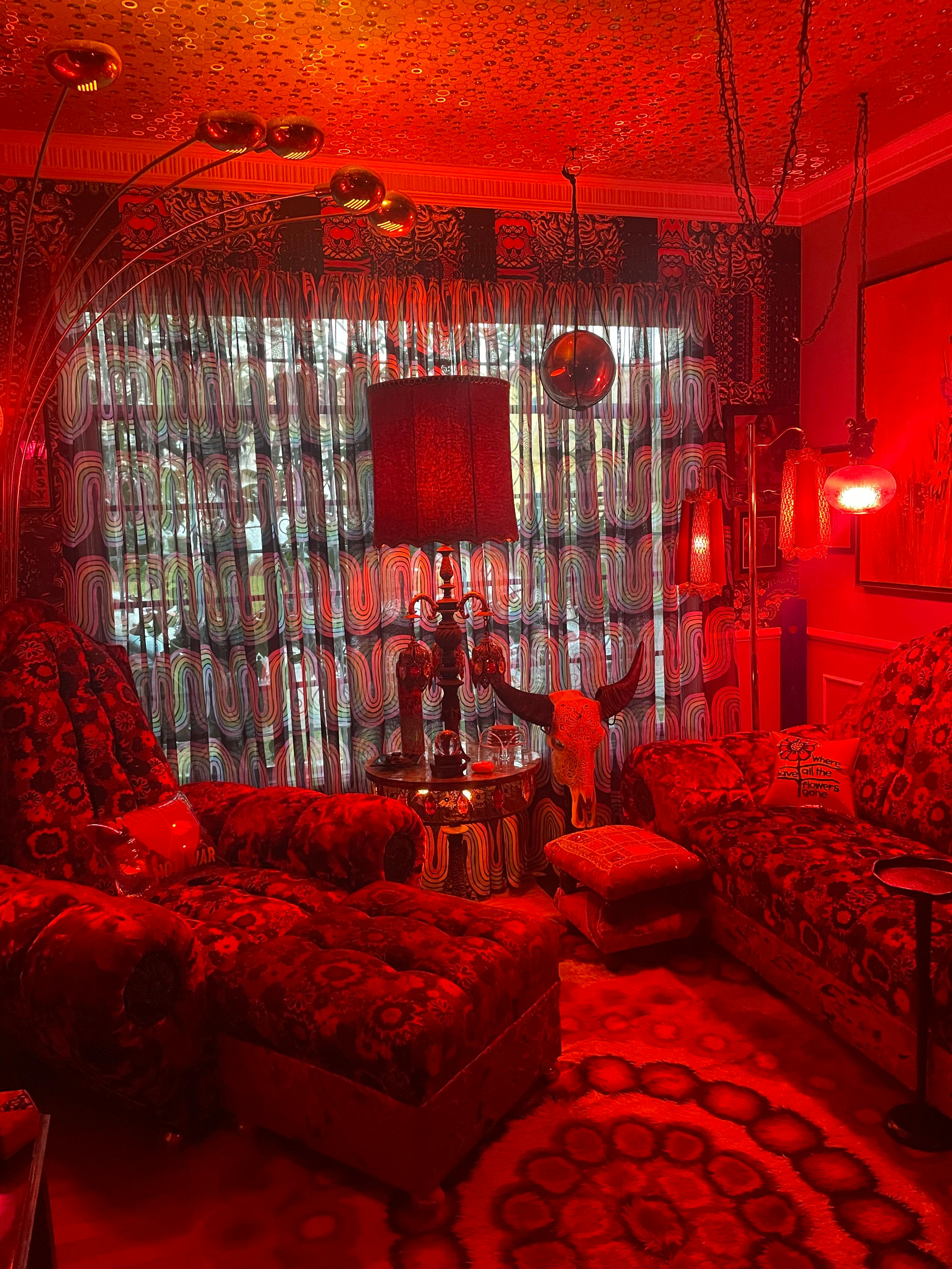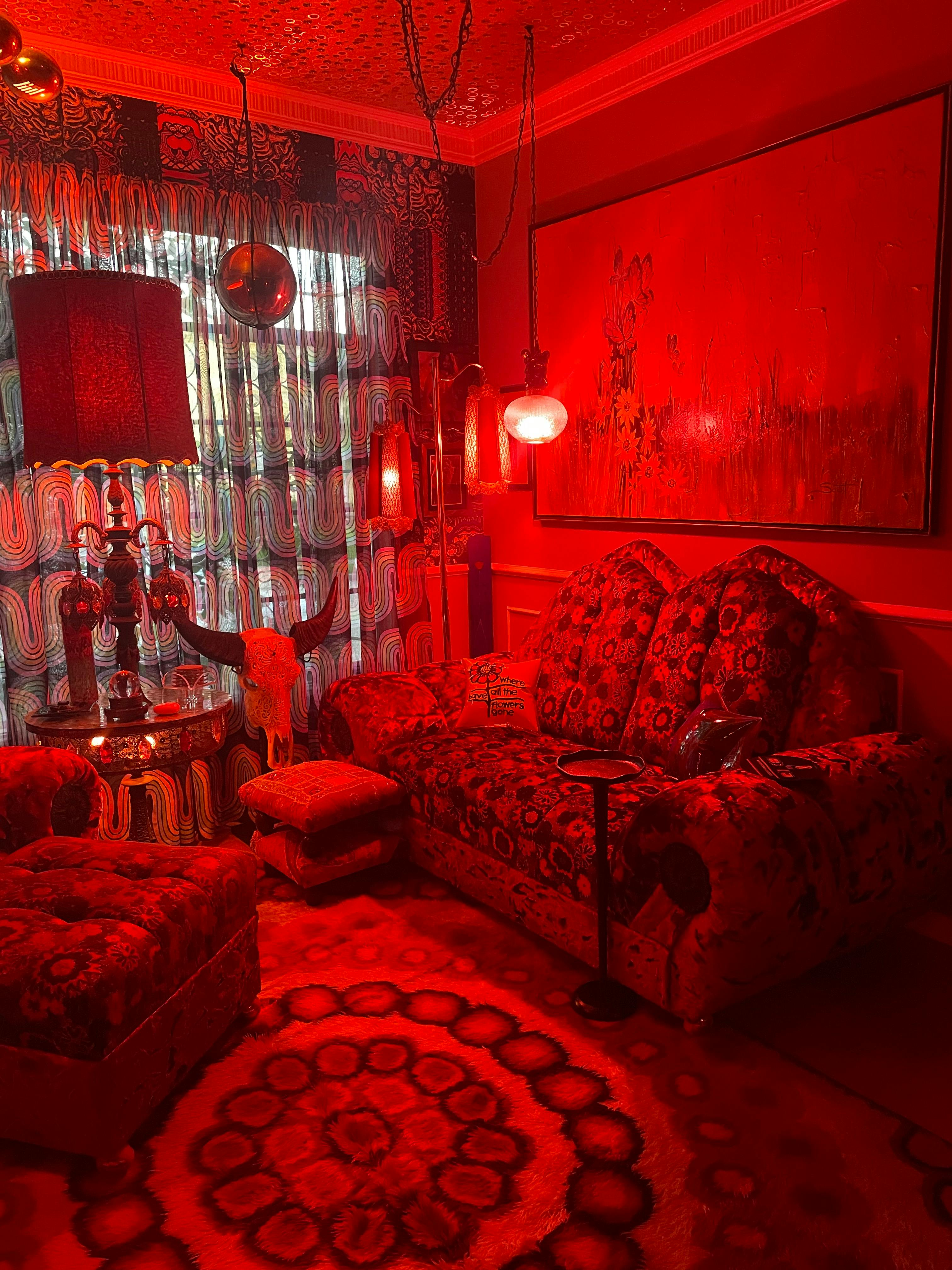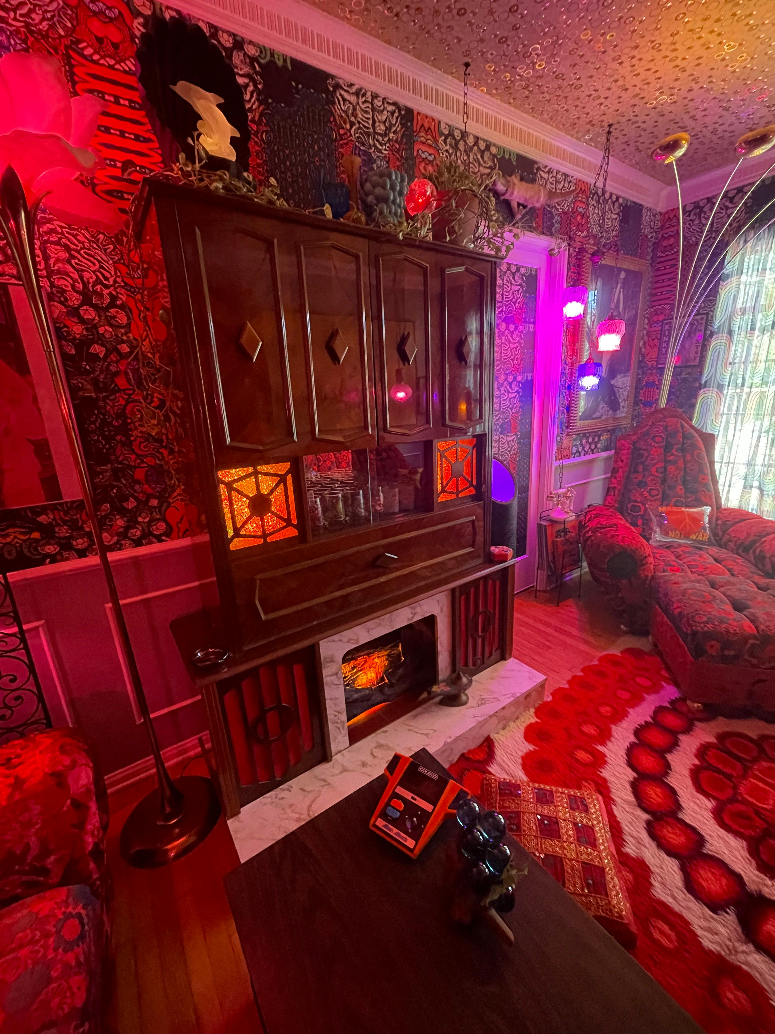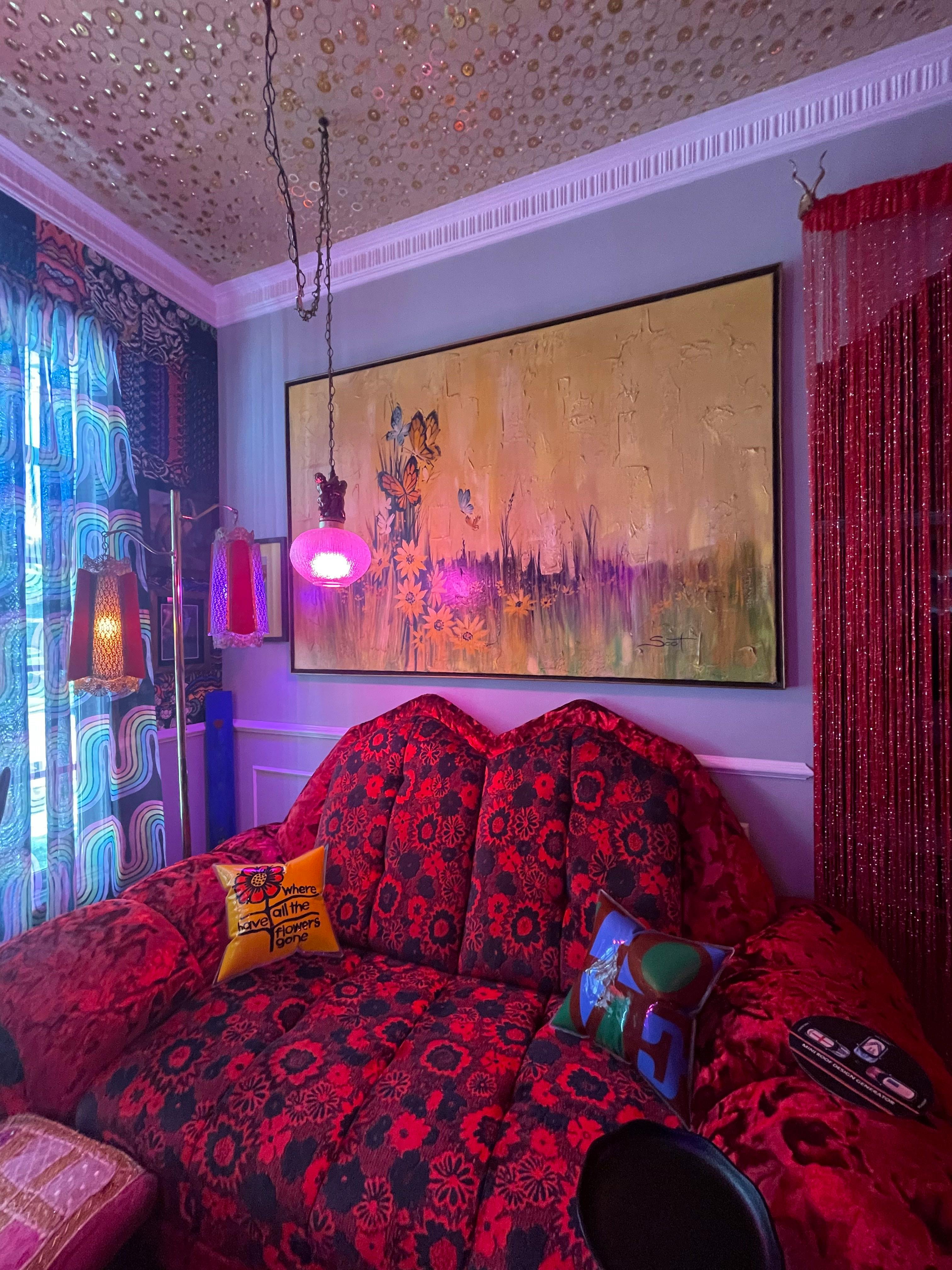 Take a trip to a far-out scene, a total mindblower where the vibes are cool and the karma's clean. A mellow den & way outta sight living space filled with 60s, 70s, icons of the Space Age, MCM, Hollywood Regency, Summer of Love vintage treasures. Photo ops appear at every angle, color-filled with oversized couch sets, lucite, fantasy lighting, erotic art, shagadelic rugs, stereo-bar stocked with a turntable, 8-track player, faux fireplace, blow-up pillows, disco ceiling, glitter & neon vibes.