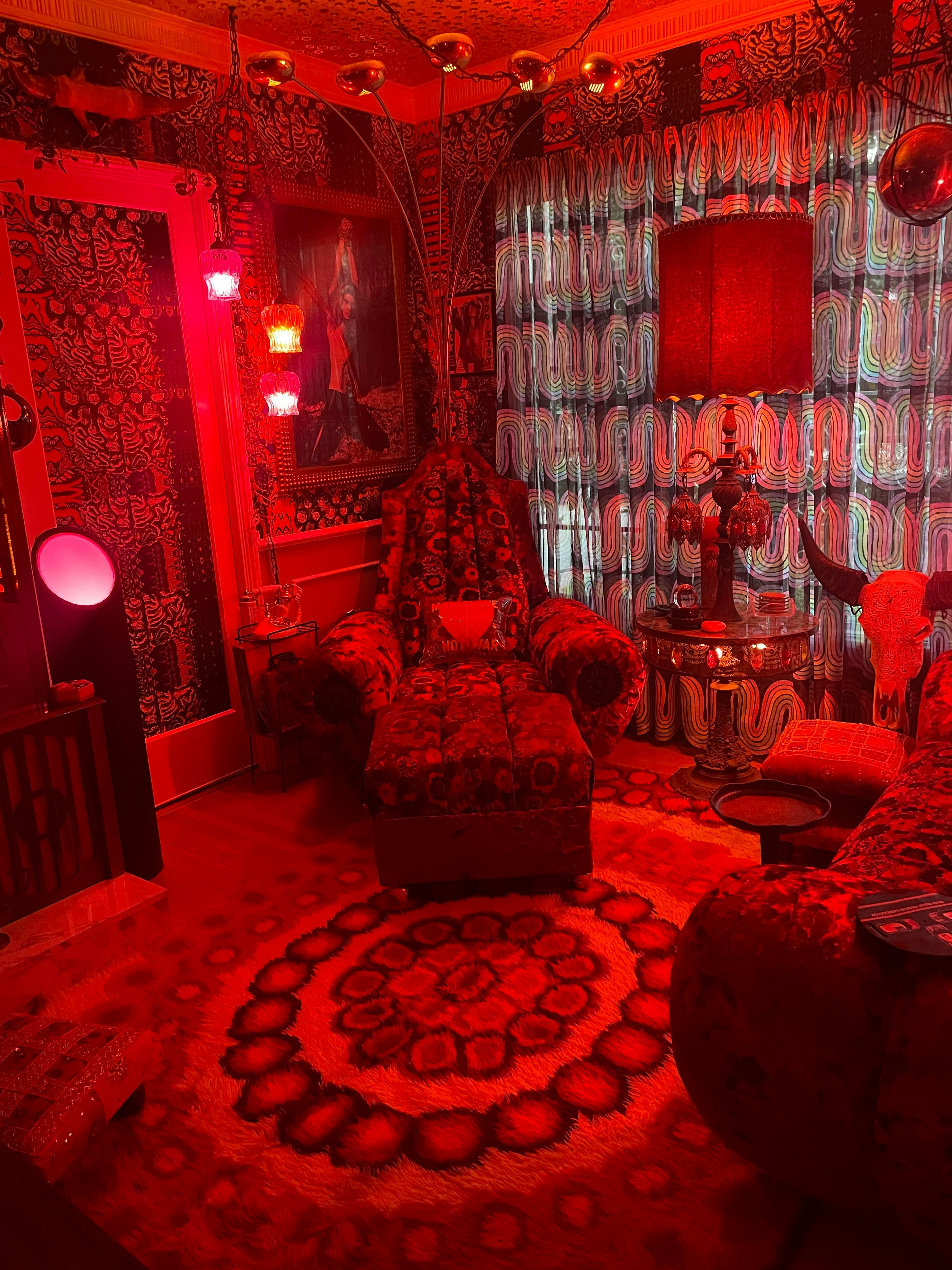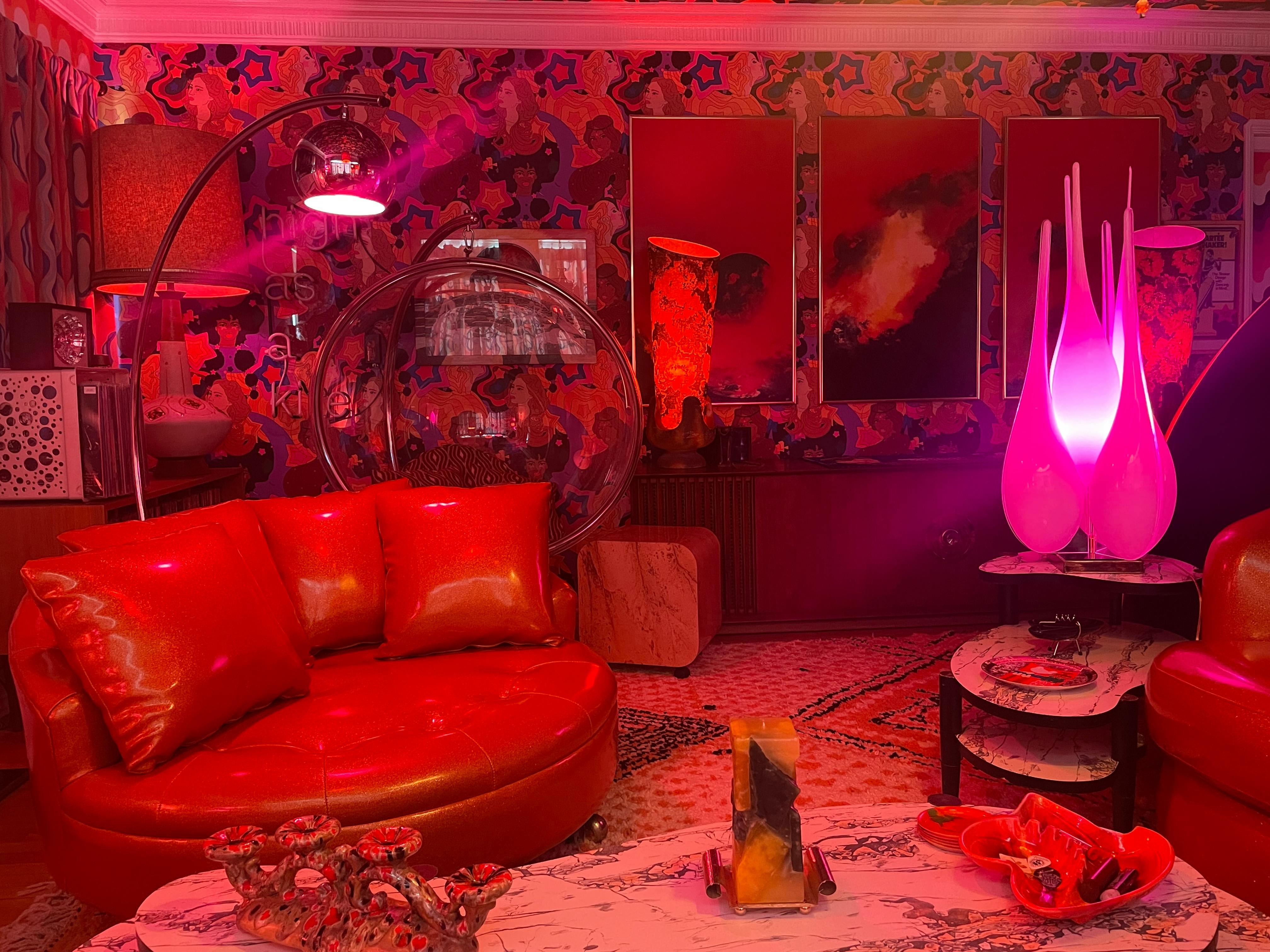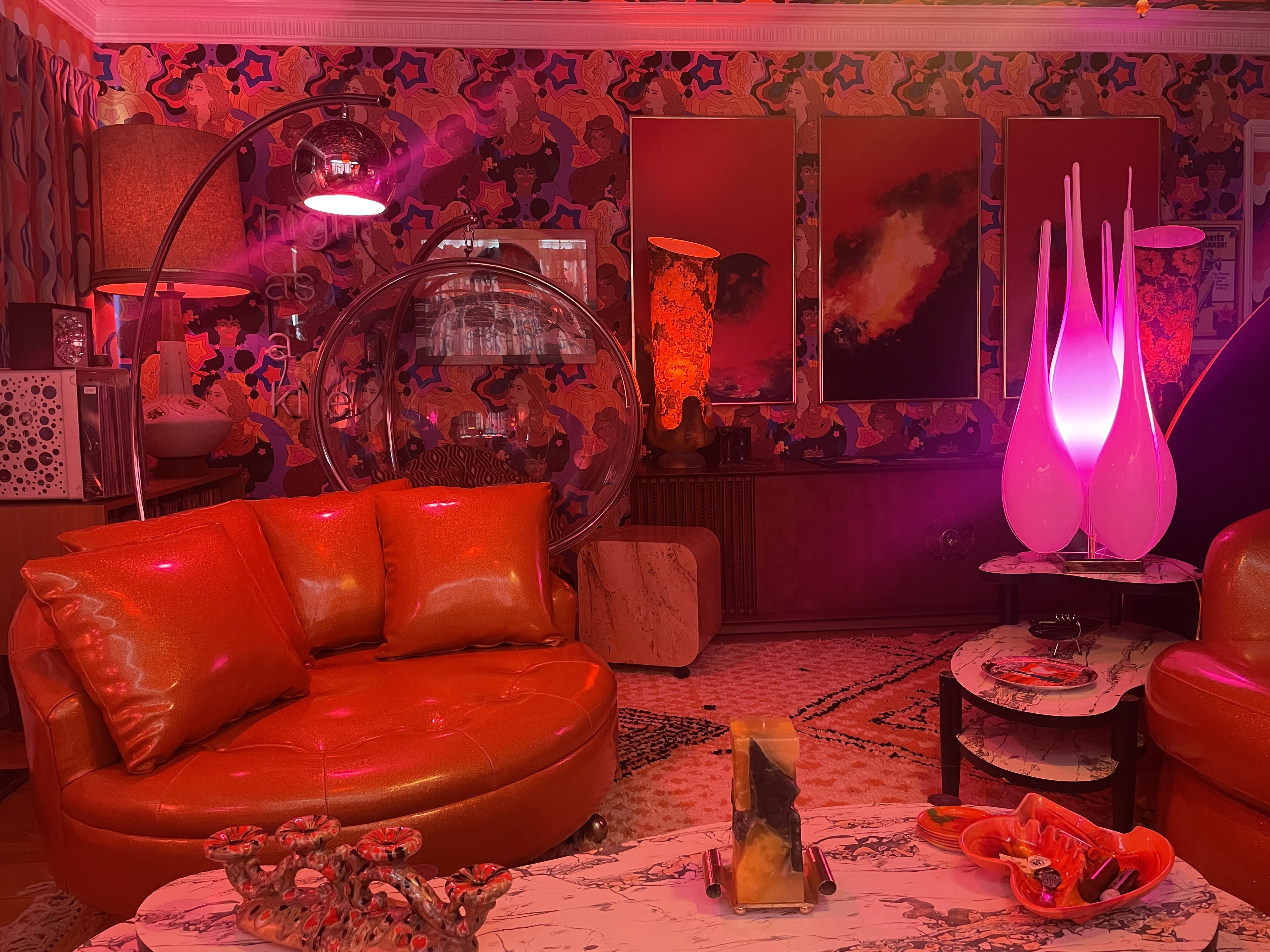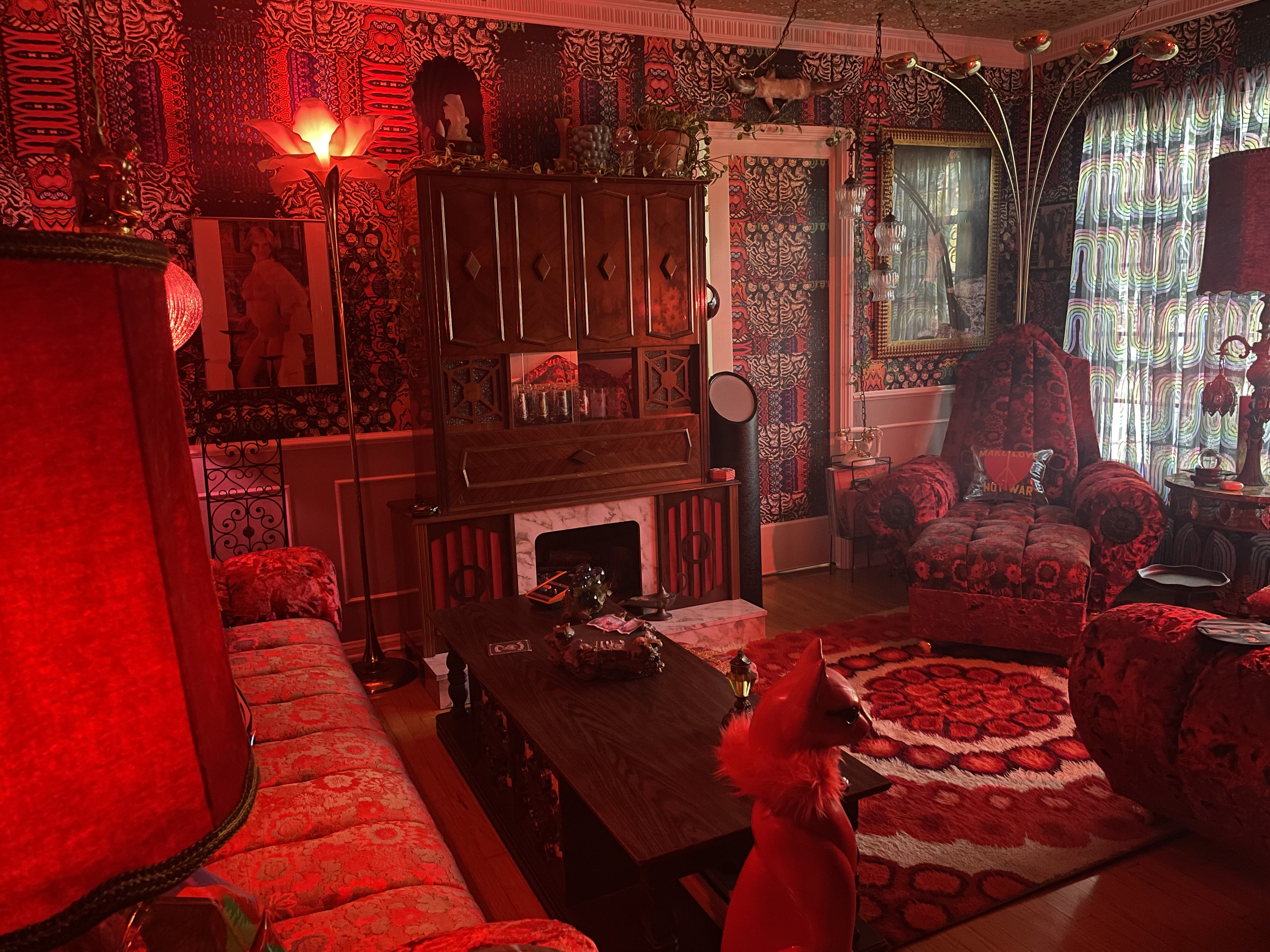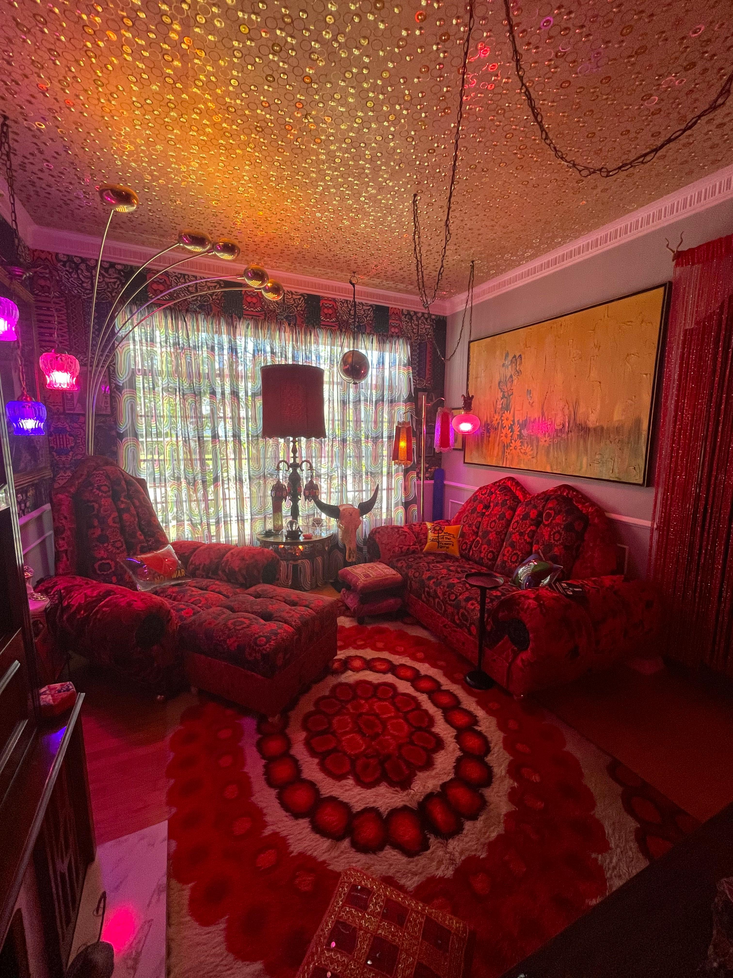 Take a trip to a far-out scene, a total mindblower where the vibes are cool and the karma's clean. A mellow den & way outta sight living space filled with 60s, 70s, icons of the Space Age, MCM, Hollywood Regency, Summer of Love vintage treasures. Photo ops appear at every angle, color-filled with oversized couch sets, lucite, fantasy lighting, erotic art, shagadelic rugs, stereo-bar stocked with a turntable, 8-track player, faux fireplace, blow-up pillows, disco ceiling, glitter & neon vibes.