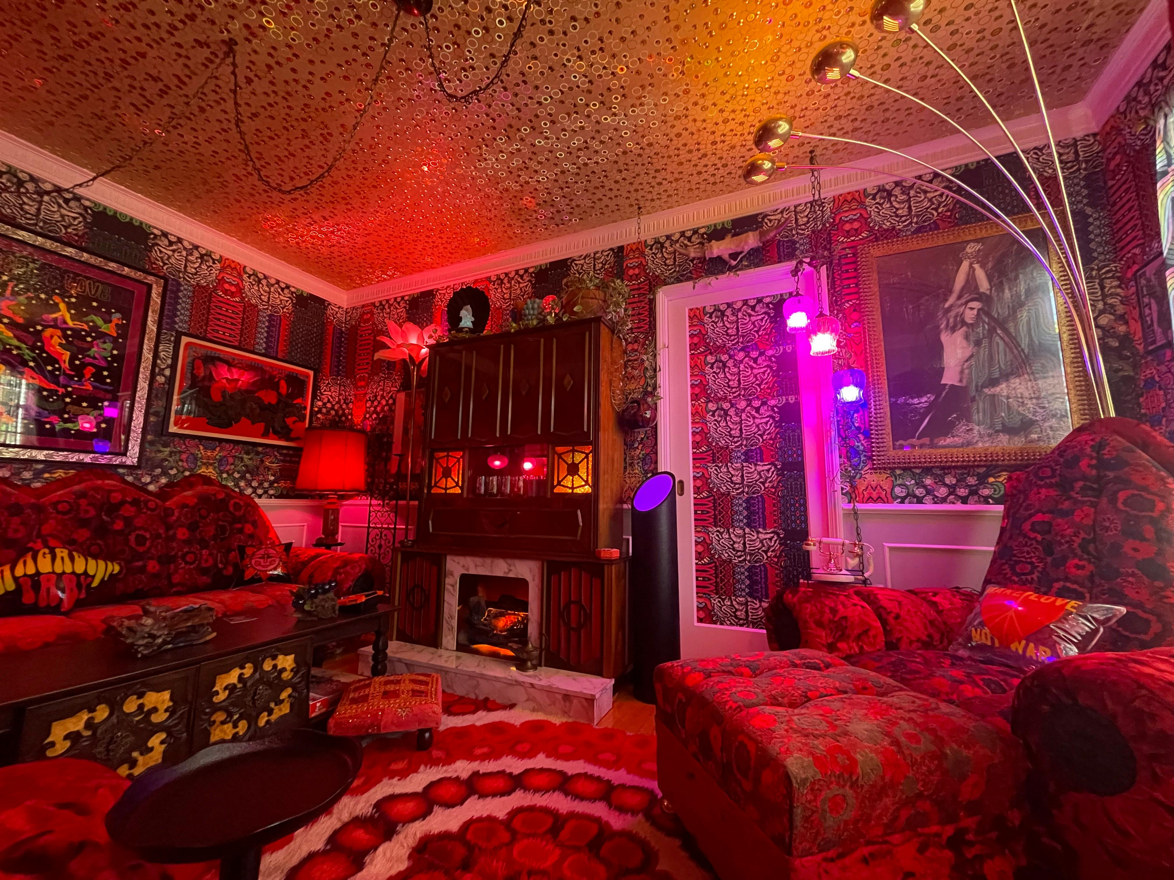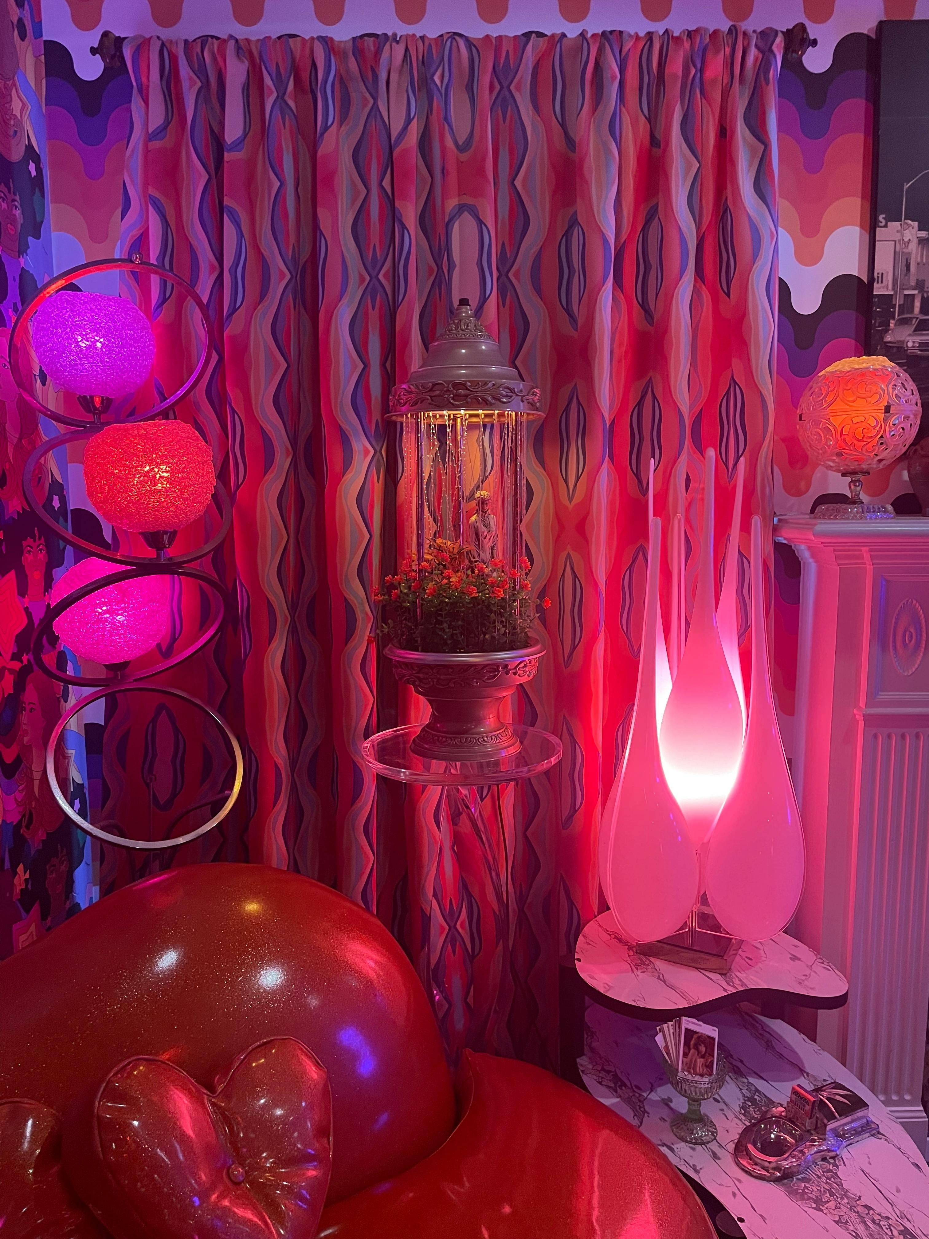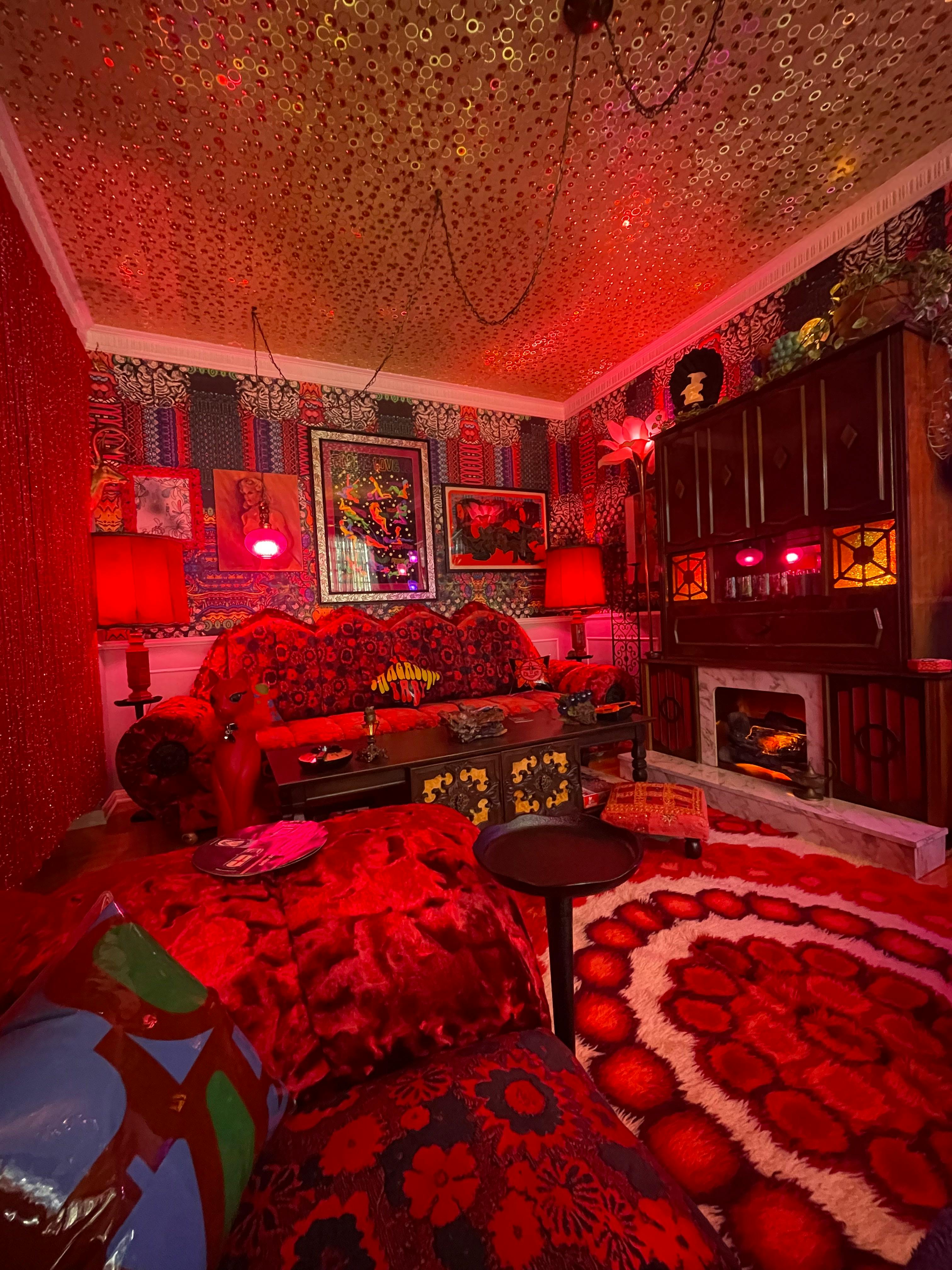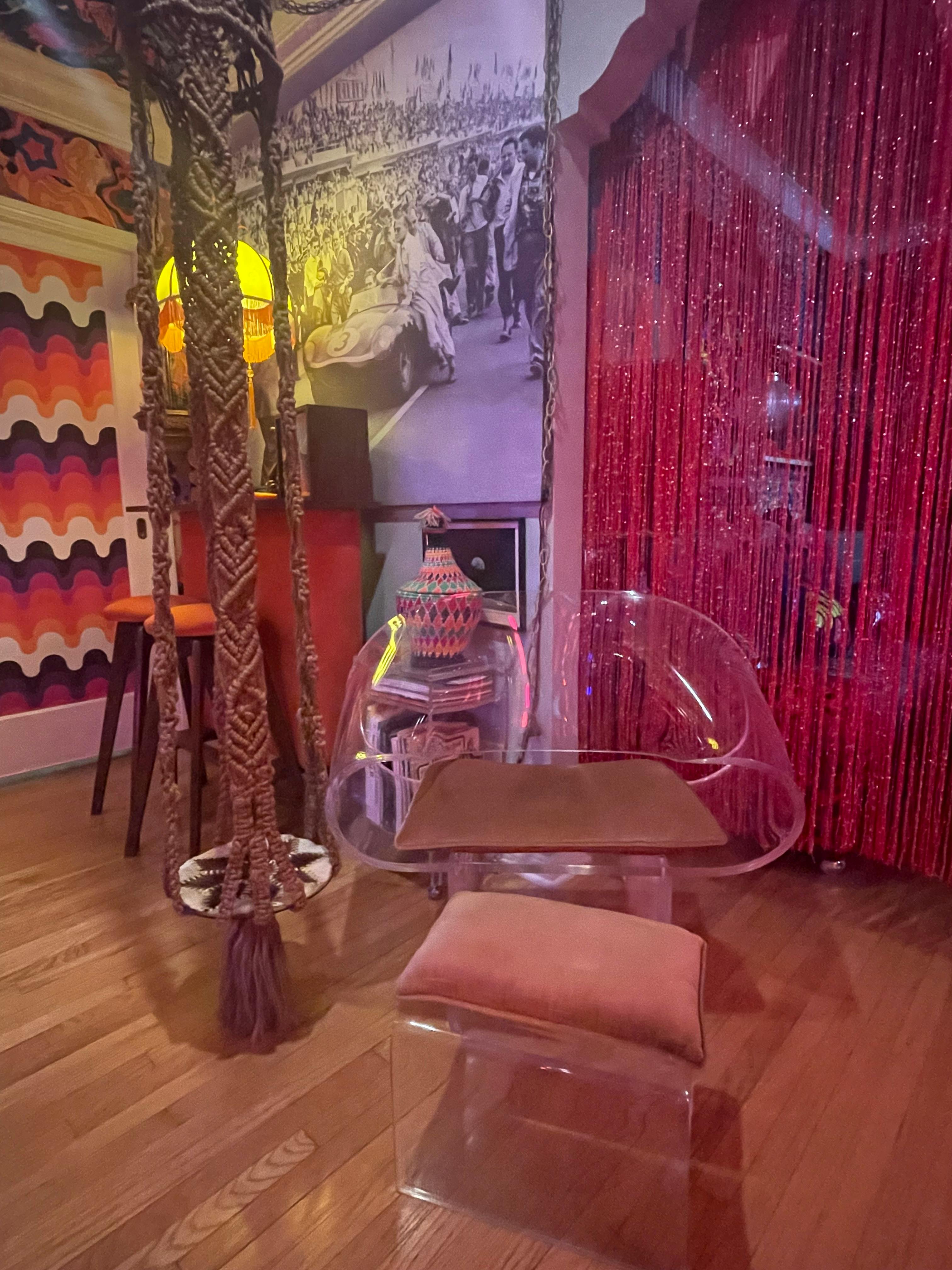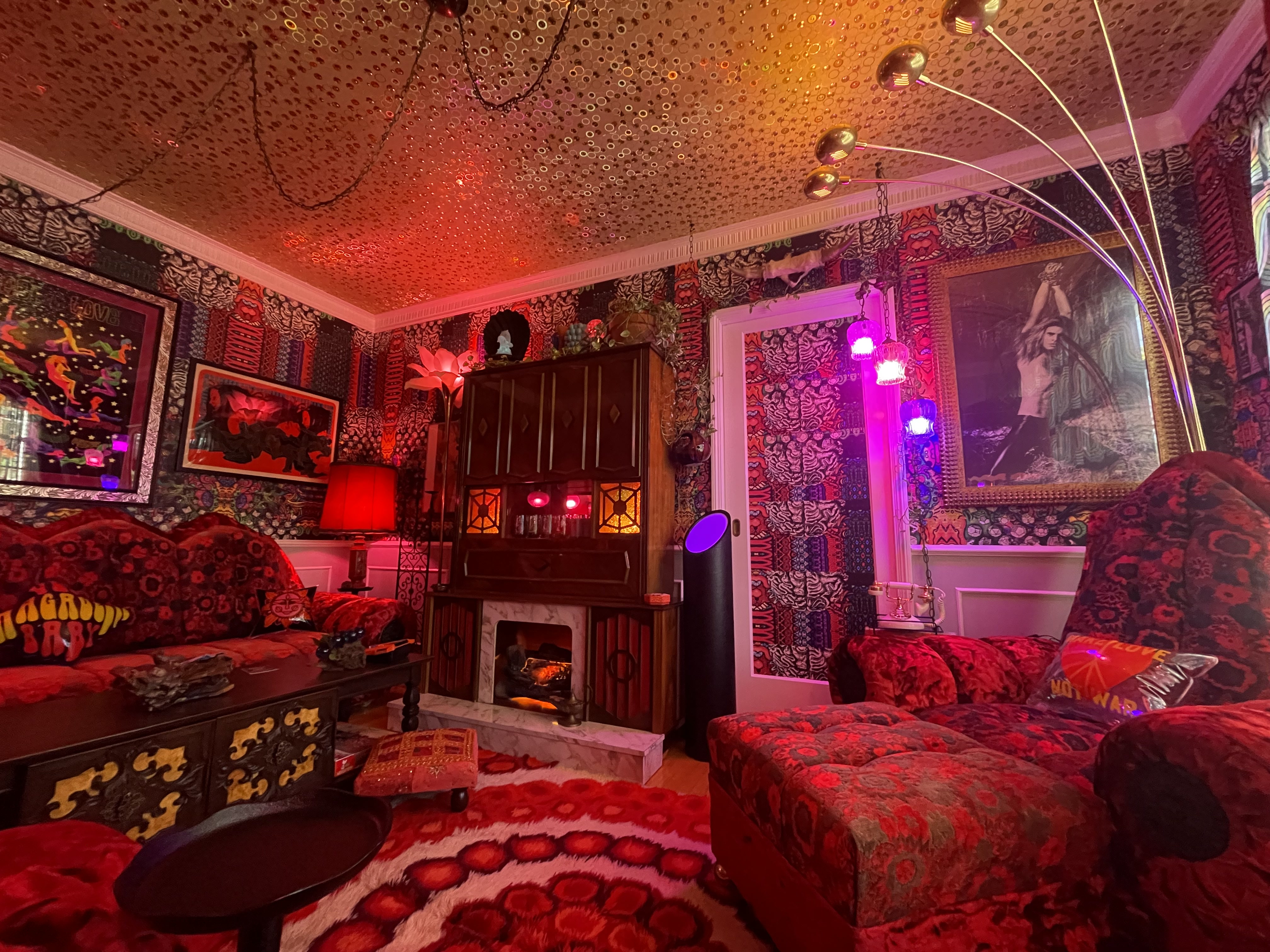 Take a trip to a far-out scene, a total mindblower where the vibes are cool and the karma's clean. A mellow den & way outta sight living space filled with 60s, 70s, icons of the Space Age, MCM, Hollywood Regency, Summer of Love vintage treasures. Photo ops appear at every angle, color-filled with oversized couch sets, lucite, fantasy lighting, erotic art, shagadelic rugs, stereo-bar stocked with a turntable, 8-track player, faux fireplace, blow-up pillows, disco ceiling, glitter & neon vibes.