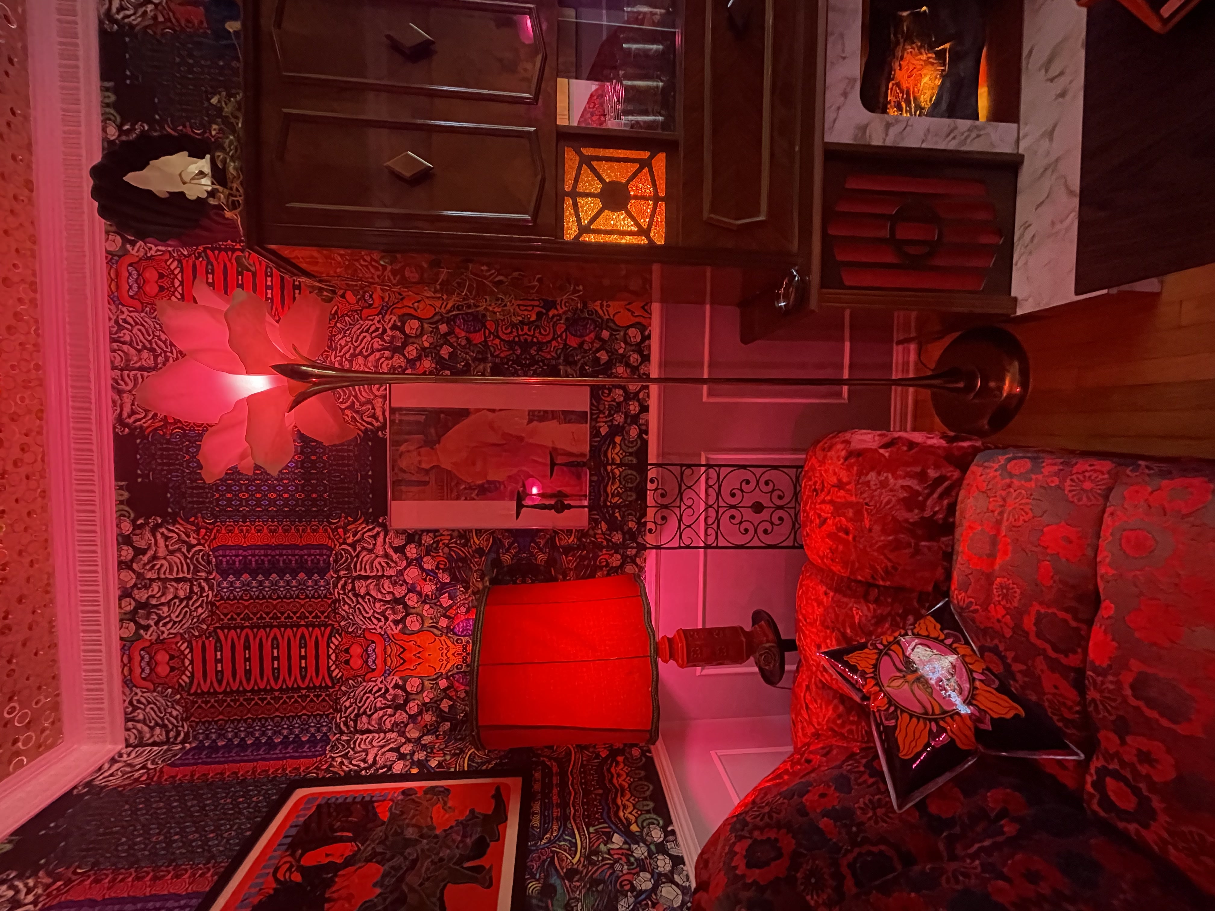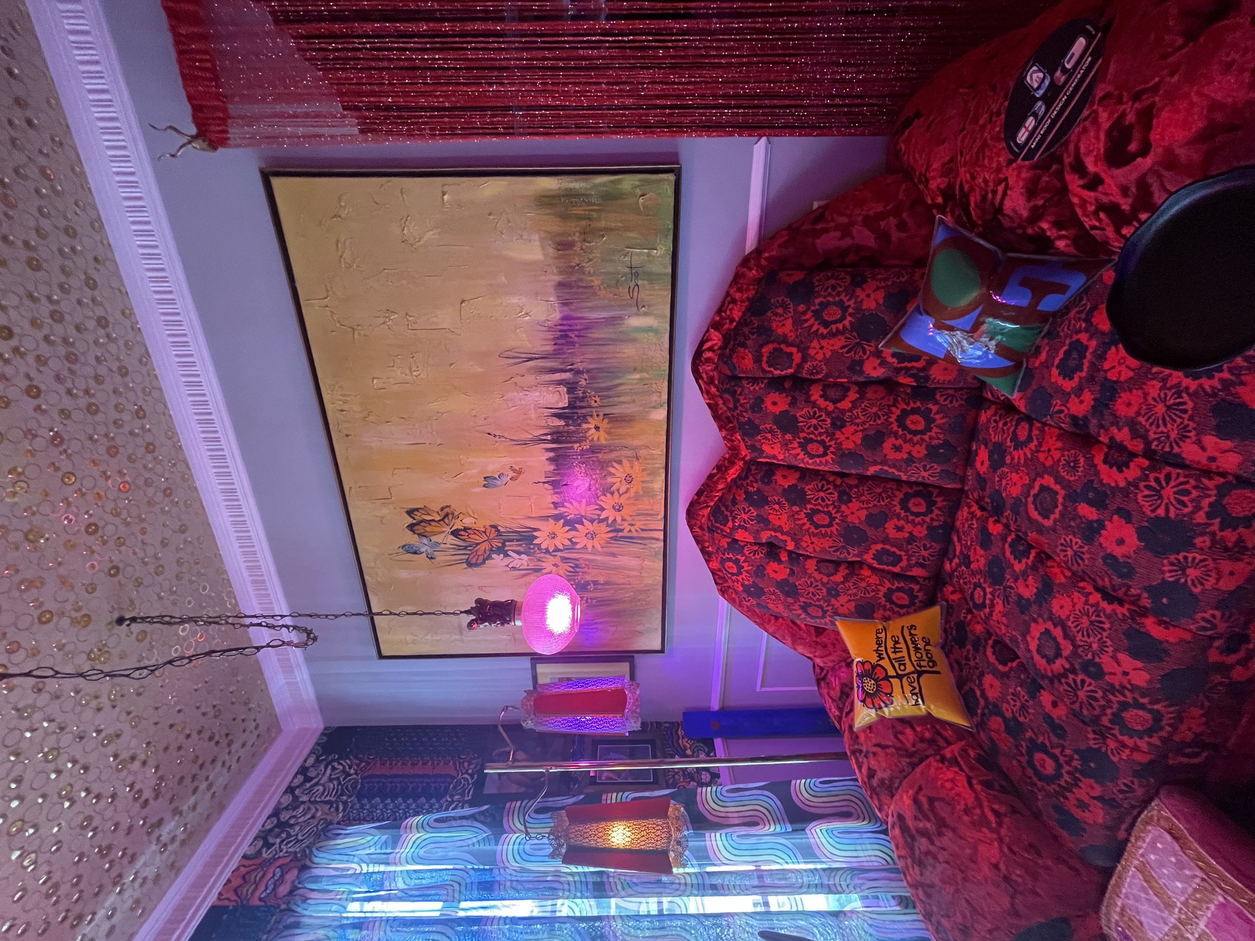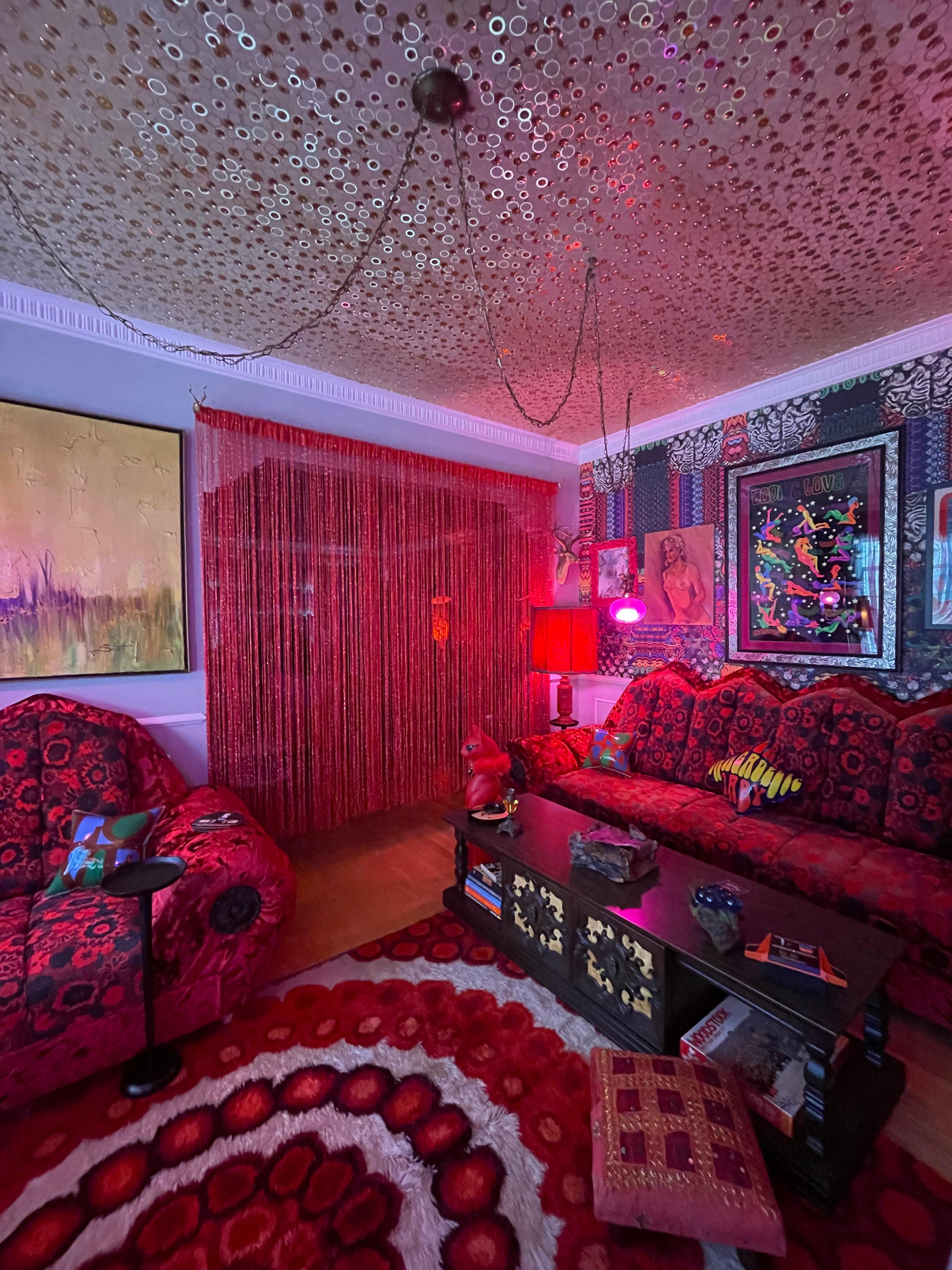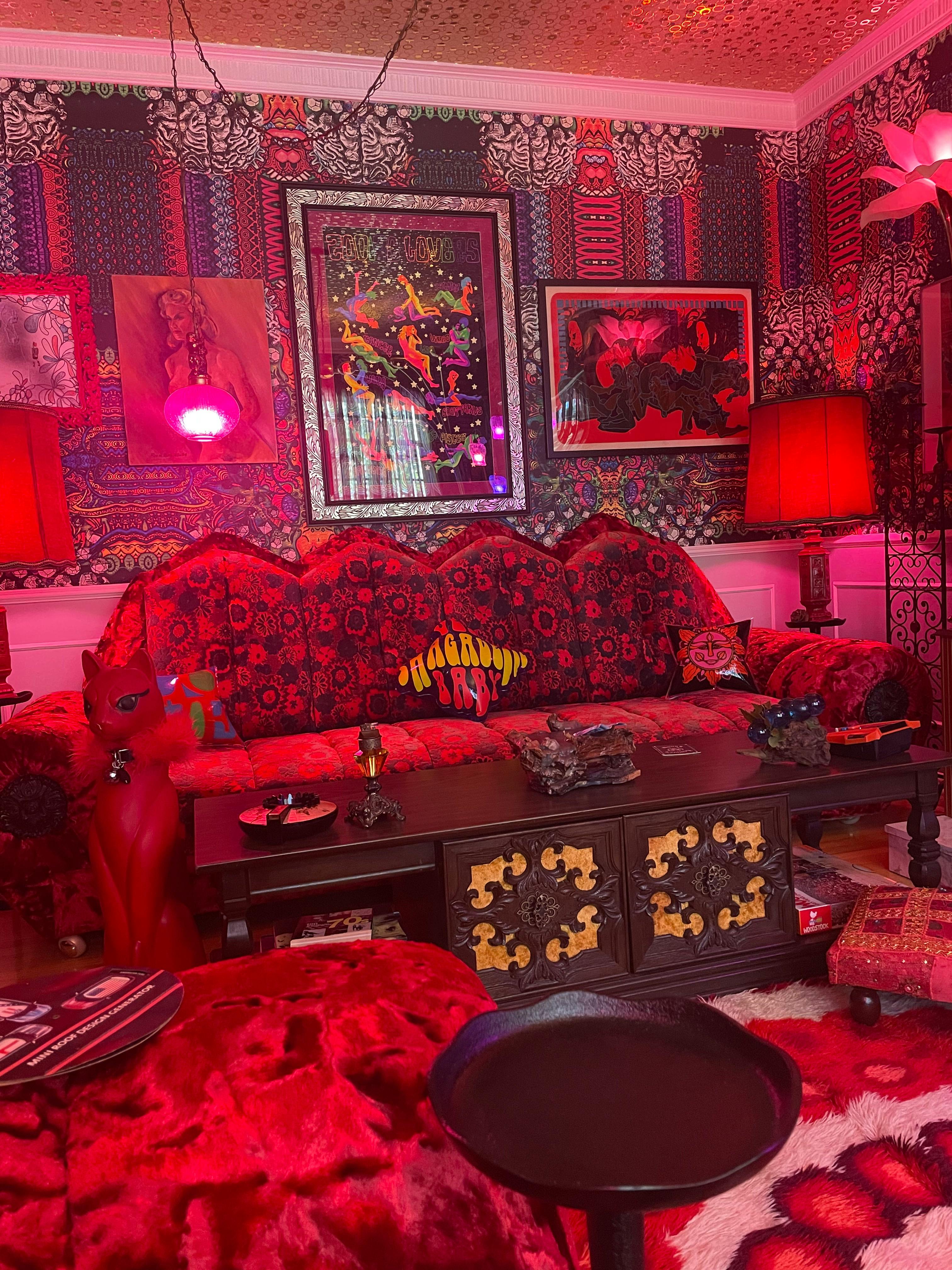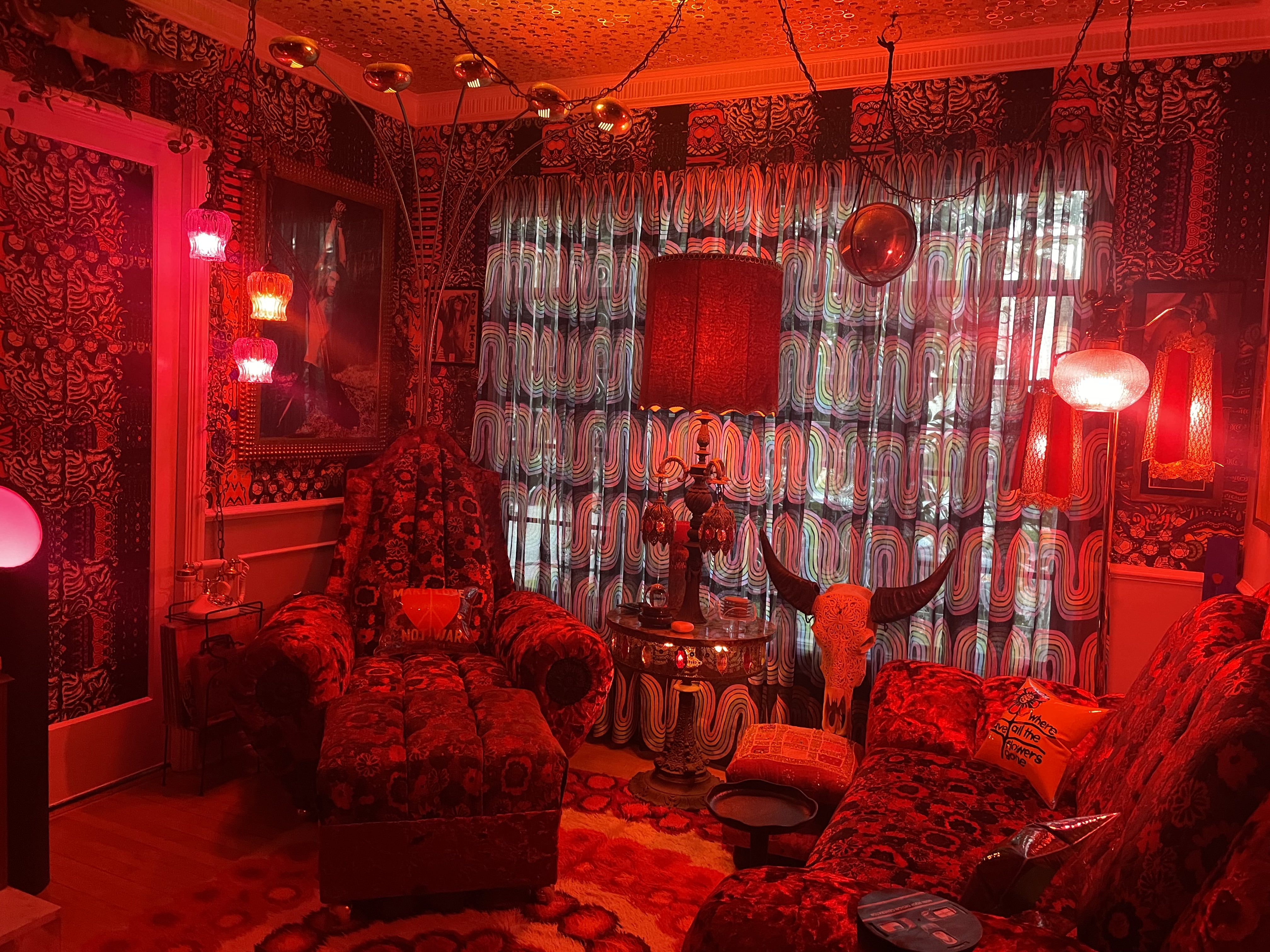 Take a trip to a far-out scene, a total mindblower where the vibes are cool and the karma's clean. A mellow den & way outta sight living space filled with 60s, 70s, icons of the Space Age, MCM, Hollywood Regency, Summer of Love vintage treasures. Photo ops appear at every angle, color-filled with oversized couch sets, lucite, fantasy lighting, erotic art, shagadelic rugs, stereo-bar stocked with a turntable, 8-track player, faux fireplace, blow-up pillows, disco ceiling, glitter & neon vibes.
