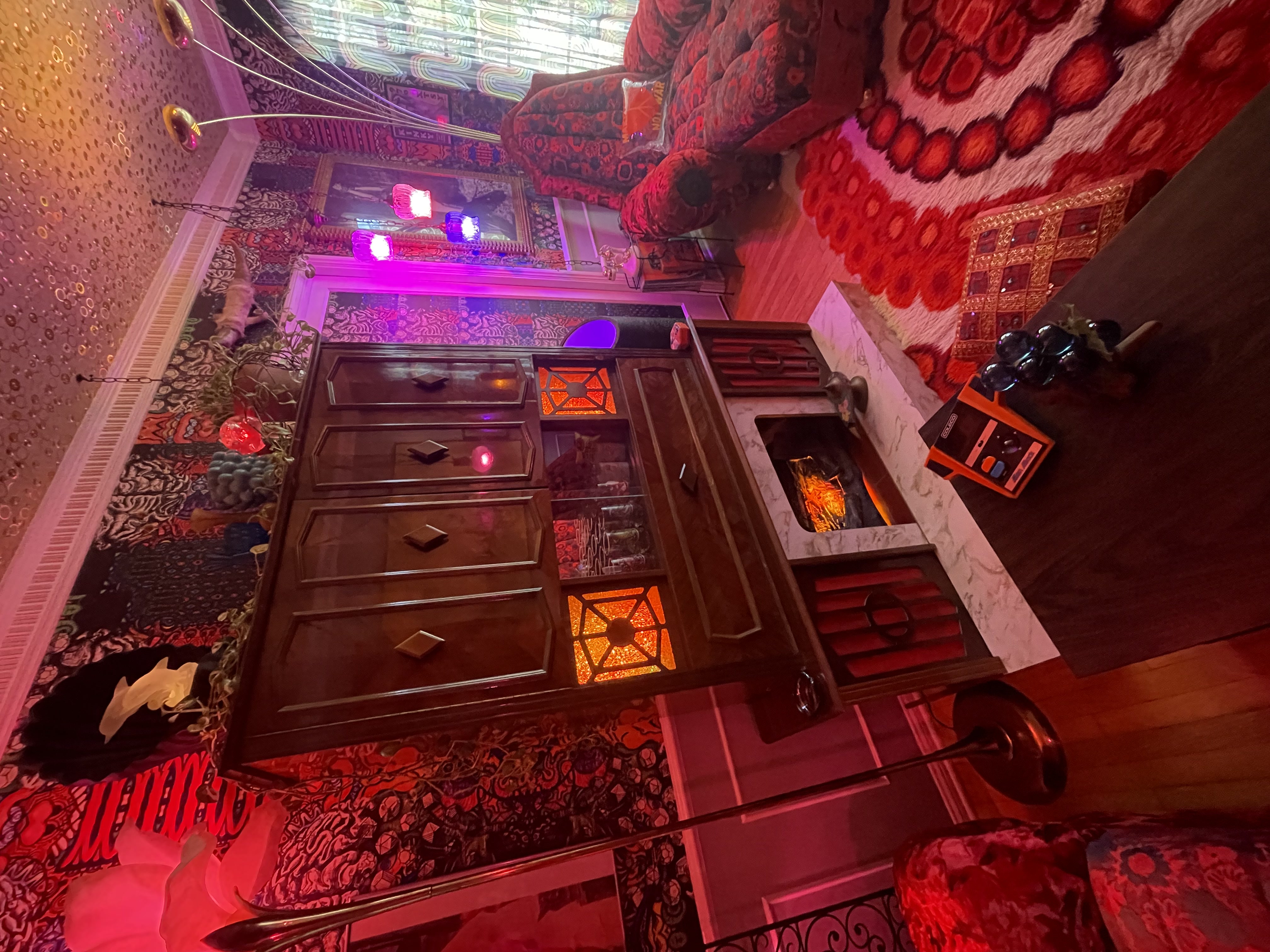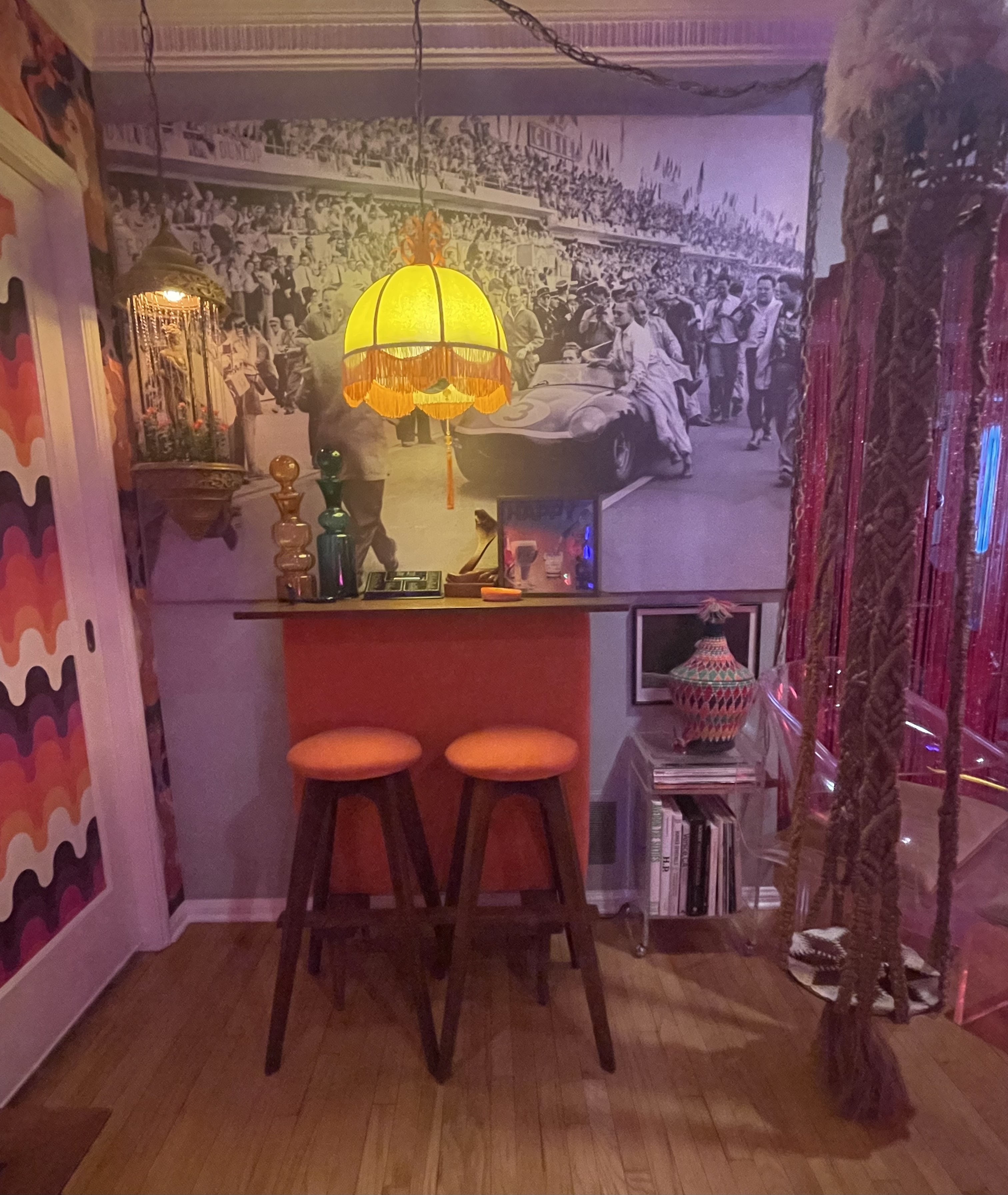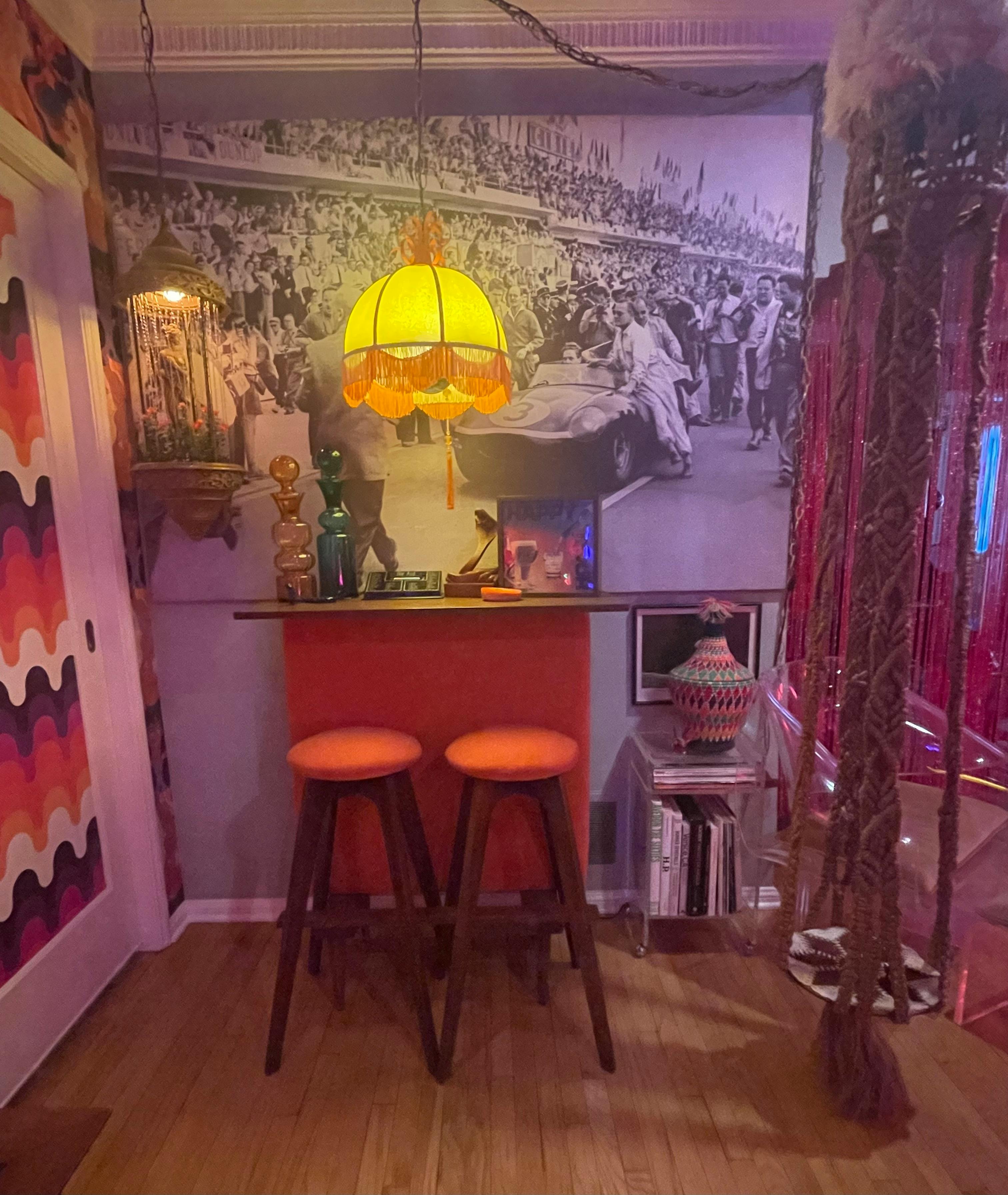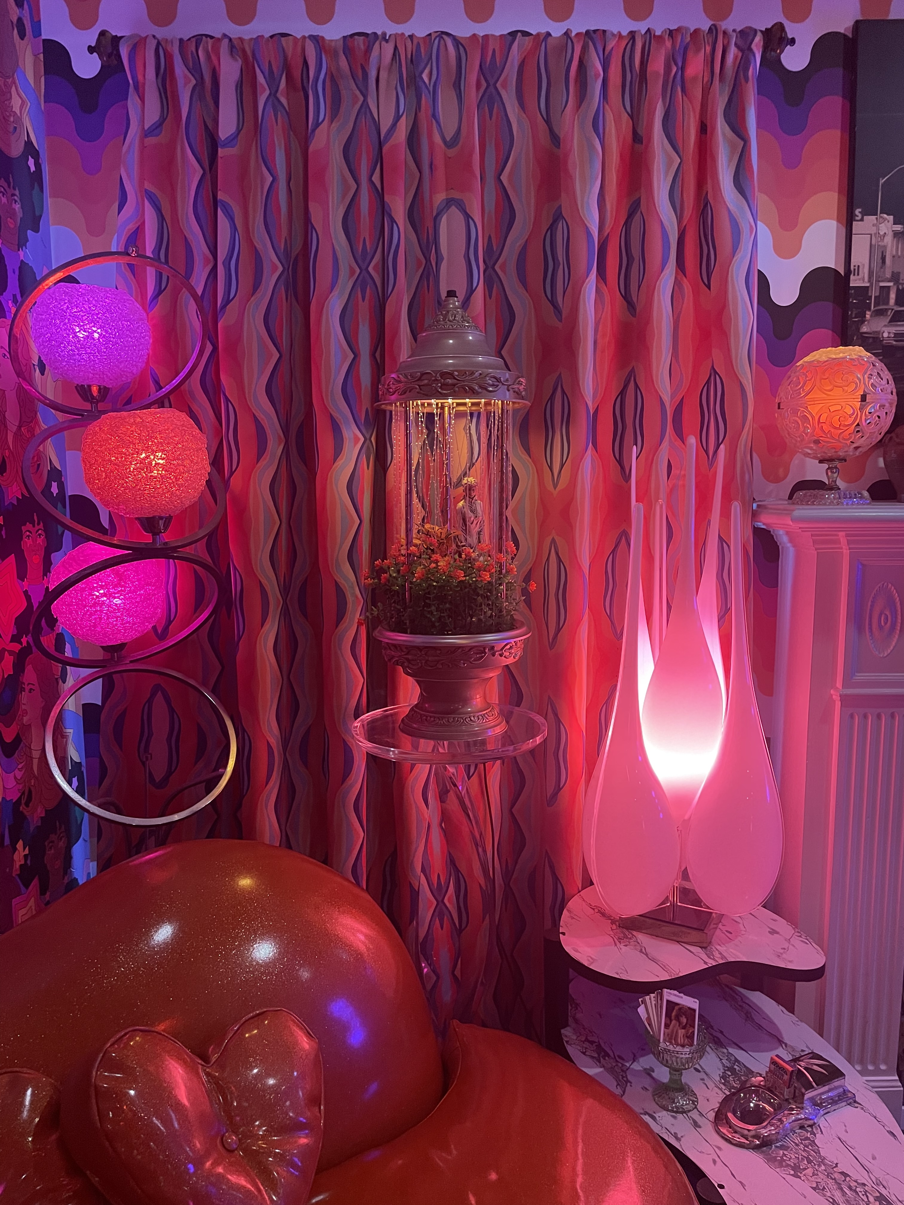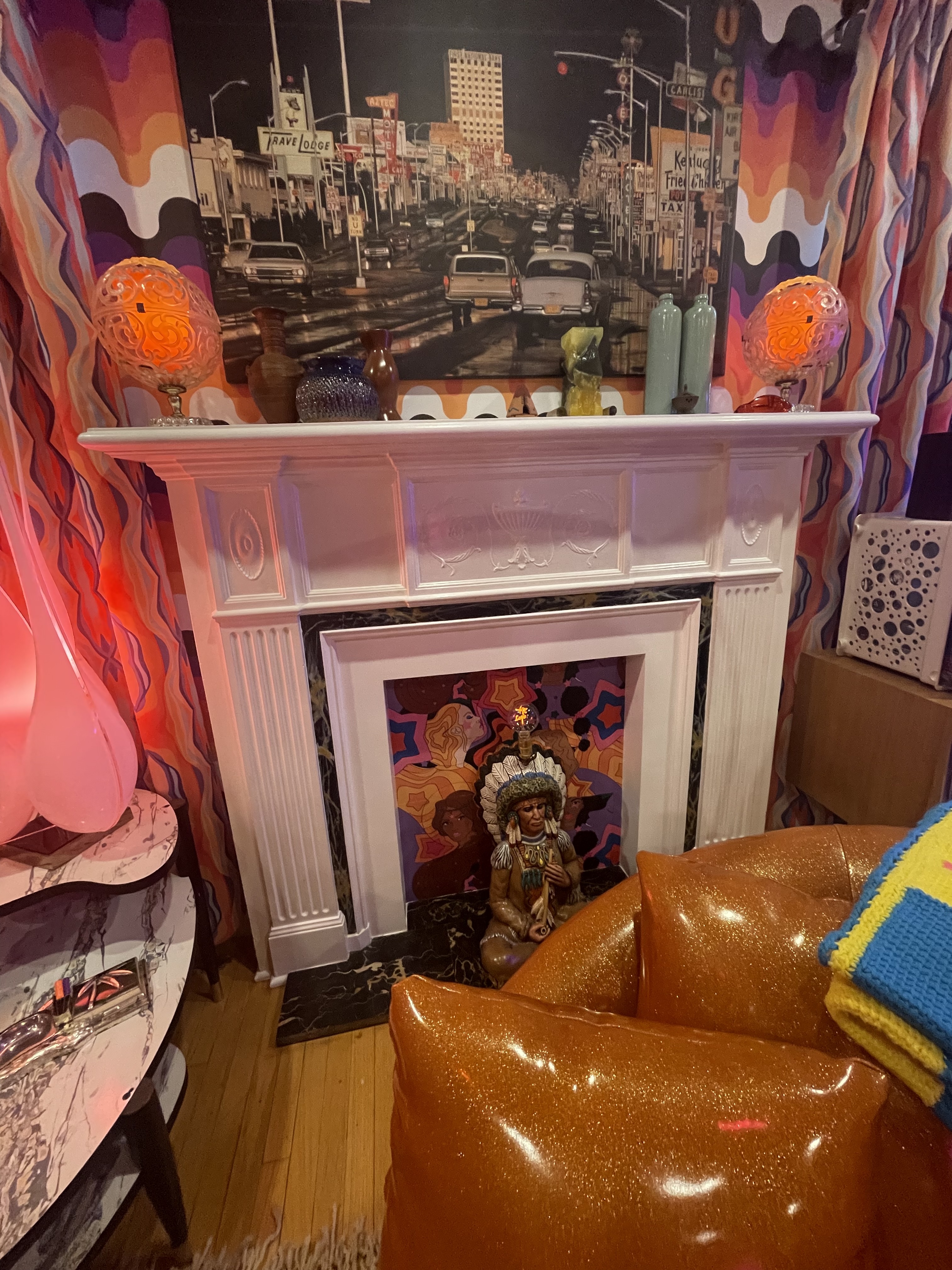 Take a trip to a far-out scene, a total mindblower where the vibes are cool and the karma's clean. A mellow den & way outta sight living space filled with 60s, 70s, icons of the Space Age, MCM, Hollywood Regency, Summer of Love vintage treasures. Photo ops appear at every angle, color-filled with oversized couch sets, lucite, fantasy lighting, erotic art, shagadelic rugs, stereo-bar stocked with a turntable, 8-track player, faux fireplace, blow-up pillows, disco ceiling, glitter & neon vibes.