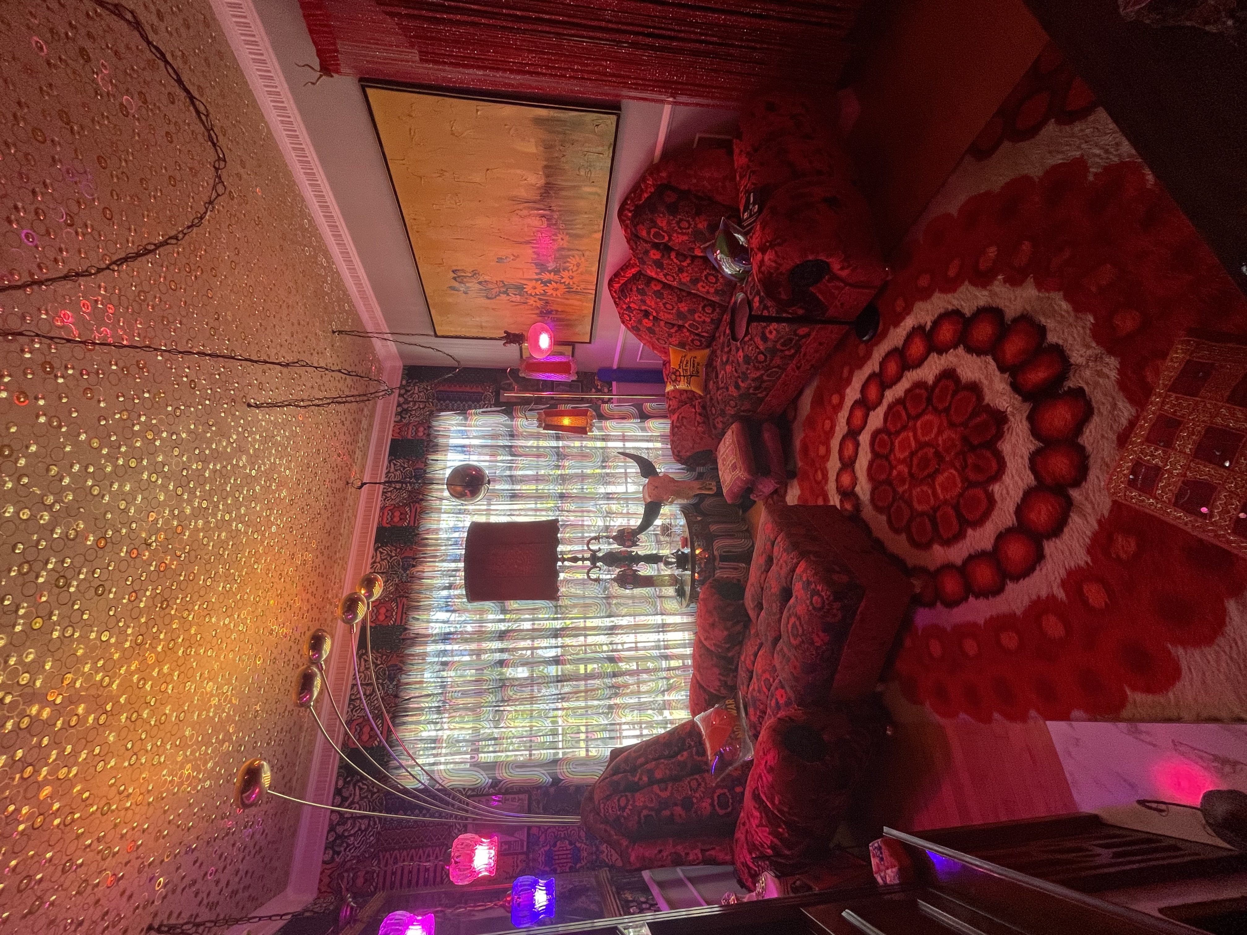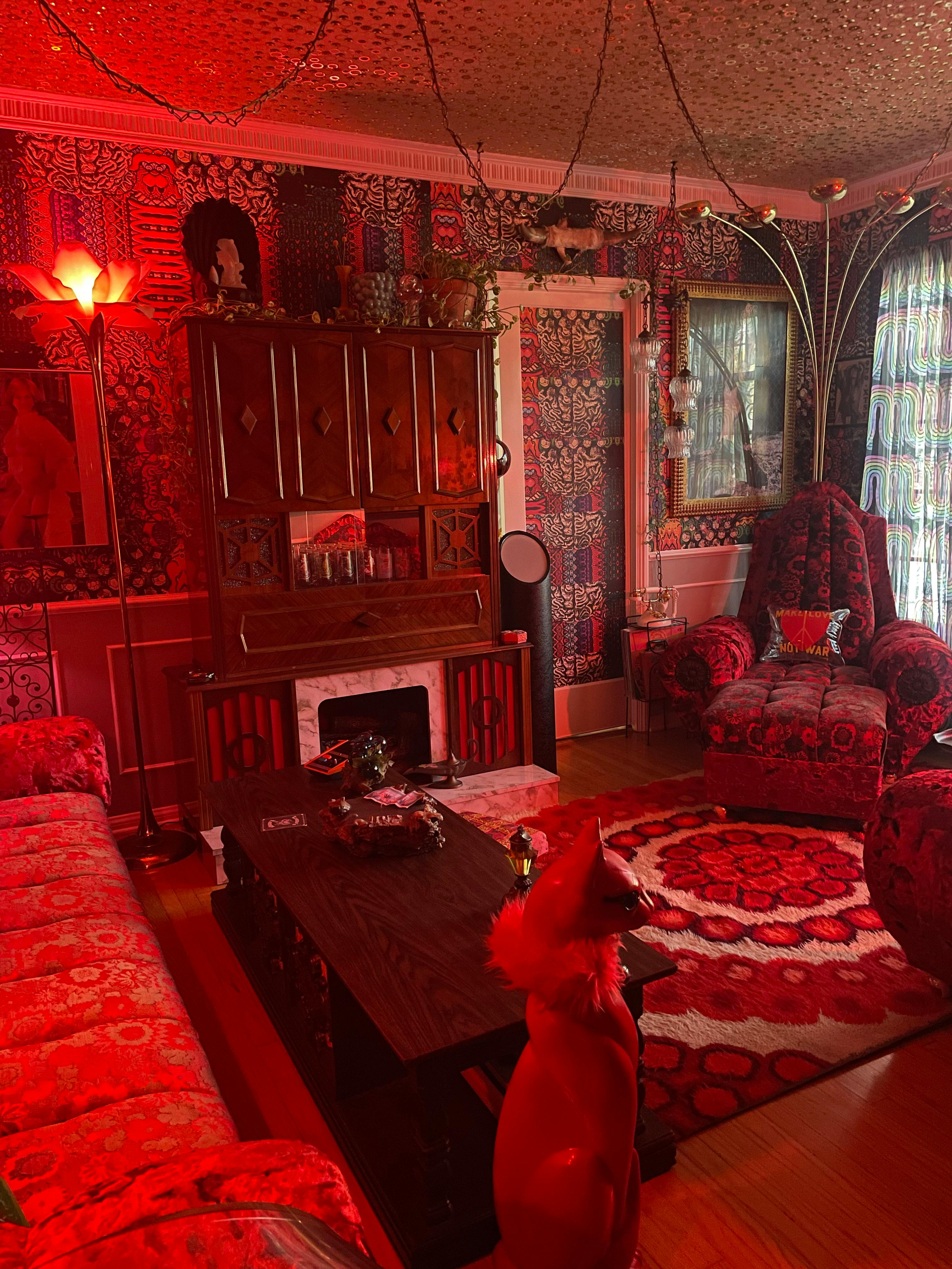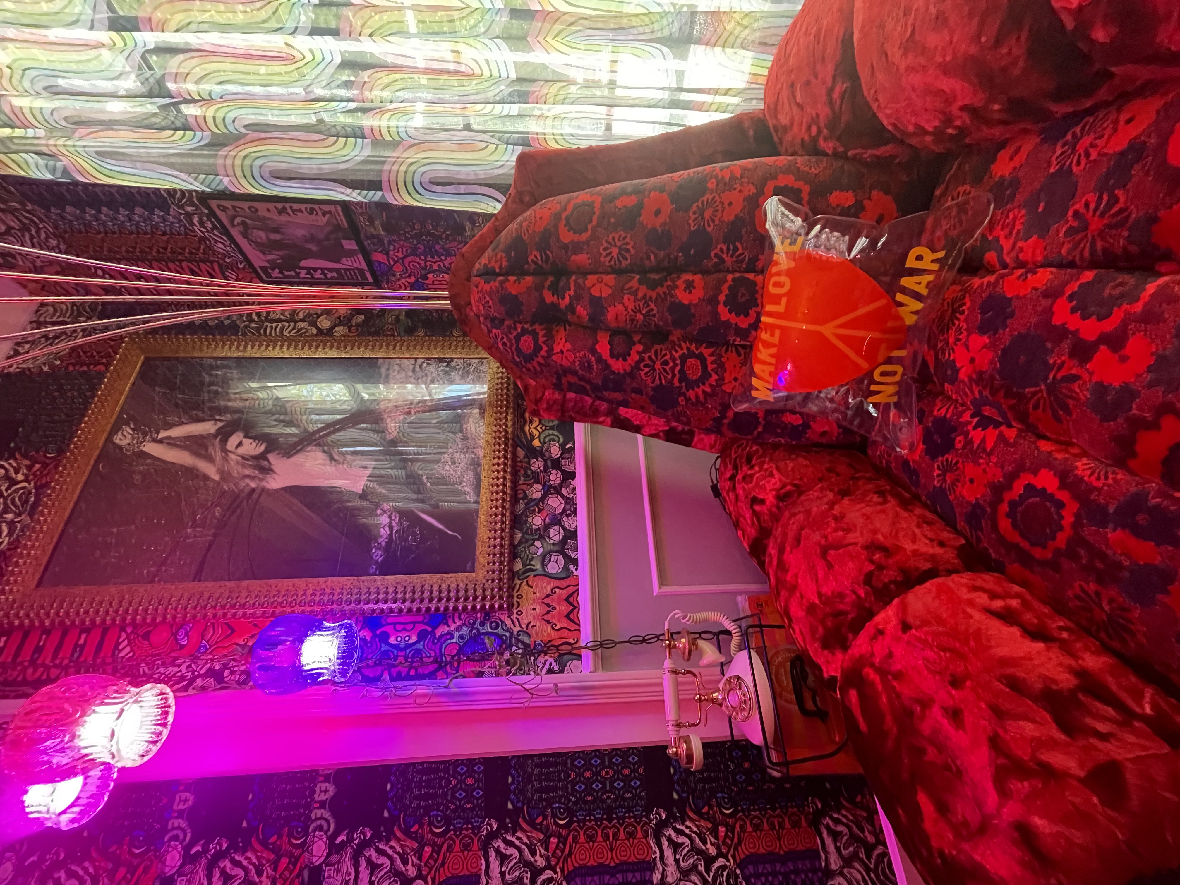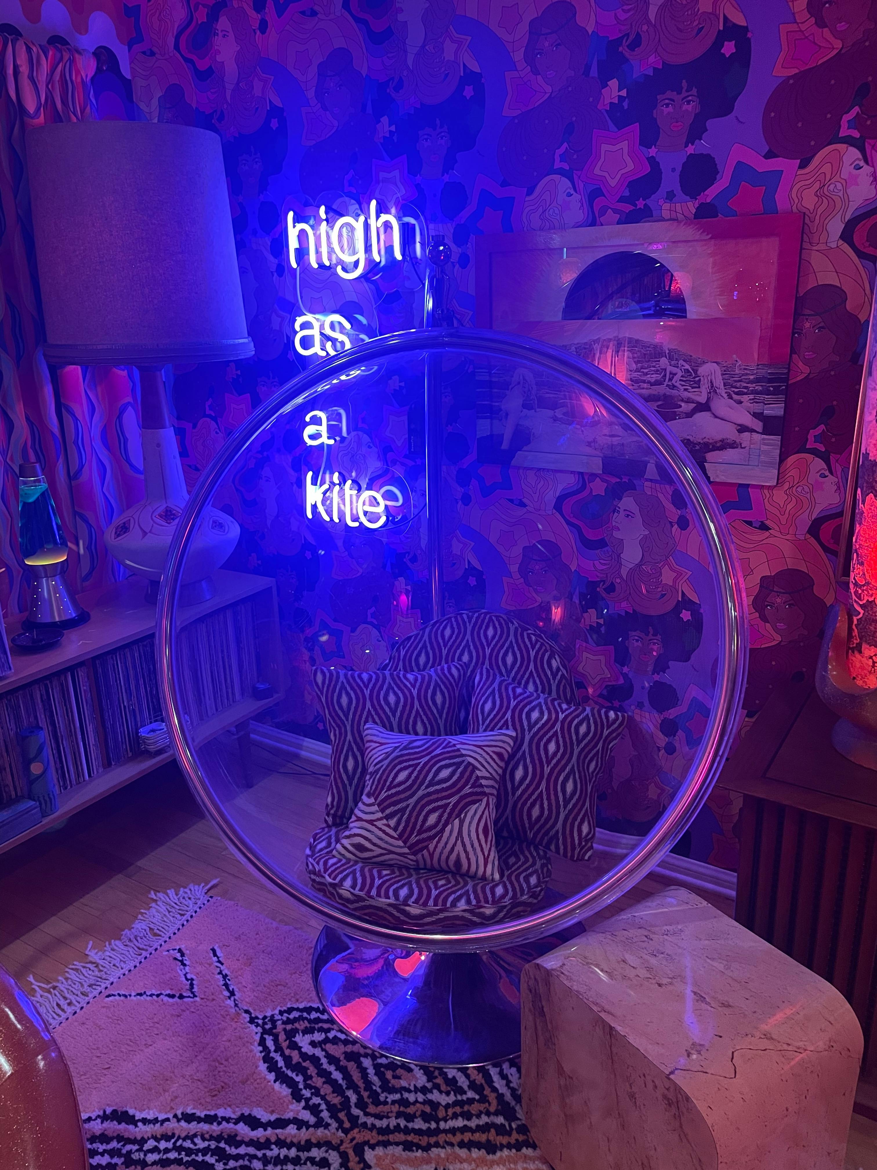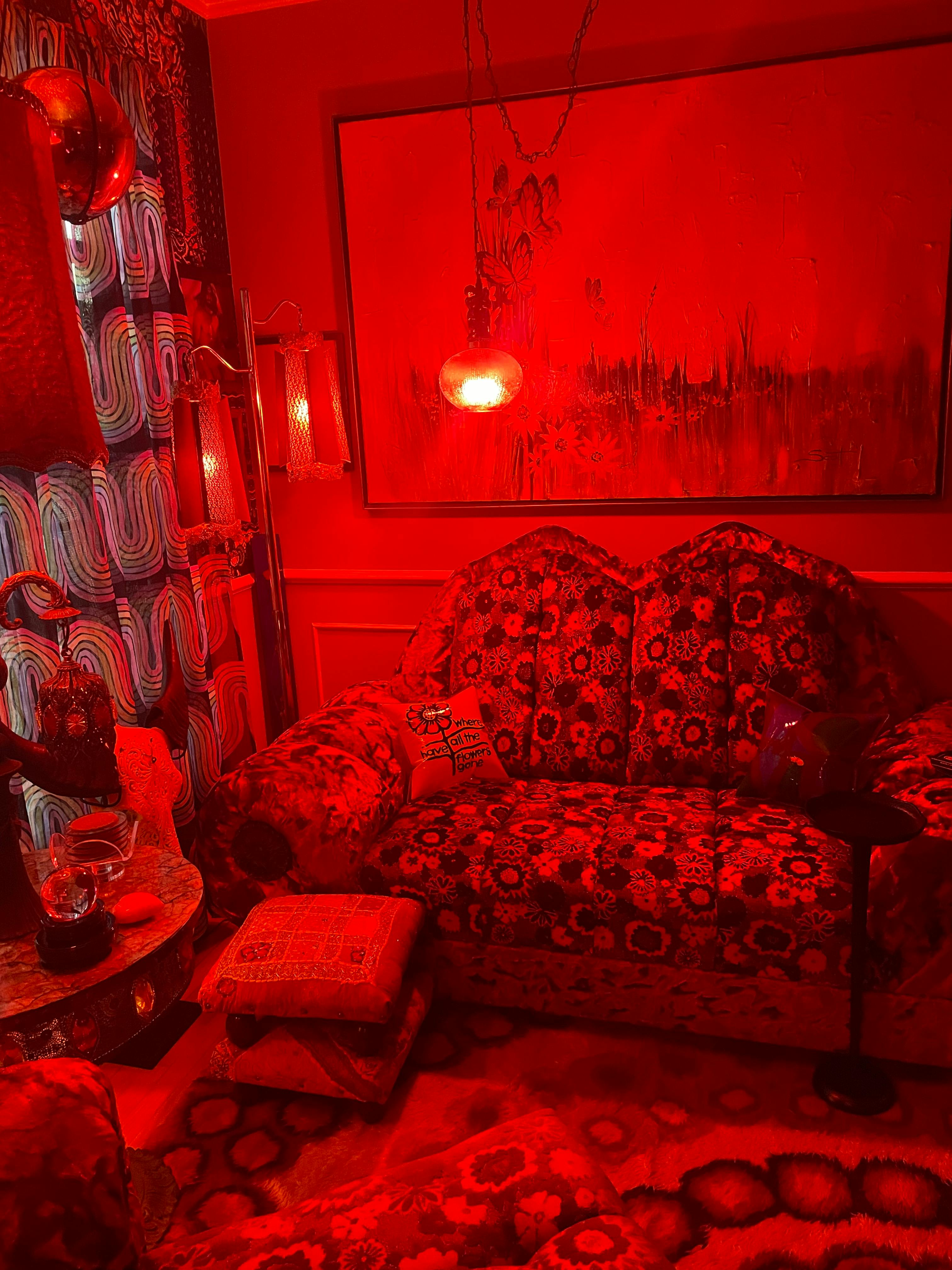 Take a trip to a far-out scene, a total mindblower where the vibes are cool and the karma's clean. A mellow den & way outta sight living space filled with 60s, 70s, icons of the Space Age, MCM, Hollywood Regency, Summer of Love vintage treasures. Photo ops appear at every angle, color-filled with oversized couch sets, lucite, fantasy lighting, erotic art, shagadelic rugs, stereo-bar stocked with a turntable, 8-track player, faux fireplace, blow-up pillows, disco ceiling, glitter & neon vibes.