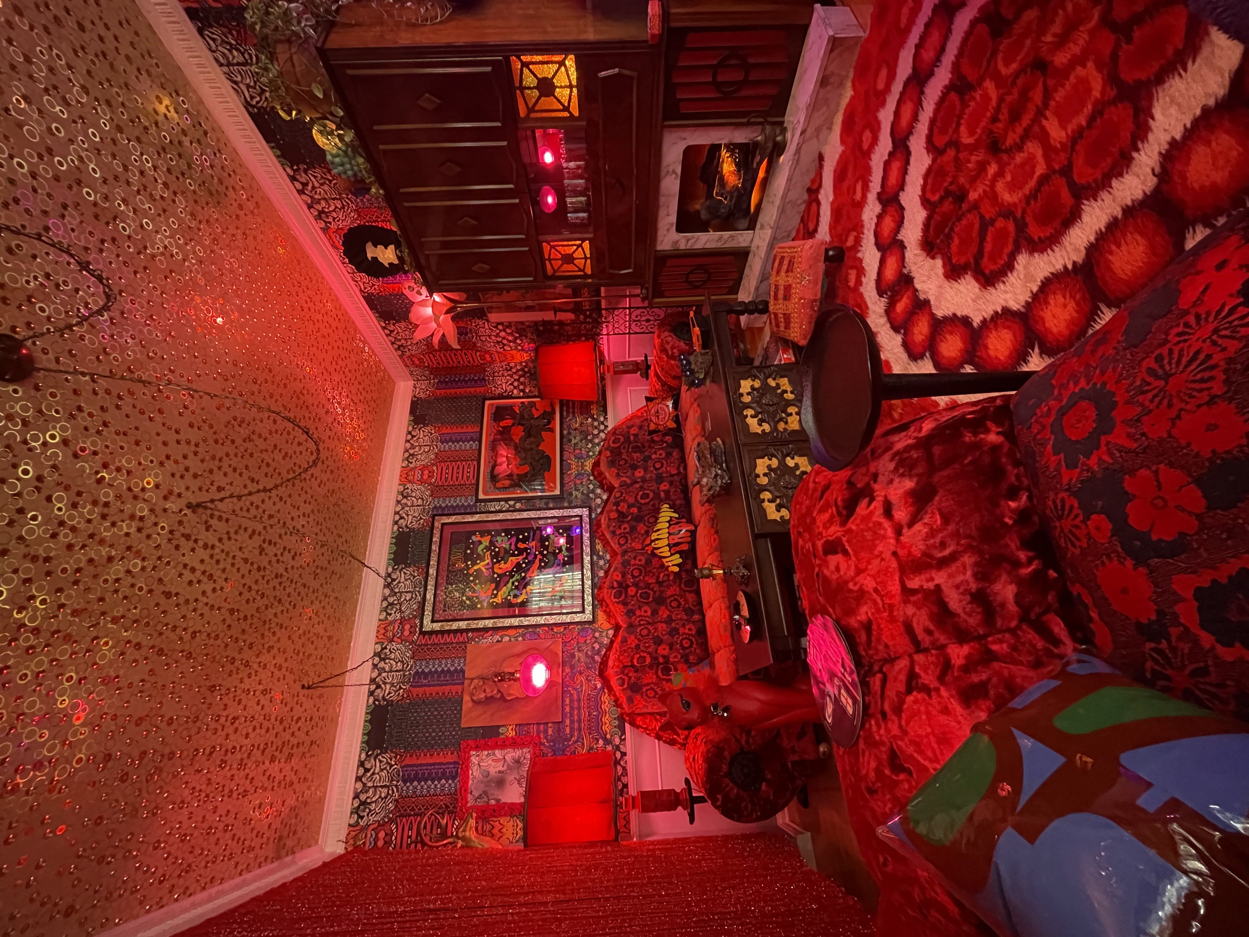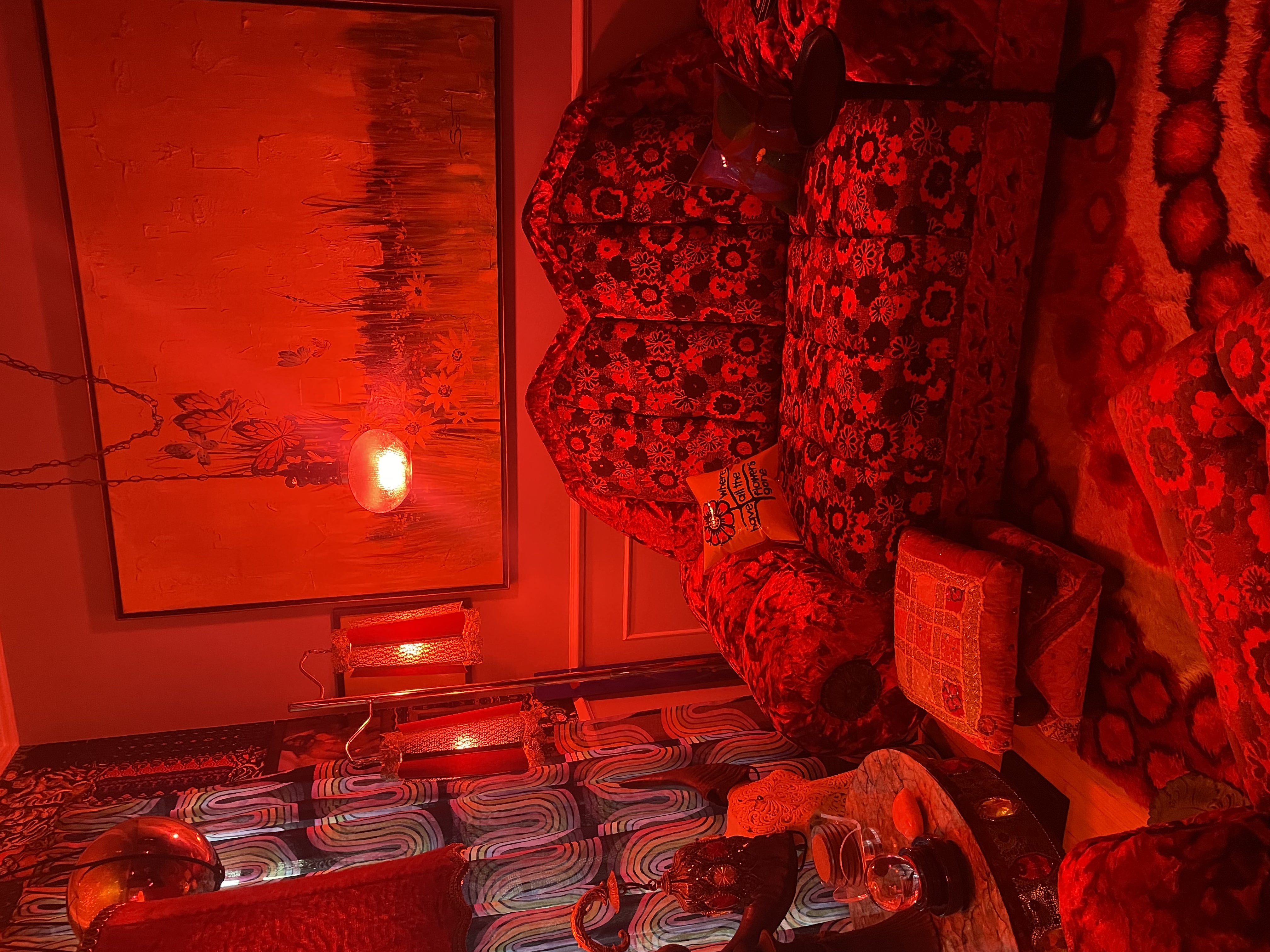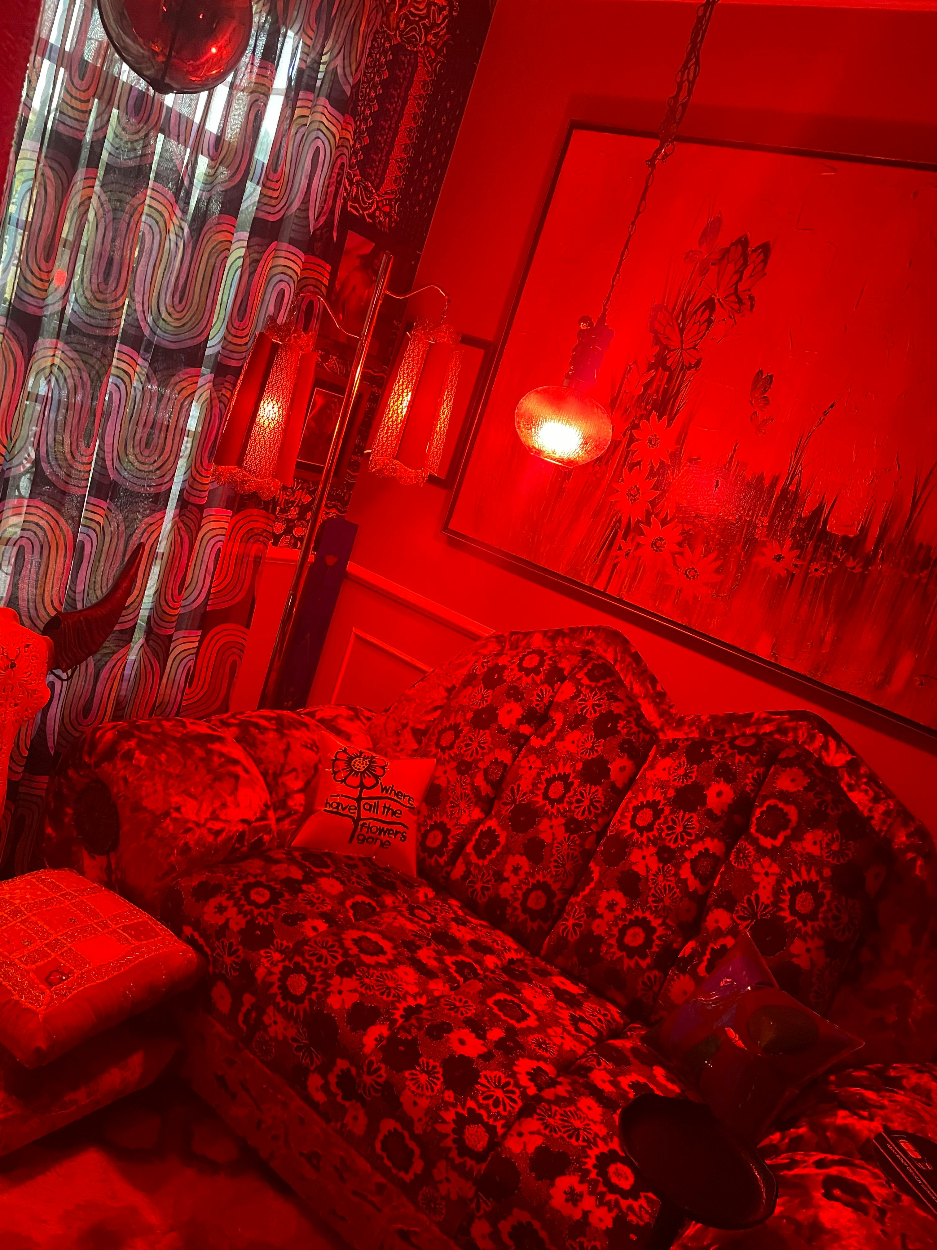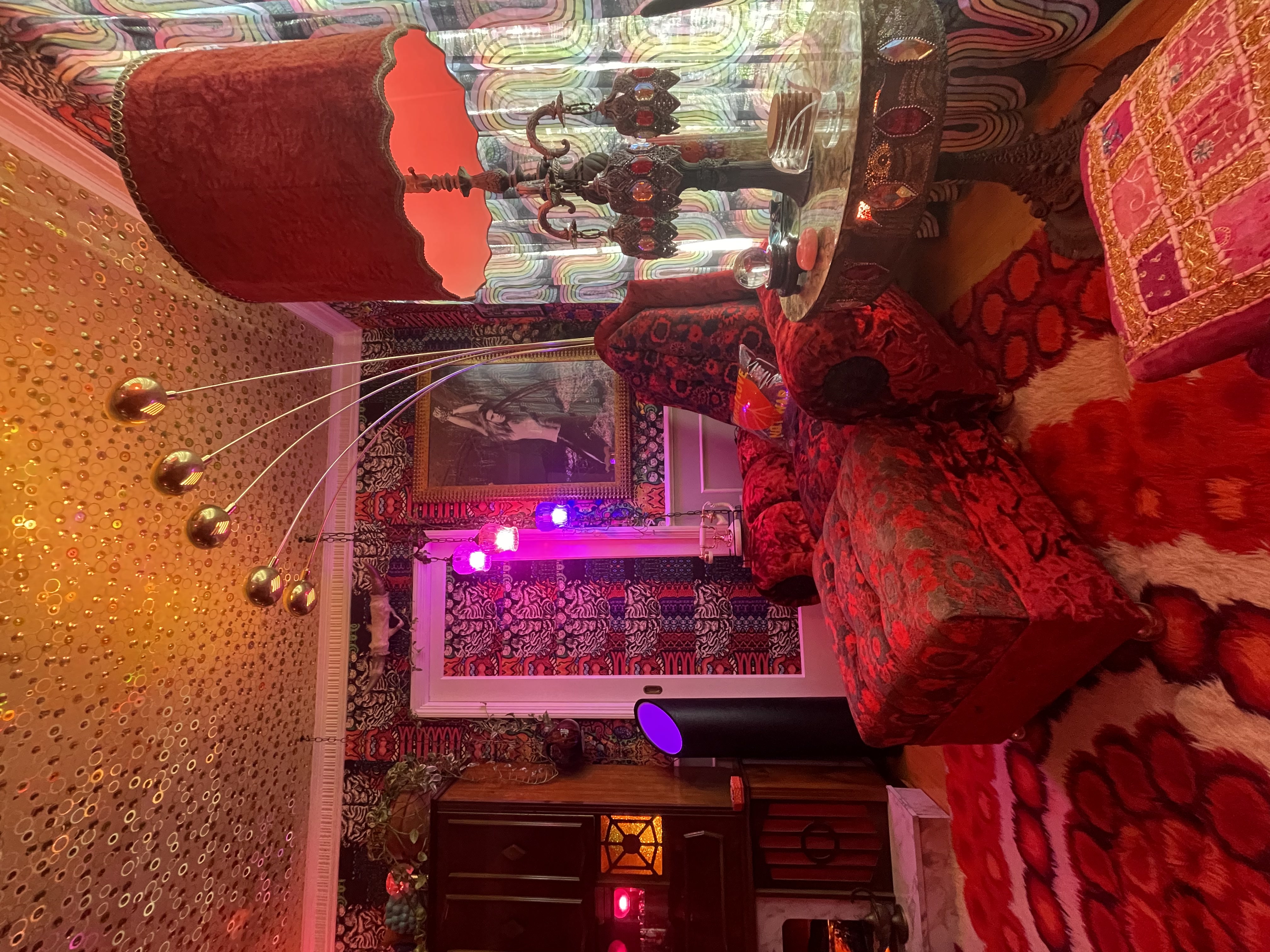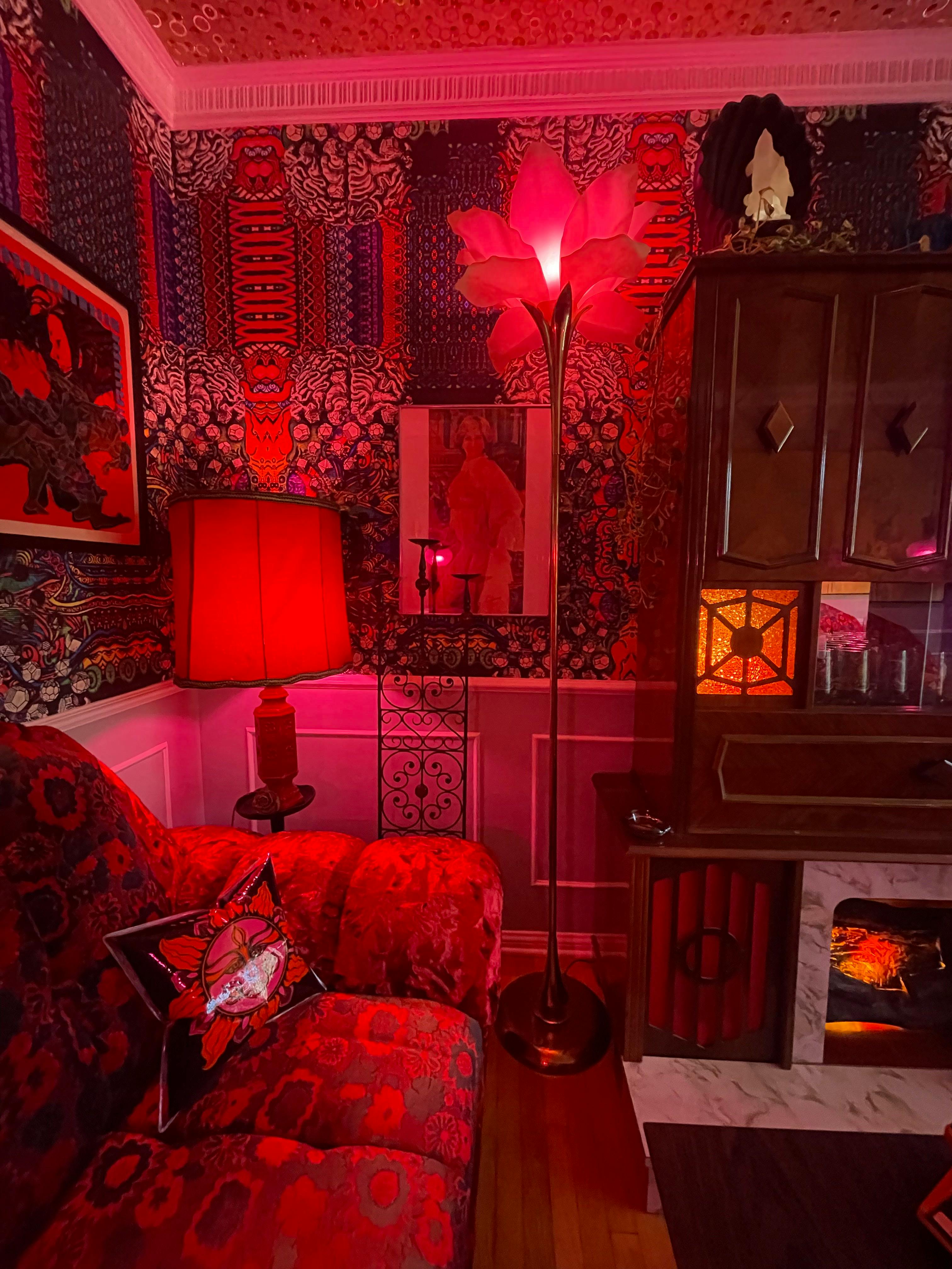 Take a trip to a far-out scene, a total mindblower where the vibes are cool and the karma's clean. A mellow den & way outta sight living space filled with 60s, 70s, icons of the Space Age, MCM, Hollywood Regency, Summer of Love vintage treasures. Photo ops appear at every angle, color-filled with oversized couch sets, lucite, fantasy lighting, erotic art, shagadelic rugs, stereo-bar stocked with a turntable, 8-track player, faux fireplace, blow-up pillows, disco ceiling, glitter & neon vibes.
