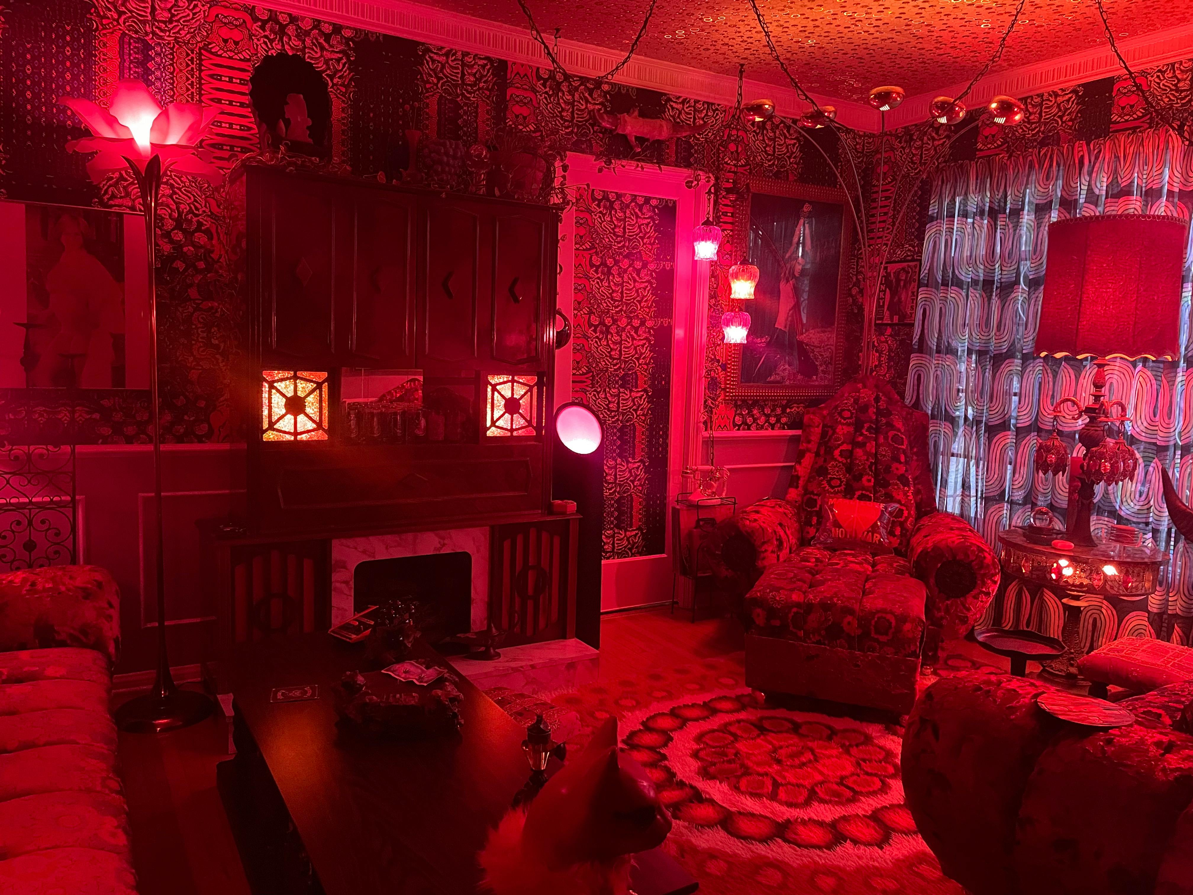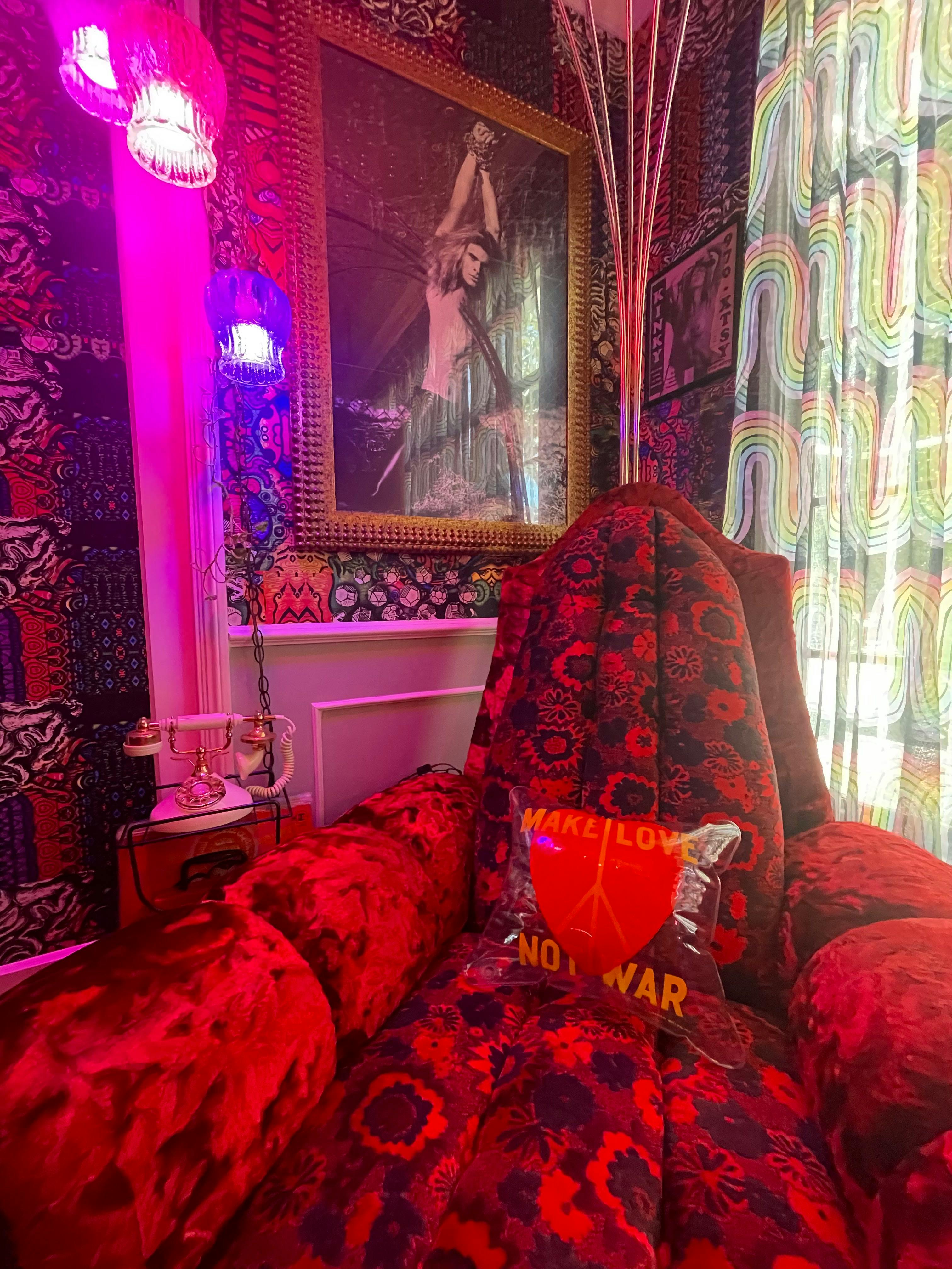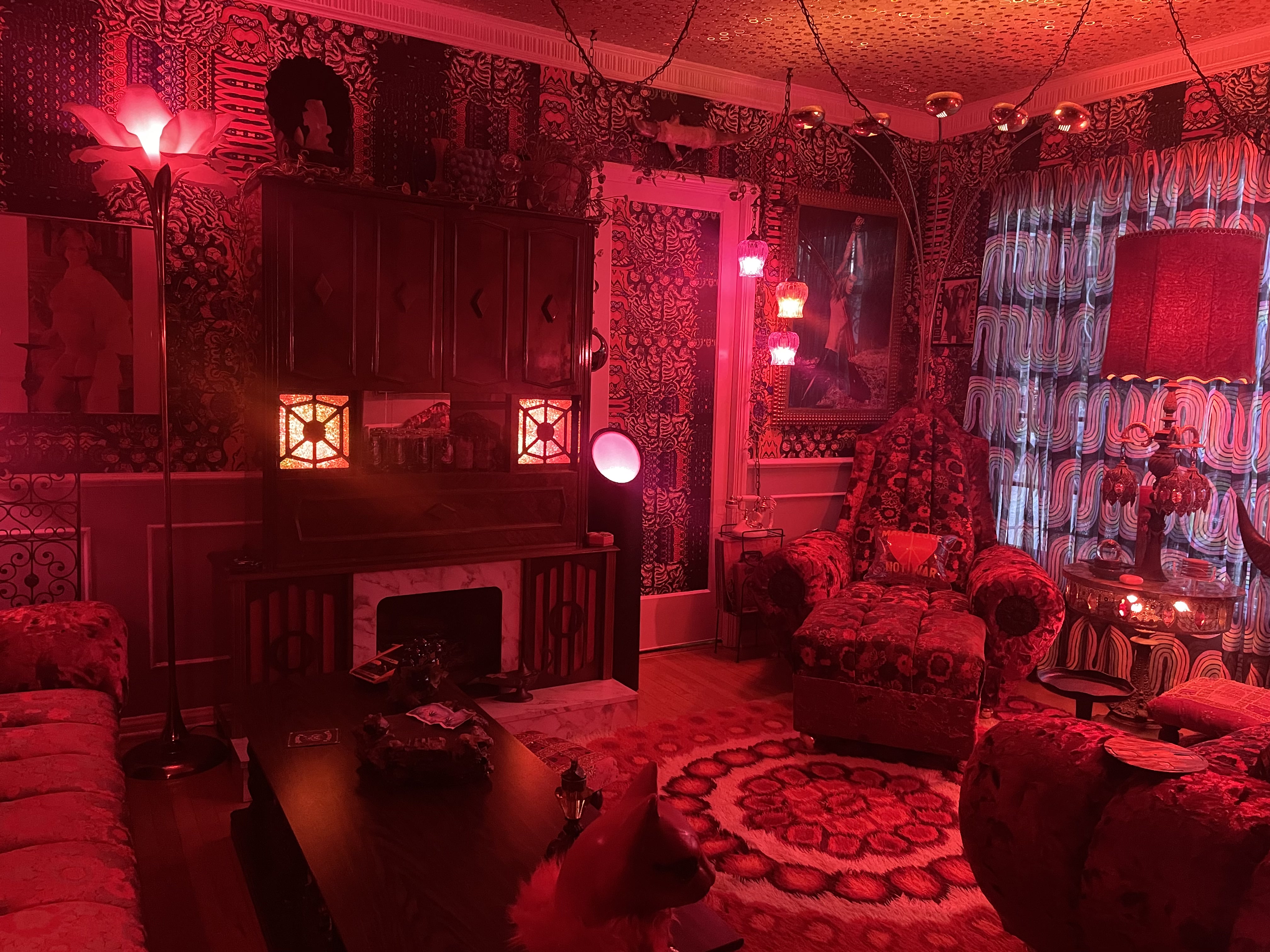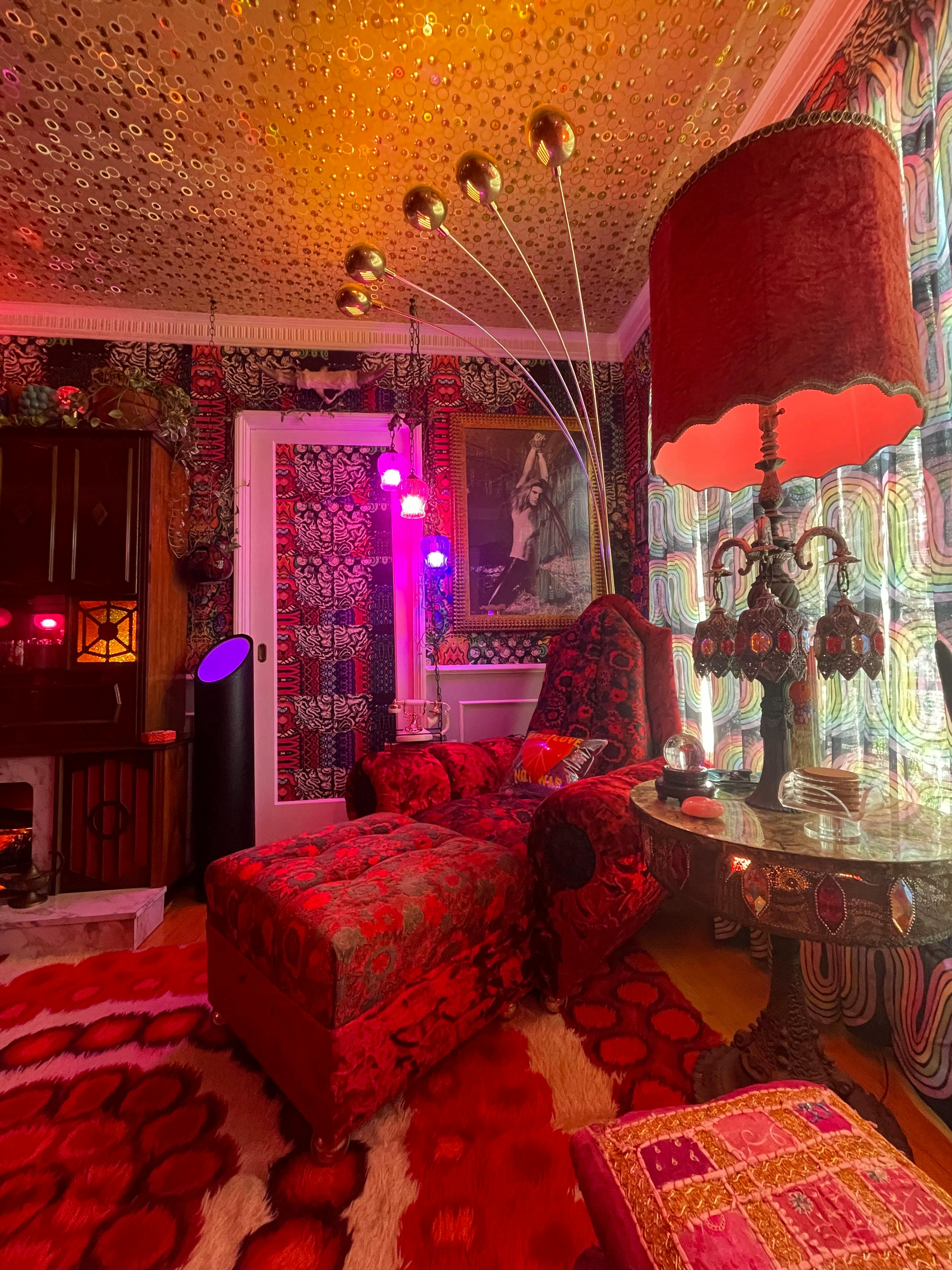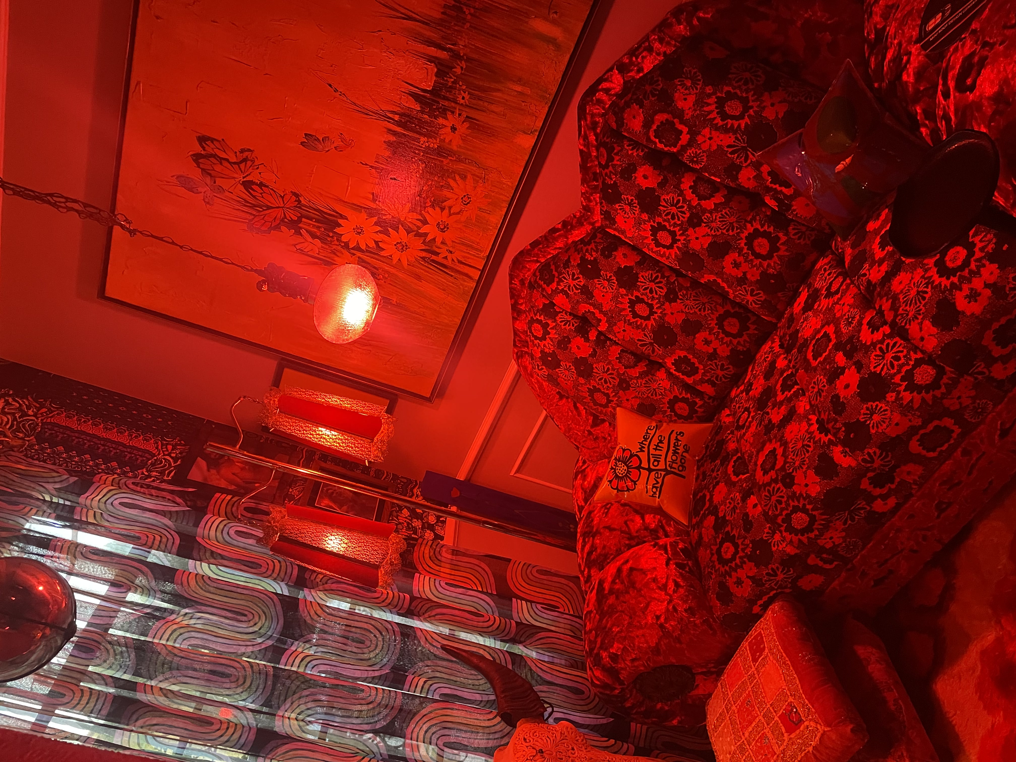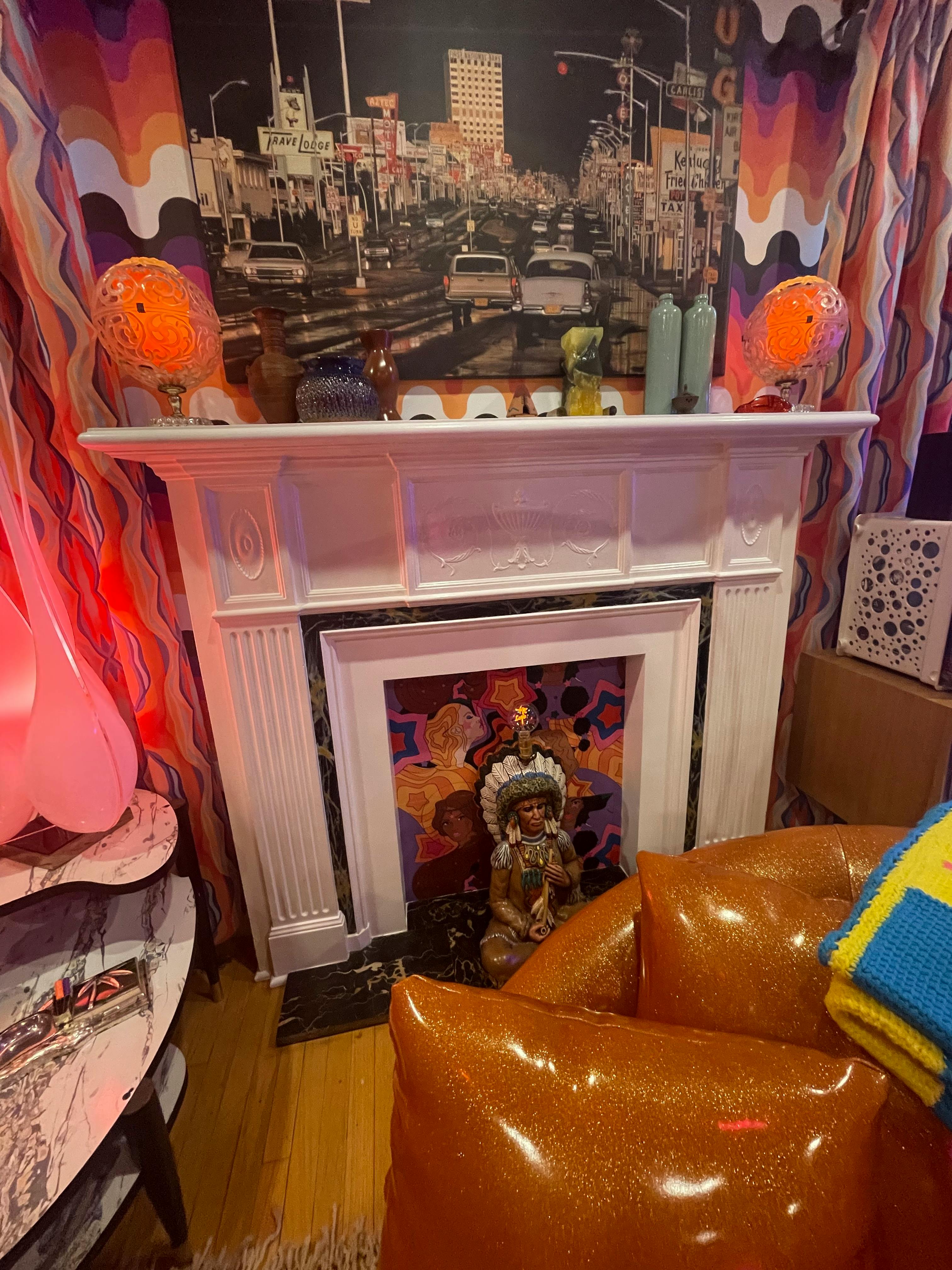 Take a trip to a far-out scene, a total mindblower where the vibes are cool and the karma's clean. A mellow den & way outta sight living space filled with 60s, 70s, icons of the Space Age, MCM, Hollywood Regency, Summer of Love vintage treasures. Photo ops appear at every angle, color-filled with oversized couch sets, lucite, fantasy lighting, erotic art, shagadelic rugs, stereo-bar stocked with a turntable, 8-track player, faux fireplace, blow-up pillows, disco ceiling, glitter & neon vibes.