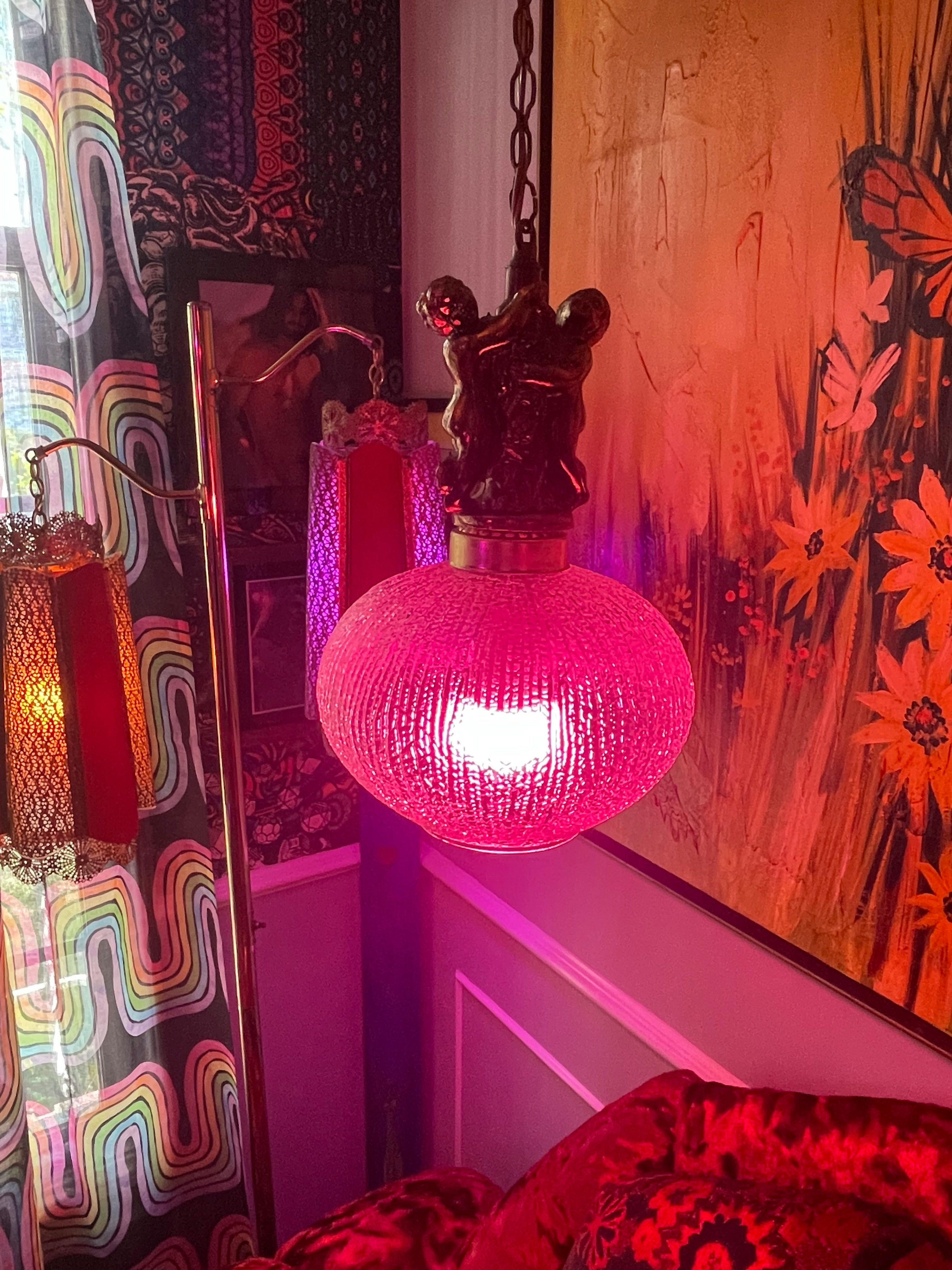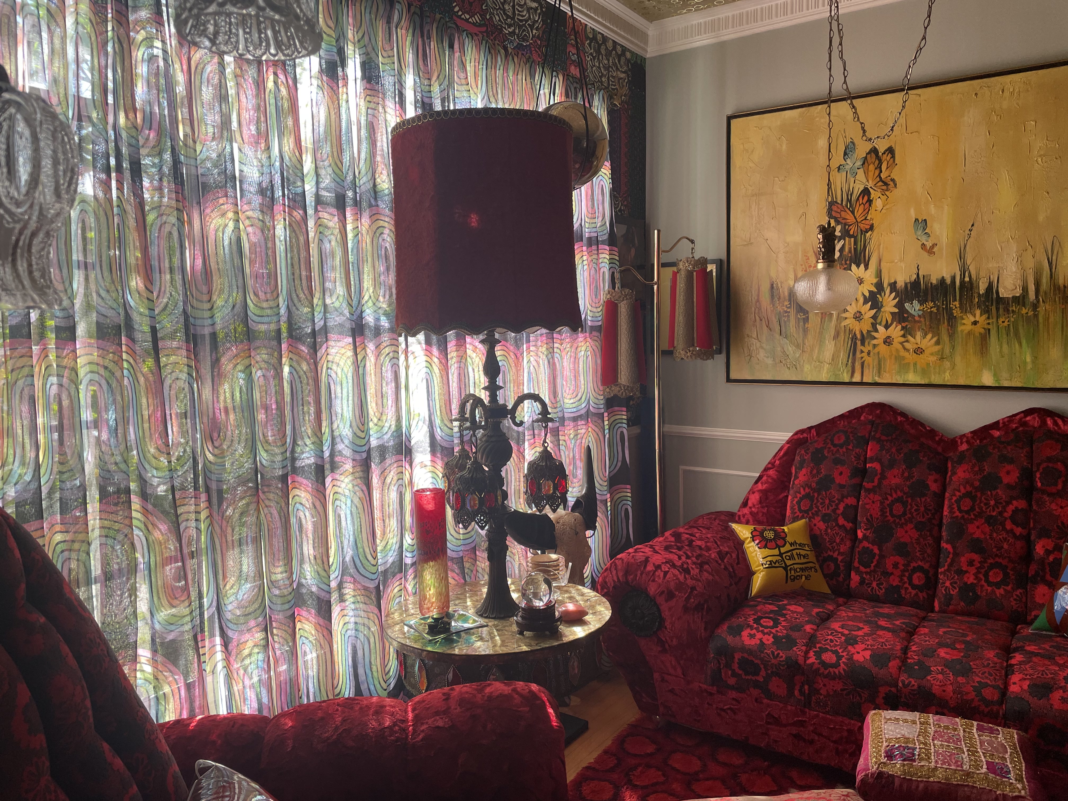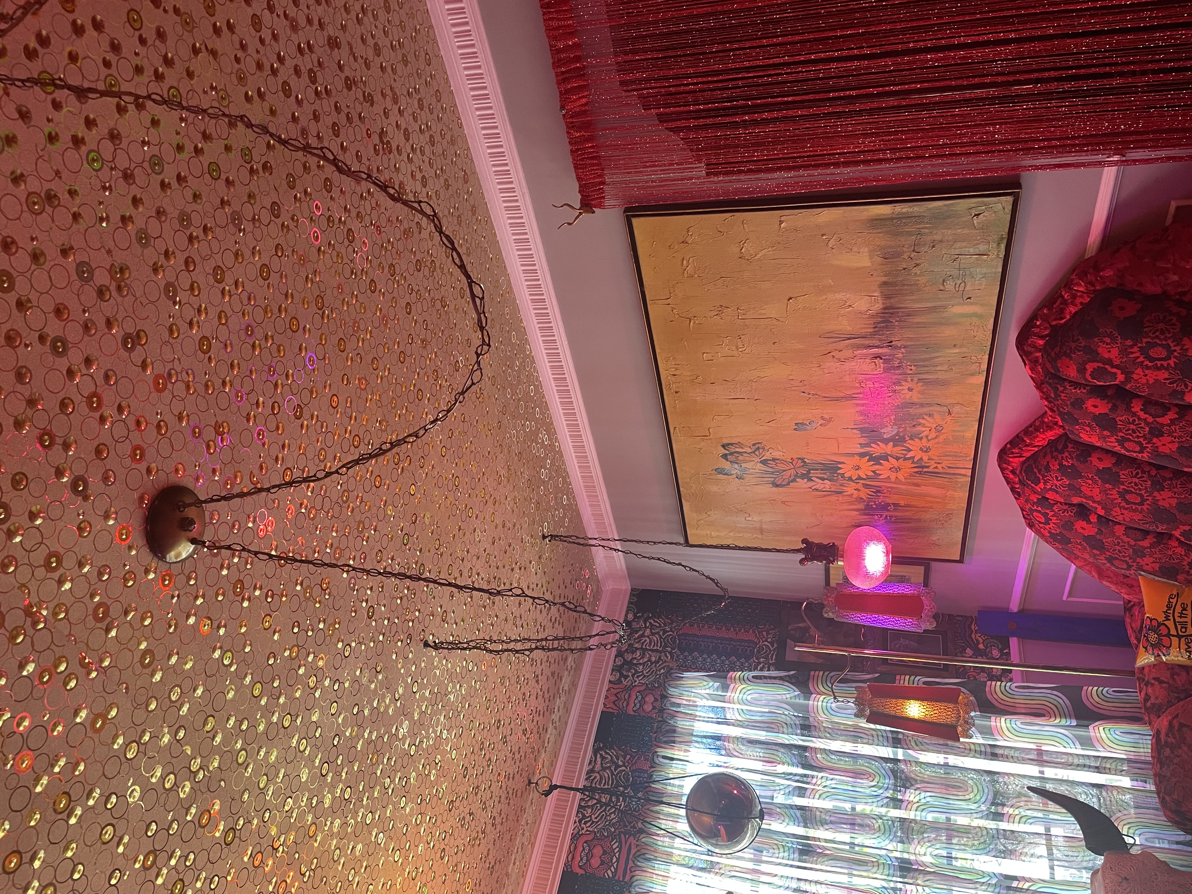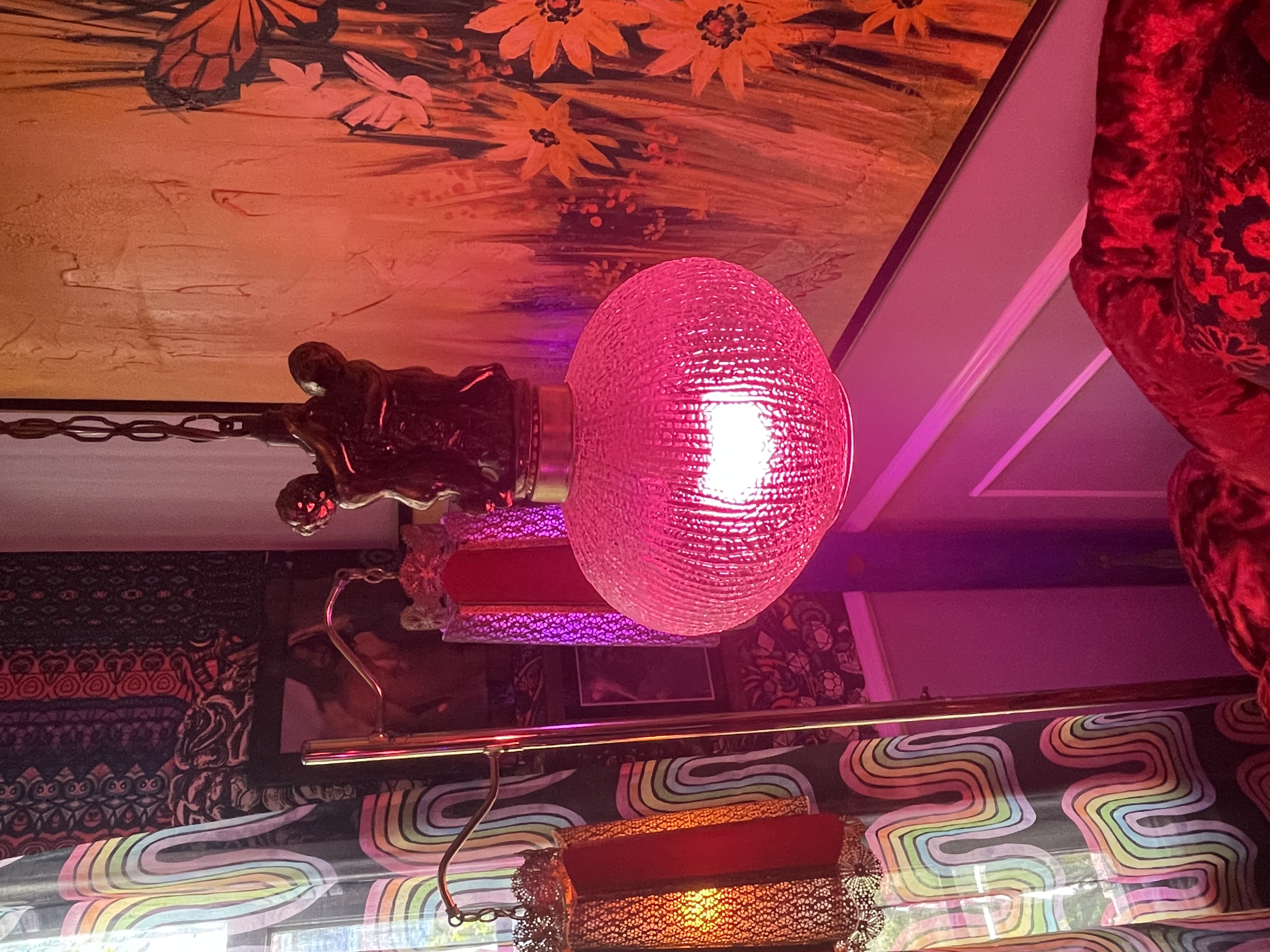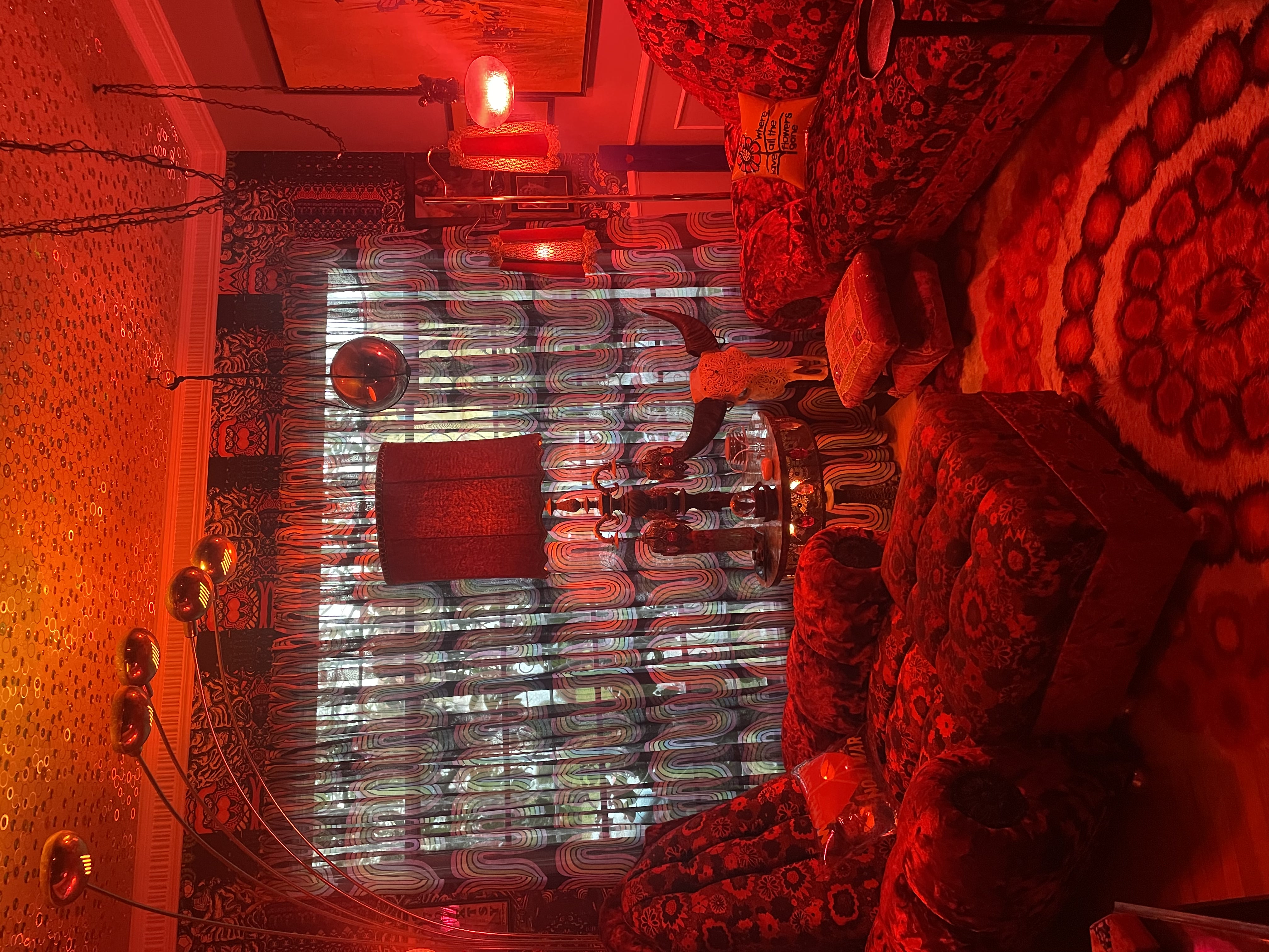 Take a trip to a far-out scene, a total mindblower where the vibes are cool and the karma's clean. A mellow den & way outta sight living space filled with 60s, 70s, icons of the Space Age, MCM, Hollywood Regency, Summer of Love vintage treasures. Photo ops appear at every angle, color-filled with oversized couch sets, lucite, fantasy lighting, erotic art, shagadelic rugs, stereo-bar stocked with a turntable, 8-track player, faux fireplace, blow-up pillows, disco ceiling, glitter & neon vibes.