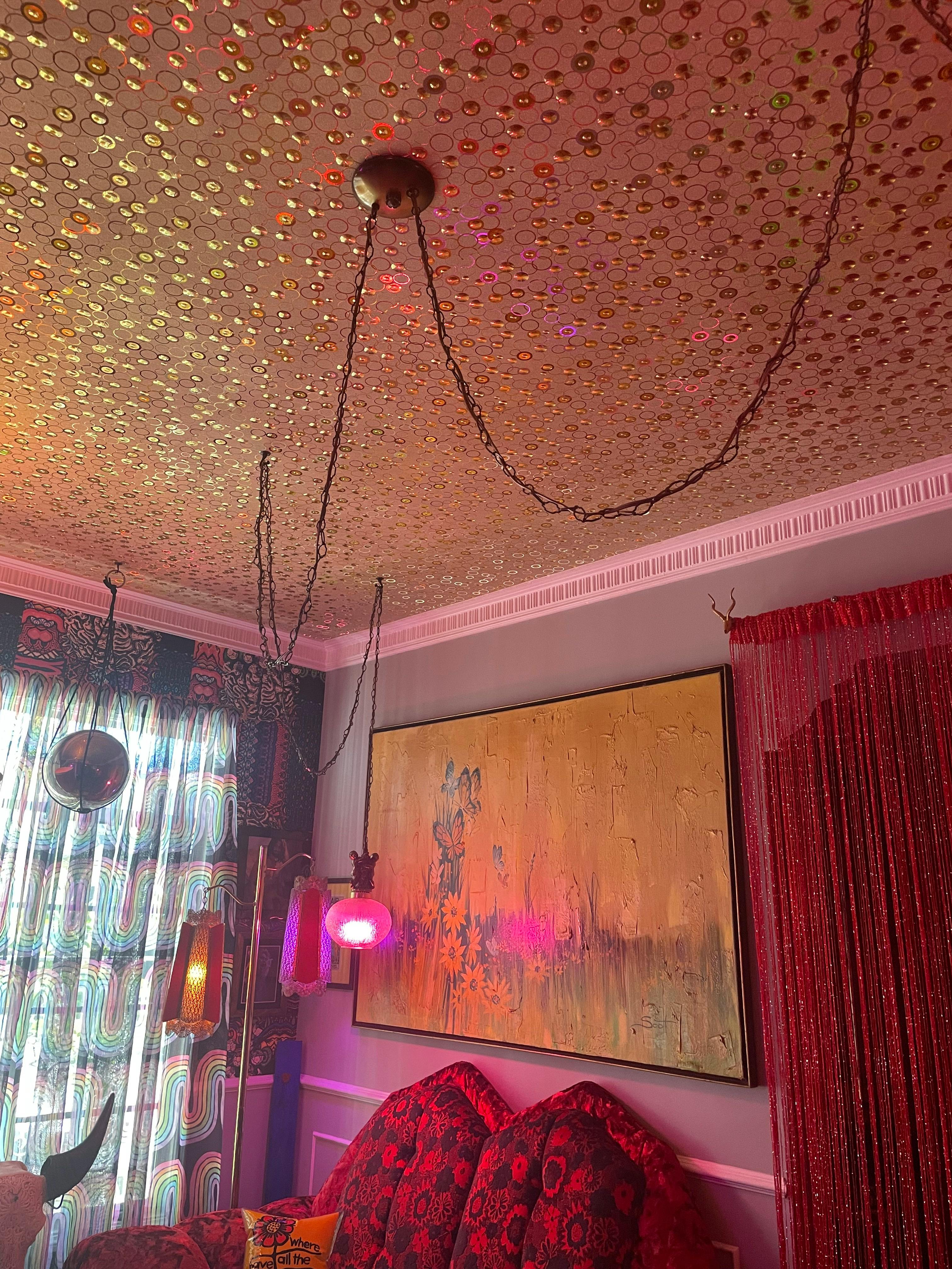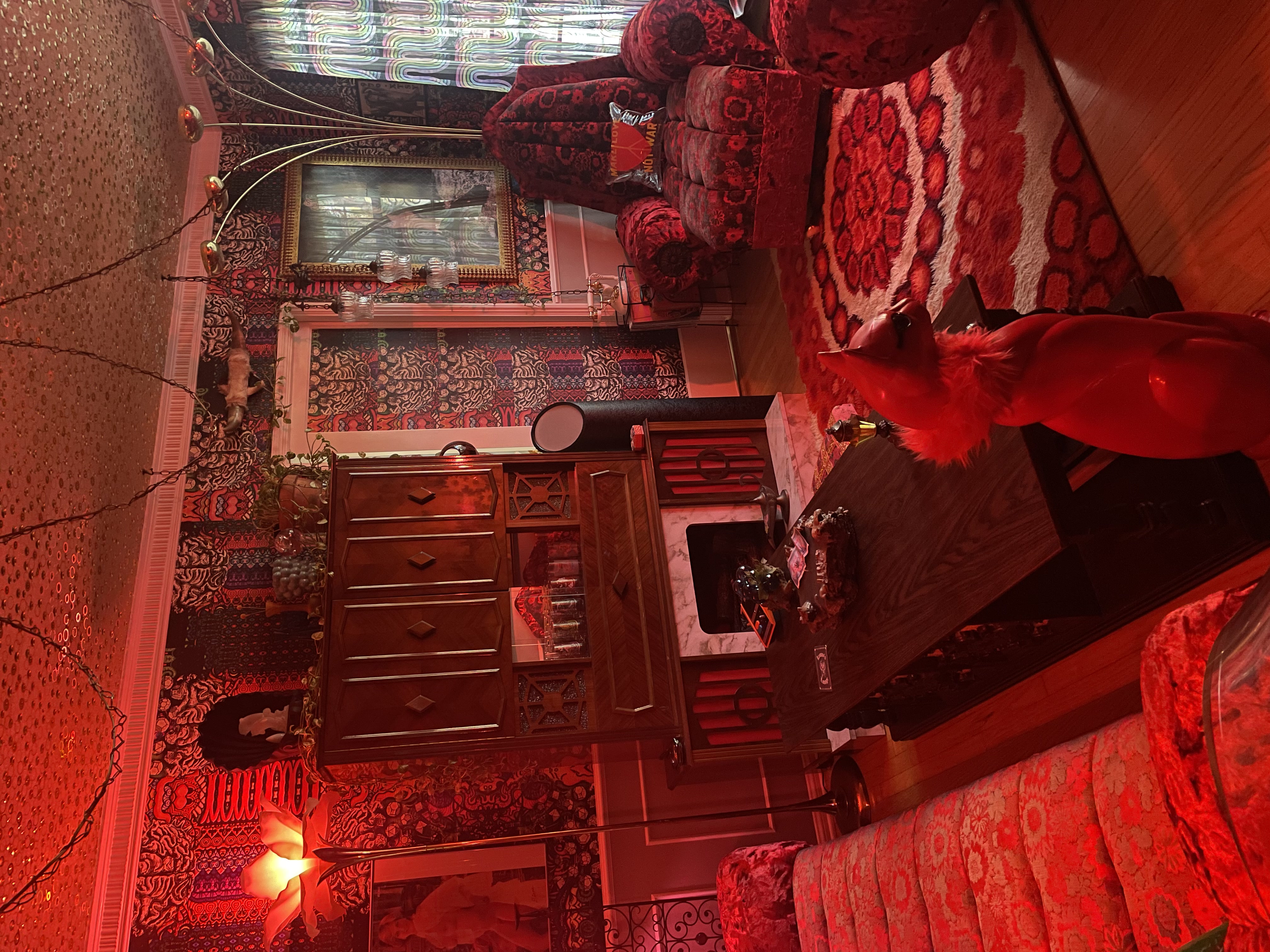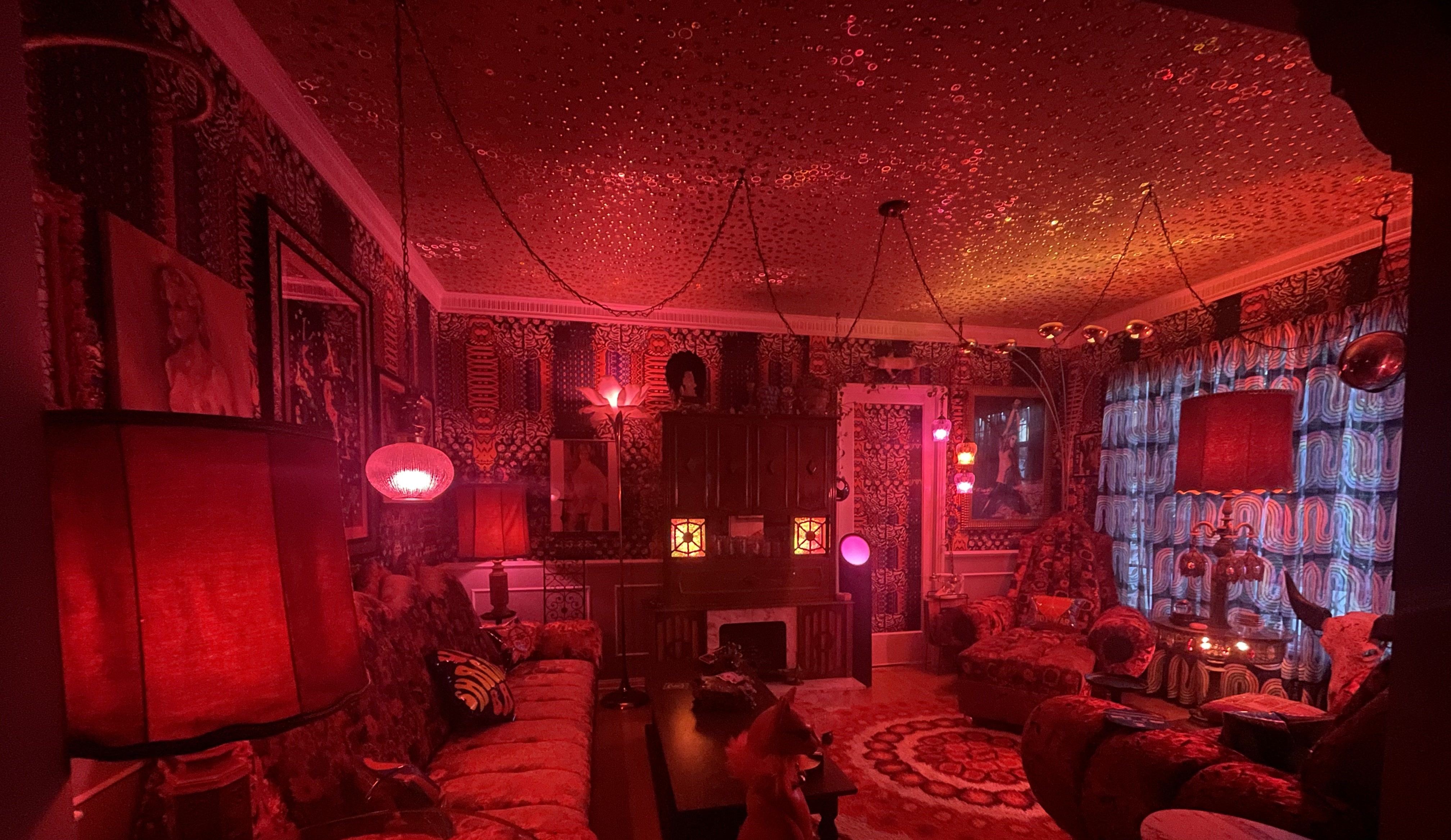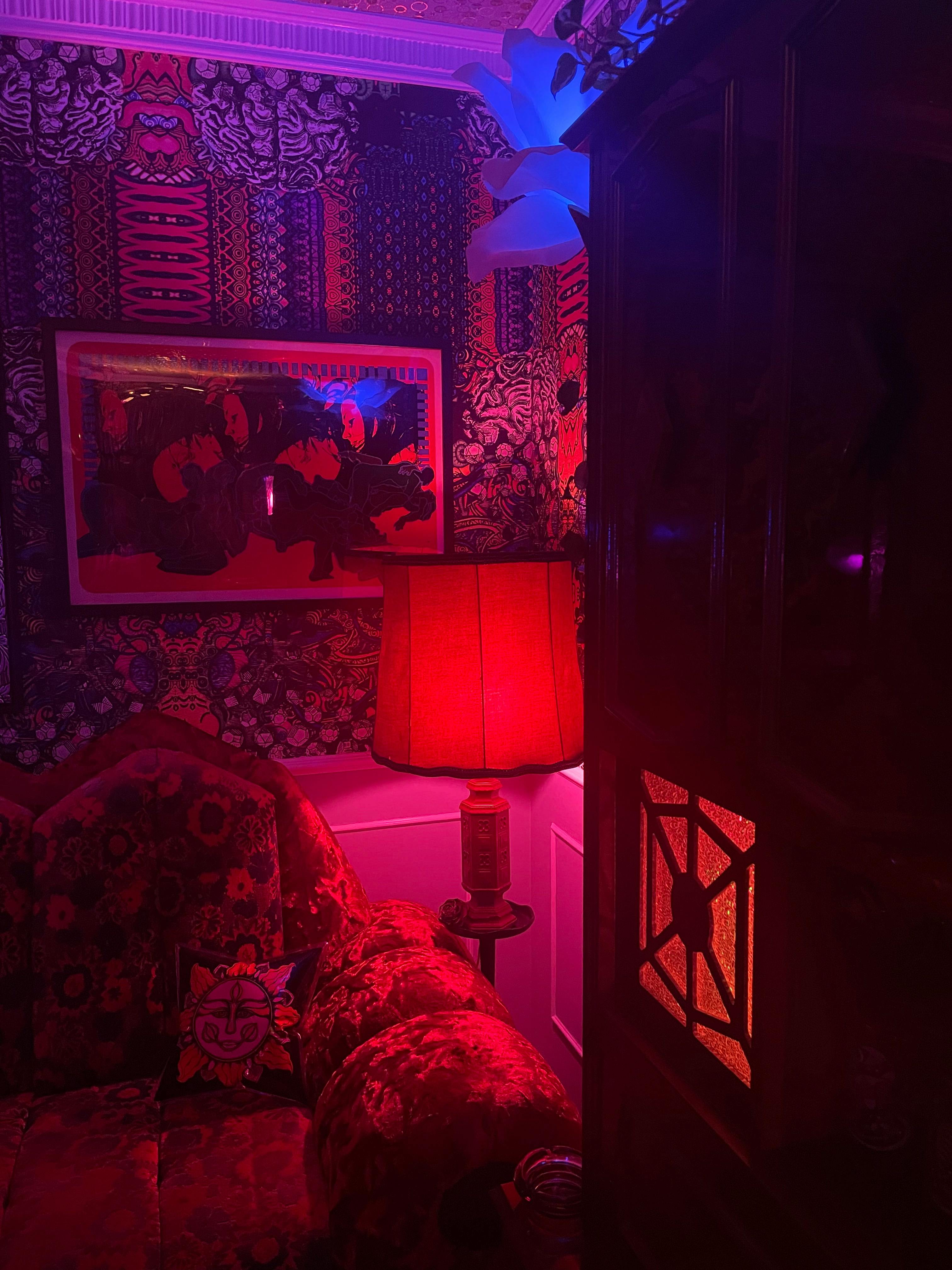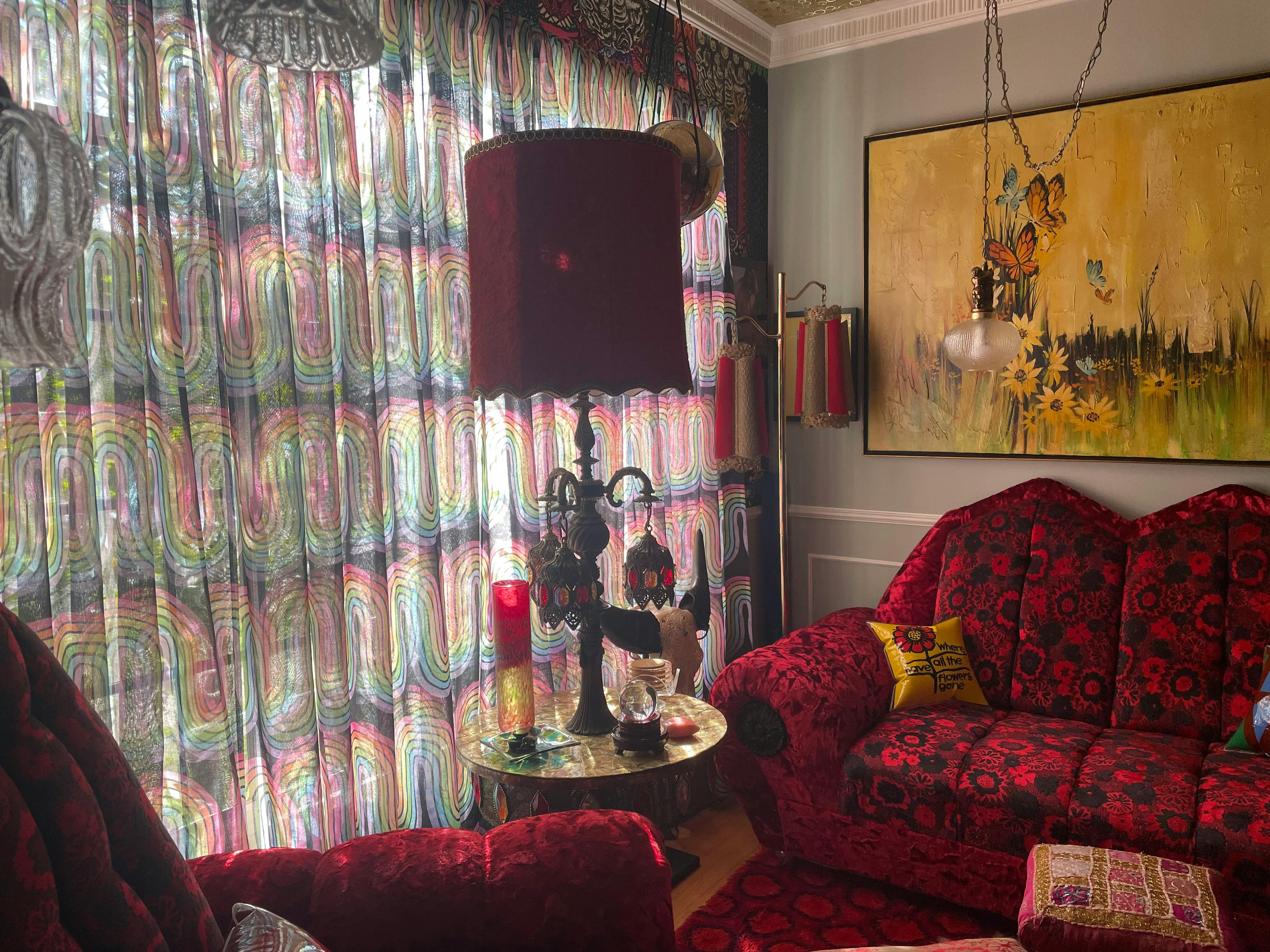 Take a trip to a far-out scene, a total mindblower where the vibes are cool and the karma's clean. A mellow den & way outta sight living space filled with 60s, 70s, icons of the Space Age, MCM, Hollywood Regency, Summer of Love vintage treasures. Photo ops appear at every angle, color-filled with oversized couch sets, lucite, fantasy lighting, erotic art, shagadelic rugs, stereo-bar stocked with a turntable, 8-track player, faux fireplace, blow-up pillows, disco ceiling, glitter & neon vibes.