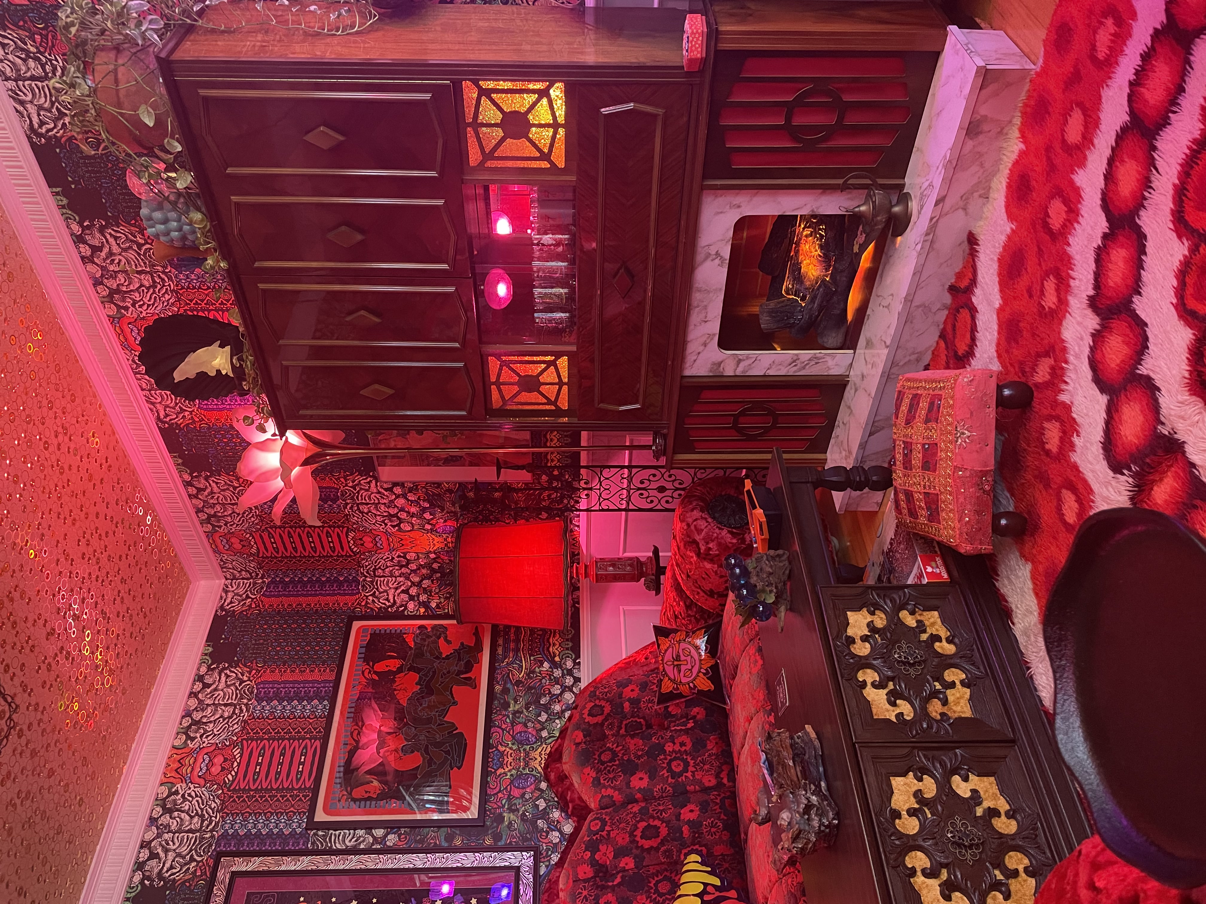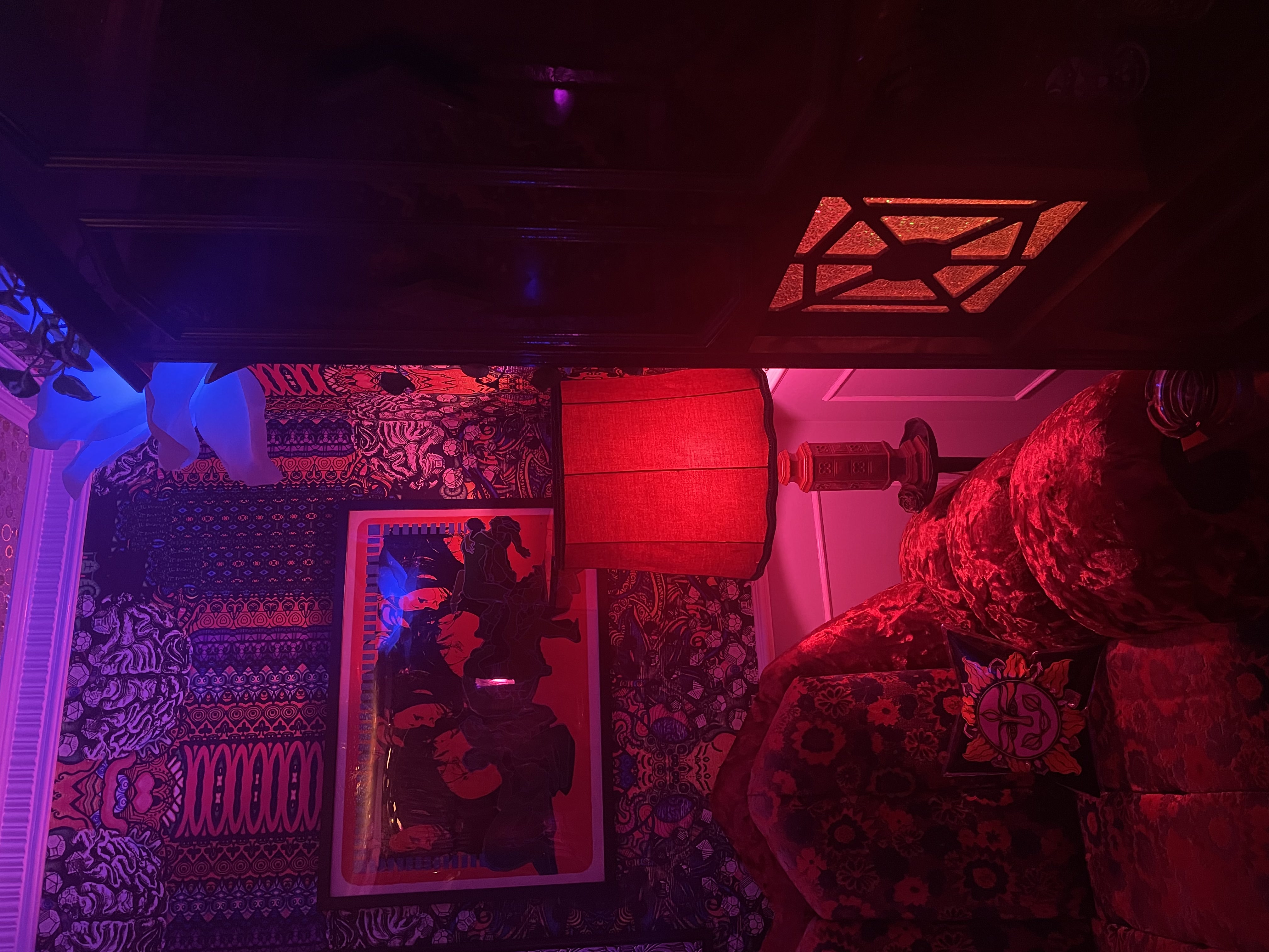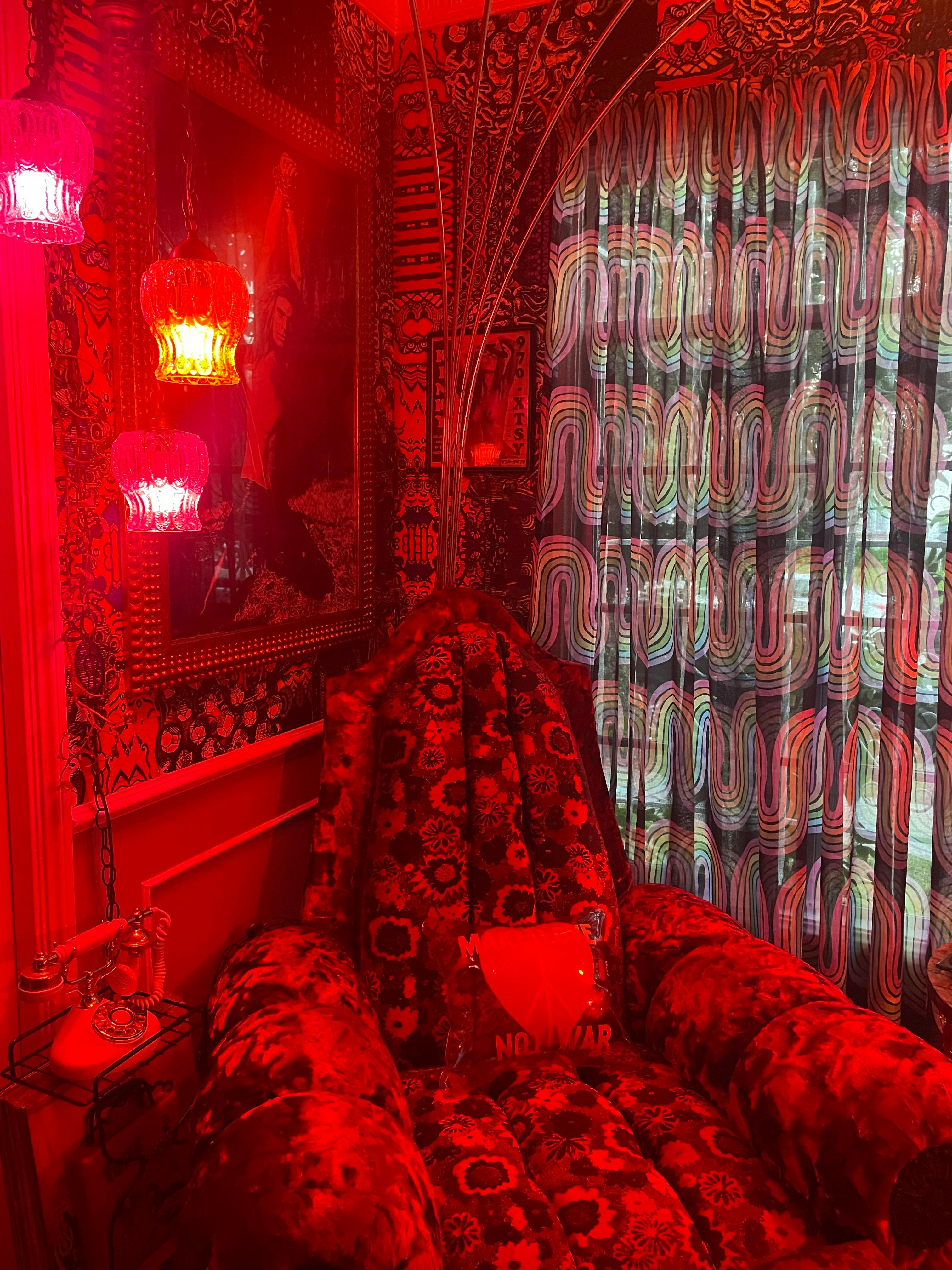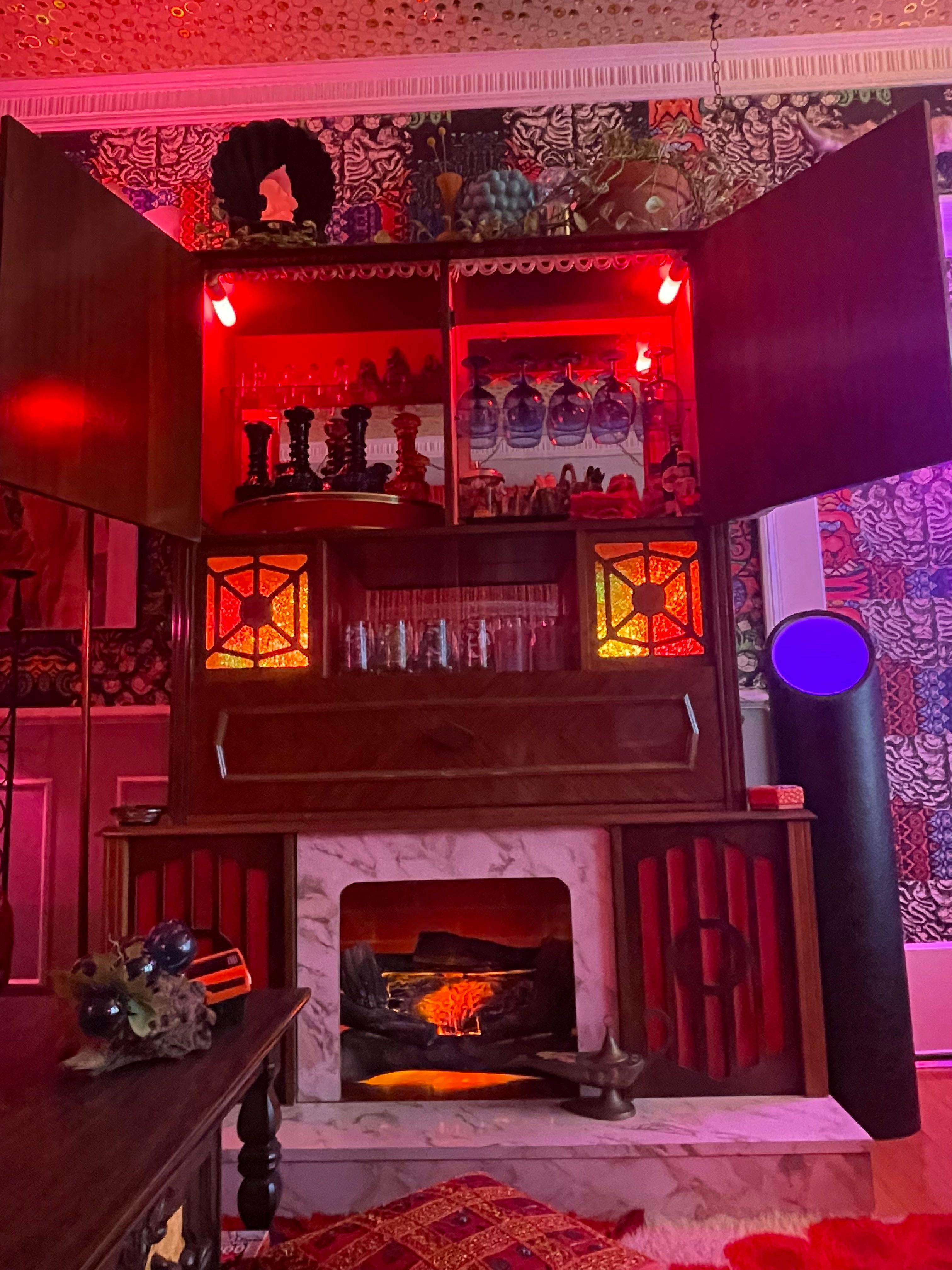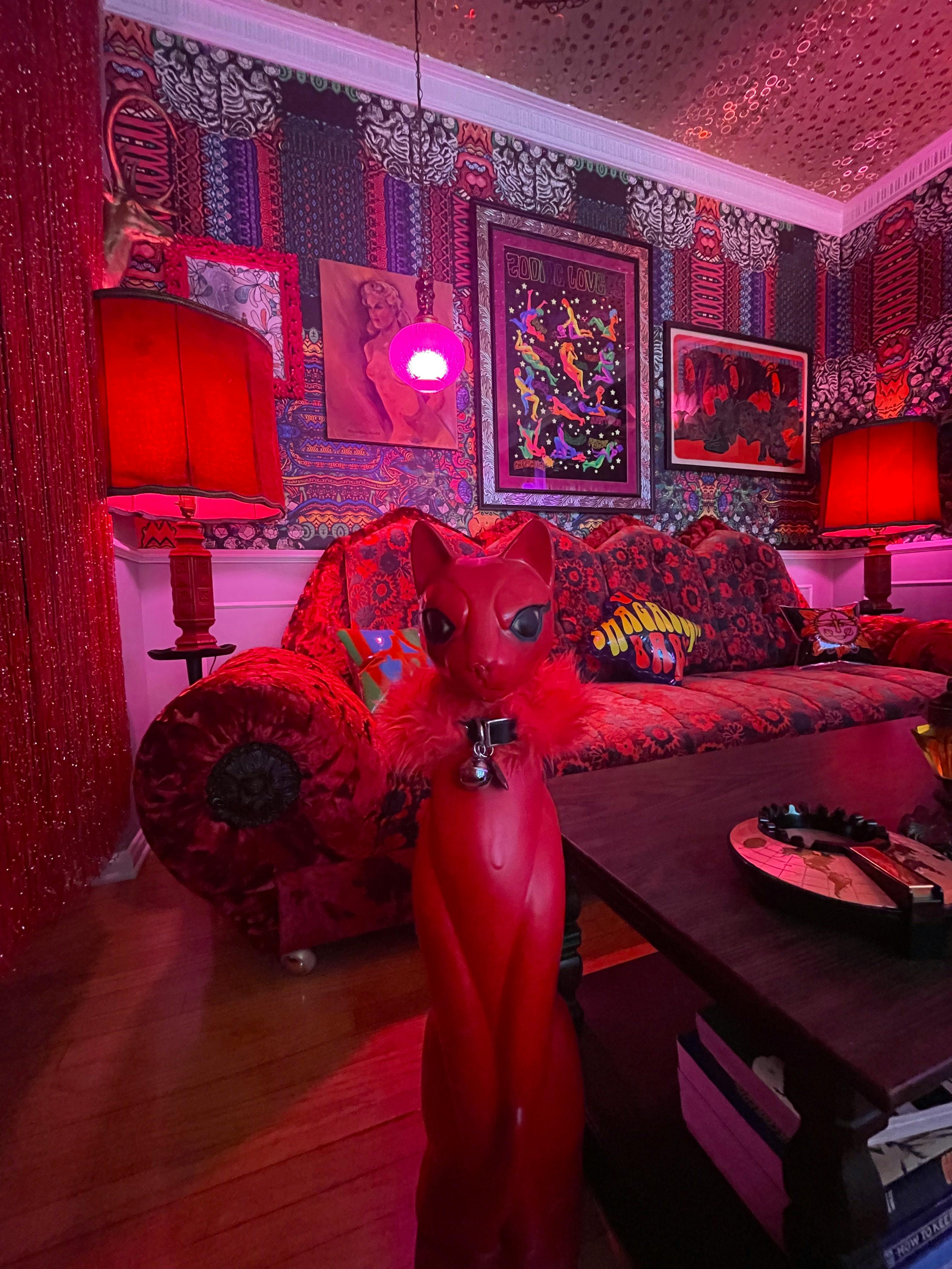 Take a trip to a far-out scene, a total mindblower where the vibes are cool and the karma's clean. A mellow den & way outta sight living space filled with 60s, 70s, icons of the Space Age, MCM, Hollywood Regency, Summer of Love vintage treasures. Photo ops appear at every angle, color-filled with oversized couch sets, lucite, fantasy lighting, erotic art, shagadelic rugs, stereo-bar stocked with a turntable, 8-track player, faux fireplace, blow-up pillows, disco ceiling, glitter & neon vibes.