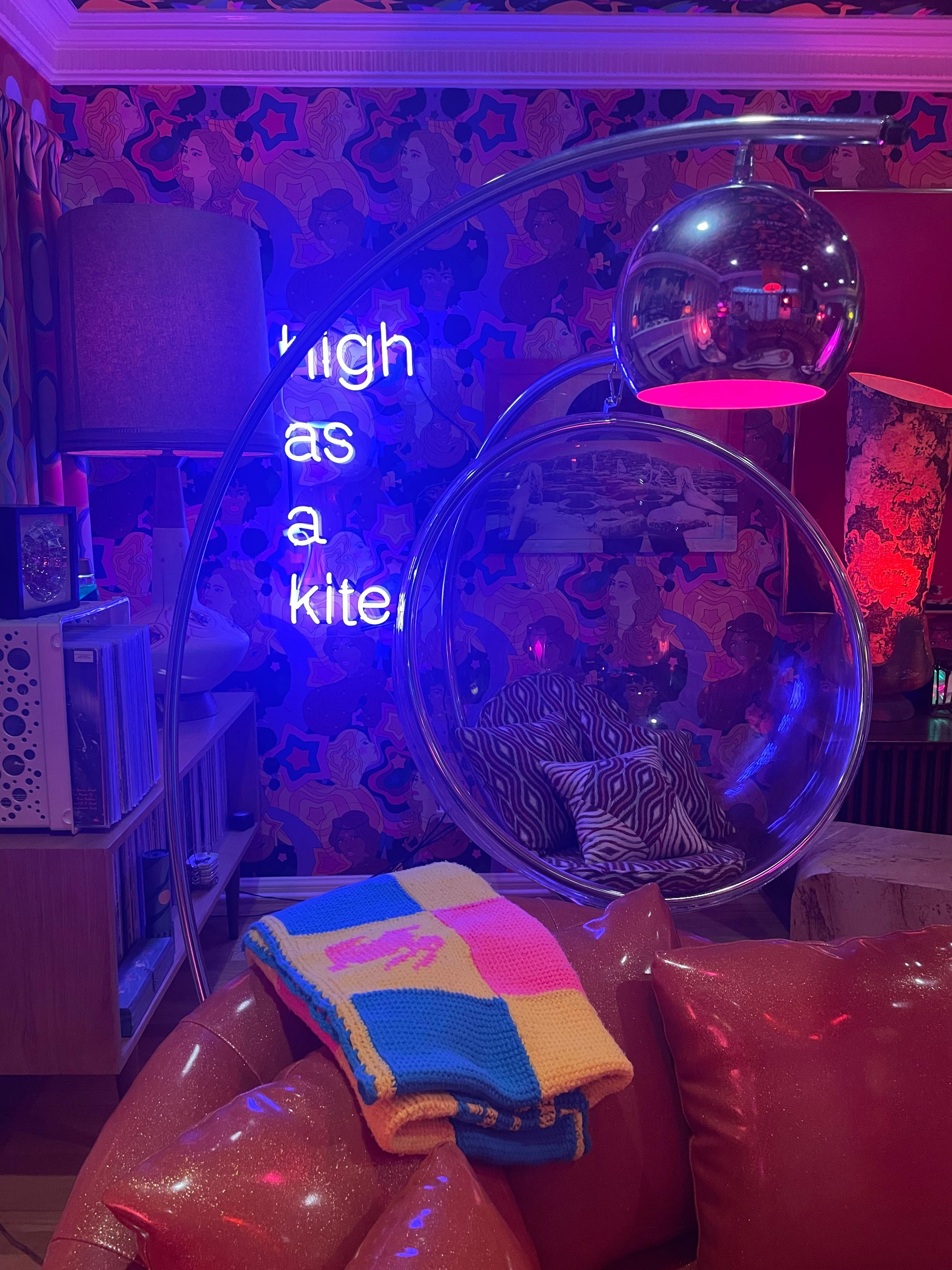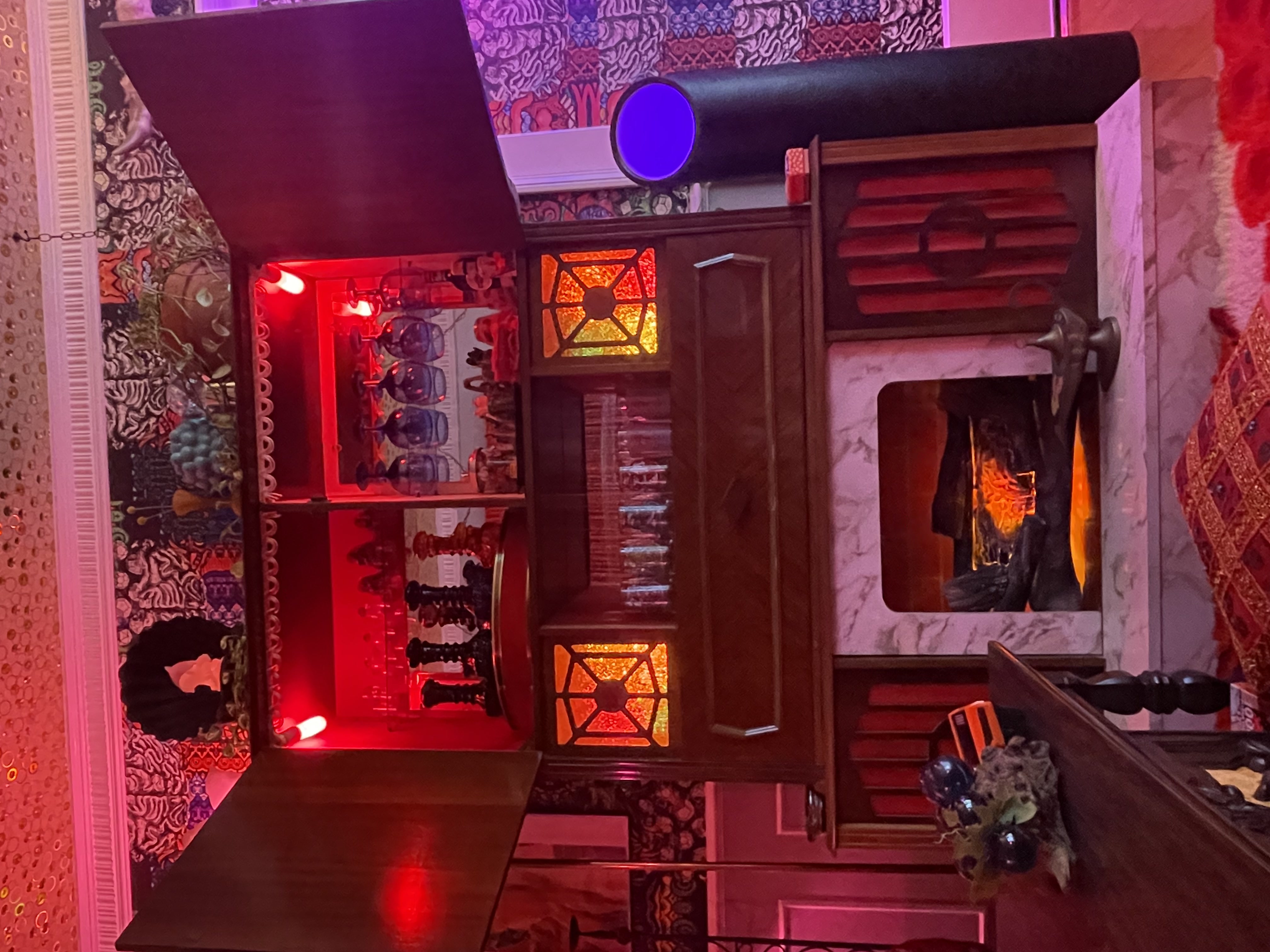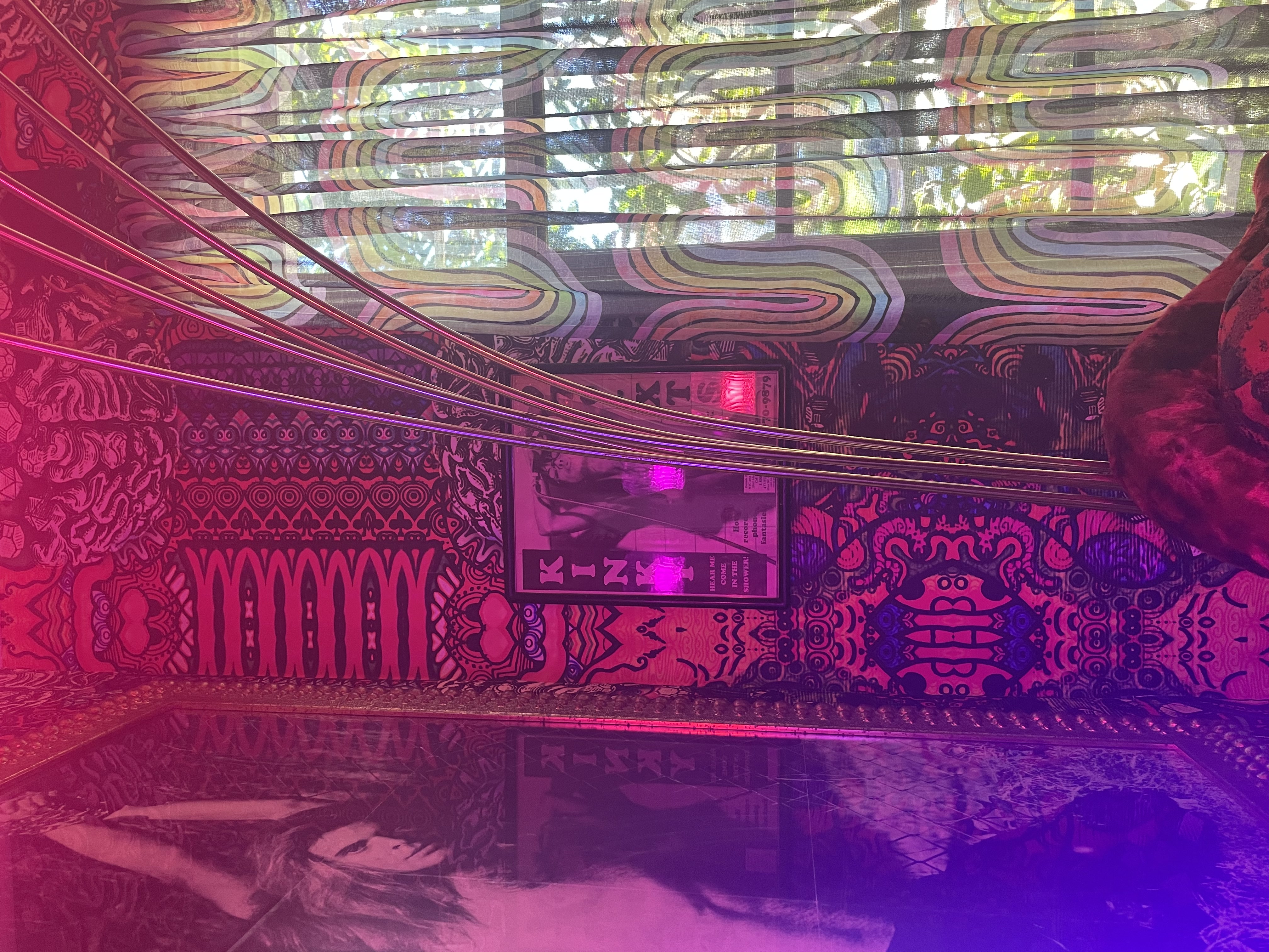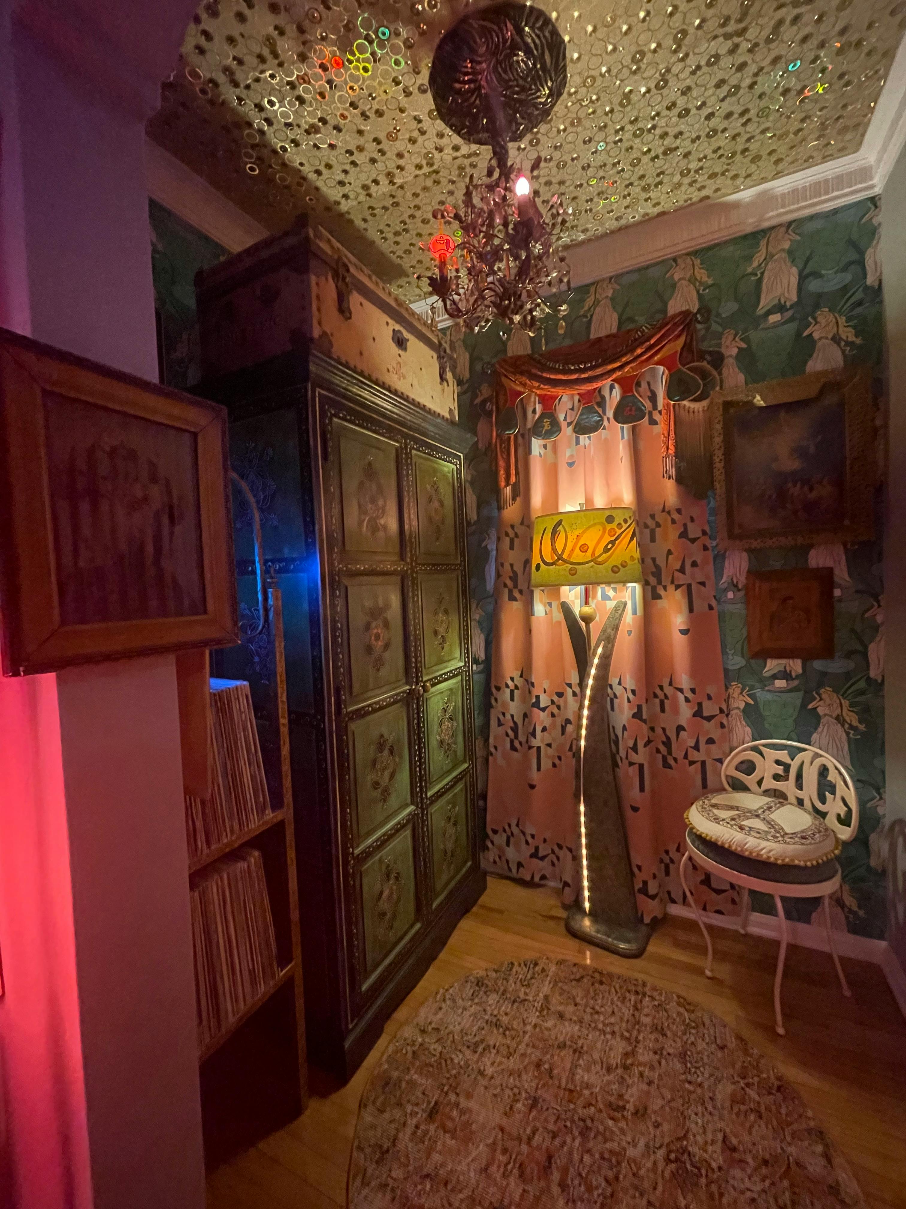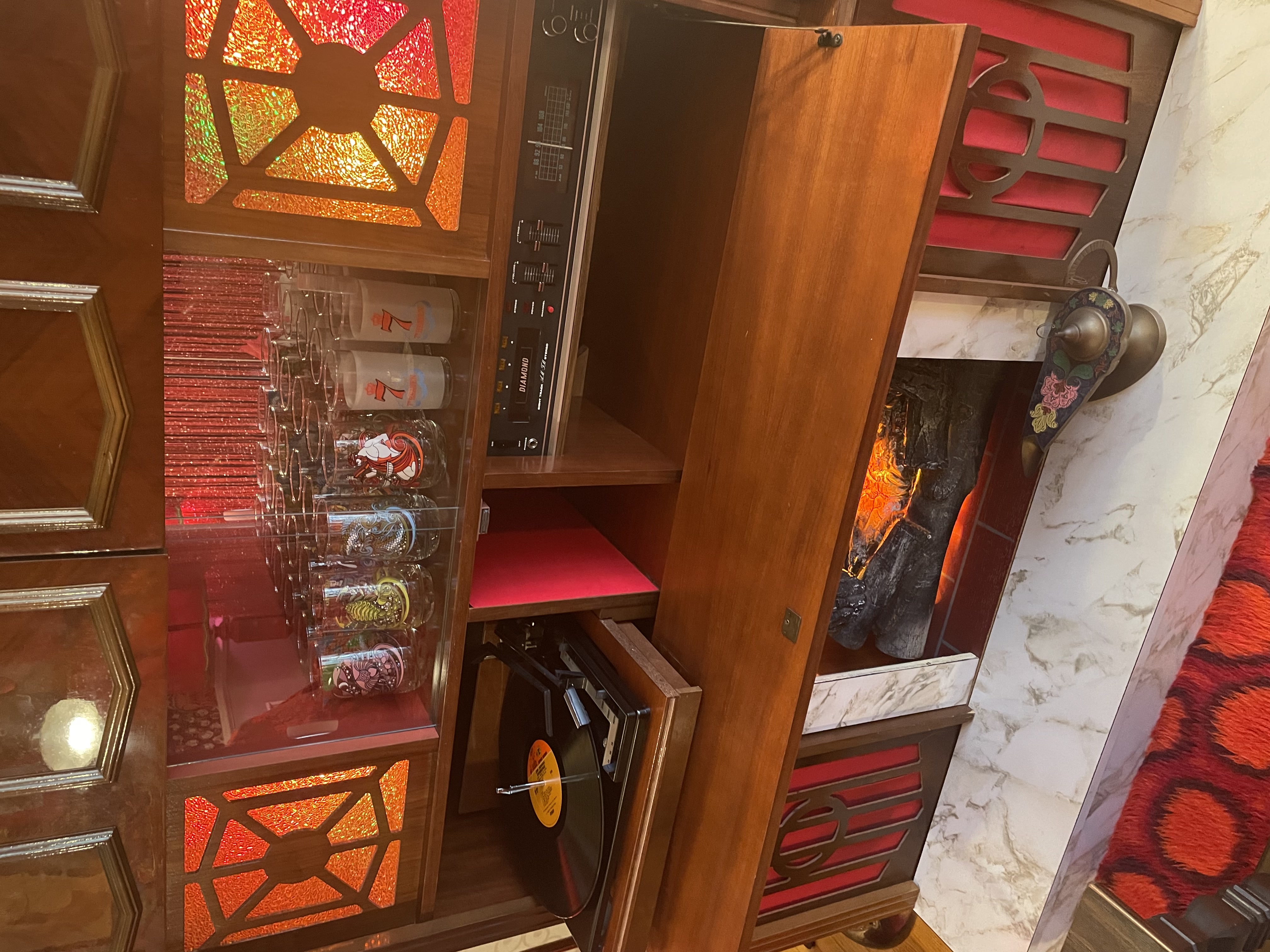 Take a trip to a far-out scene, a total mindblower where the vibes are cool and the karma's clean. A mellow den & way outta sight living space filled with 60s, 70s, icons of the Space Age, MCM, Hollywood Regency, Summer of Love vintage treasures. Photo ops appear at every angle, color-filled with oversized couch sets, lucite, fantasy lighting, erotic art, shagadelic rugs, stereo-bar stocked with a turntable, 8-track player, faux fireplace, blow-up pillows, disco ceiling, glitter & neon vibes.