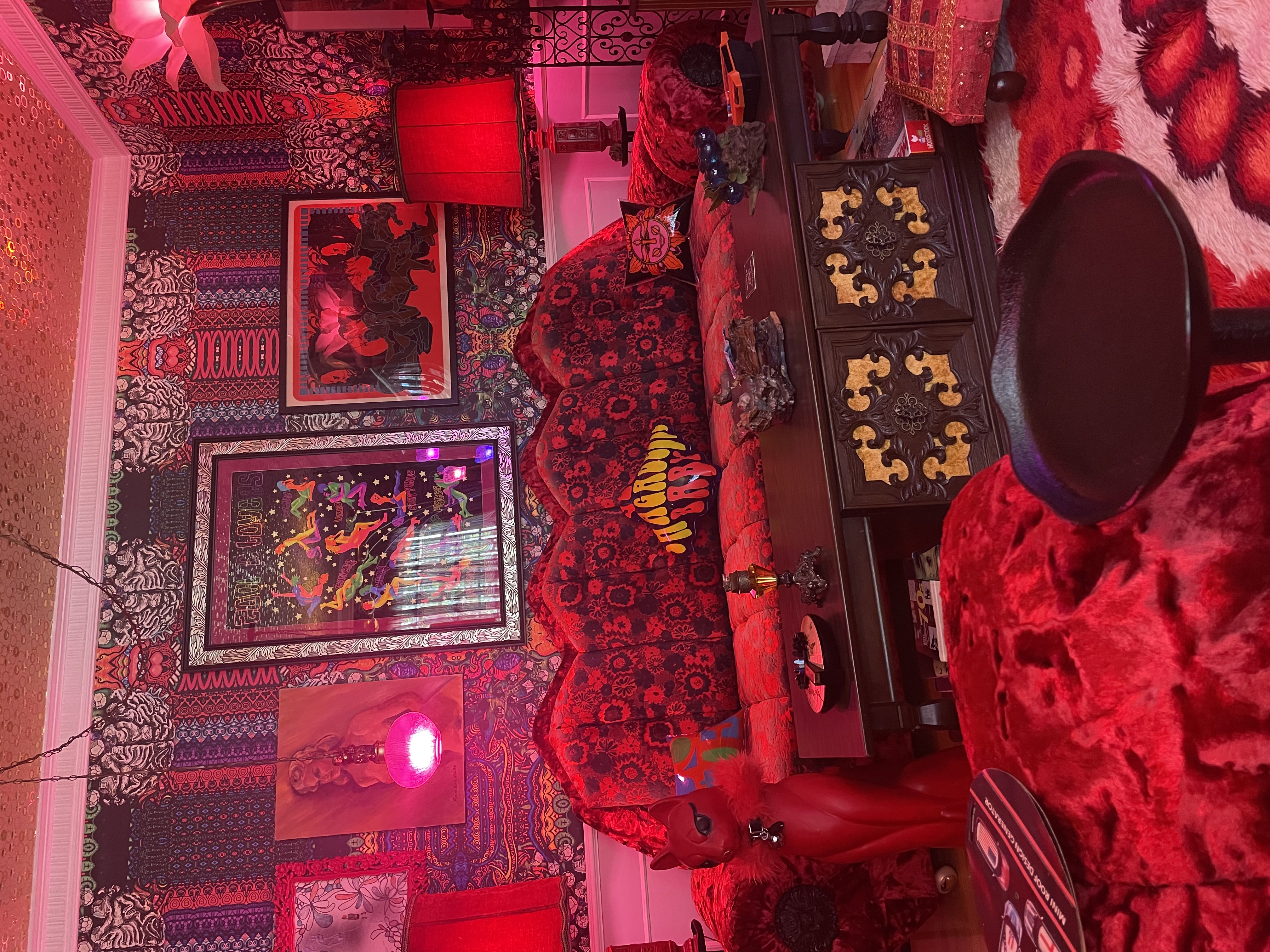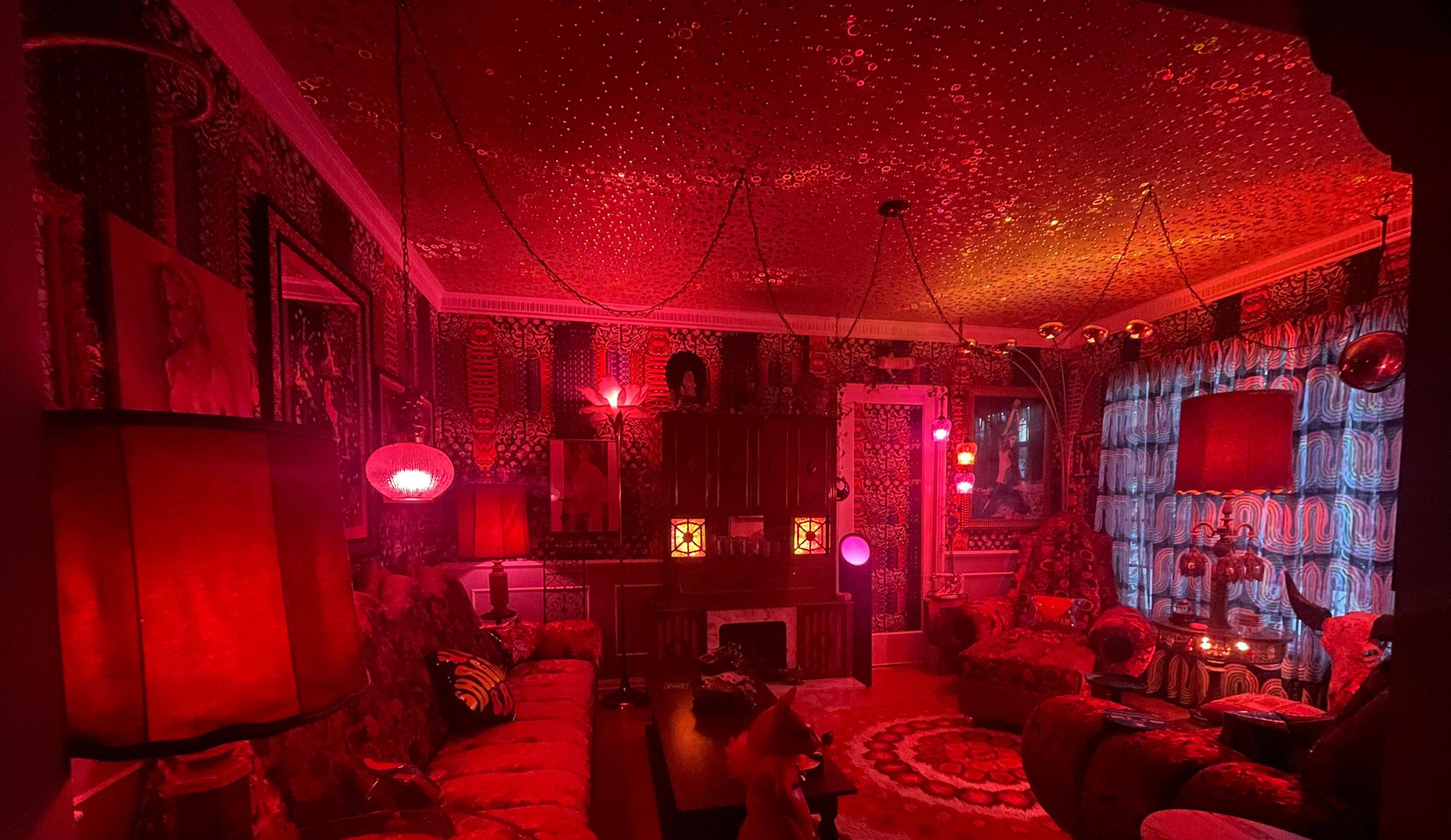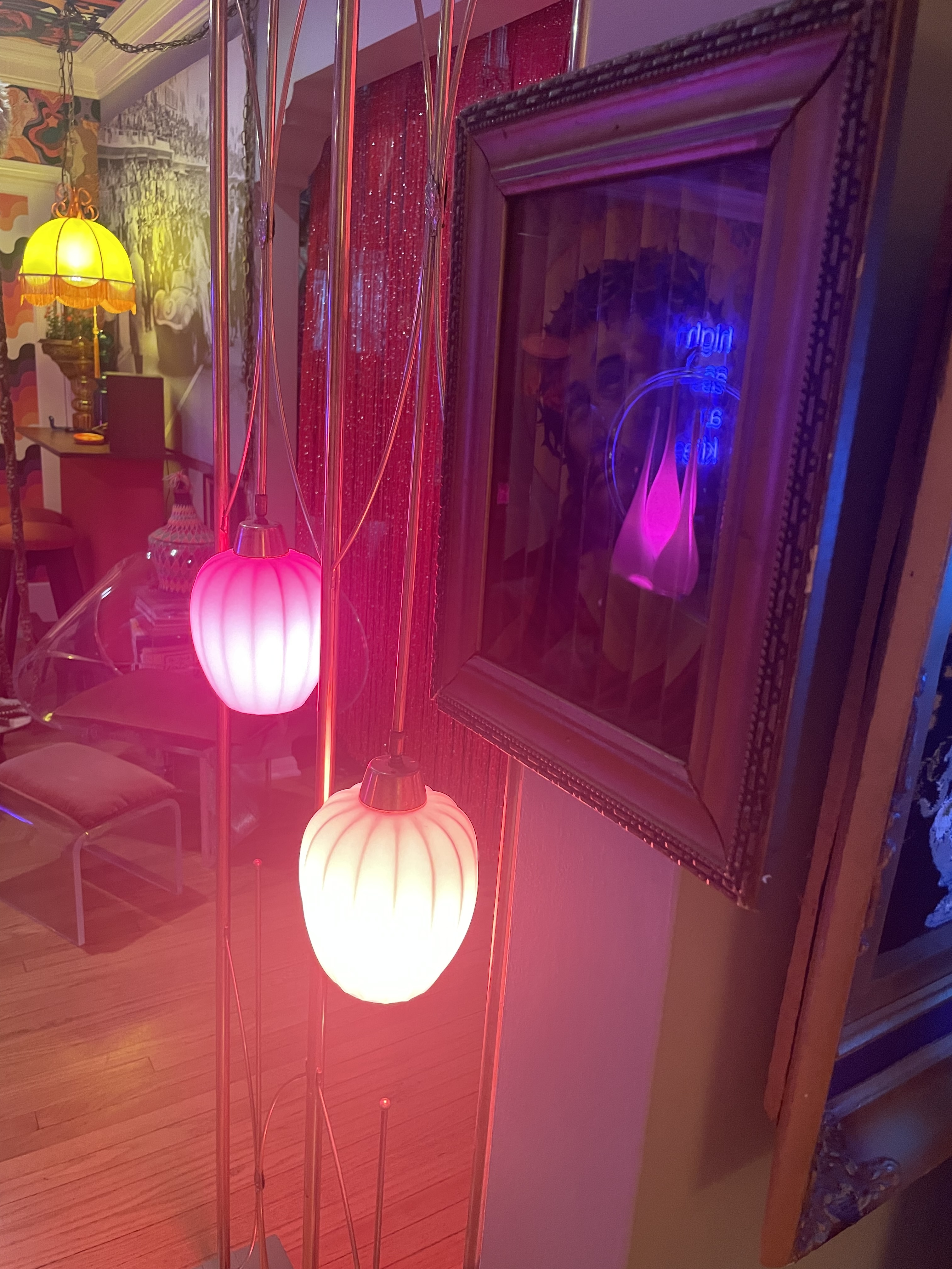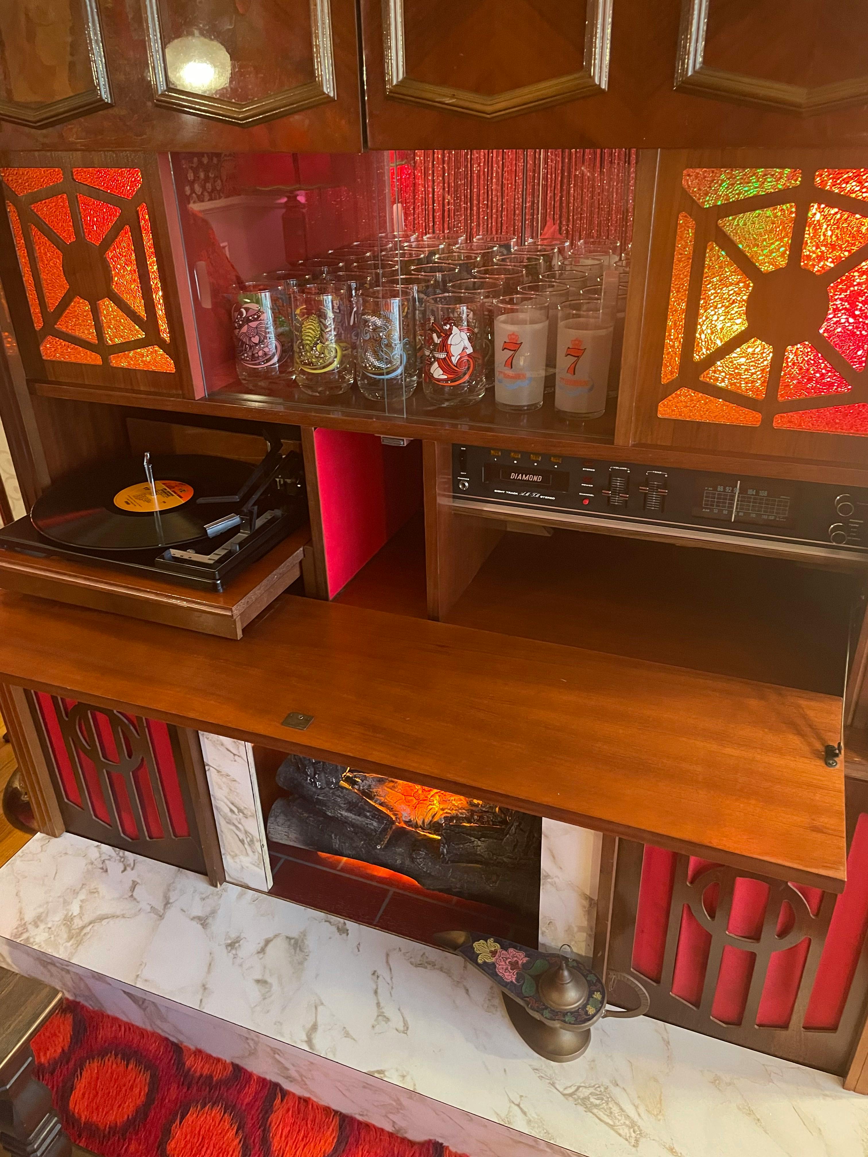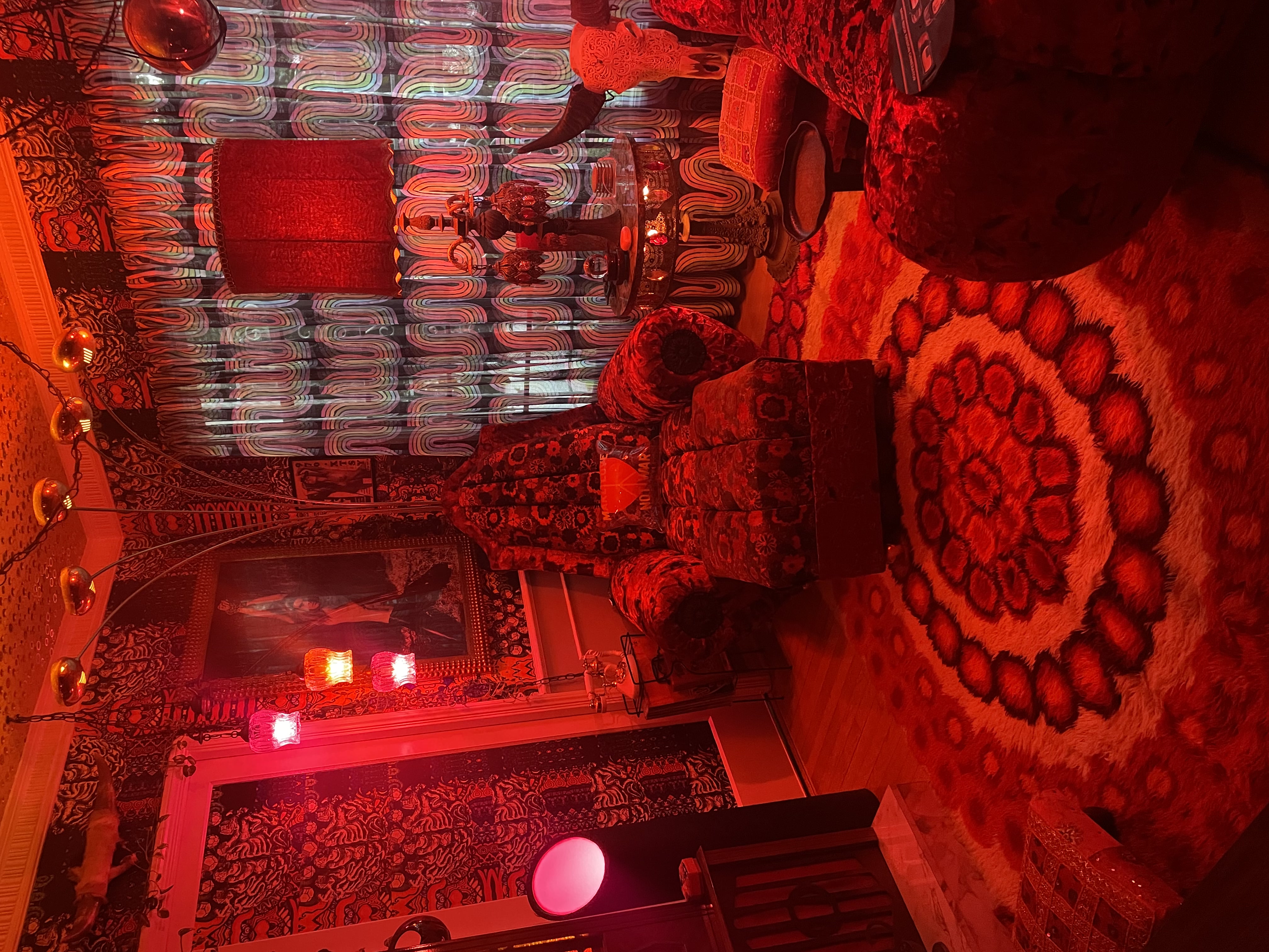 Take a trip to a far-out scene, a total mindblower where the vibes are cool and the karma's clean. A mellow den & way outta sight living space filled with 60s, 70s, icons of the Space Age, MCM, Hollywood Regency, Summer of Love vintage treasures. Photo ops appear at every angle, color-filled with oversized couch sets, lucite, fantasy lighting, erotic art, shagadelic rugs, stereo-bar stocked with a turntable, 8-track player, faux fireplace, blow-up pillows, disco ceiling, glitter & neon vibes.