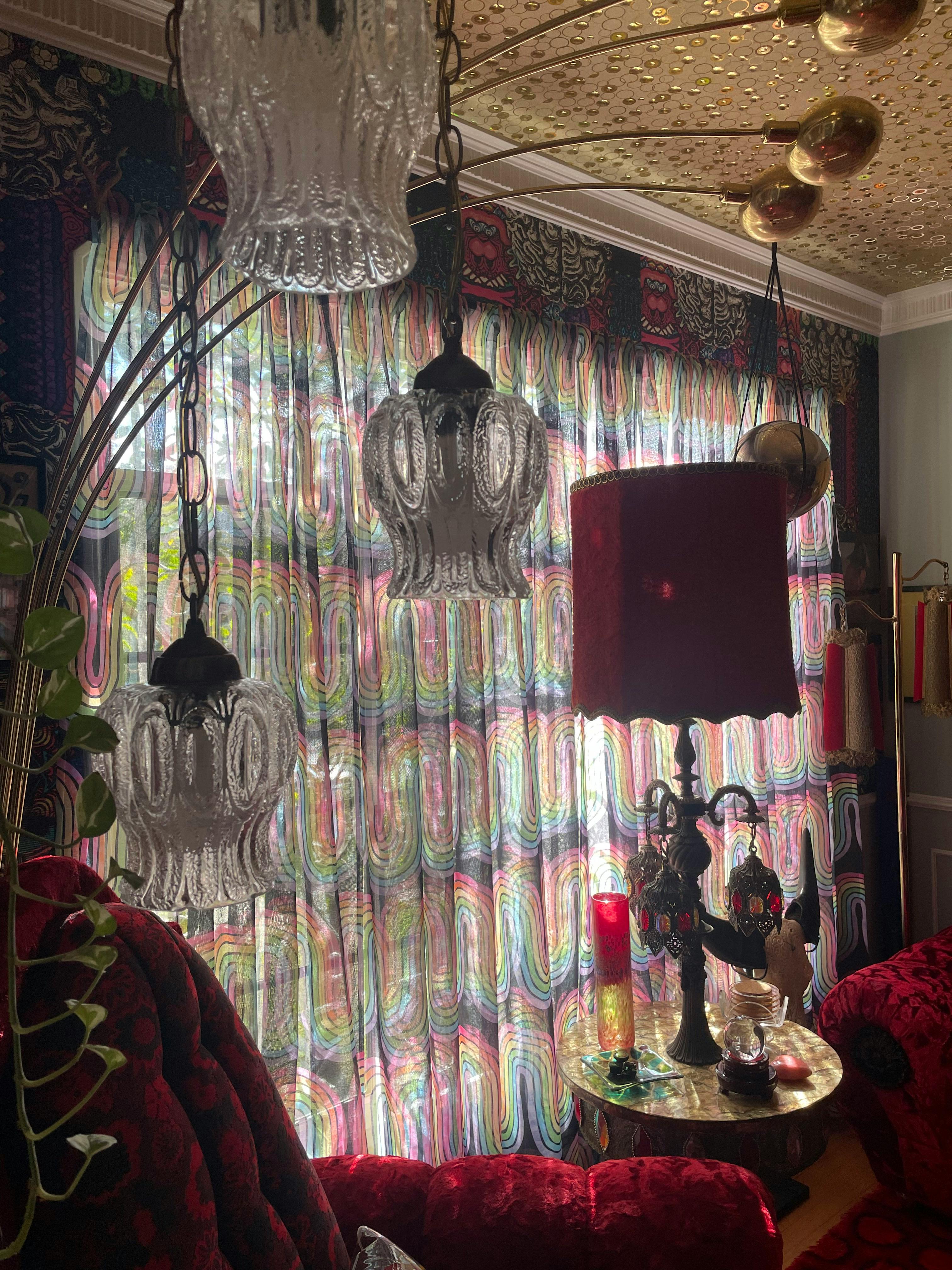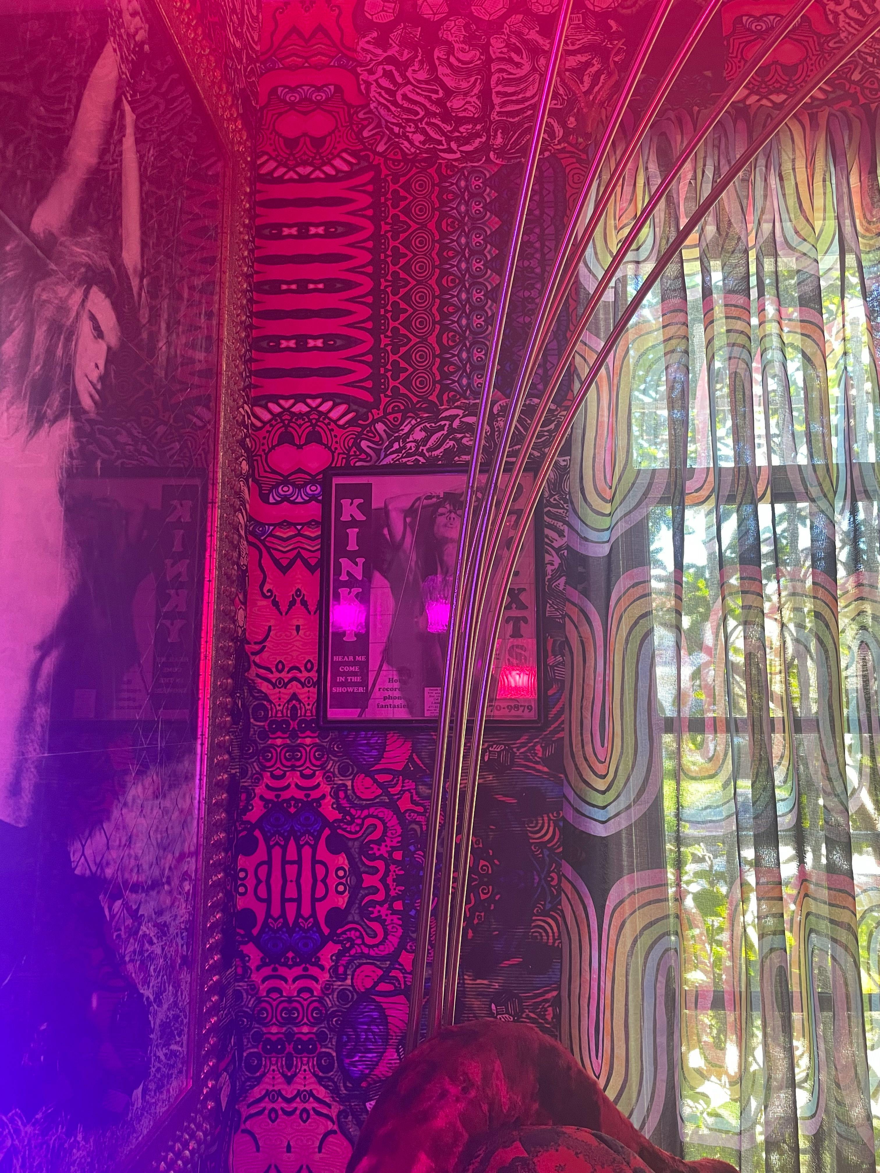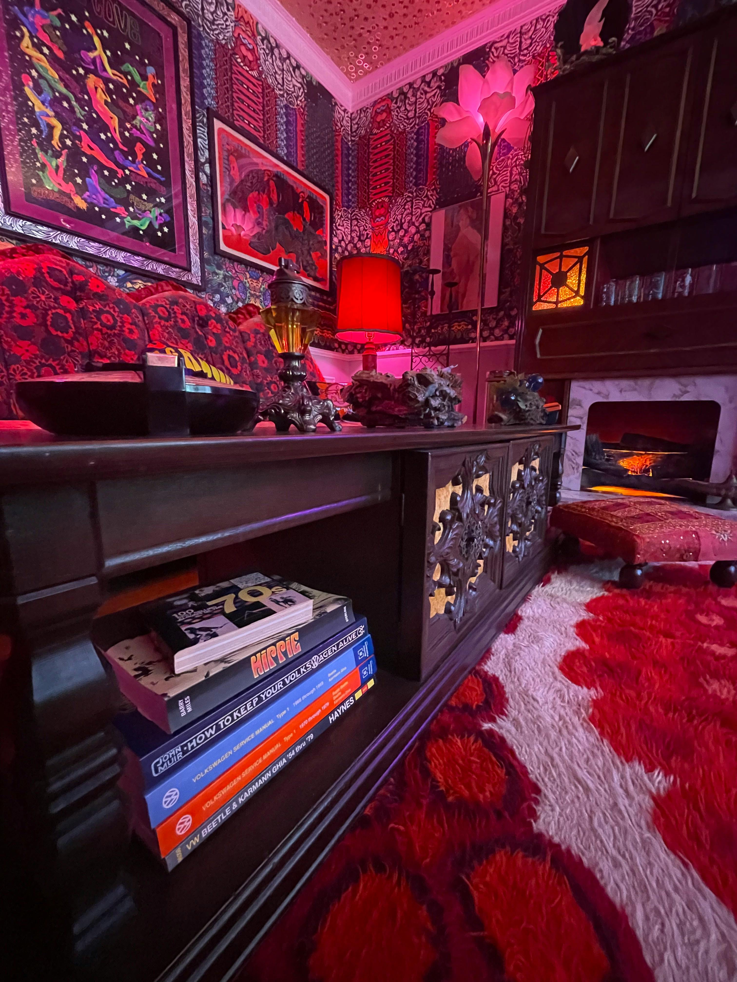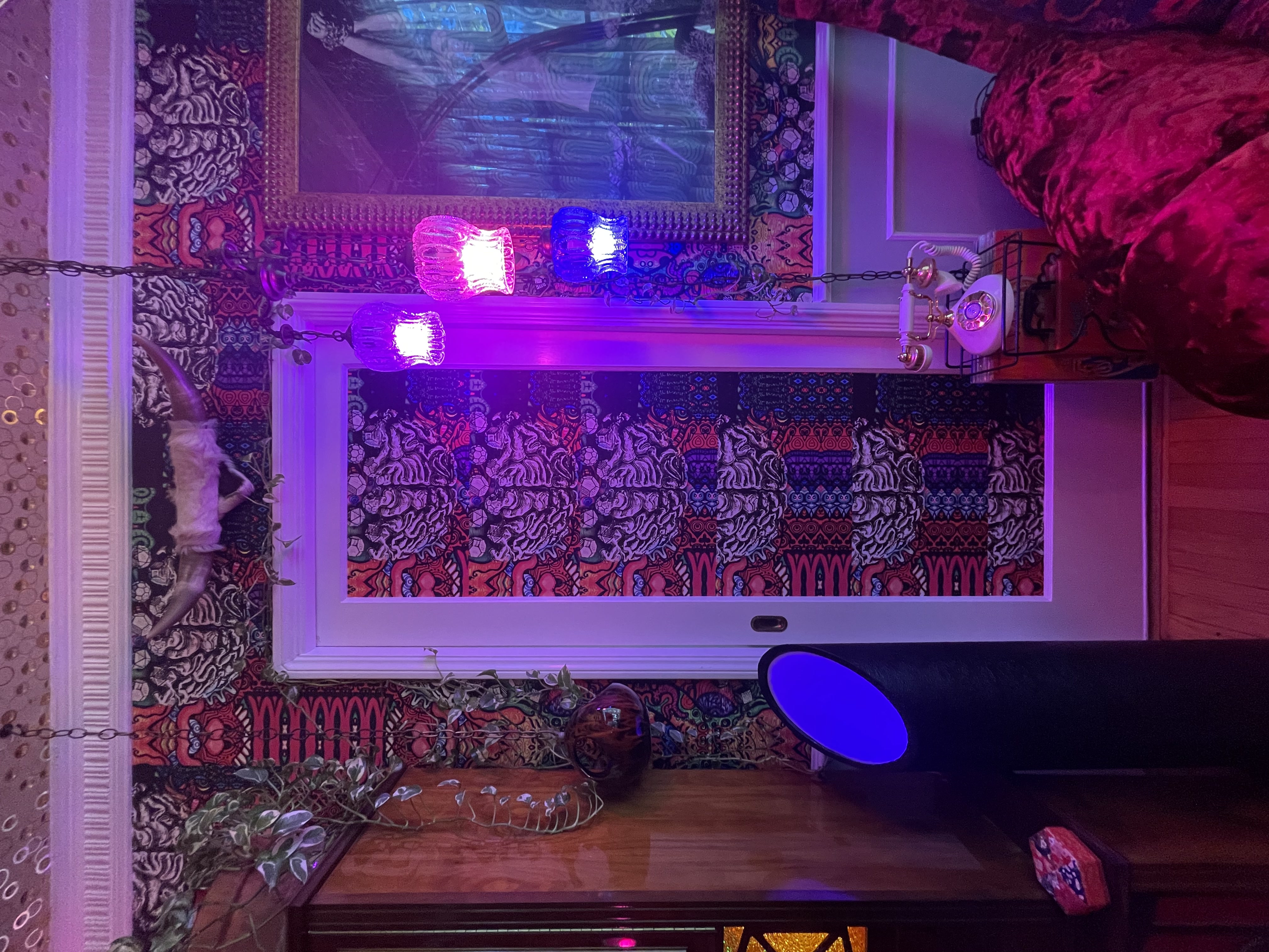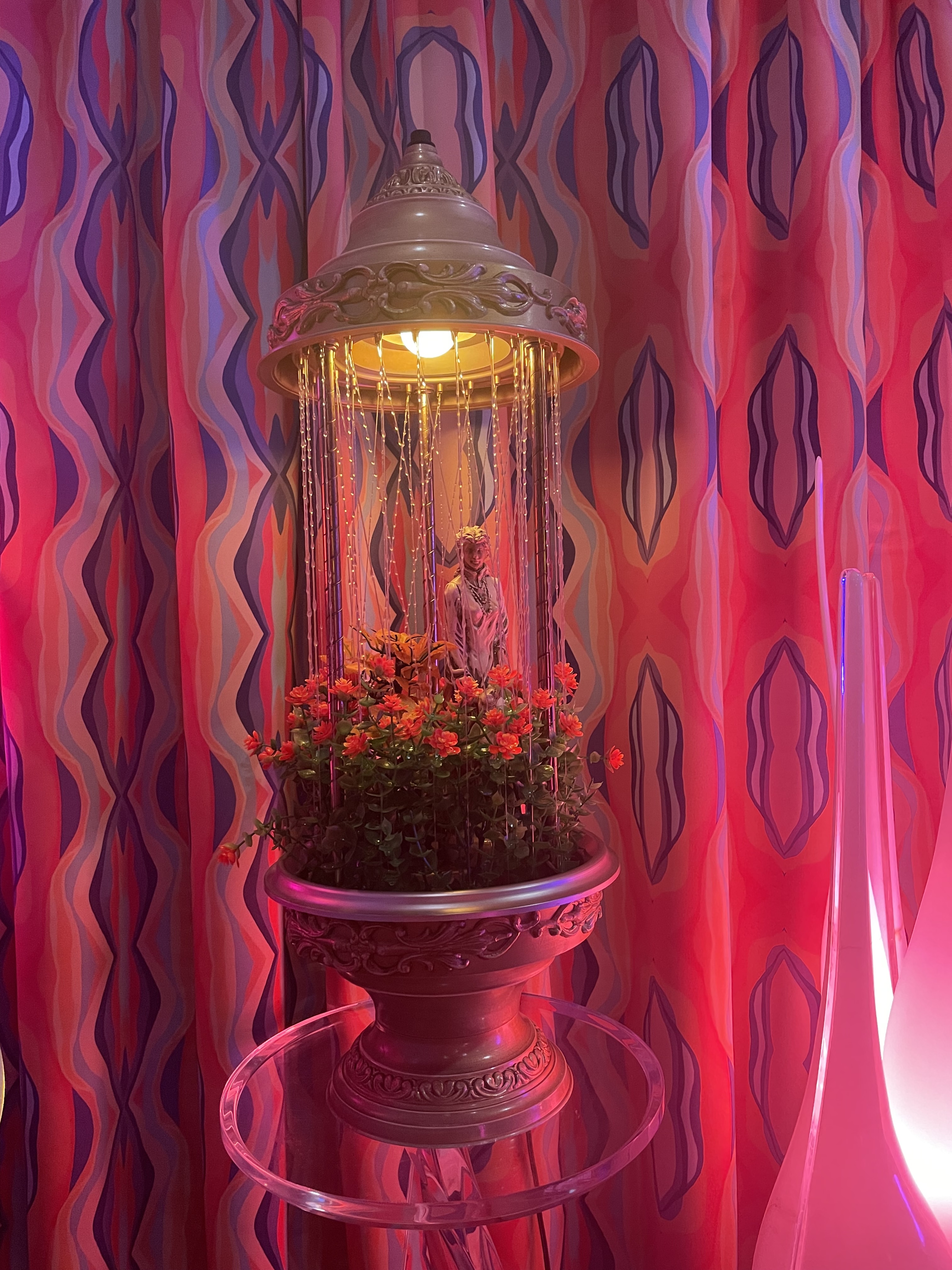 Take a trip to a far-out scene, a total mindblower where the vibes are cool and the karma's clean. A mellow den & way outta sight living space filled with 60s, 70s, icons of the Space Age, MCM, Hollywood Regency, Summer of Love vintage treasures. Photo ops appear at every angle, color-filled with oversized couch sets, lucite, fantasy lighting, erotic art, shagadelic rugs, stereo-bar stocked with a turntable, 8-track player, faux fireplace, blow-up pillows, disco ceiling, glitter & neon vibes.
