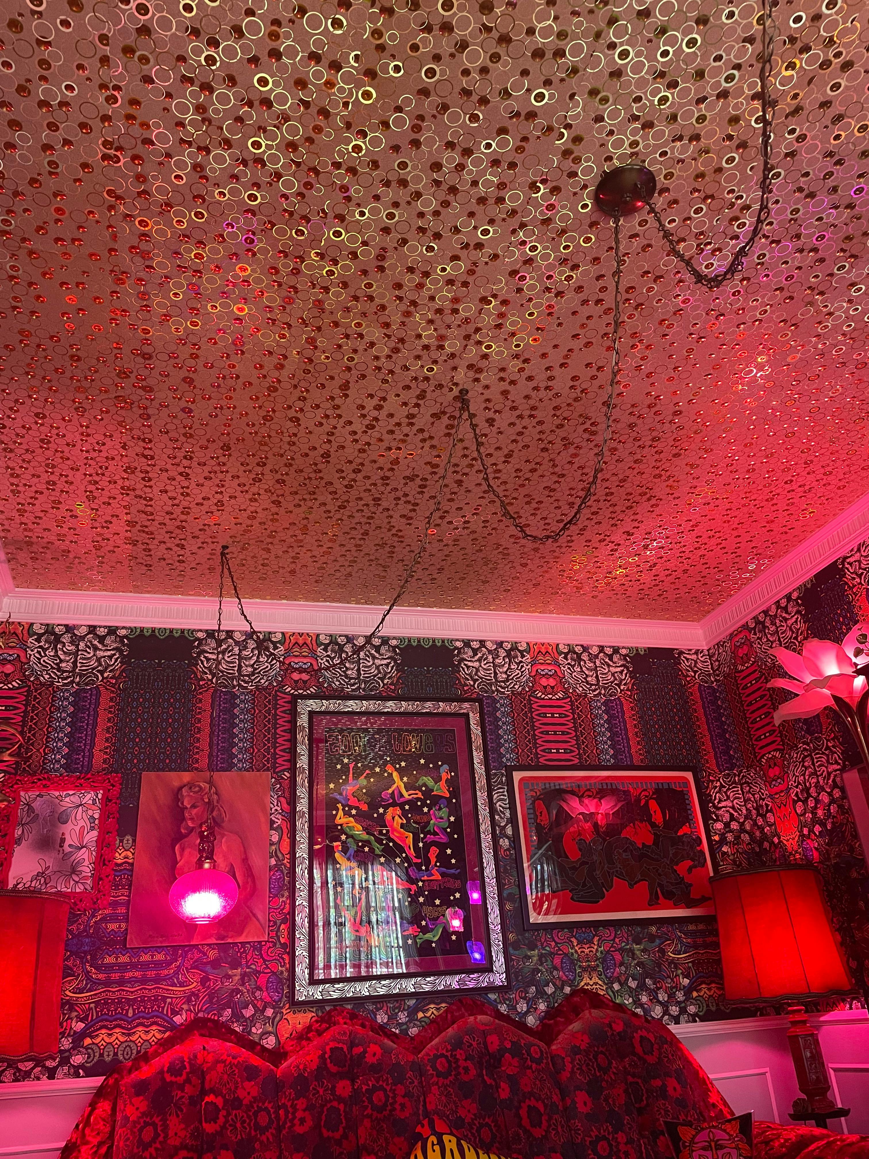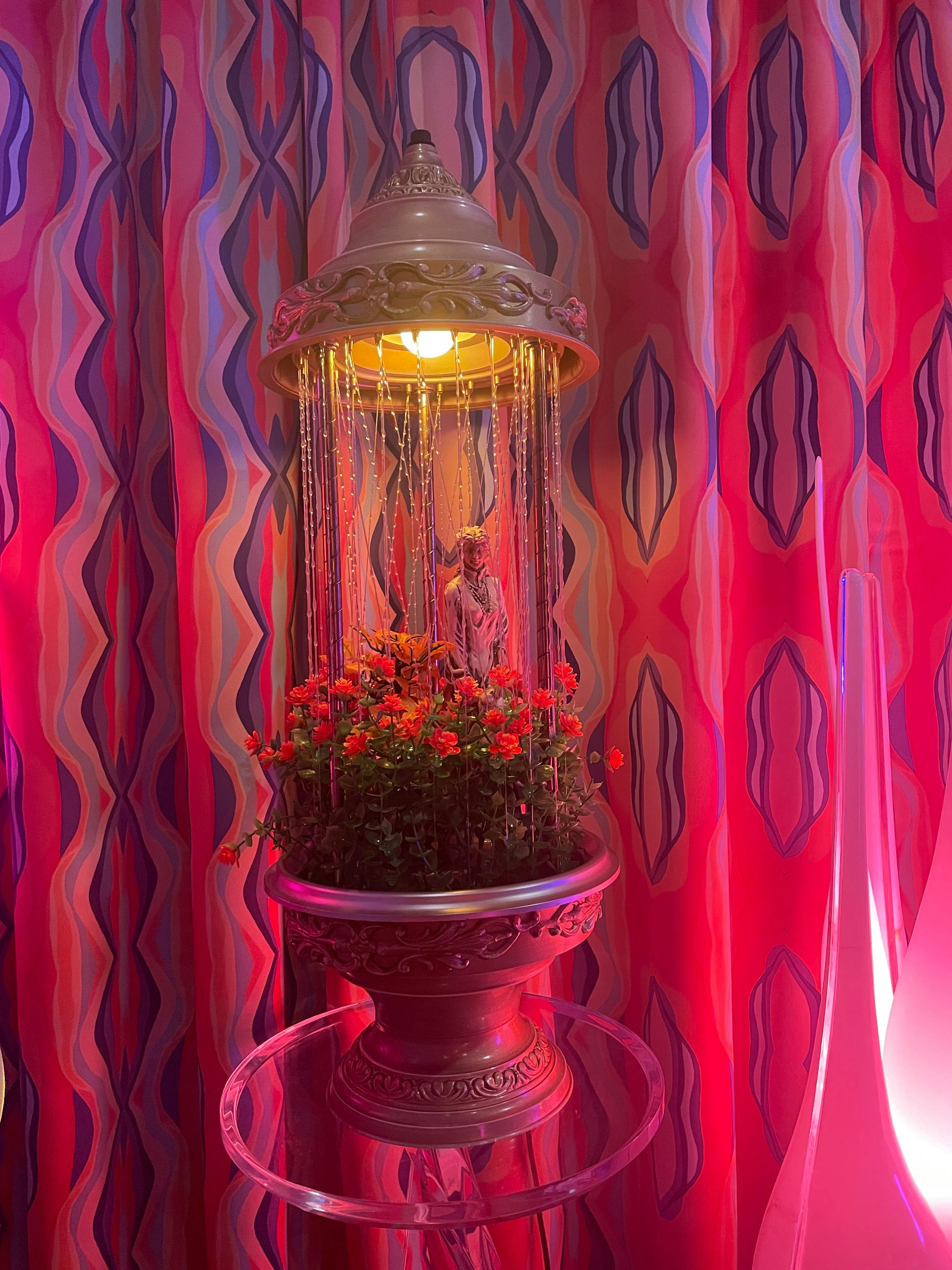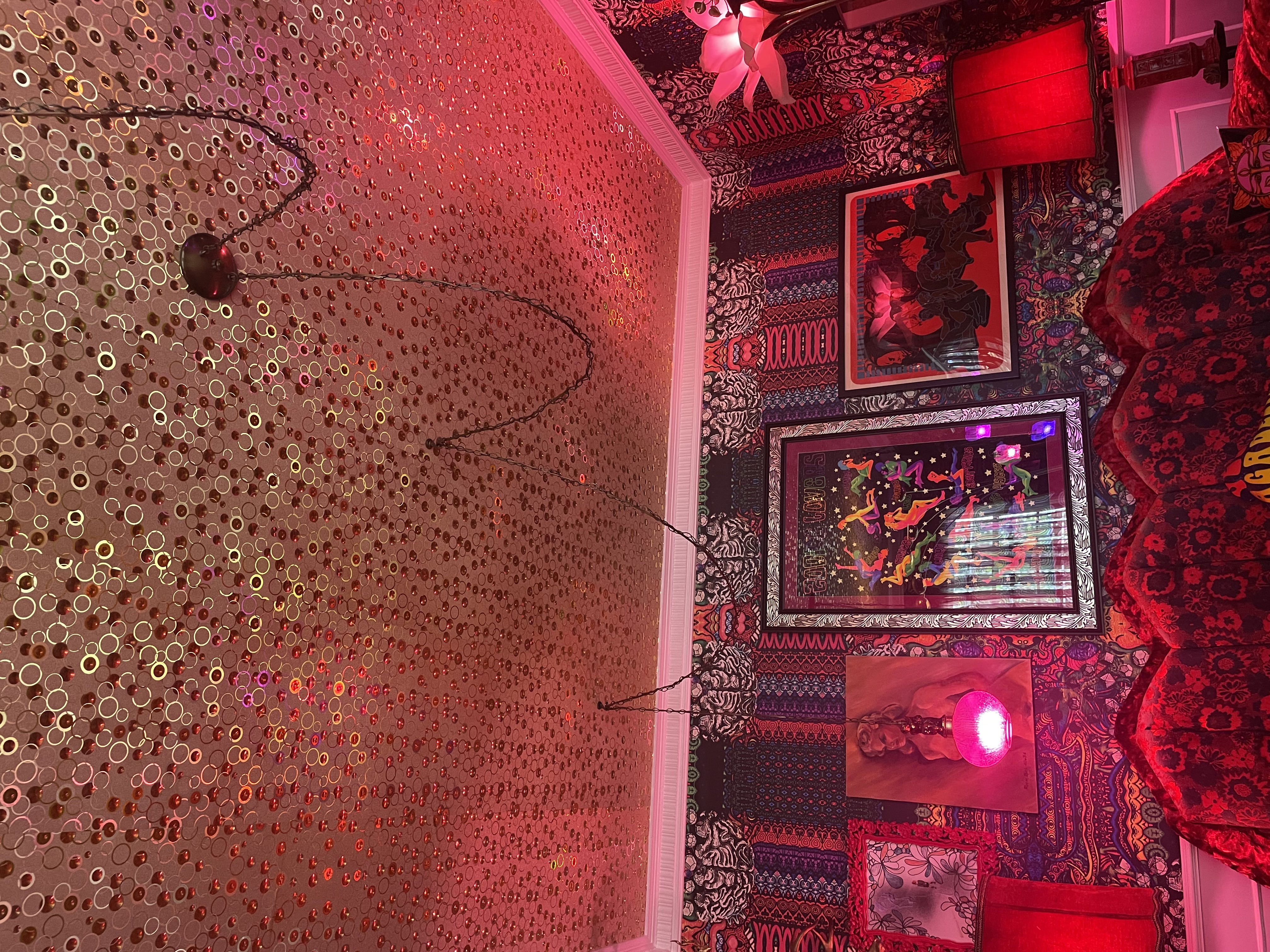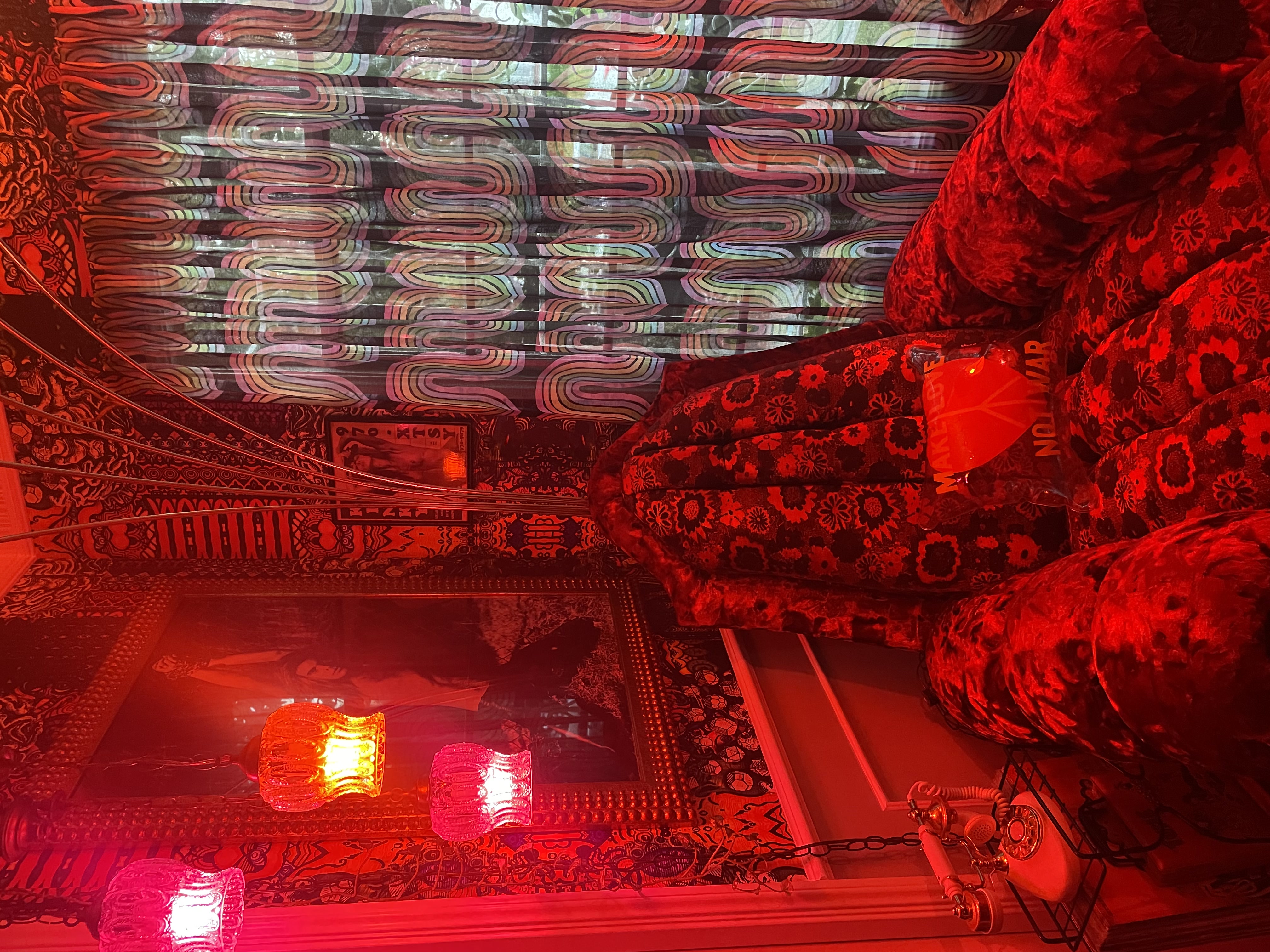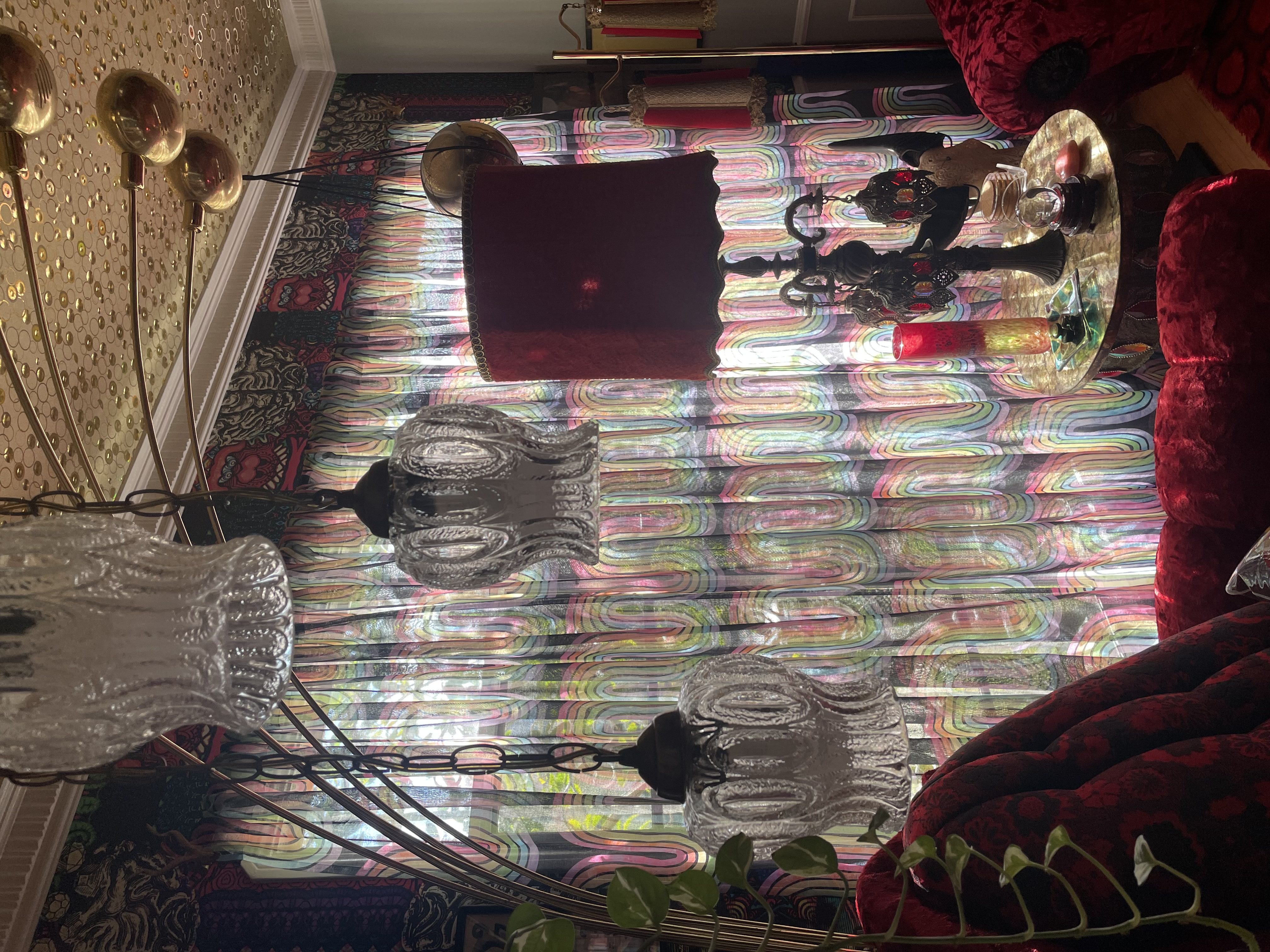 Take a trip to a far-out scene, a total mindblower where the vibes are cool and the karma's clean. A mellow den & way outta sight living space filled with 60s, 70s, icons of the Space Age, MCM, Hollywood Regency, Summer of Love vintage treasures. Photo ops appear at every angle, color-filled with oversized couch sets, lucite, fantasy lighting, erotic art, shagadelic rugs, stereo-bar stocked with a turntable, 8-track player, faux fireplace, blow-up pillows, disco ceiling, glitter & neon vibes.