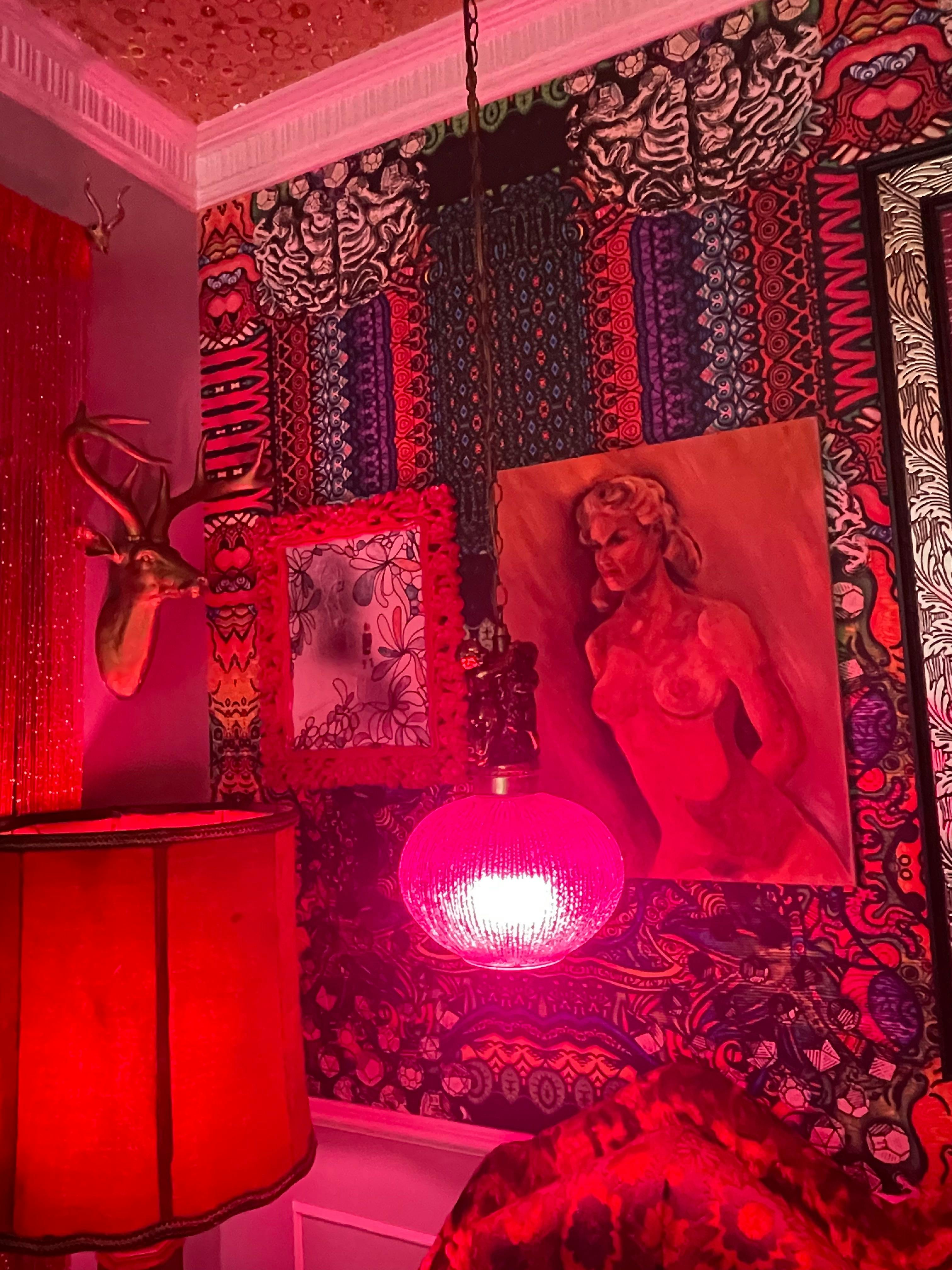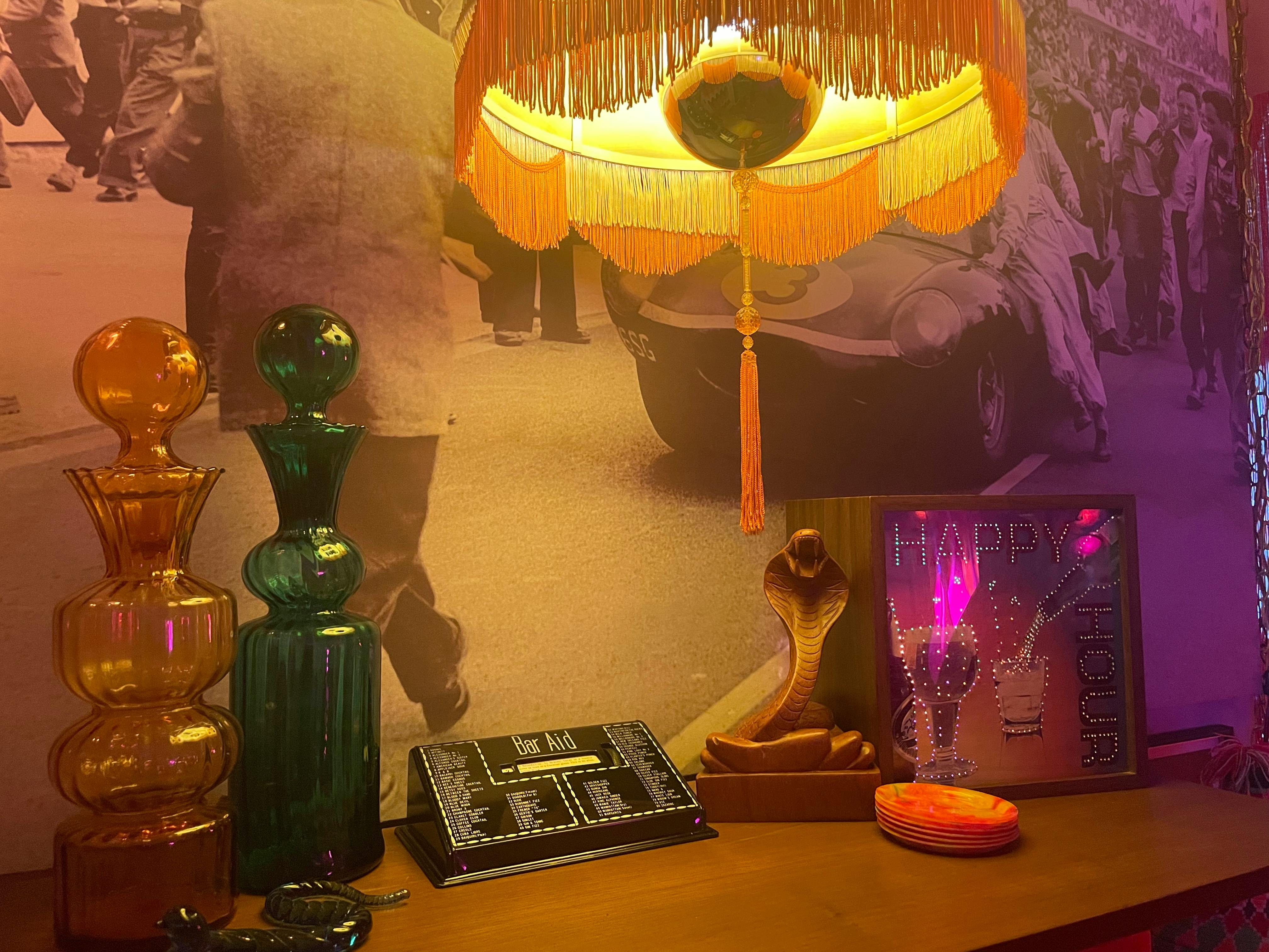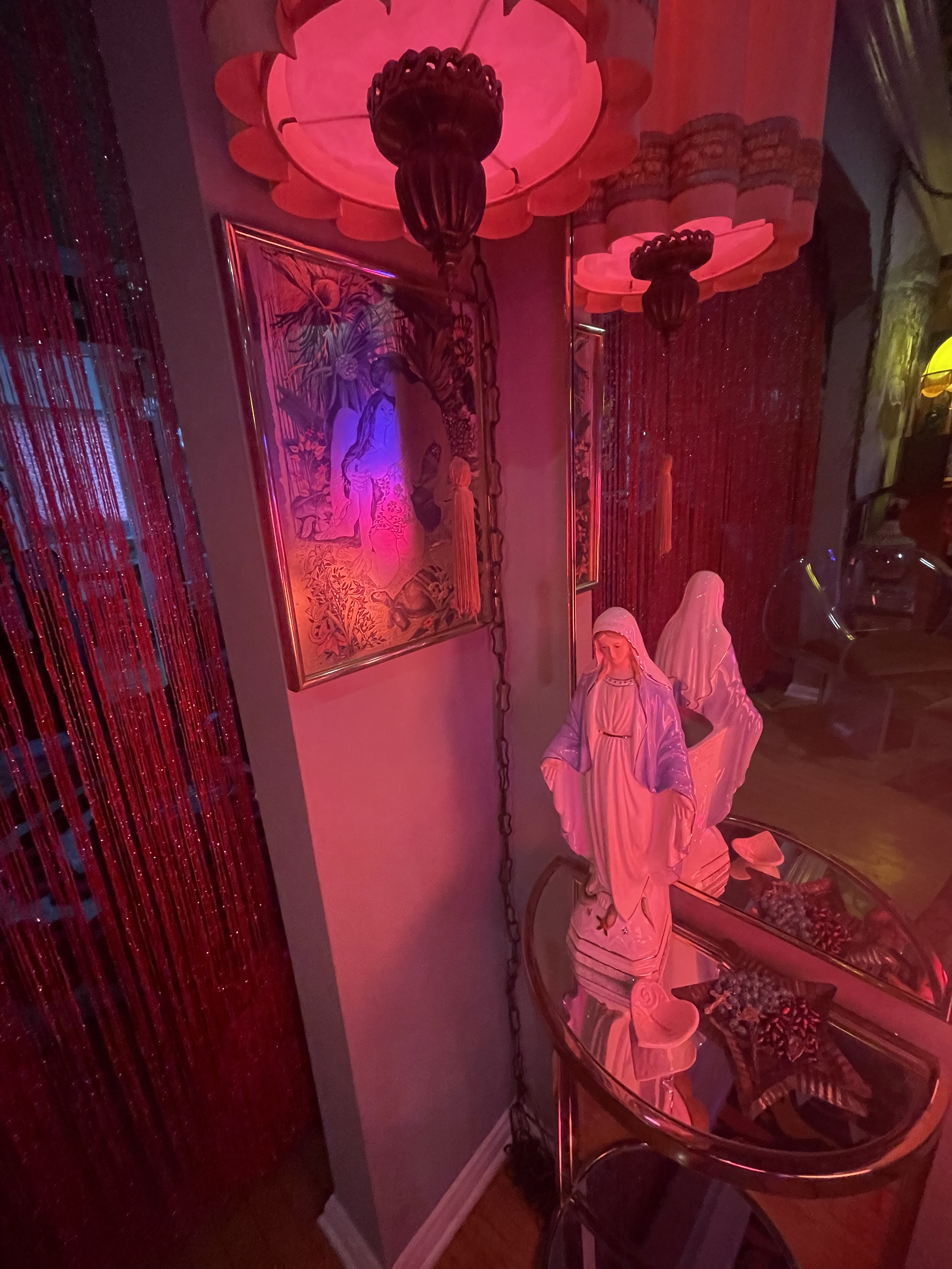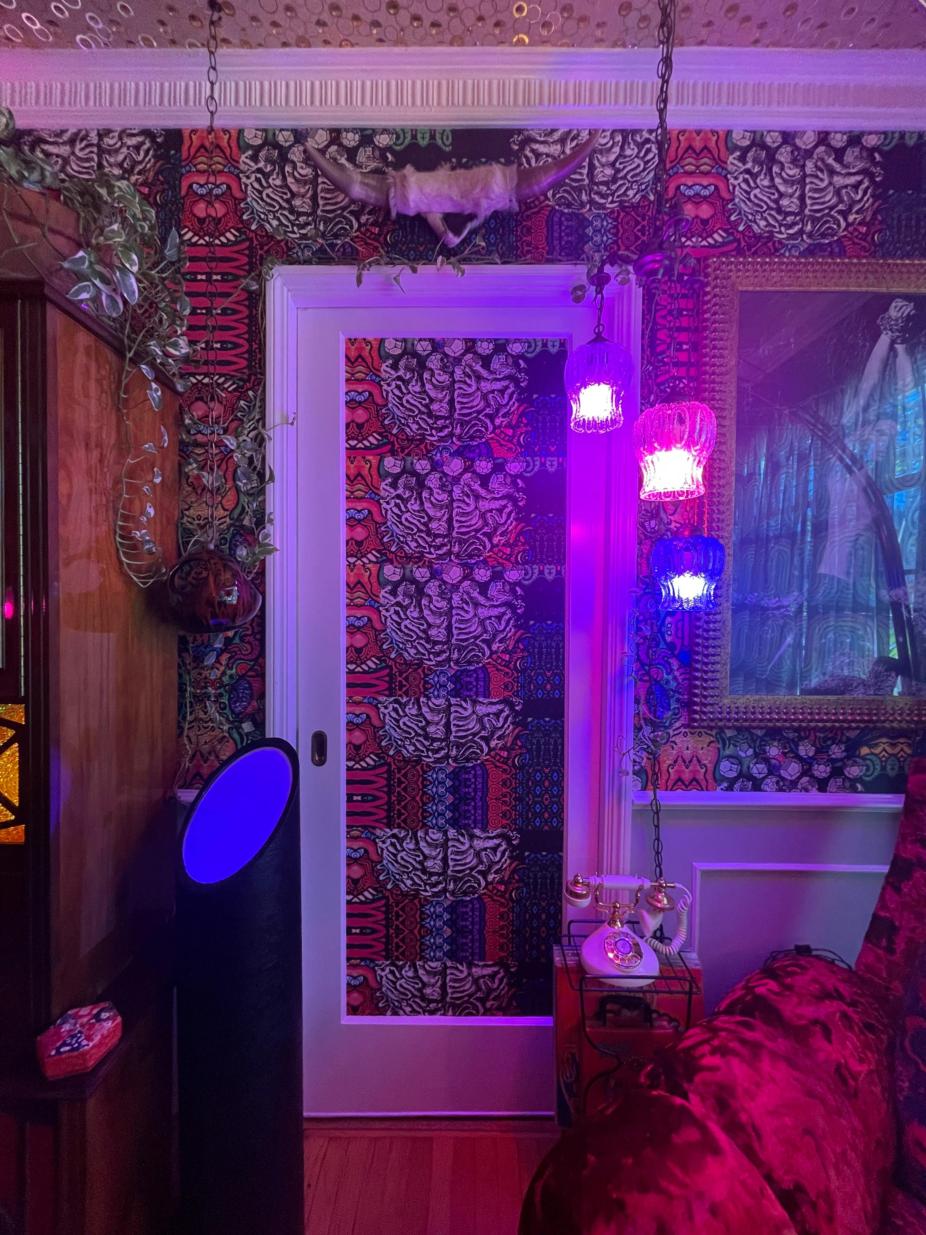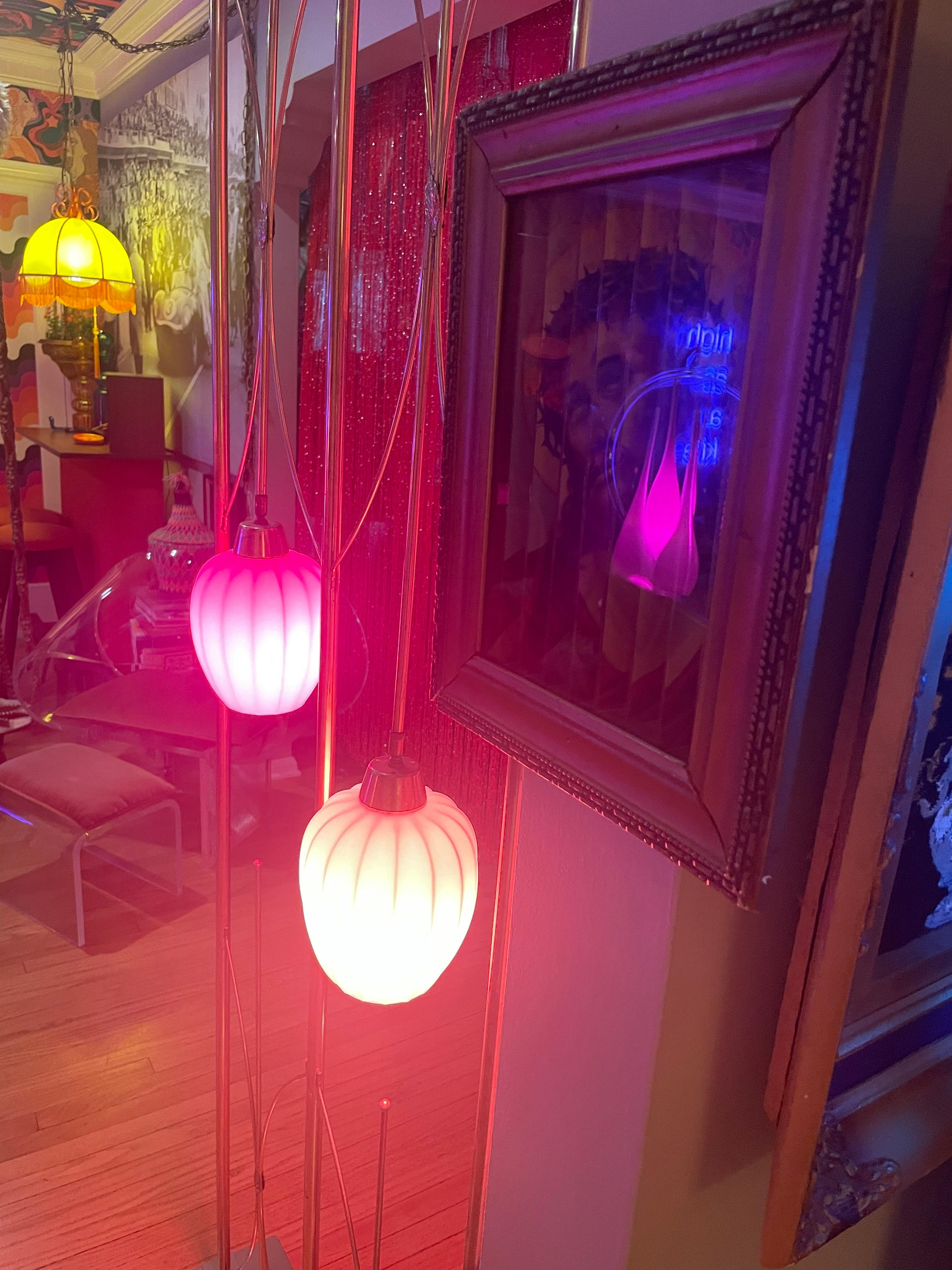 Take a trip to a far-out scene, a total mindblower where the vibes are cool and the karma's clean. A mellow den & way outta sight living space filled with 60s, 70s, icons of the Space Age, MCM, Hollywood Regency, Summer of Love vintage treasures. Photo ops appear at every angle, color-filled with oversized couch sets, lucite, fantasy lighting, erotic art, shagadelic rugs, stereo-bar stocked with a turntable, 8-track player, faux fireplace, blow-up pillows, disco ceiling, glitter & neon vibes.