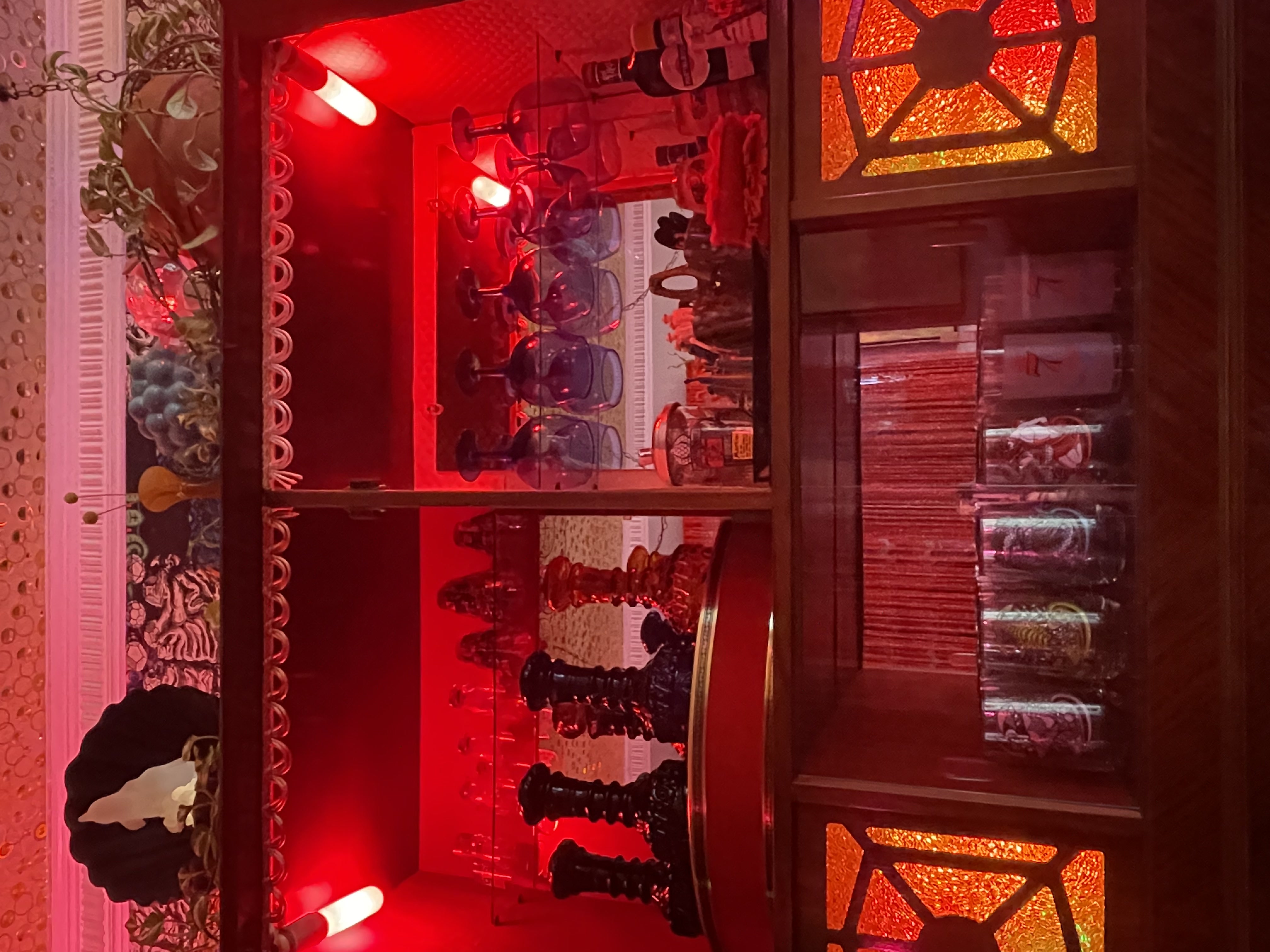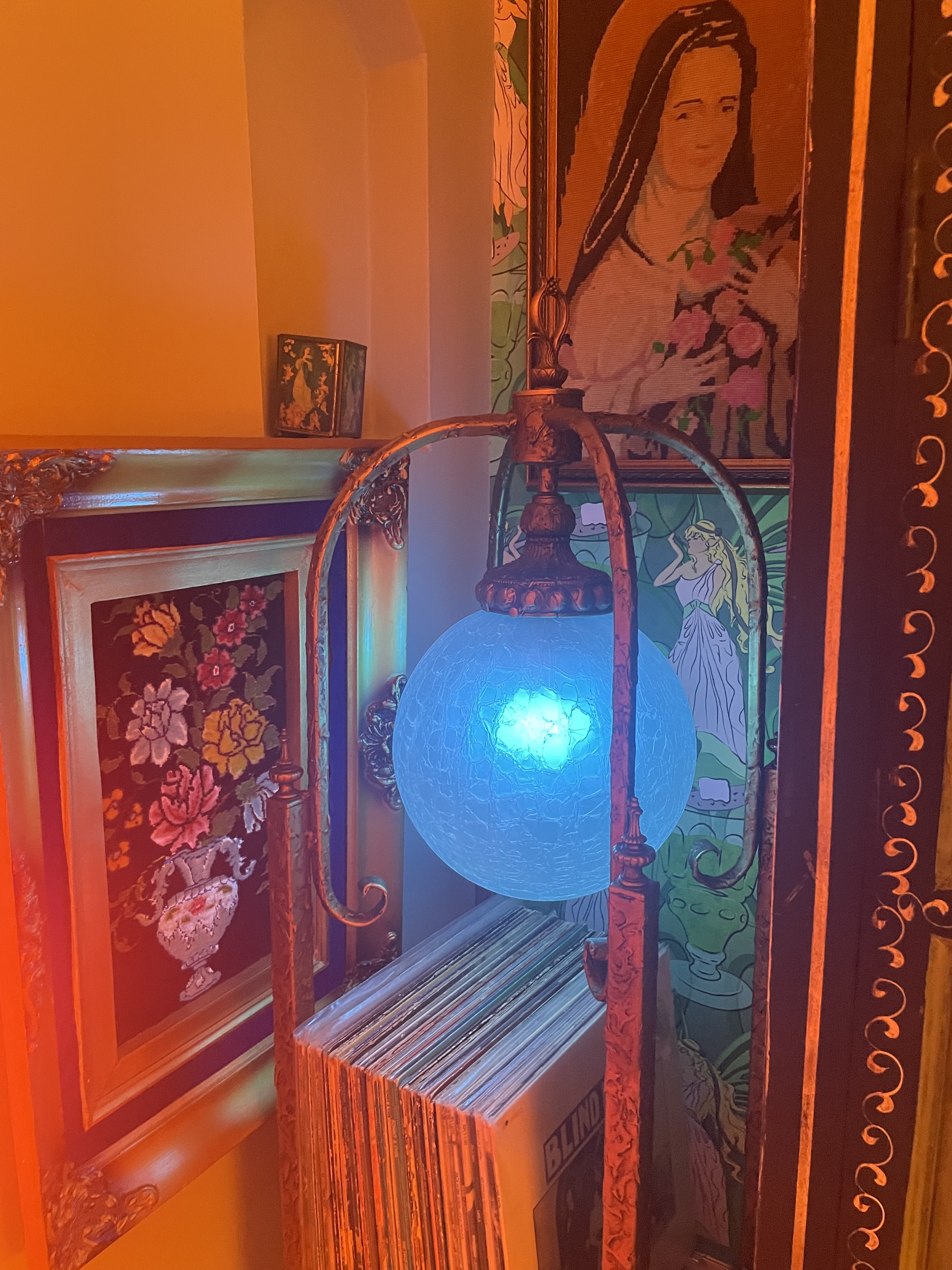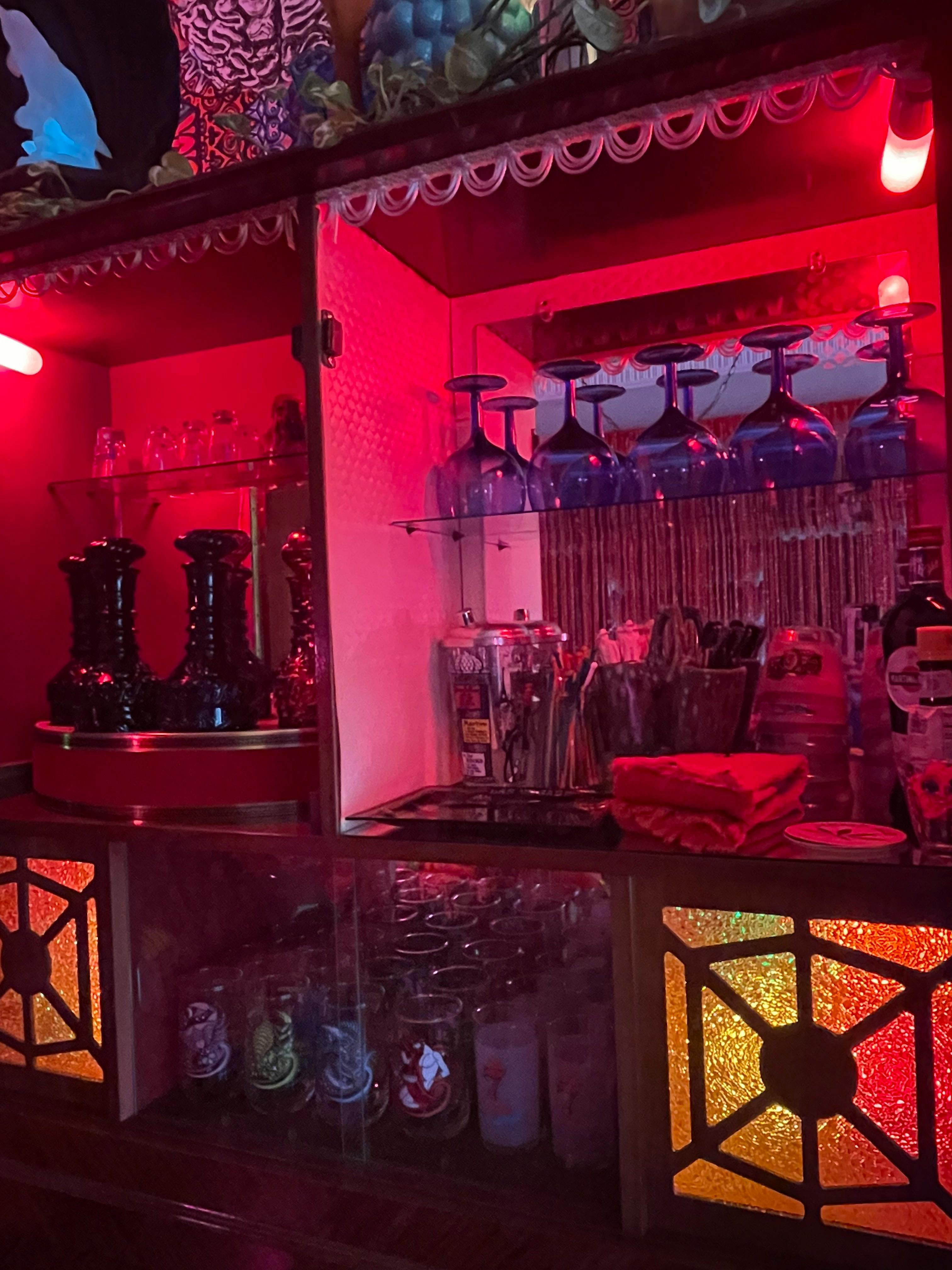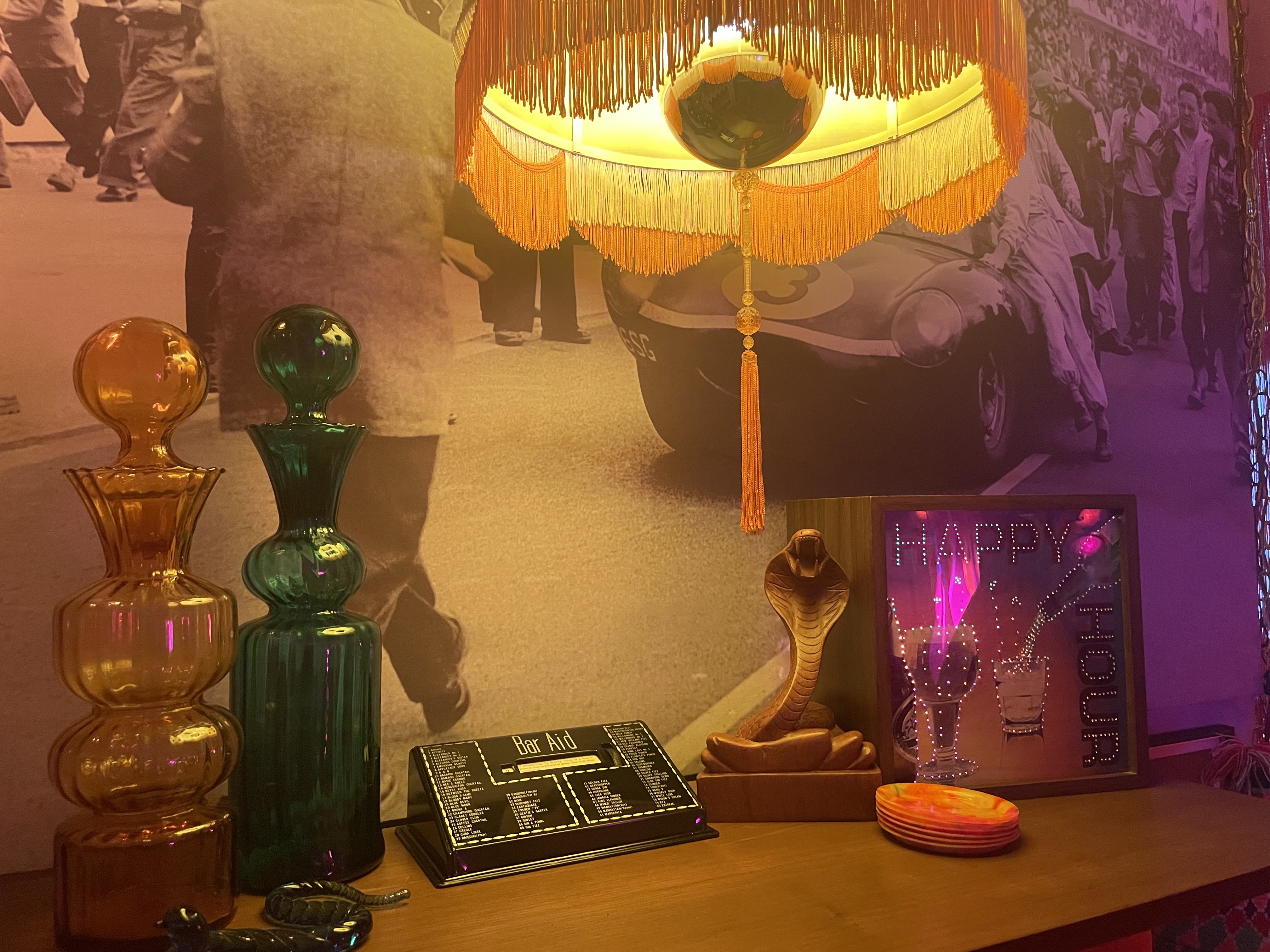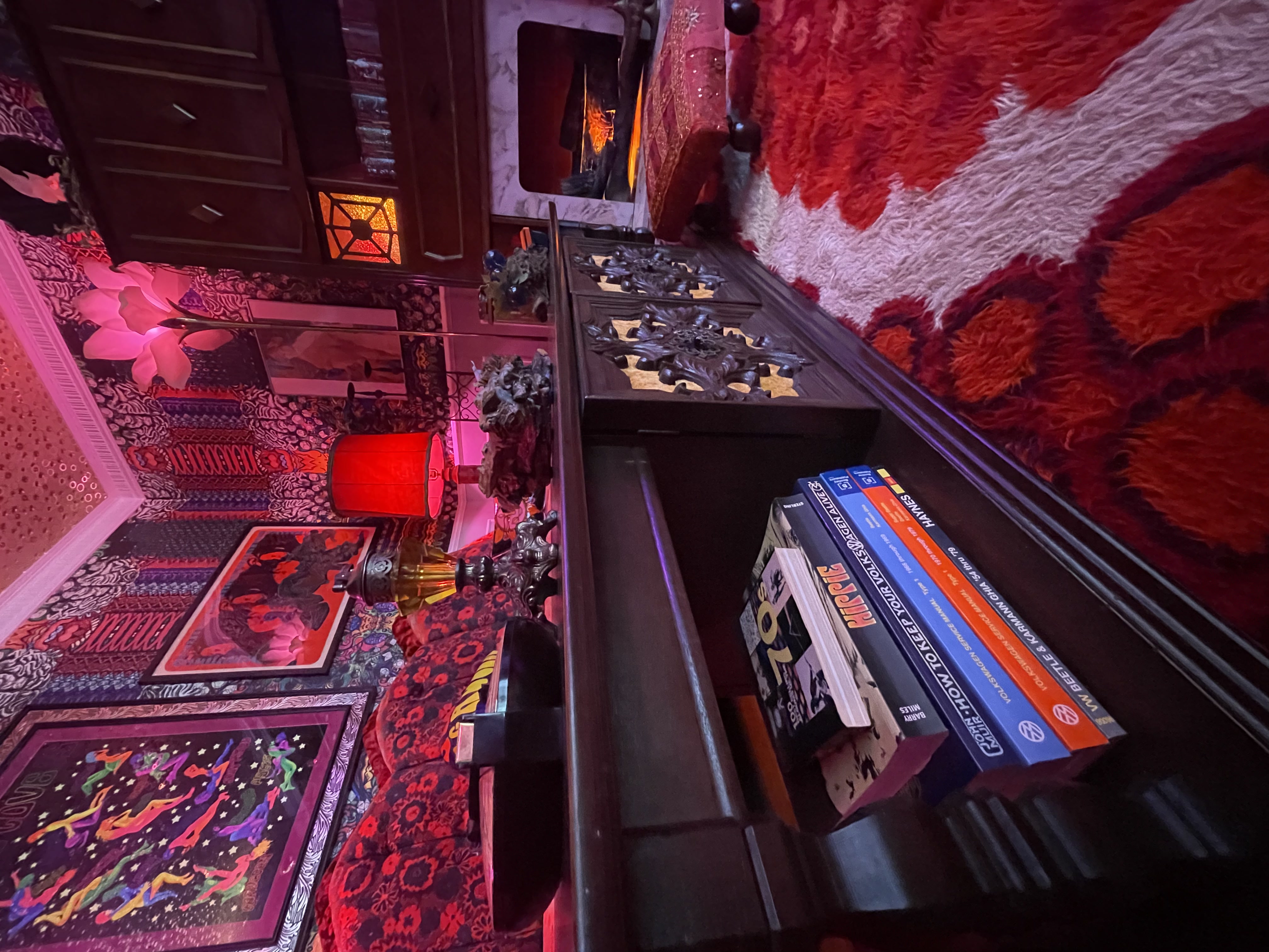 Take a trip to a far-out scene, a total mindblower where the vibes are cool and the karma's clean. A mellow den & way outta sight living space filled with 60s, 70s, icons of the Space Age, MCM, Hollywood Regency, Summer of Love vintage treasures. Photo ops appear at every angle, color-filled with oversized couch sets, lucite, fantasy lighting, erotic art, shagadelic rugs, stereo-bar stocked with a turntable, 8-track player, faux fireplace, blow-up pillows, disco ceiling, glitter & neon vibes.