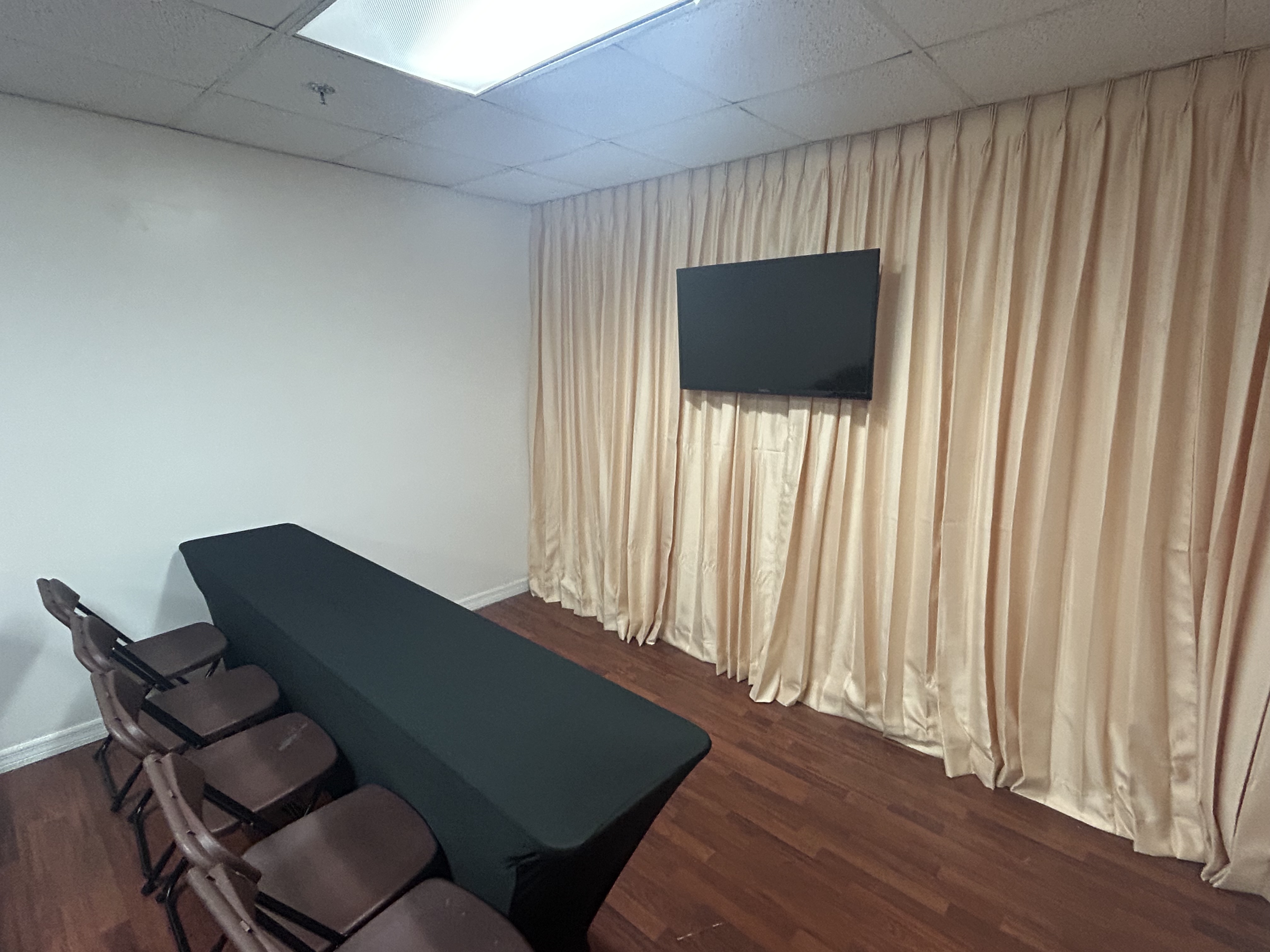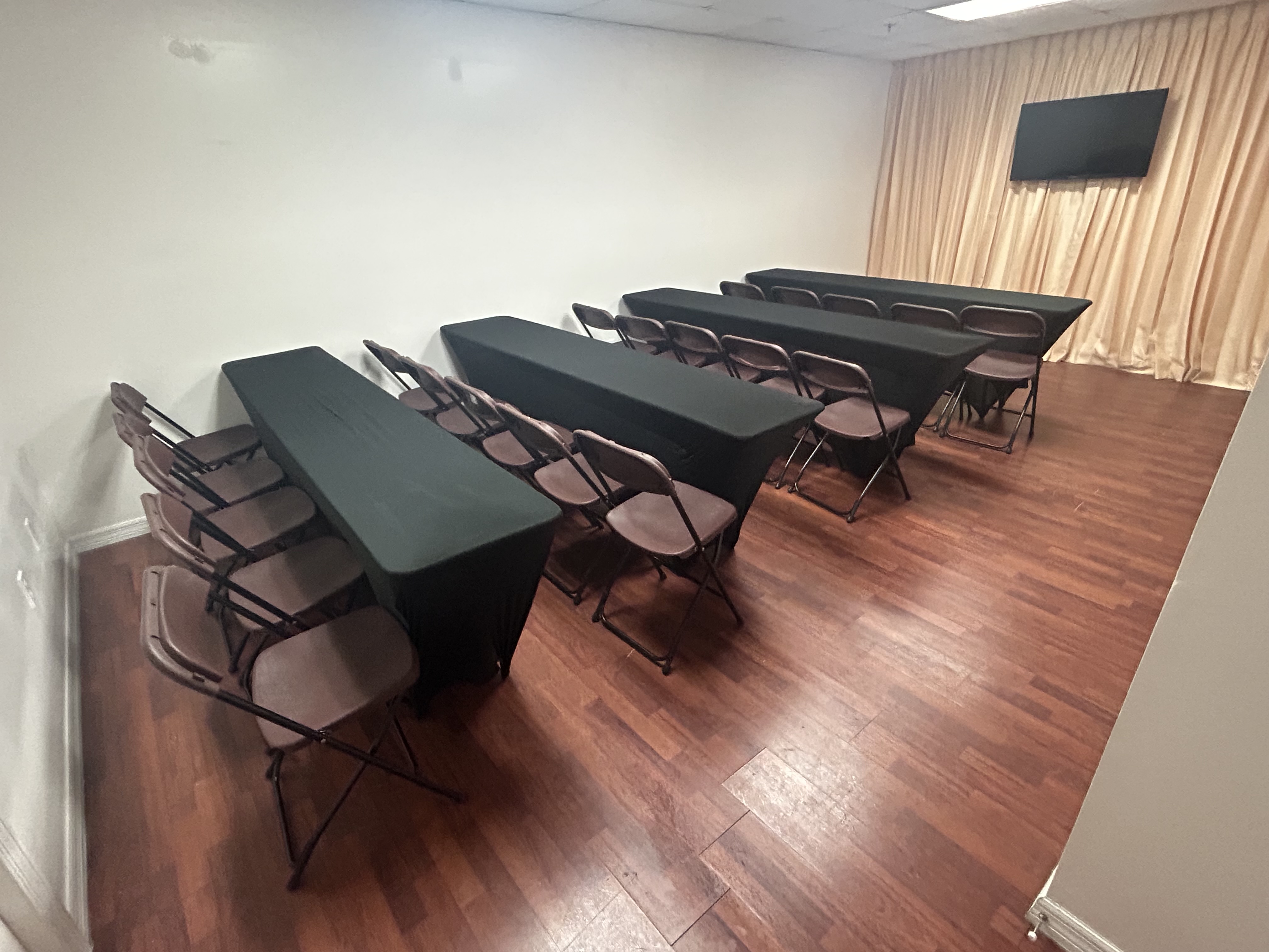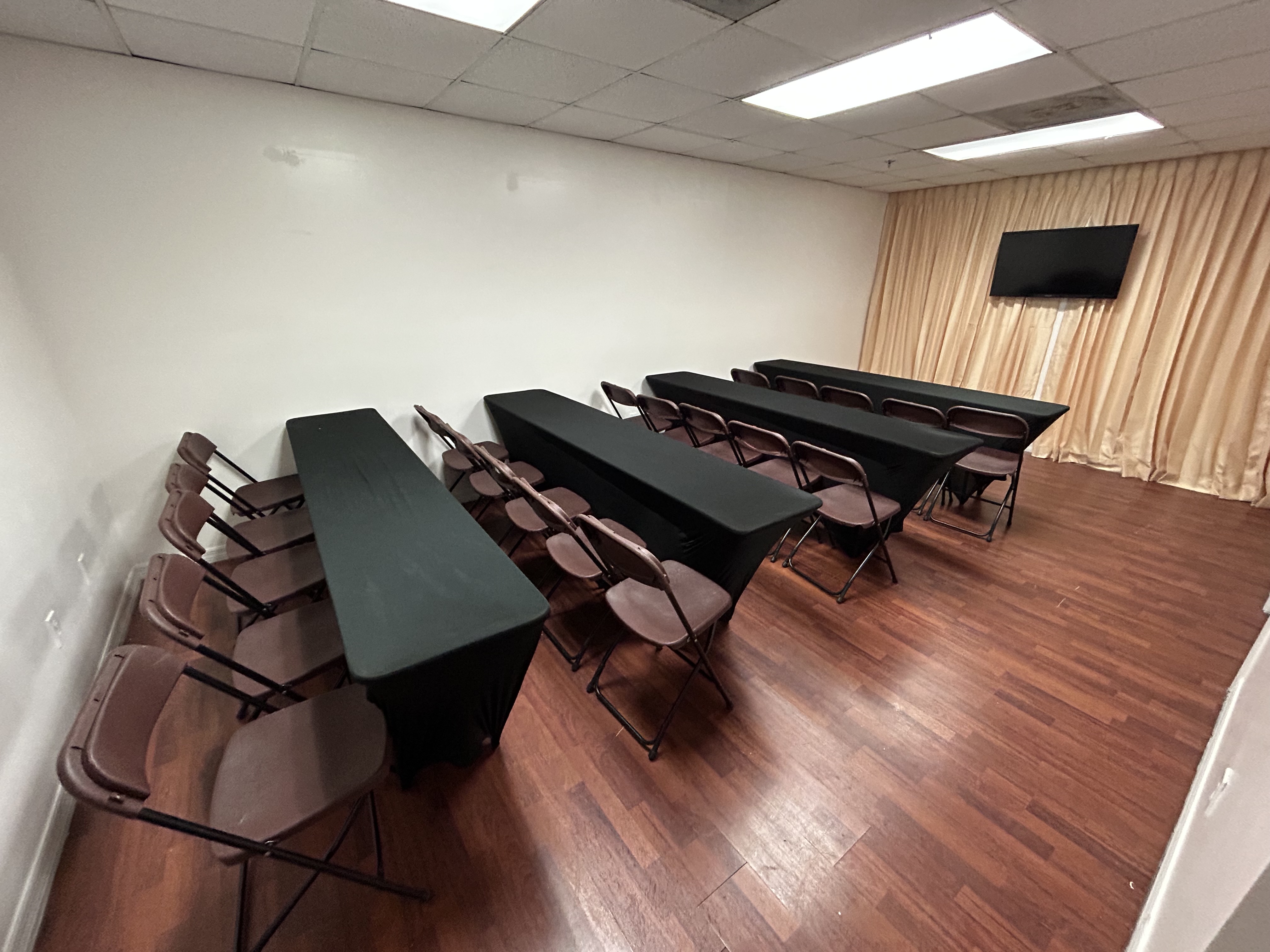 The space we provide is ideal for corporate meetings, hands on training sessions, and more. The space comes with tables, chairs, and a TV for use in presentations if necessary. The layout of the tables and chairs can be adjusted to accommodate the needs of the event taking place. On the second floor of building.