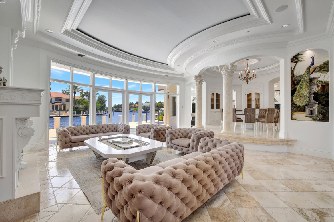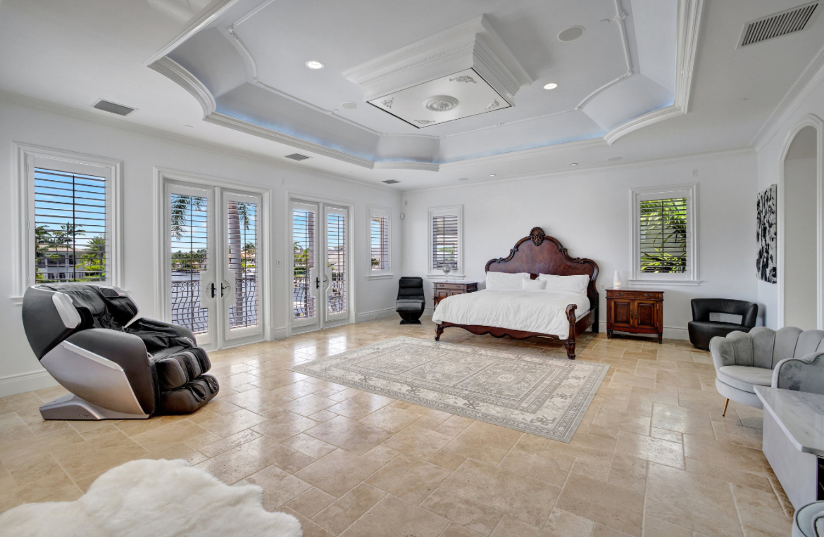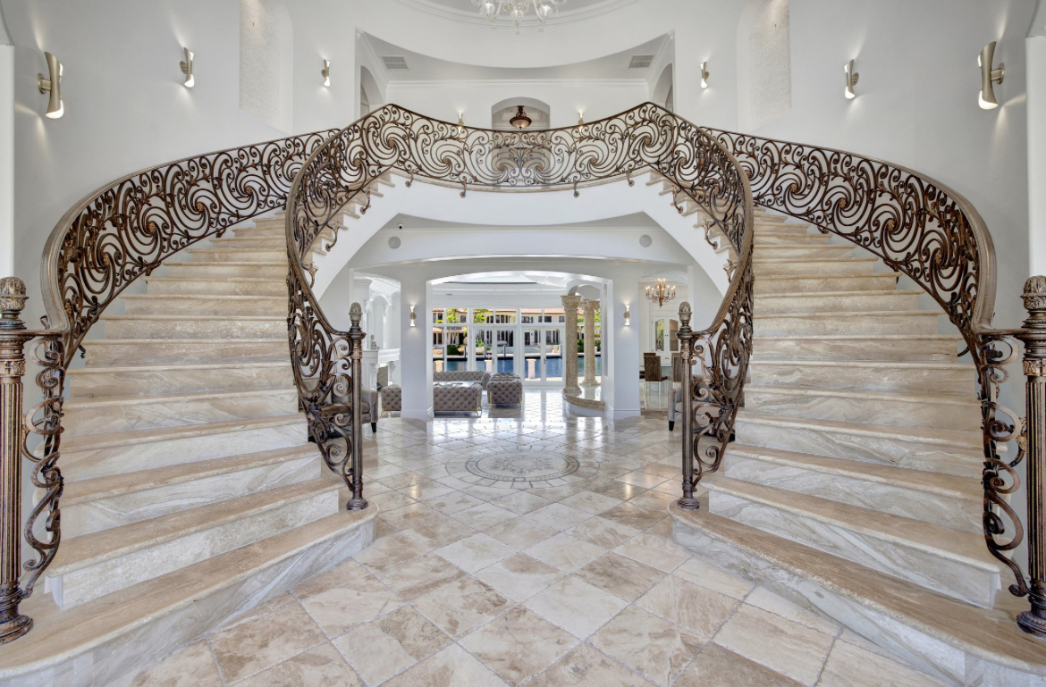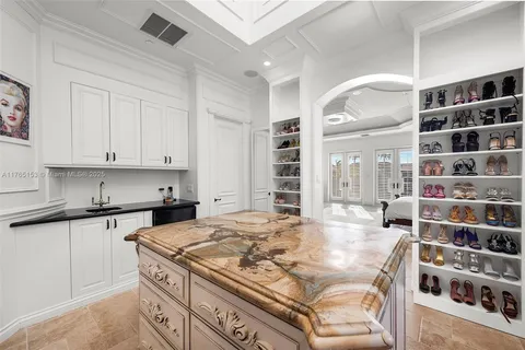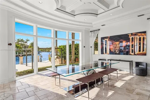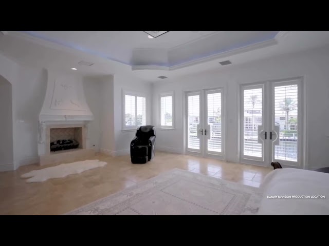 Enter into a 3 story lux double sided butterfly staircase in Italian marble. Featuring over 25’ height & 30’ dome & a Murano chandelier. The first floor has a stunning formal living room overlooking the pool deck &100’ dock. The living room has a fireplace & mother of pearl accent wall. Upstairs the 2000 sq’ master br has 2 show closets & an enormous bathroom with a 4 ppl jacuzzi & 100 sq’ shower & sauna.