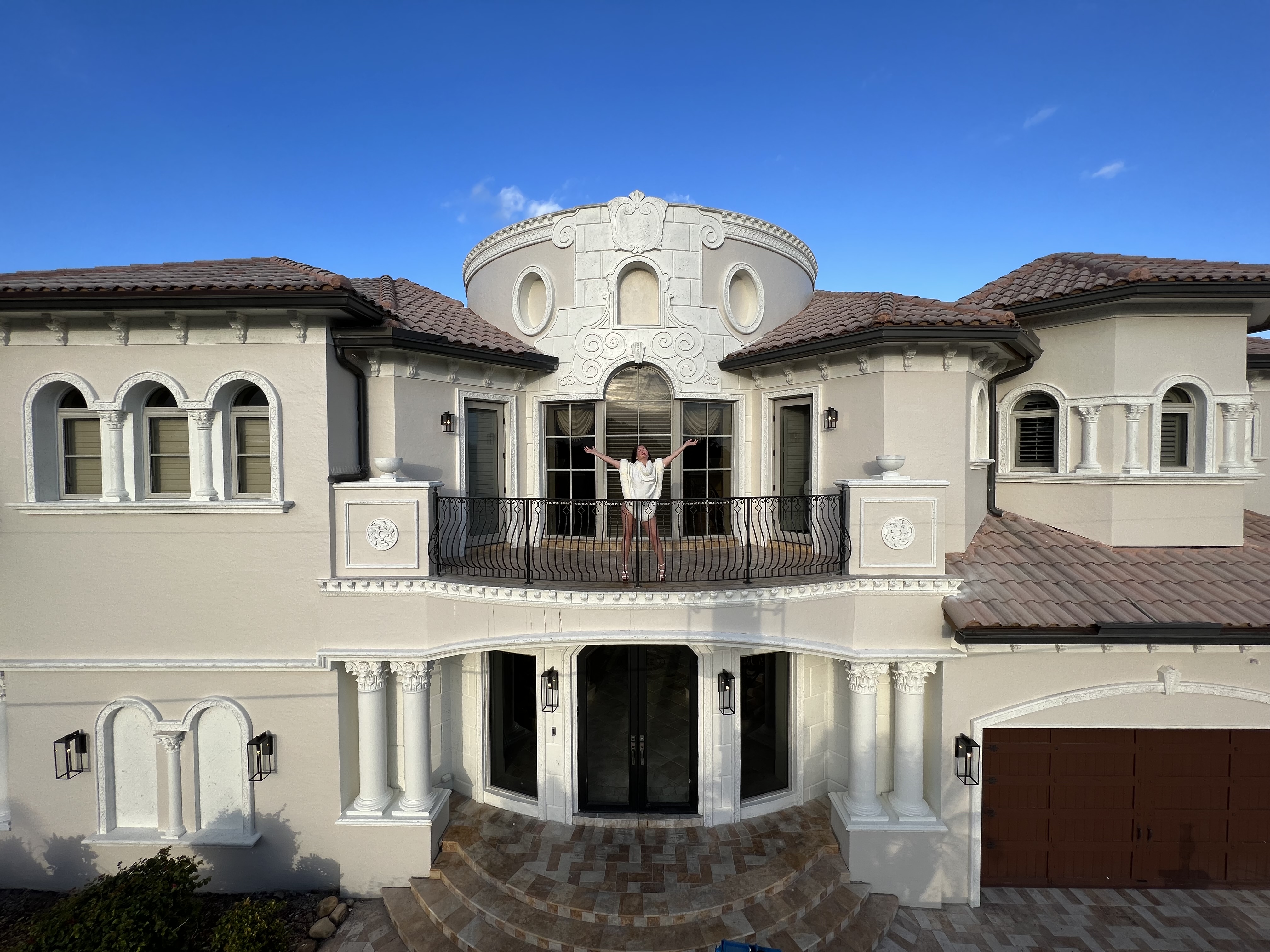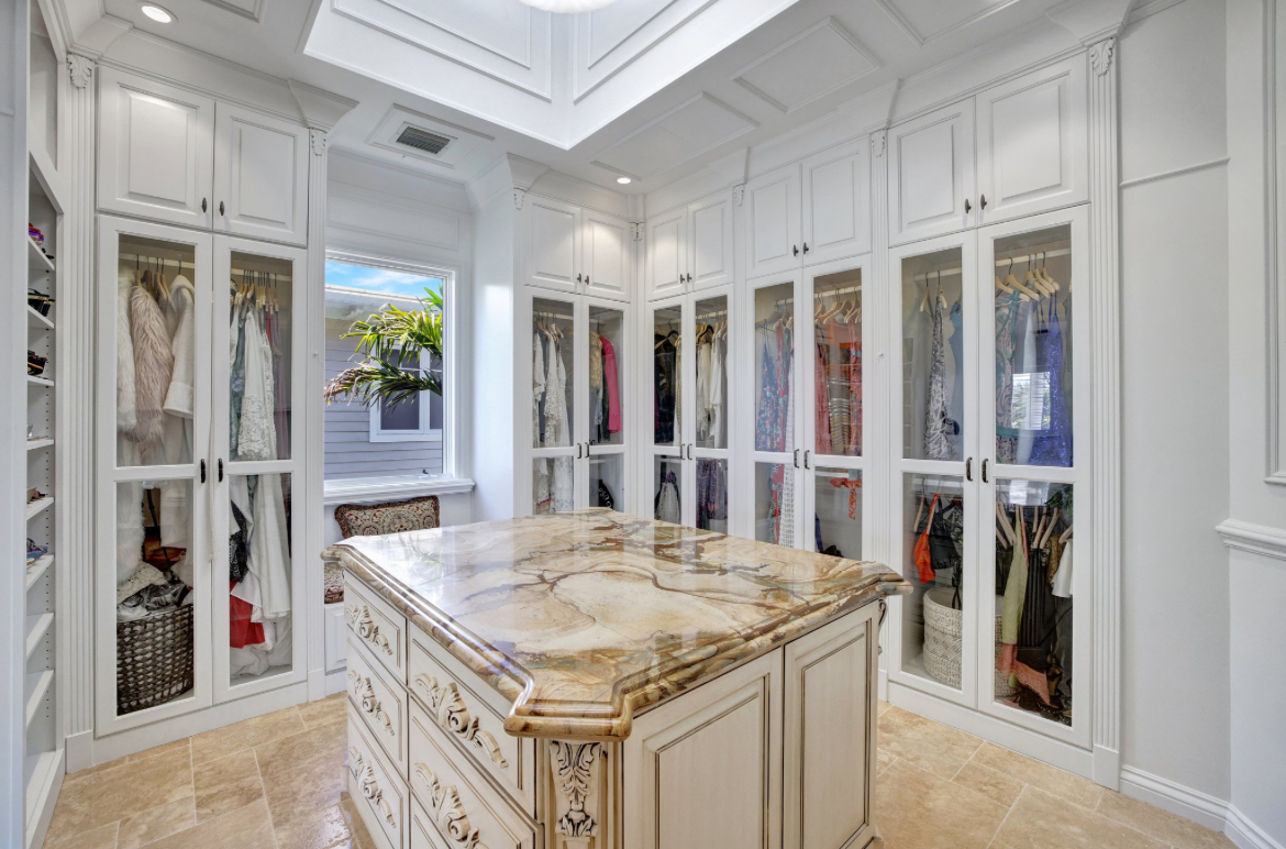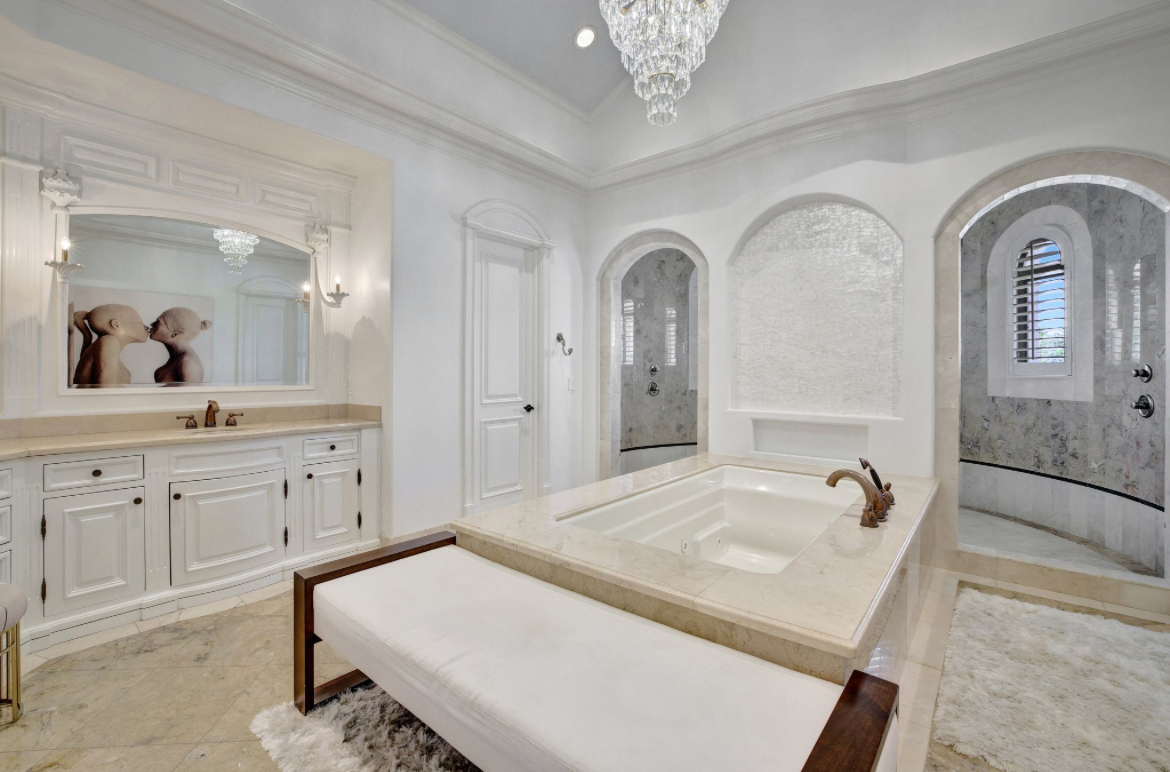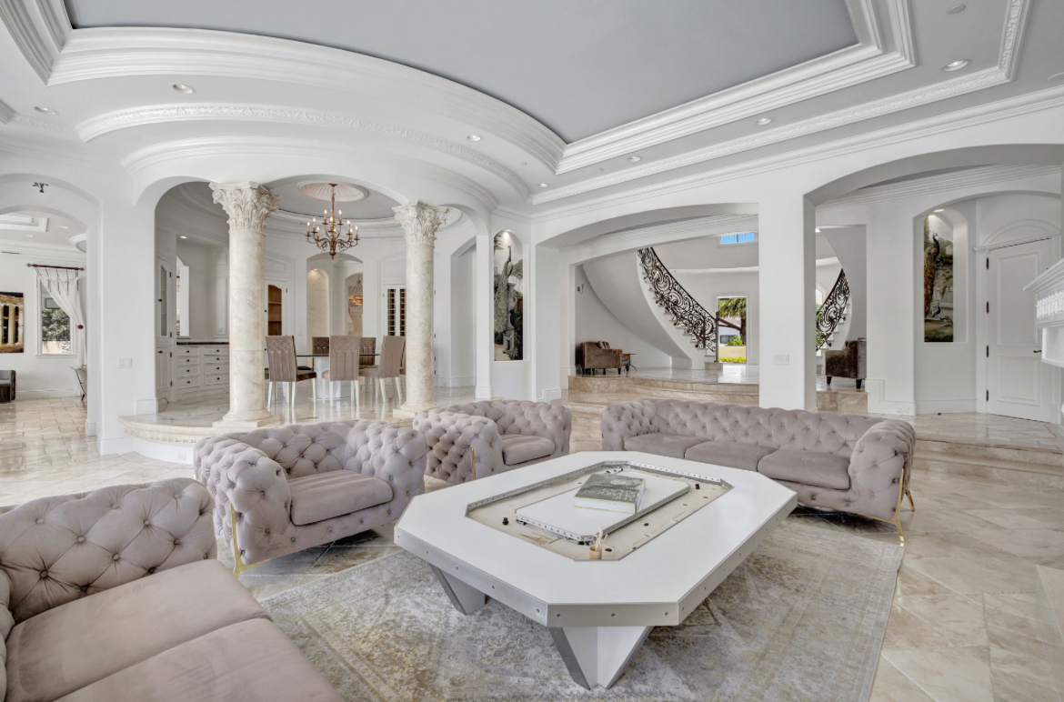 Enter into a 3 story lux double sided butterfly staircase in Italian marble. Featuring over 25’ height & 30’ dome & a Murano chandelier. The first floor has a stunning formal living room overlooking the pool deck &100’ dock. The living room has a fireplace & mother of pearl accent wall. Upstairs the 2000 sq’ master br has 2 show closets & an enormous bathroom with a 4 ppl jacuzzi & 100 sq’ shower & sauna.