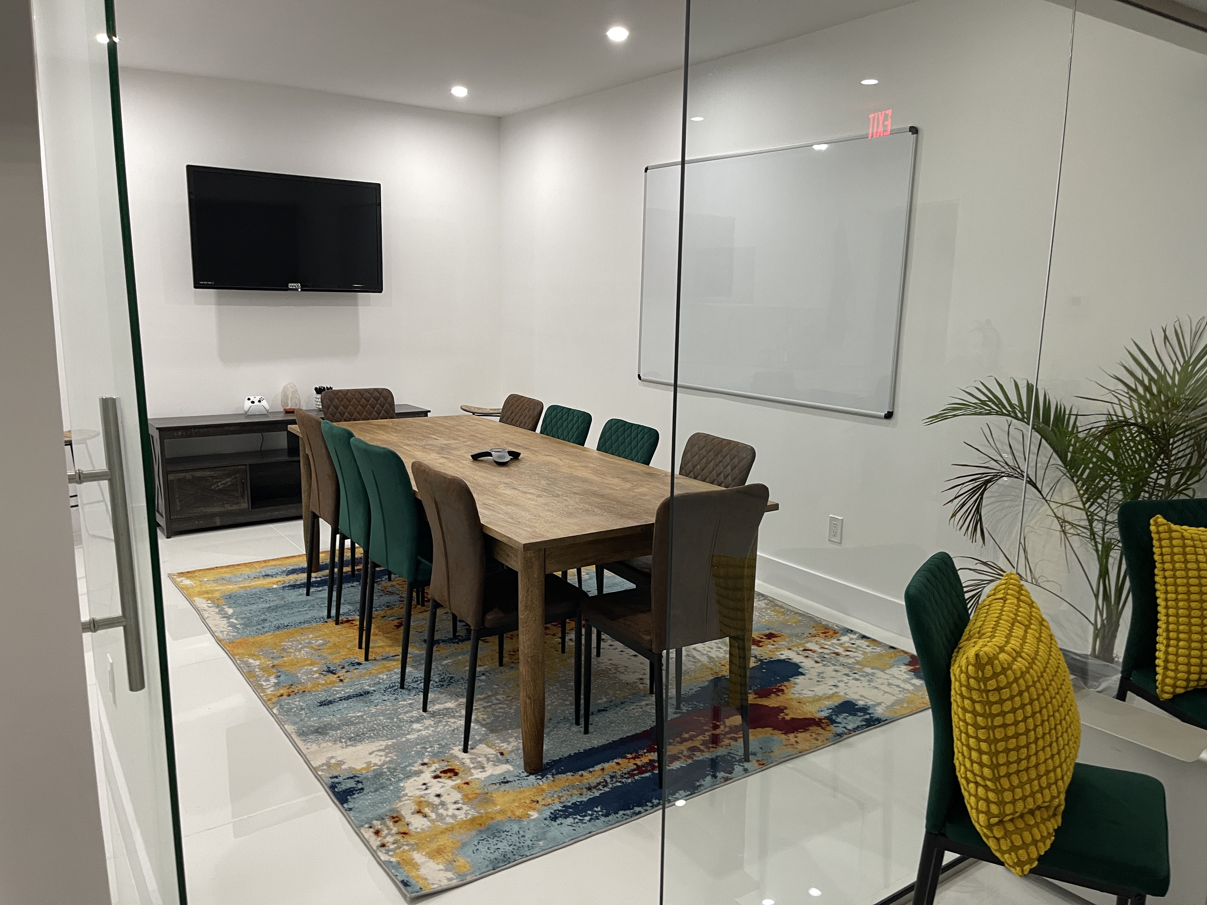 52 inch TV (with streaming sites), Kitchenette with Airfryer, Microwave, Espresso Machine, Milk Foamer, Water Kettle, Conference room with speaker for virtual calls, 27inc computer screen, HP printer, large format printer Epson